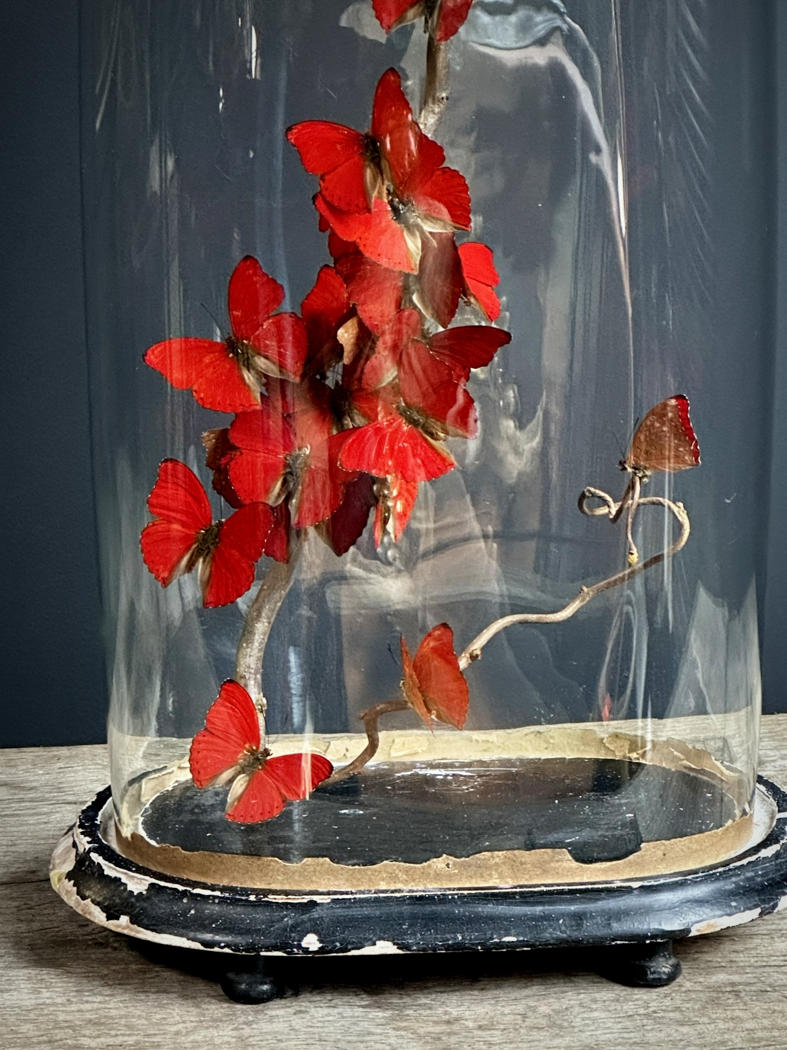 Antike Glasglocke mit schönen roten Schmetterlingen (Cymothoe Sangaris) auf einem natürlichen Ast. BEAST interiors kann Cloches in verschiedenen Formen und mit Füllungen nach Wunsch anfertigen. Bitte erkundigen Sie sich nach den Möglichkeiten.