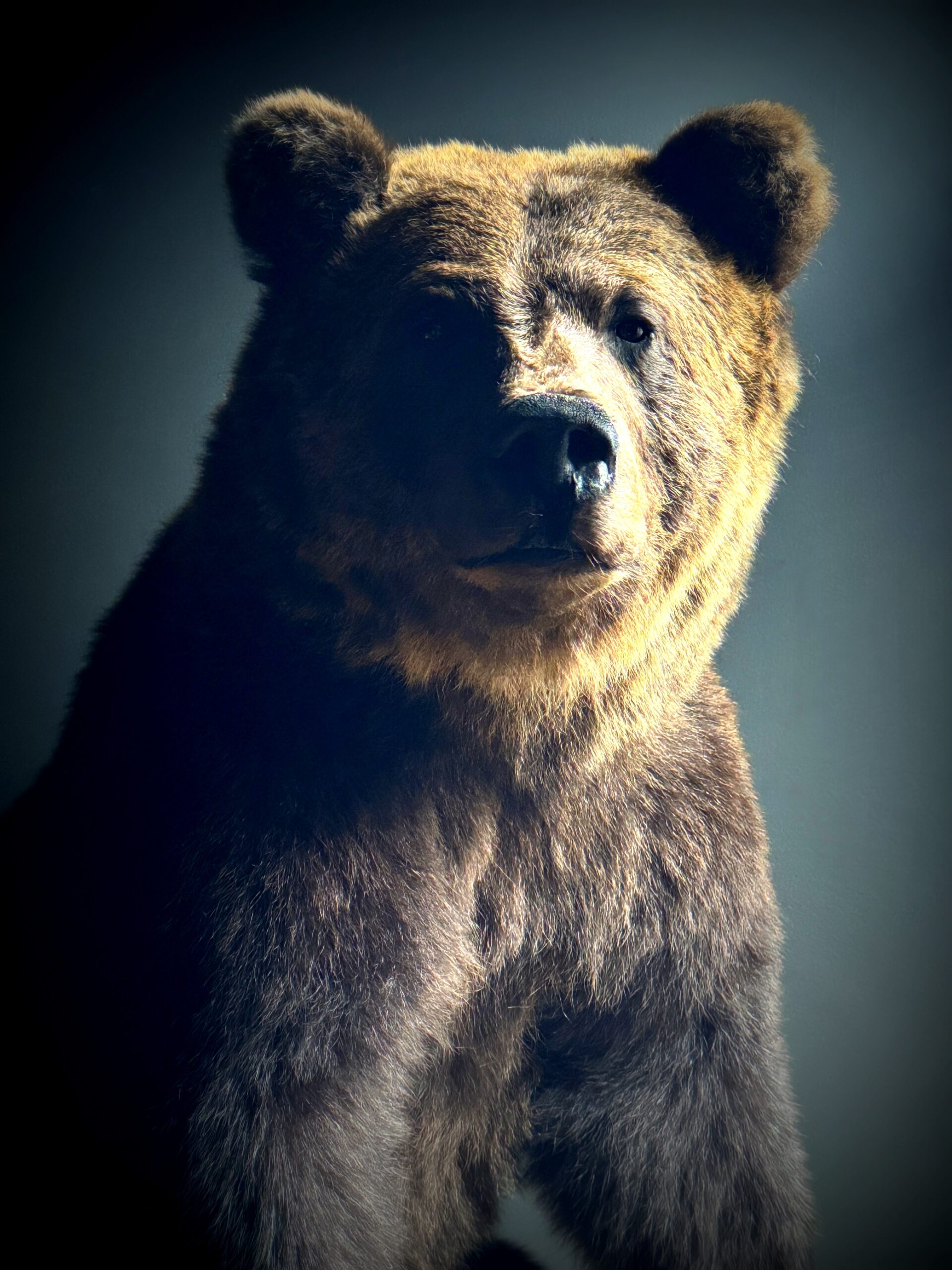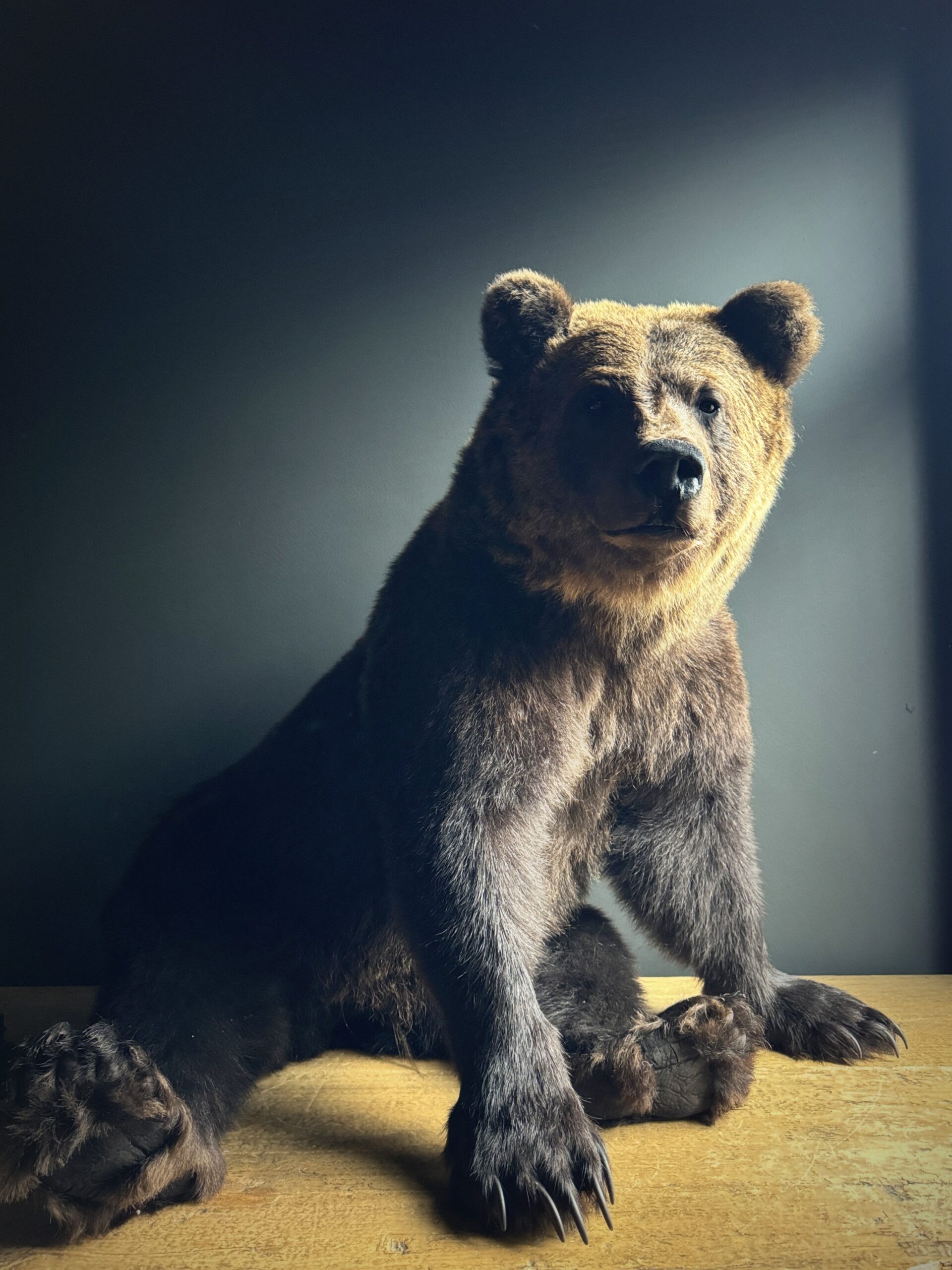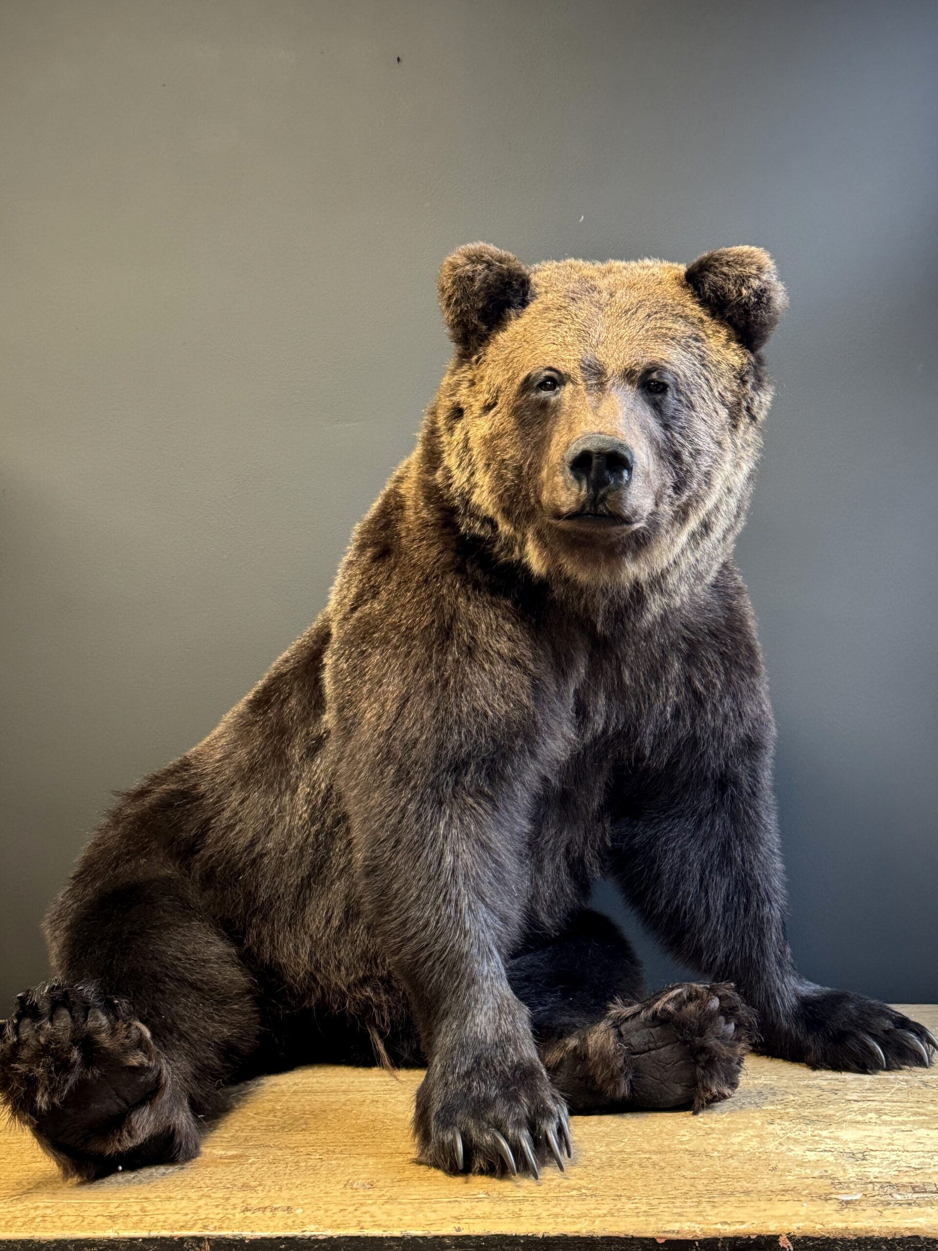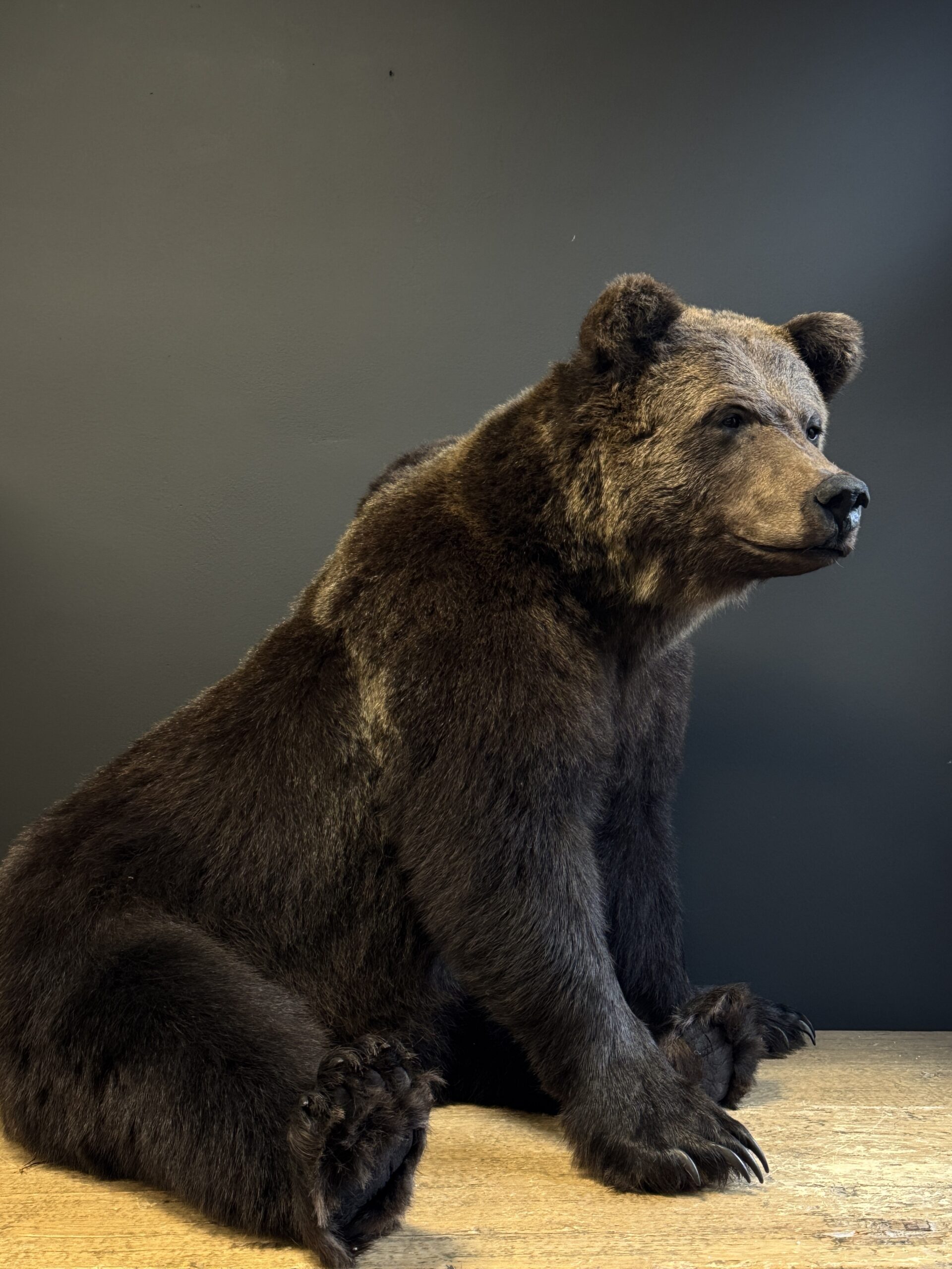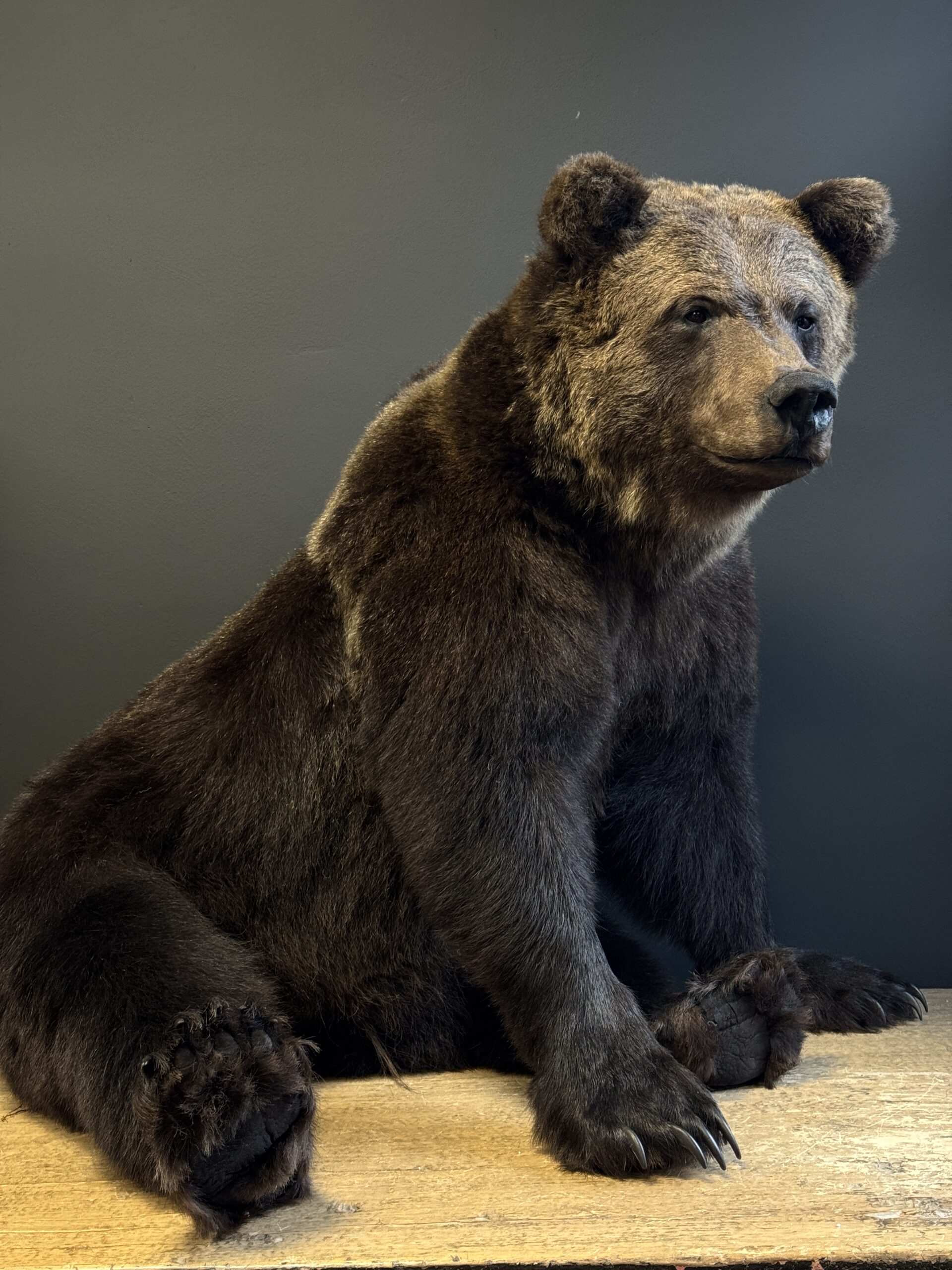 Der Bär hat ein fantastisches, natürliches Aussehen und wurde in einer sitzenden Pose mit sehr viel Liebe zum Detail ausgestopft. Er sieht wirklich lebensecht aus.