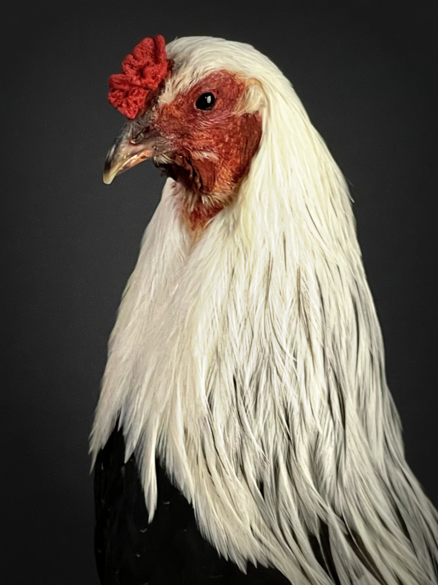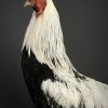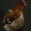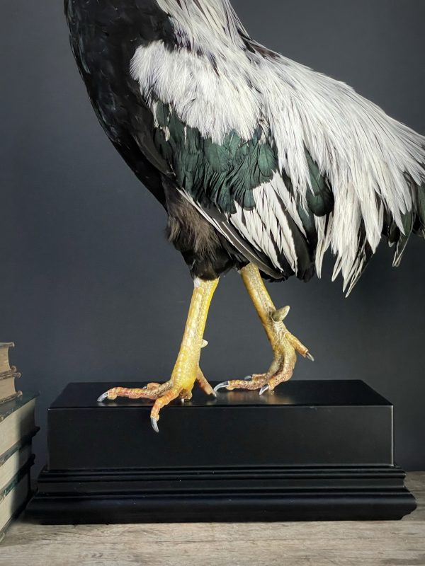 Ausgestopfter Hahn auf handgefertigter Konsole. Der Hahn ist von der Rasse Twents hoen. Die Twents hoen ist eine Hühnerrasse, die in der Mitte des 19. Jahrhunderts in Twente und Bentheim aus Kreuzungen mit Kampfhühnern entstanden ist.