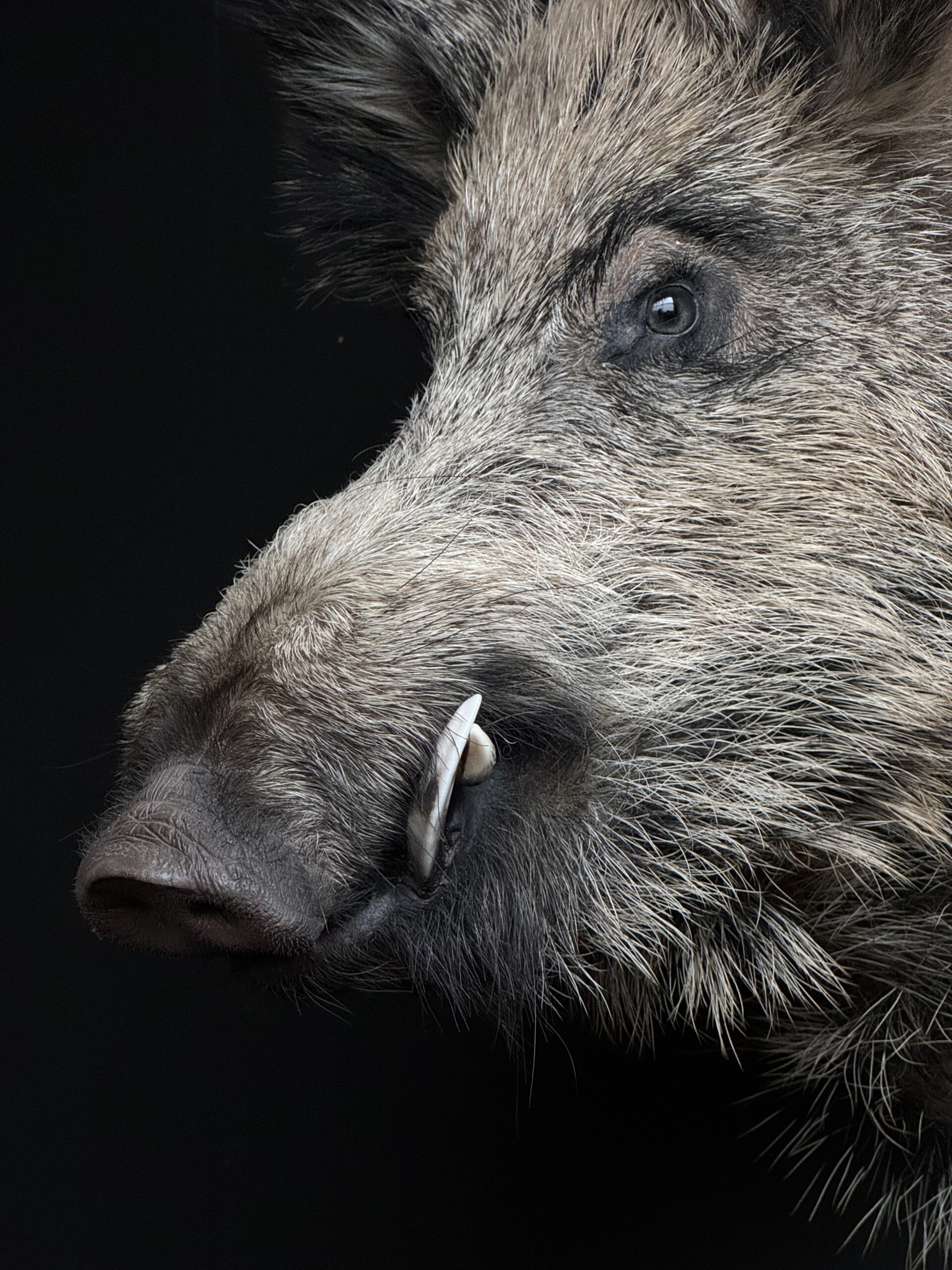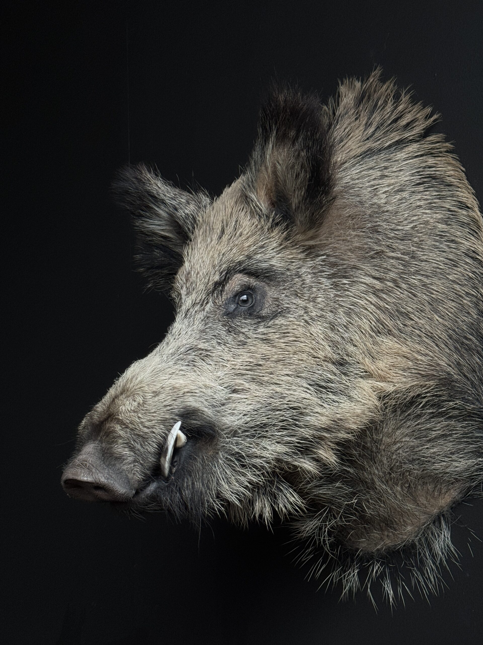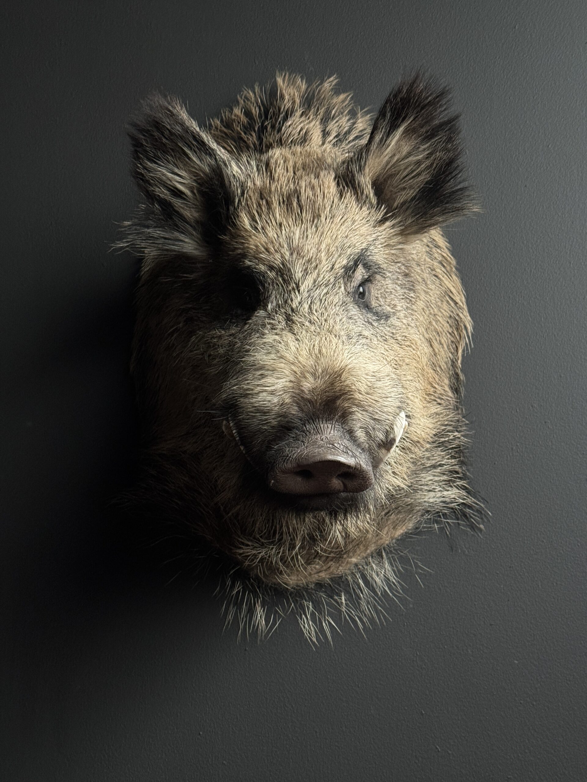 Dieser ausgestopfte Wildschweinkopf ist ein echter Blickfang für eine robuste und authentische Einrichtung. Er hat ein schönes, charakteristisches Aussehen und bringt sofort eine robuste Atmosphäre in Ihr Haus, Ihre Höhle oder Ihre Jagdhütte. Es handelt sich um Exemplare mit einer etwas schlichteren Ausführung, was sie preislich attraktiv macht, ohne dass sie ihr beeindruckendes Aussehen verlieren. Ideal für diejenigen, die ein dekoratives und auffälliges Stück mit natürlichem Charme suchen.