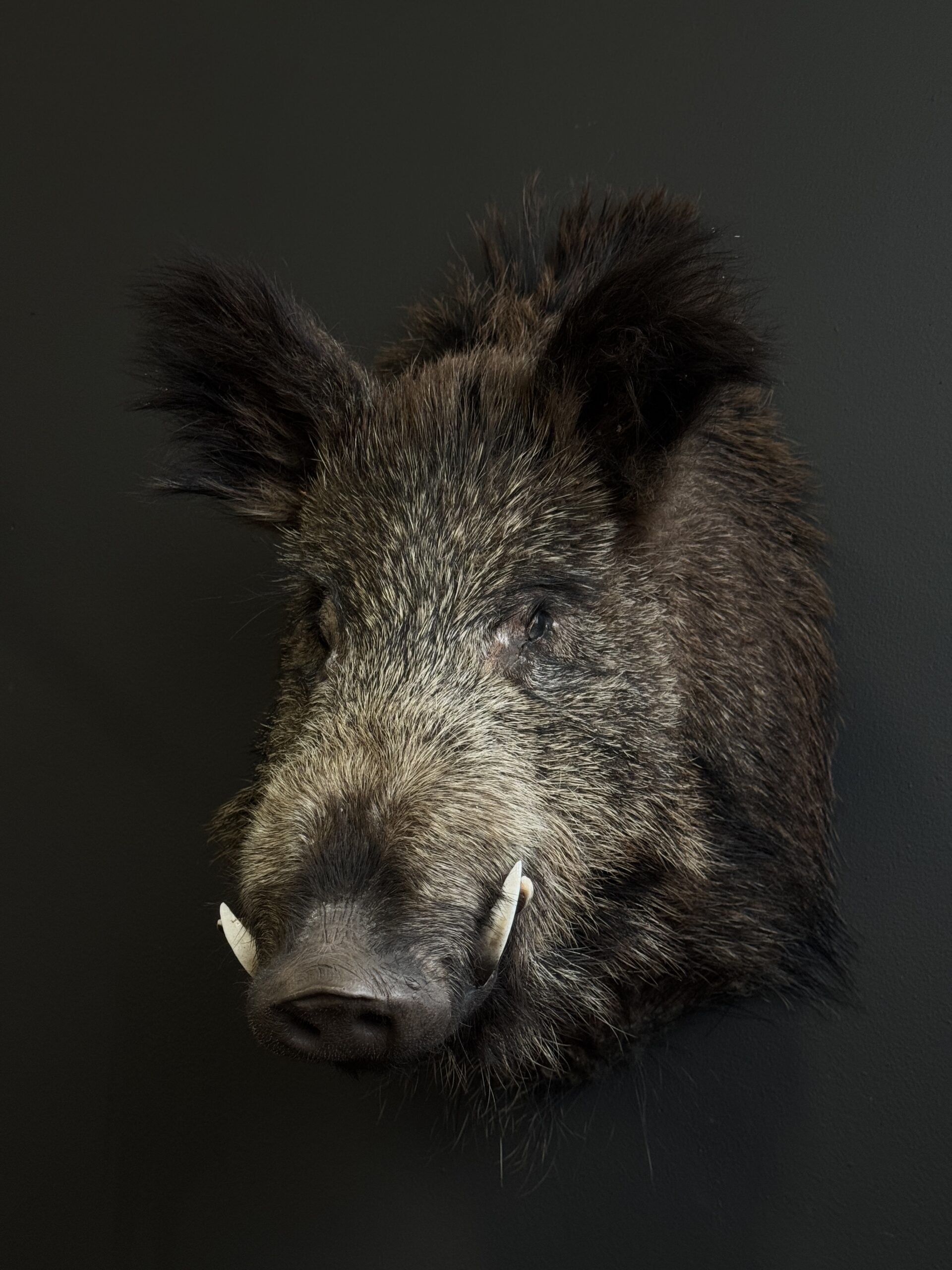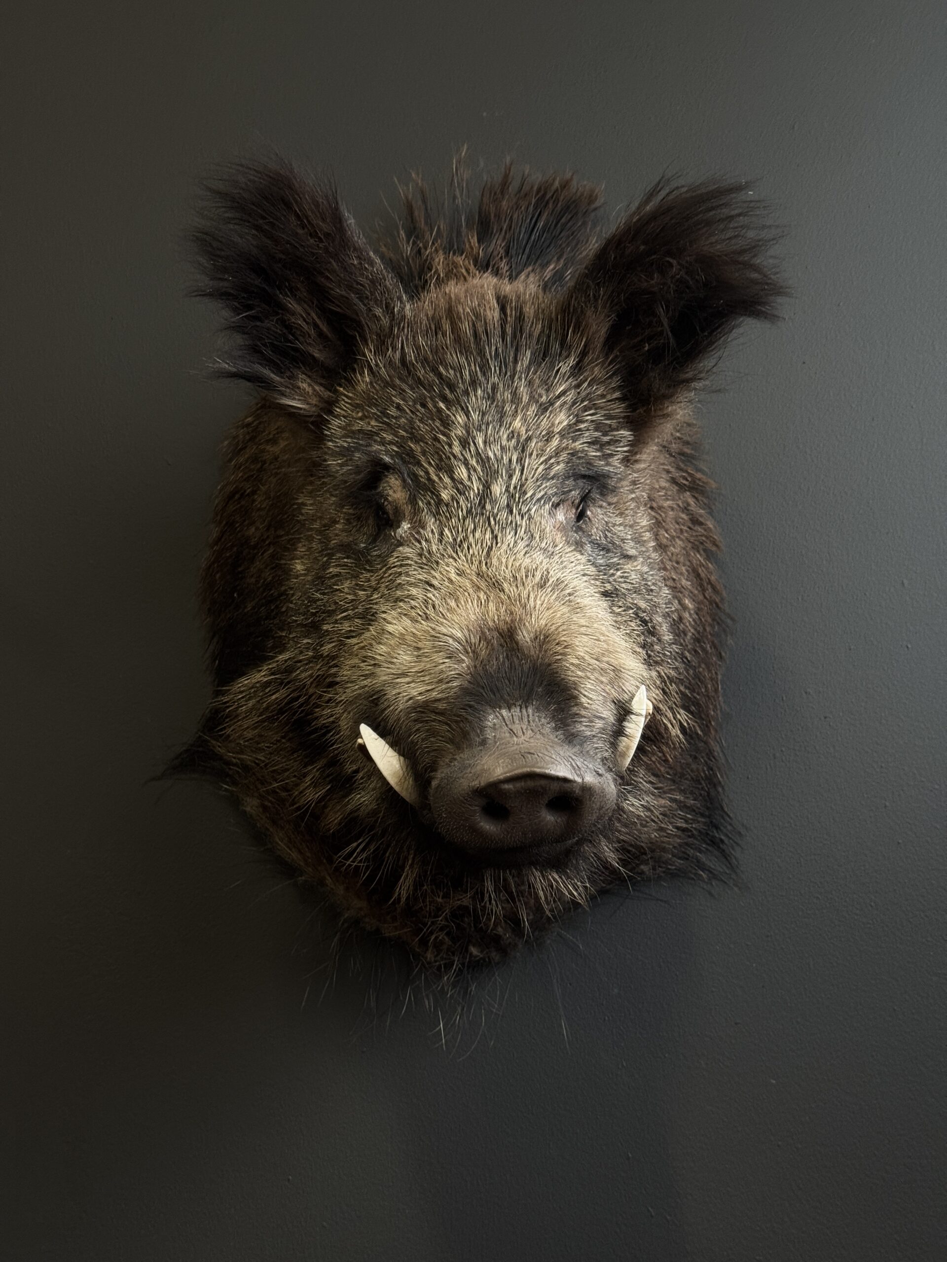 Dieser ausgestopfte Wildschweinkopf ist ein echter Blickfang für eine robuste und authentische Einrichtung. Er hat ein schönes, charakteristisches Aussehen und bringt sofort eine robuste Atmosphäre in Ihr Haus, Ihre Höhle oder Ihre Jagdhütte. Es handelt sich um Exemplare mit einer etwas schlichteren Ausführung, was sie preislich attraktiv macht, ohne dass sie ihr beeindruckendes Aussehen verlieren. Ideal für diejenigen, die ein dekoratives und auffälliges Stück mit natürlichem Charme suchen.