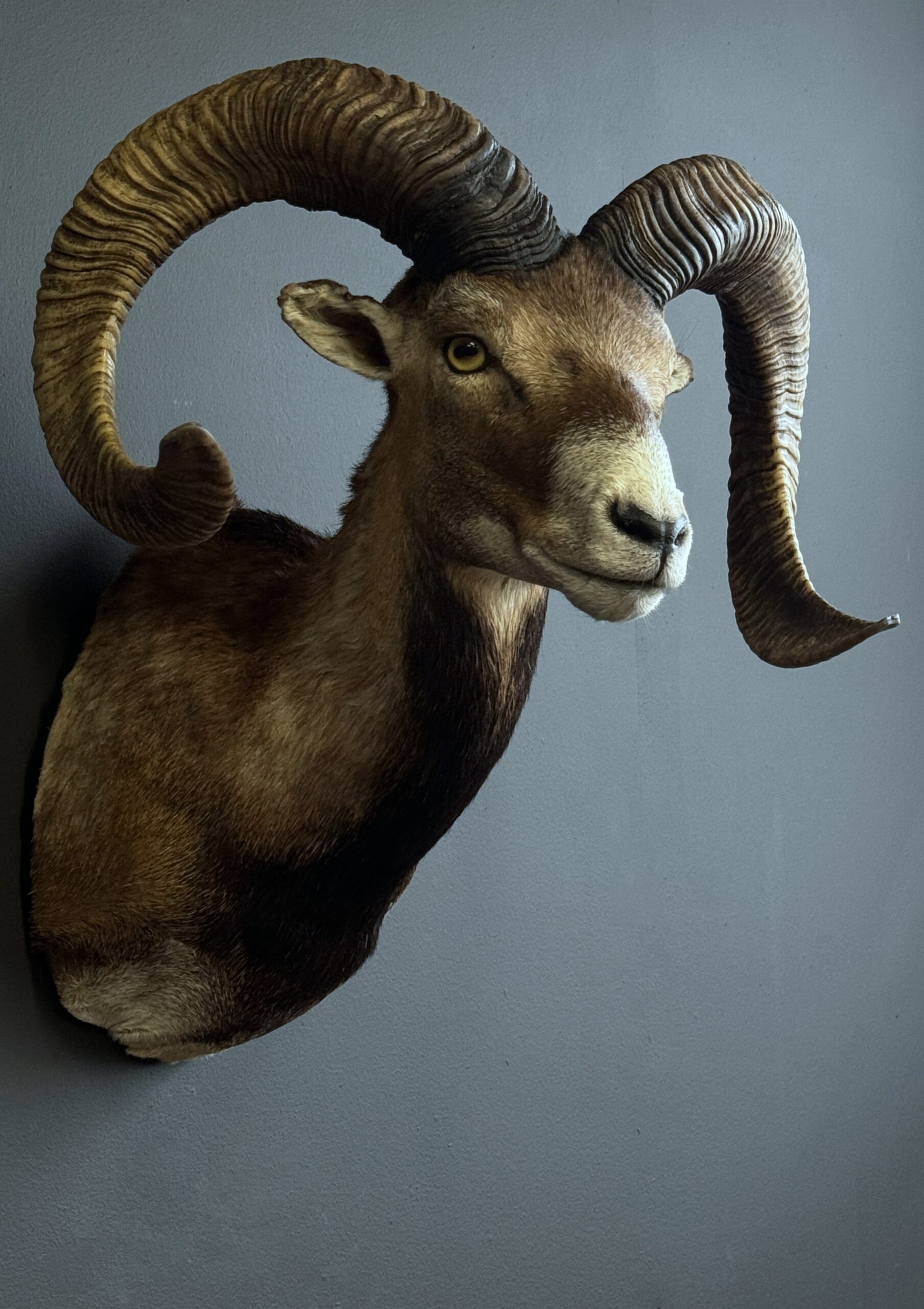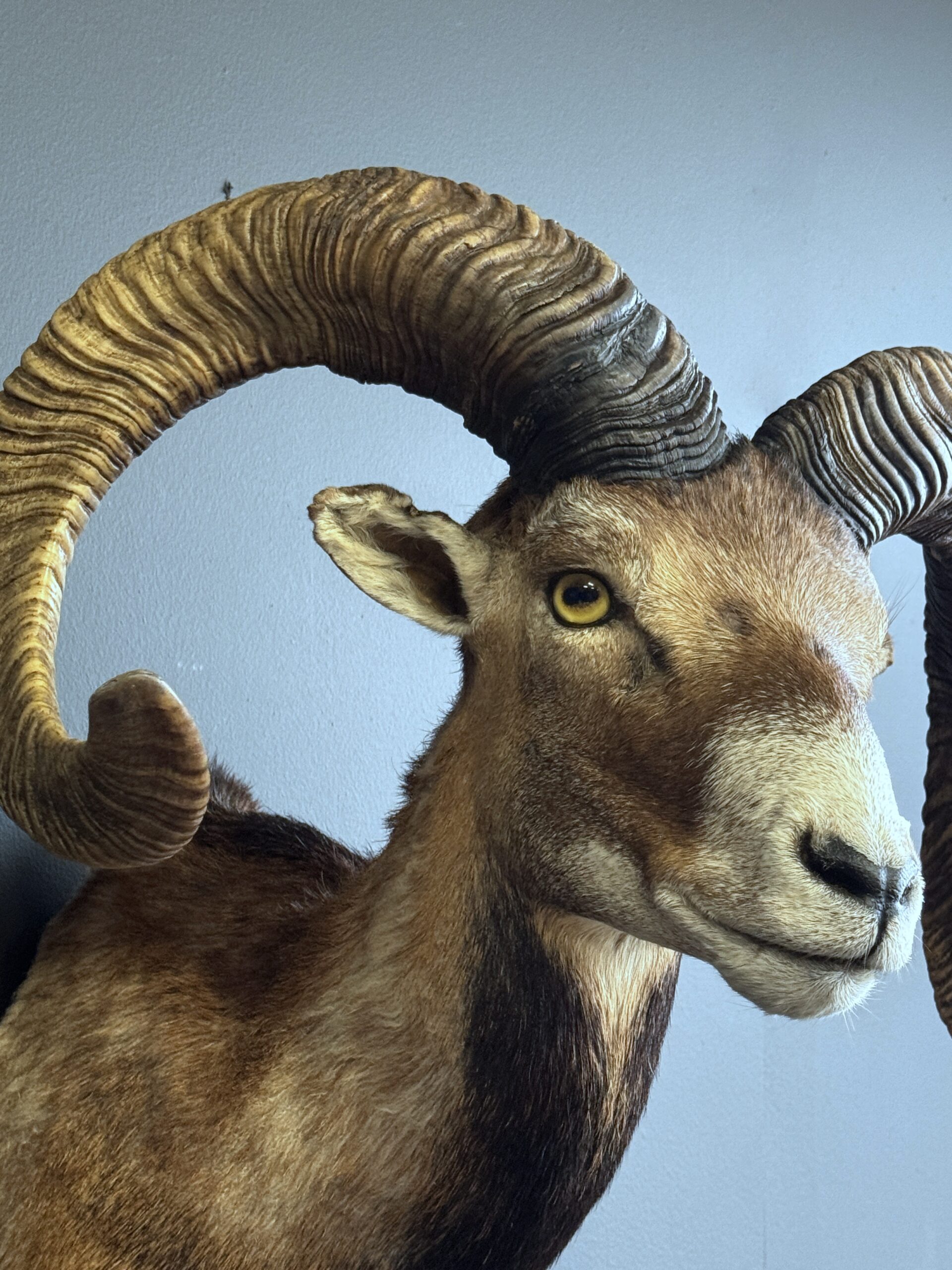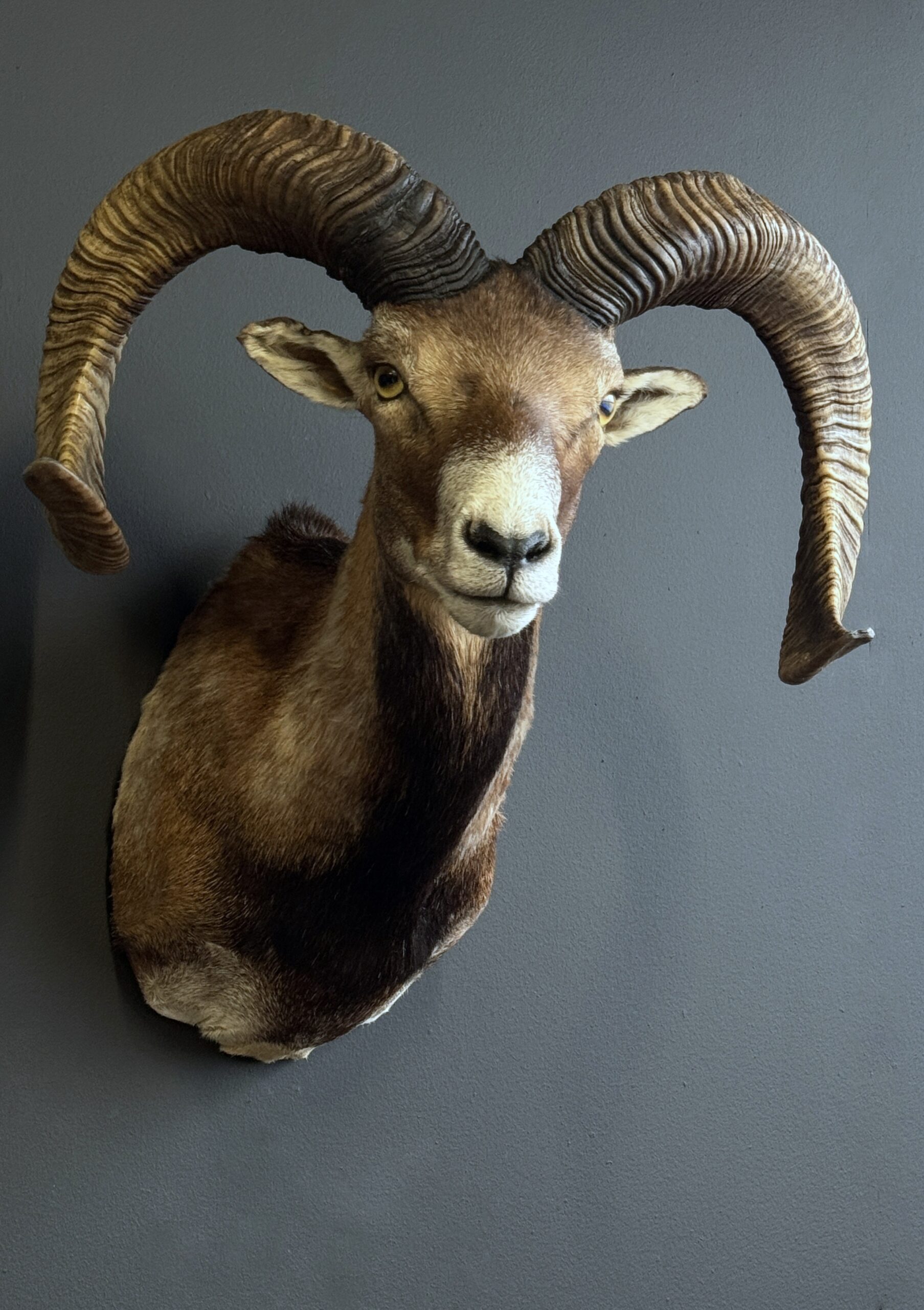 Dieser schöne ausgestopfte Kopf eines sehr großen Mufflons ist ein schöner Dekorationsgegenstand. Das Mufflon ist eine Art von Wildschaf, das für seine großen, lockigen Hörner bekannt ist. Dieses ausgestopfte Mufflon wurde sorgfältig und mit viel Liebe zum Detail hergestellt, damit es realistisch aussieht.