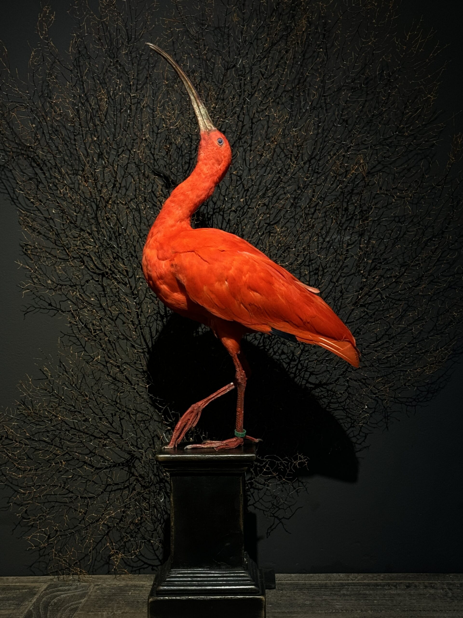 Ausgestopfter roter Ibis in stattlicher Pose. Der Ibis ist wunderschön gefärbt und dieser besondere Vogel ist sehr getreu montiert. Es ist auch auf einer verzierten klassischen Holzkonsole montiert.