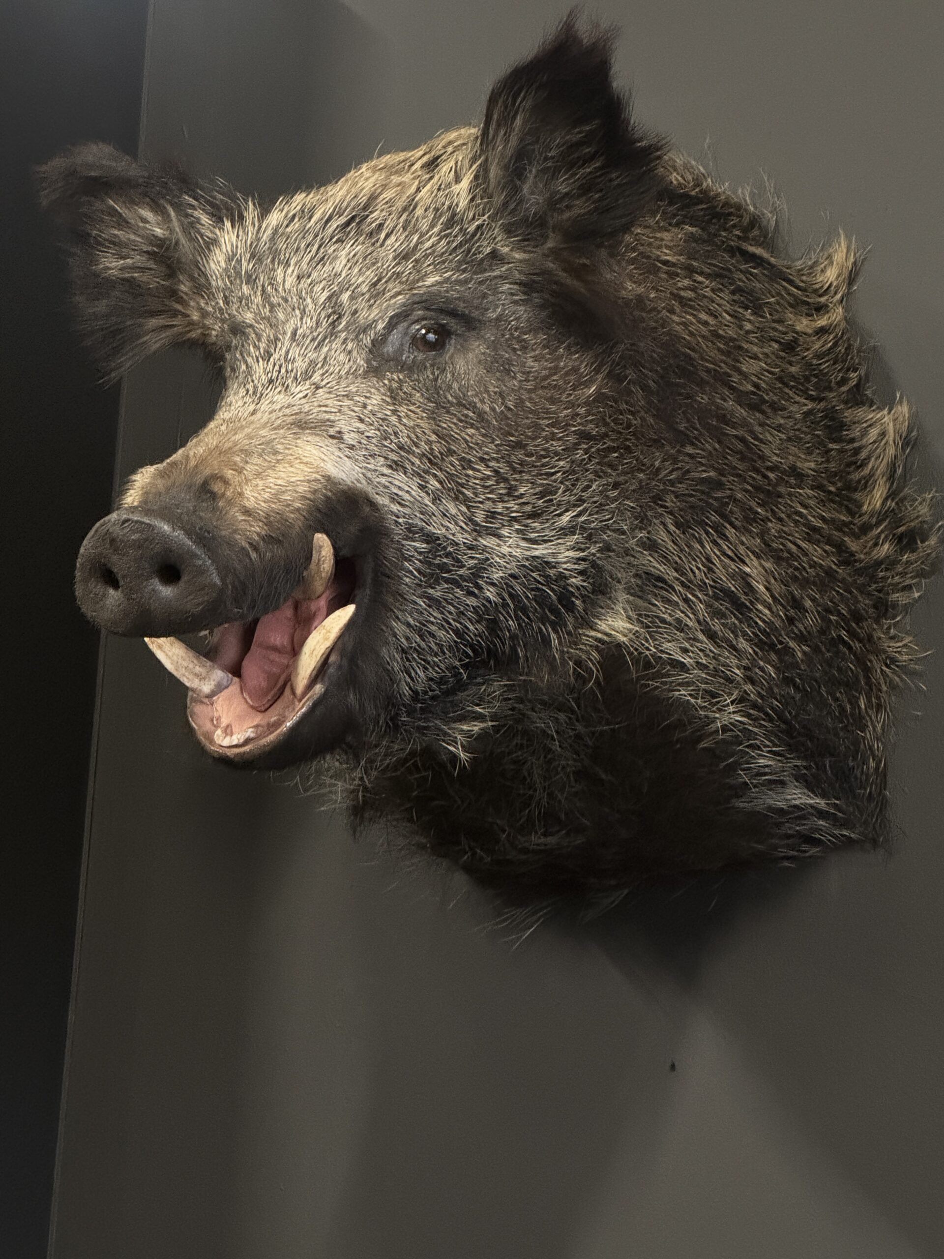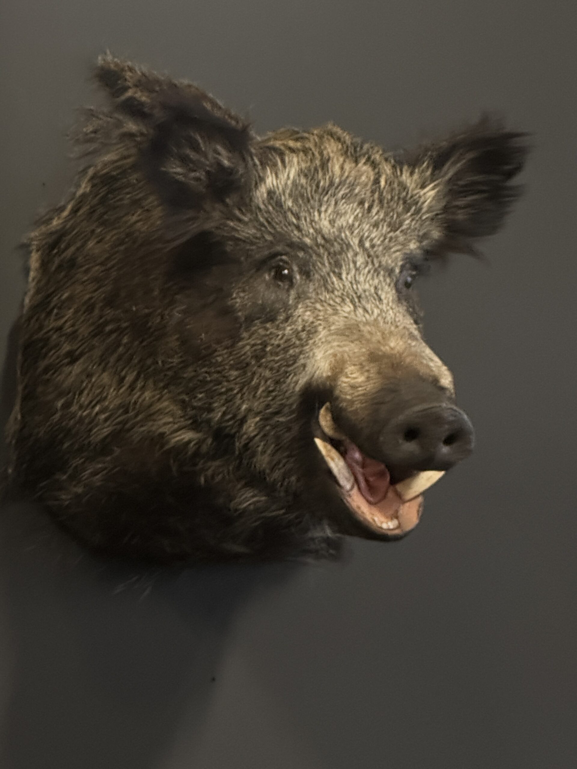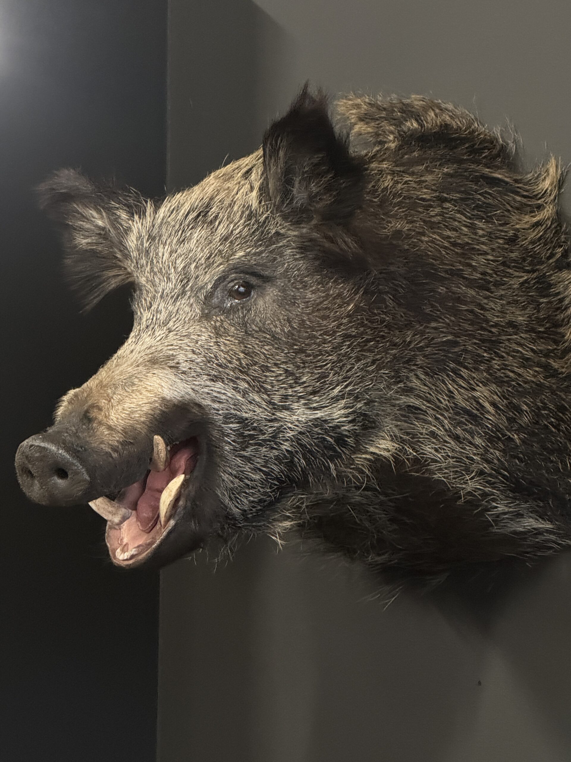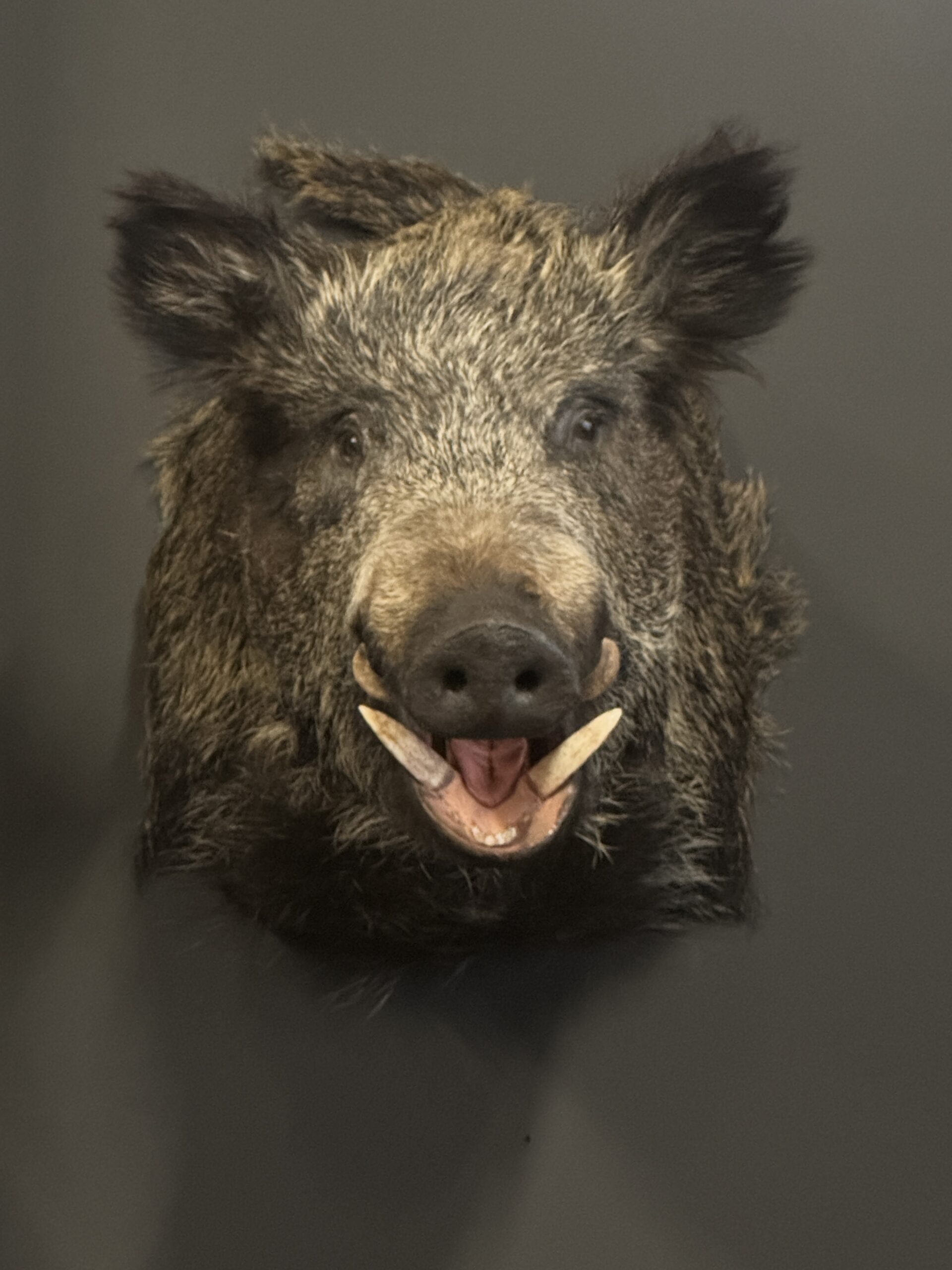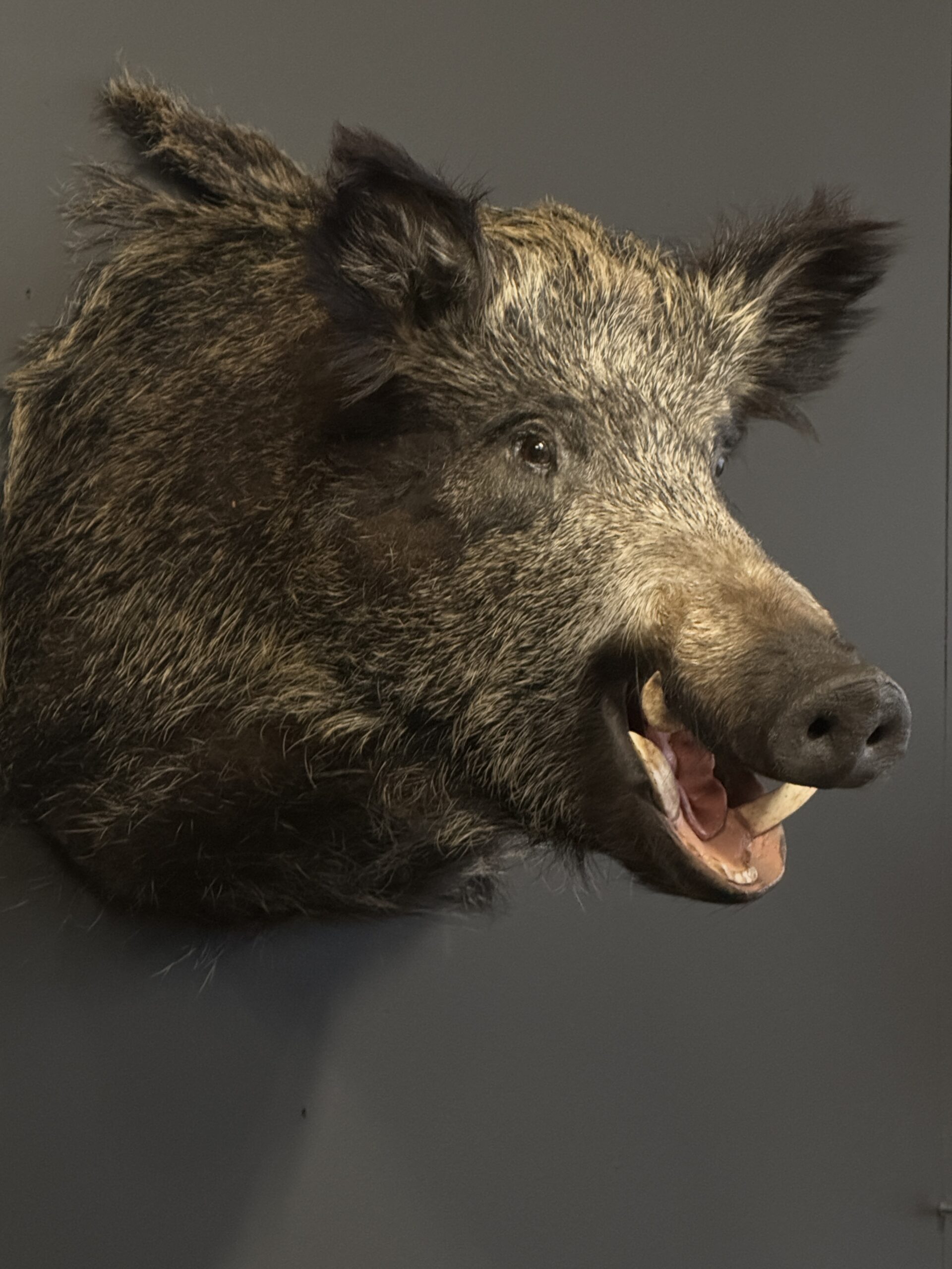 Dieser ausgestopfte Wildschweinkopf wurde professionell präpariert und ist eine naturgetreue Nachbildung des Tieres. Charakteristische Merkmale wie die Form des Kopfes, die Fellstruktur und die Zähne wurden sorgfältig nachgebildet.