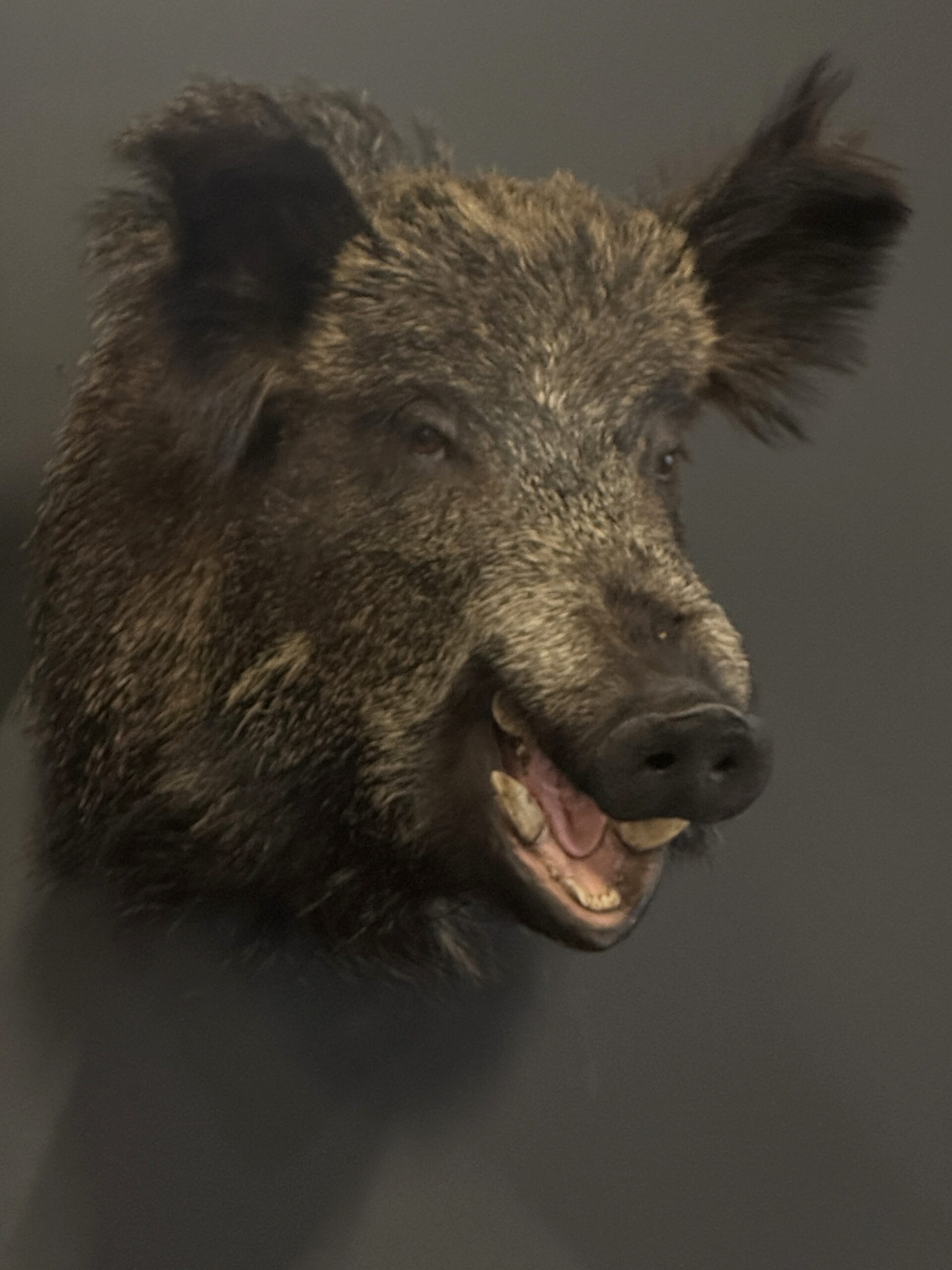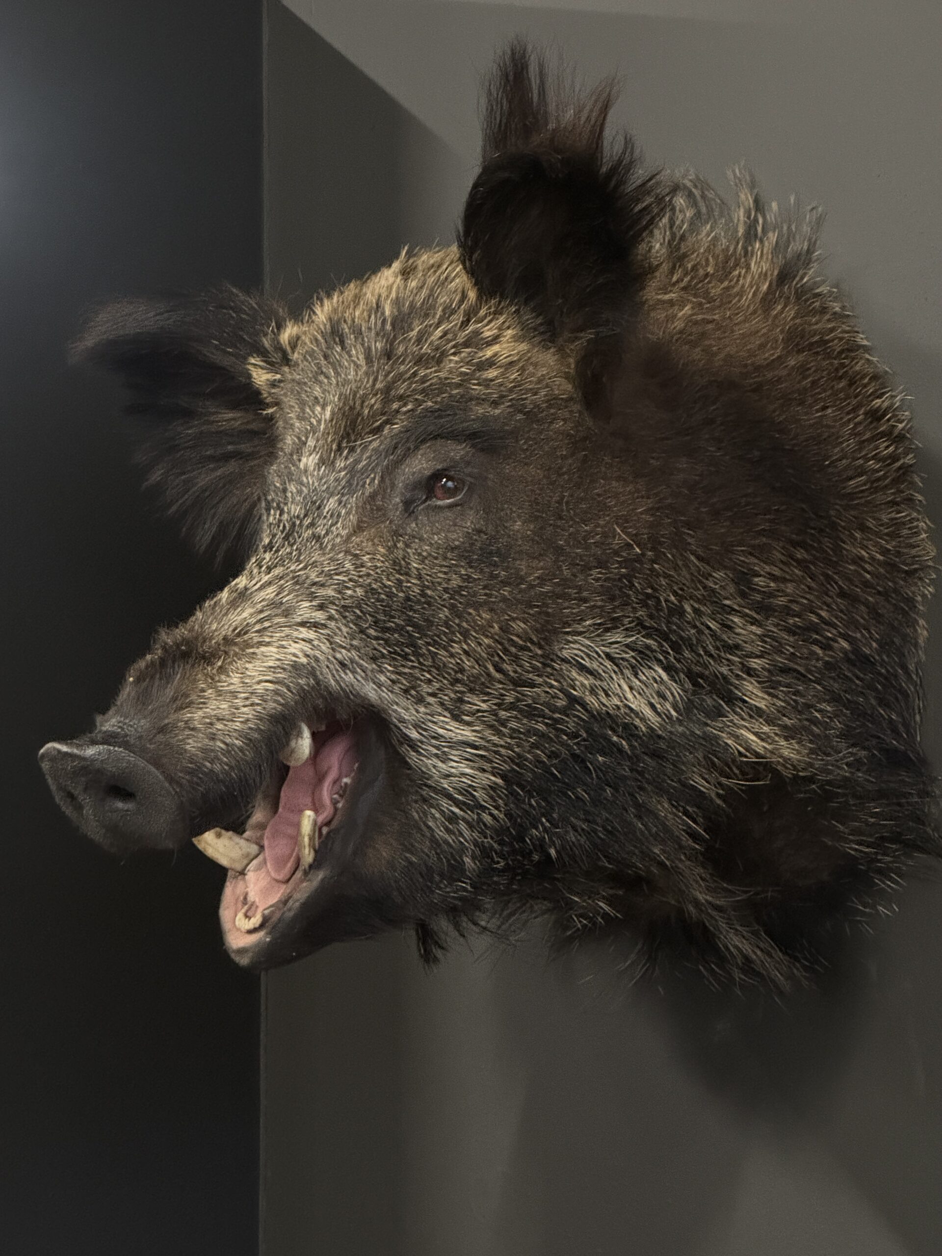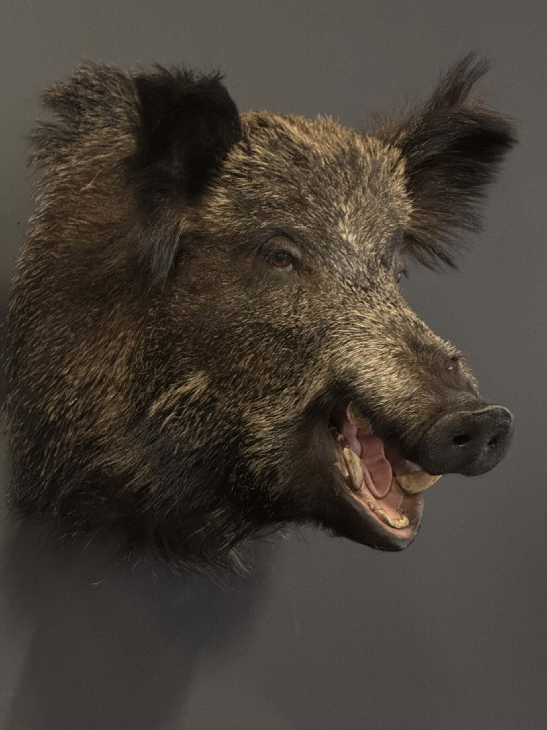 Präparierter Kopf eines großen Wildschweins. Dieser ausgestopfte Wildschweinkopf wurde professionell präpariert und ist eine naturgetreue Nachbildung des Tieres. Charakteristische Merkmale wie die Form des Kopfes, die Fellstruktur und die Zähne wurden sorgfältig nachgebildet. Die Verarbeitung ist von hoher Qualität, sodass ein repräsentatives und langlebiges Objekt entstanden ist, das sowohl in rustikalen als auch in robusten Innenräumen eine Bereicherung darstellt.