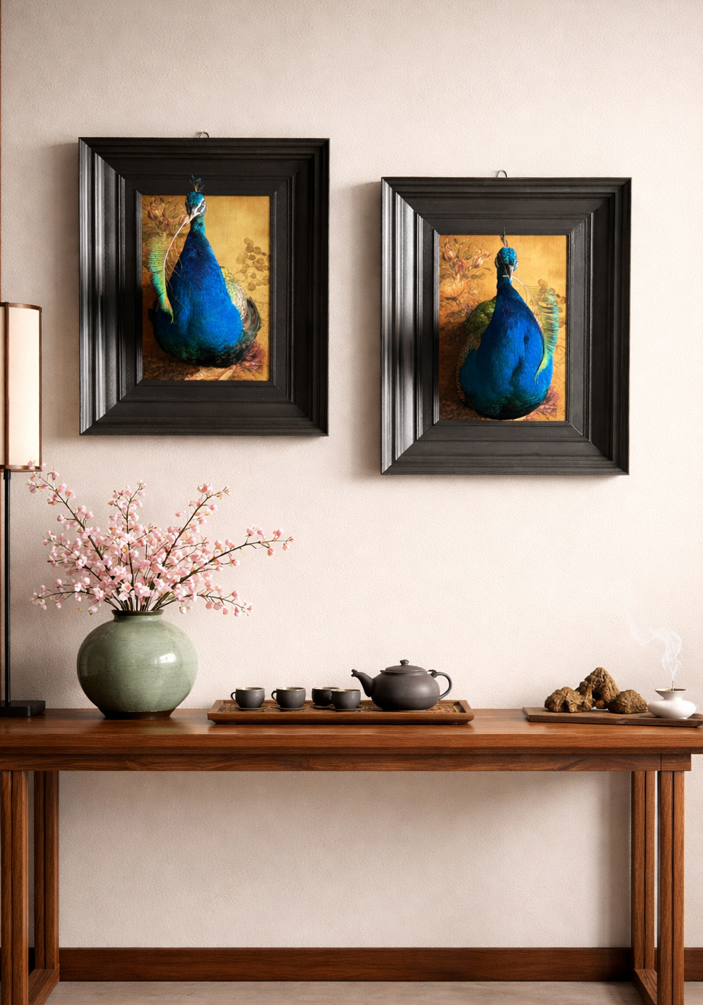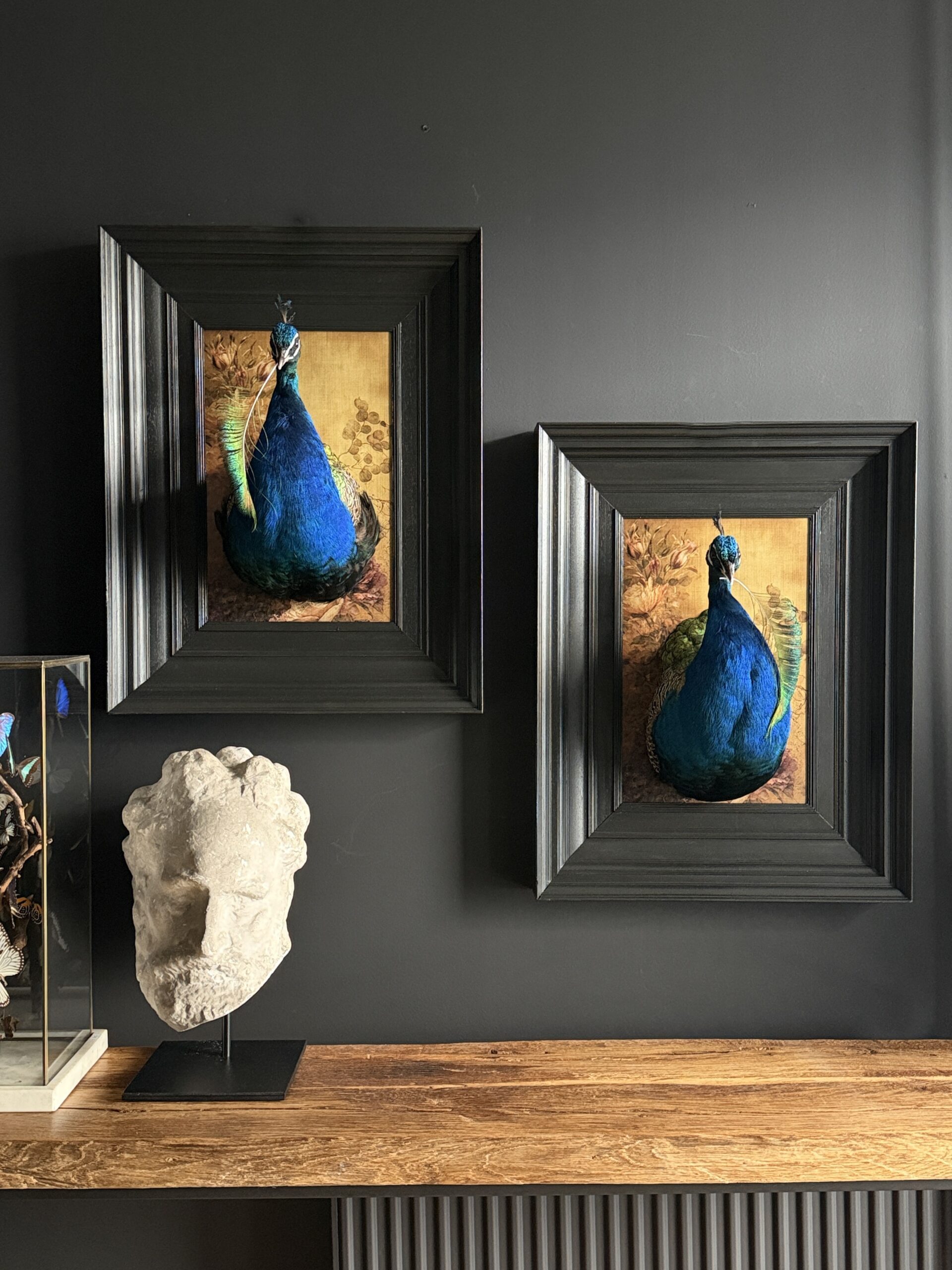 Dieses Kunstwerk besteht aus einem handgefertigten Holzrahmen, der mit Sorgfalt und handwerklichem Geschick hergestellt wurde. In dem detailreichen Rahmen ist der Kopf eines blauen Pfaus montiert, dessen schillernde Federn in tiefen Blau- und Grüntönen schimmern. Die stolze Haltung und die raffinierten Details des Kopfes bilden einen starken Kontrast zum warmen Holz und schaffen ein beeindruckendes und elegantes Gesamtbild, das sowohl die Natur als auch die Handwerkskunst zelebriert.