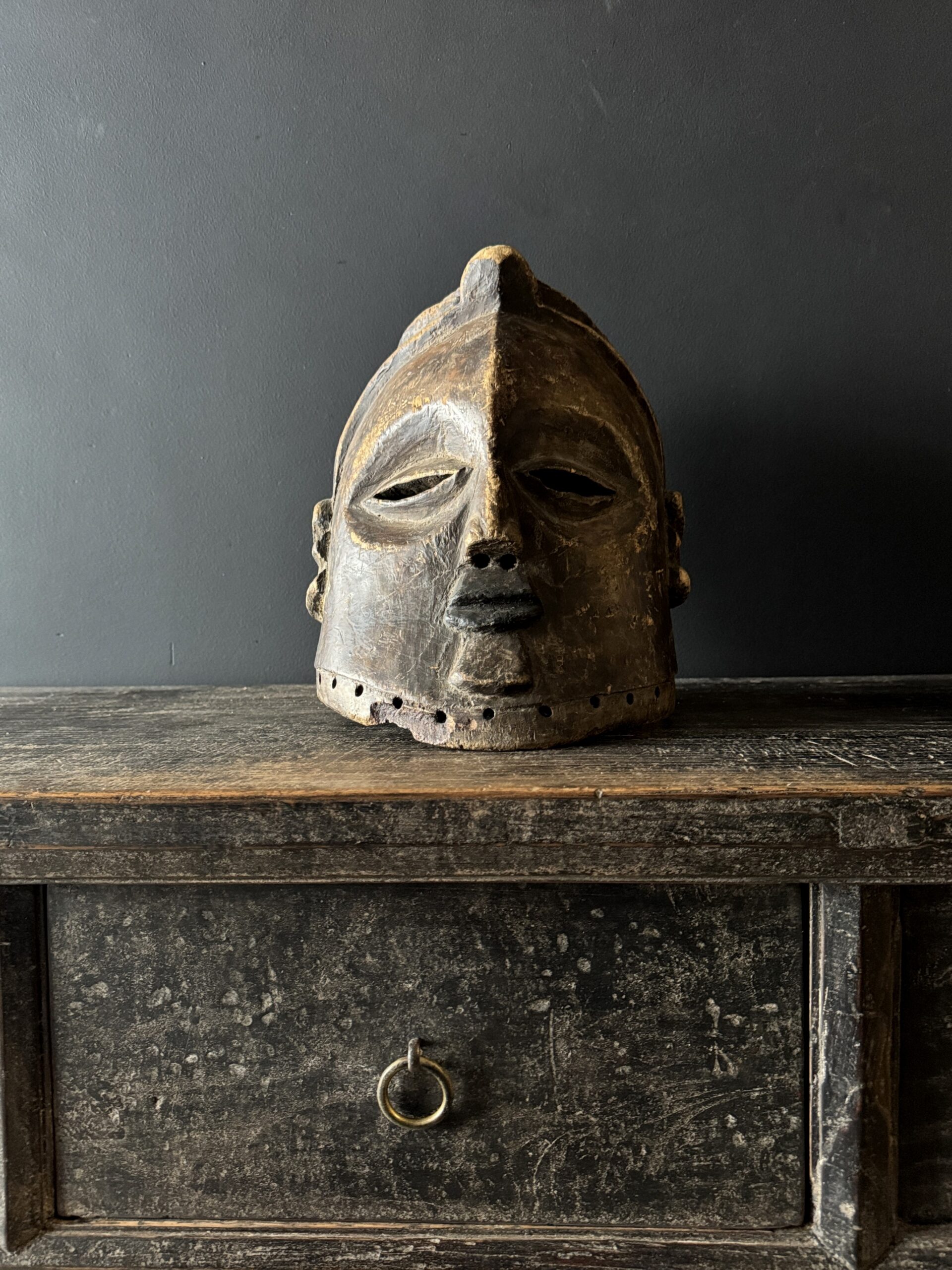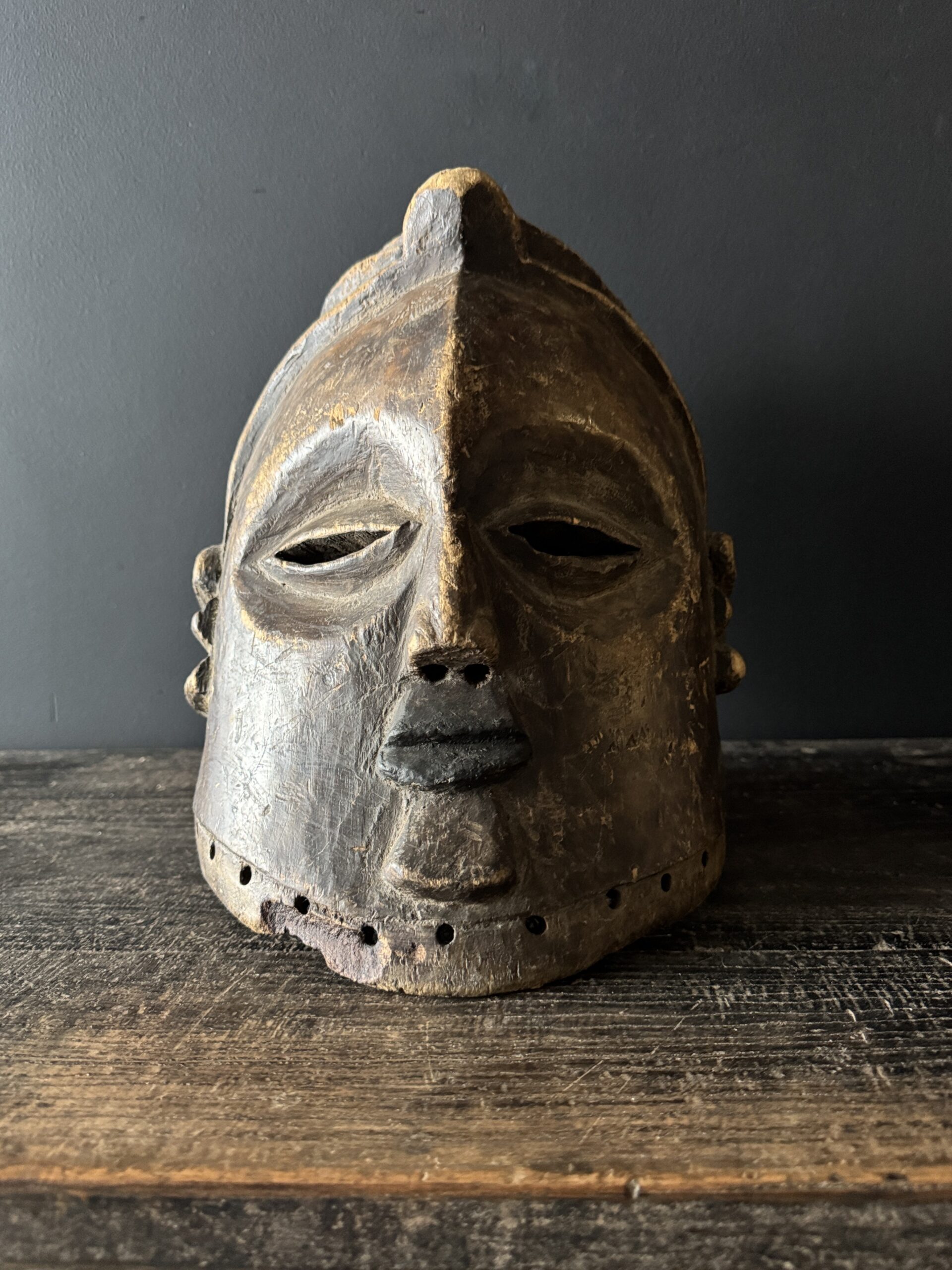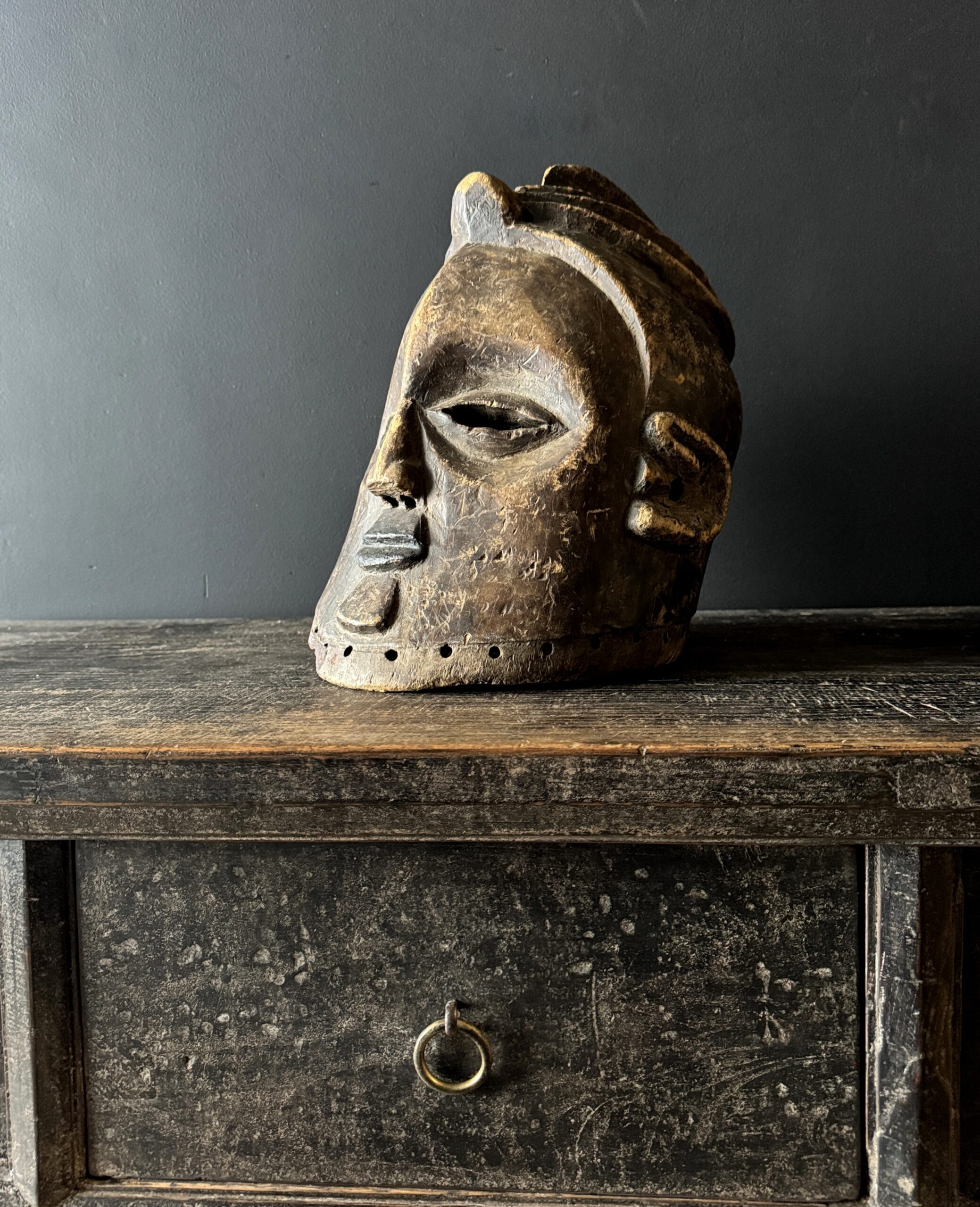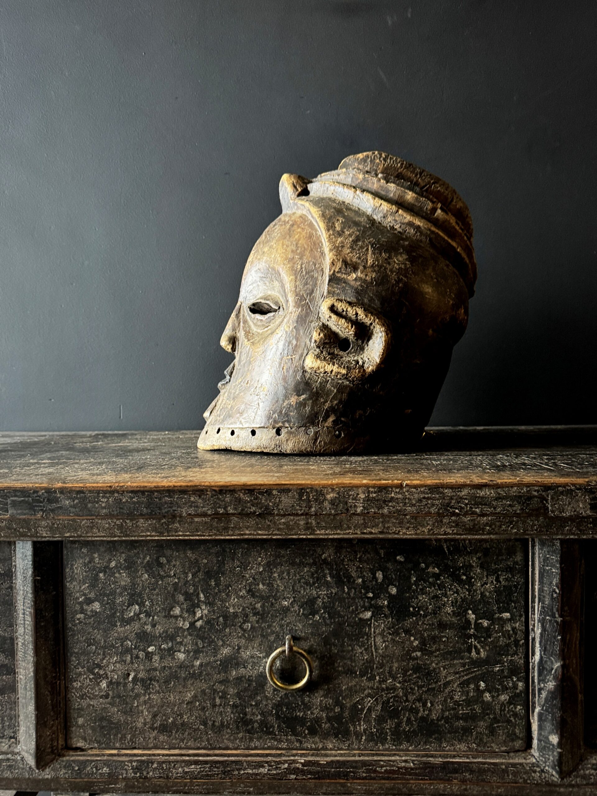 Diese antike afrikanische Maske ist nicht nur ein Kunstwerk, sondern auch ein bedeutendes Stück Geschichte und Kultur. Mit ihren handgeschnitzten Formen, der verwitterten Patina und dem ausdrucksstarken Gesichtsausdruck bringt sie Charakter und Authentizität in jedes Interieur. Dank der natürlichen Materialien und der warmen Farbtöne passt eine solche Maske sowohl in moderne als auch in klassische Wohnräume. Auf einem Sideboard, Wandregal oder als Blickfang an der Wand