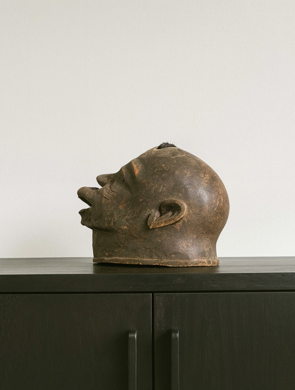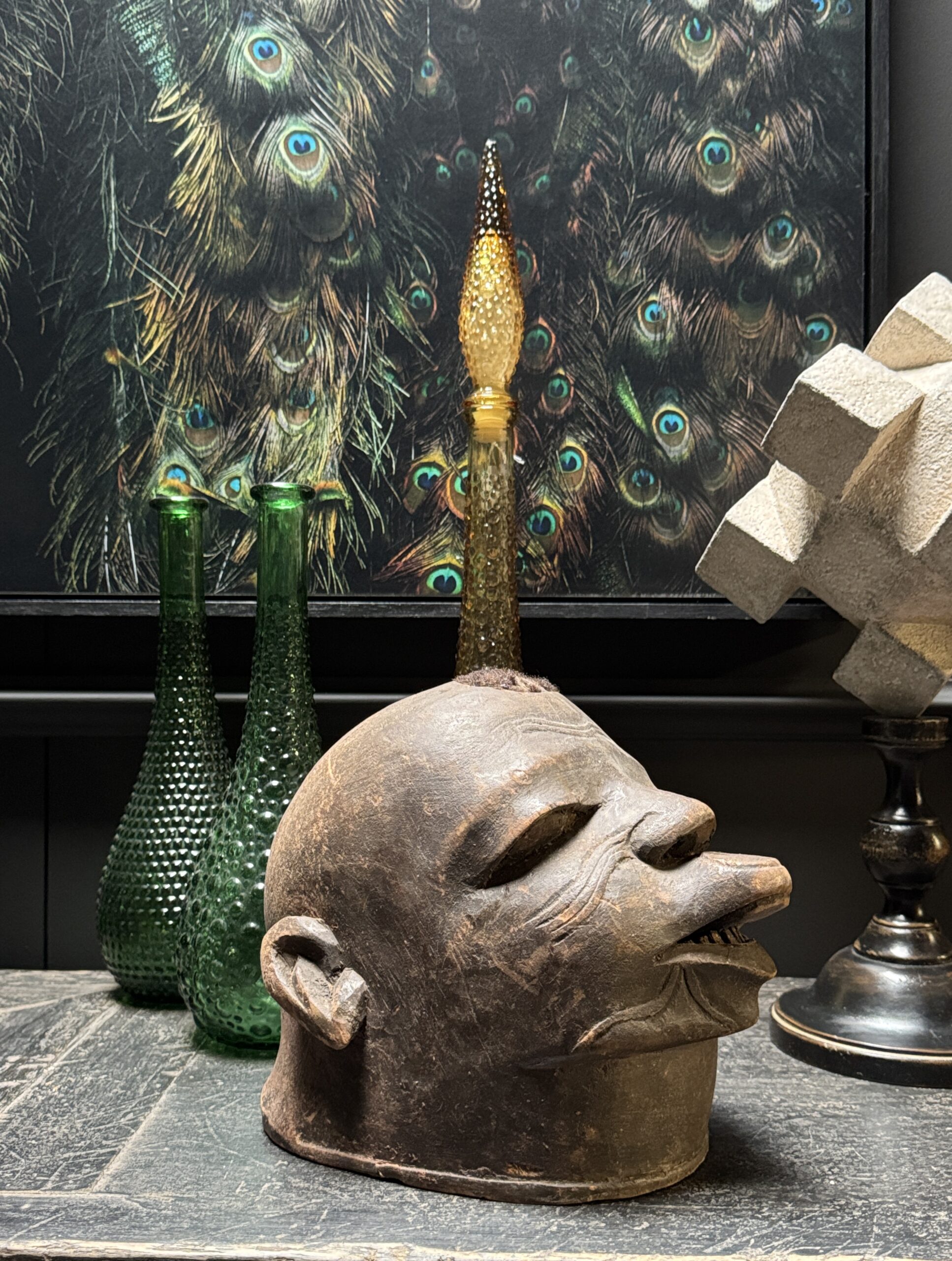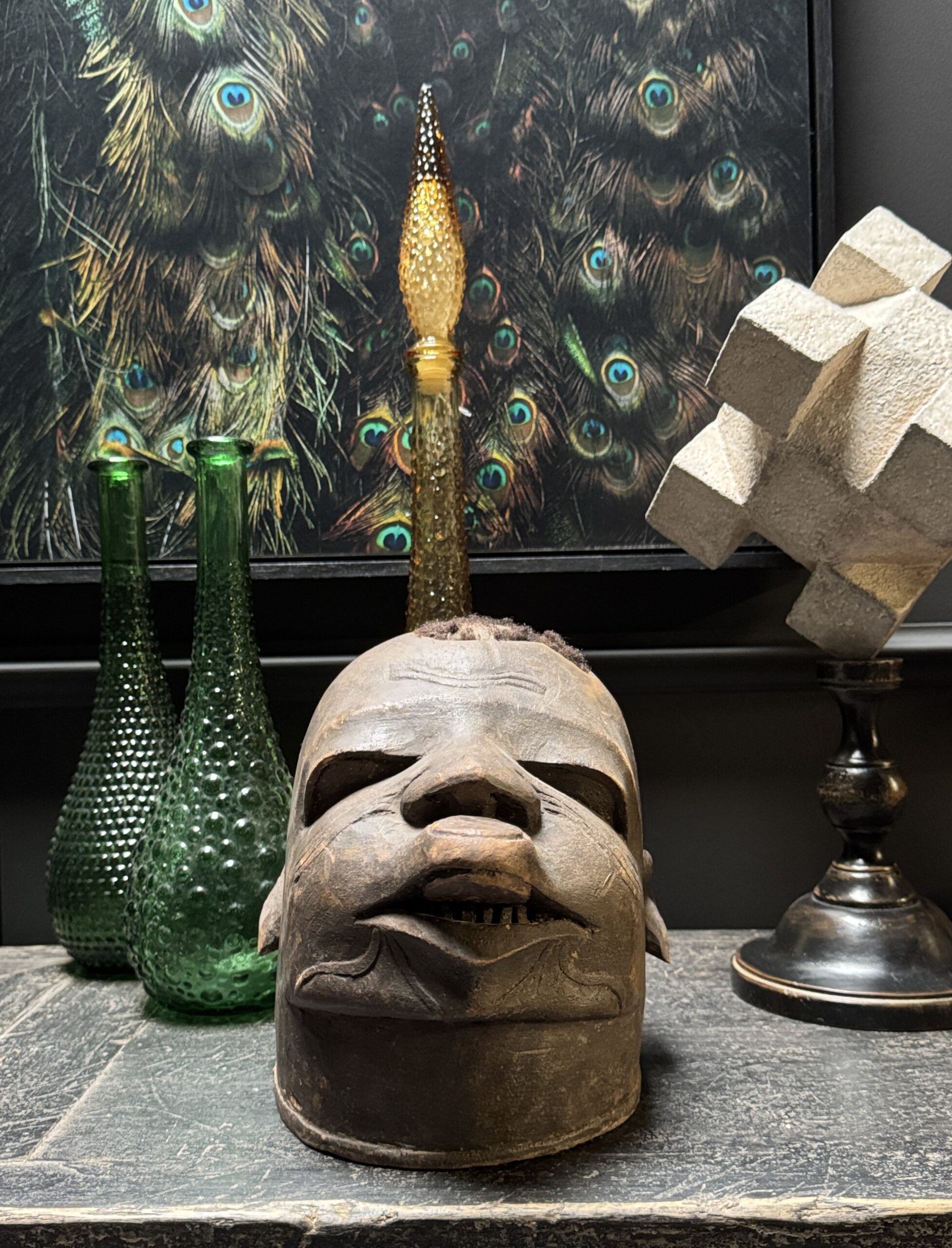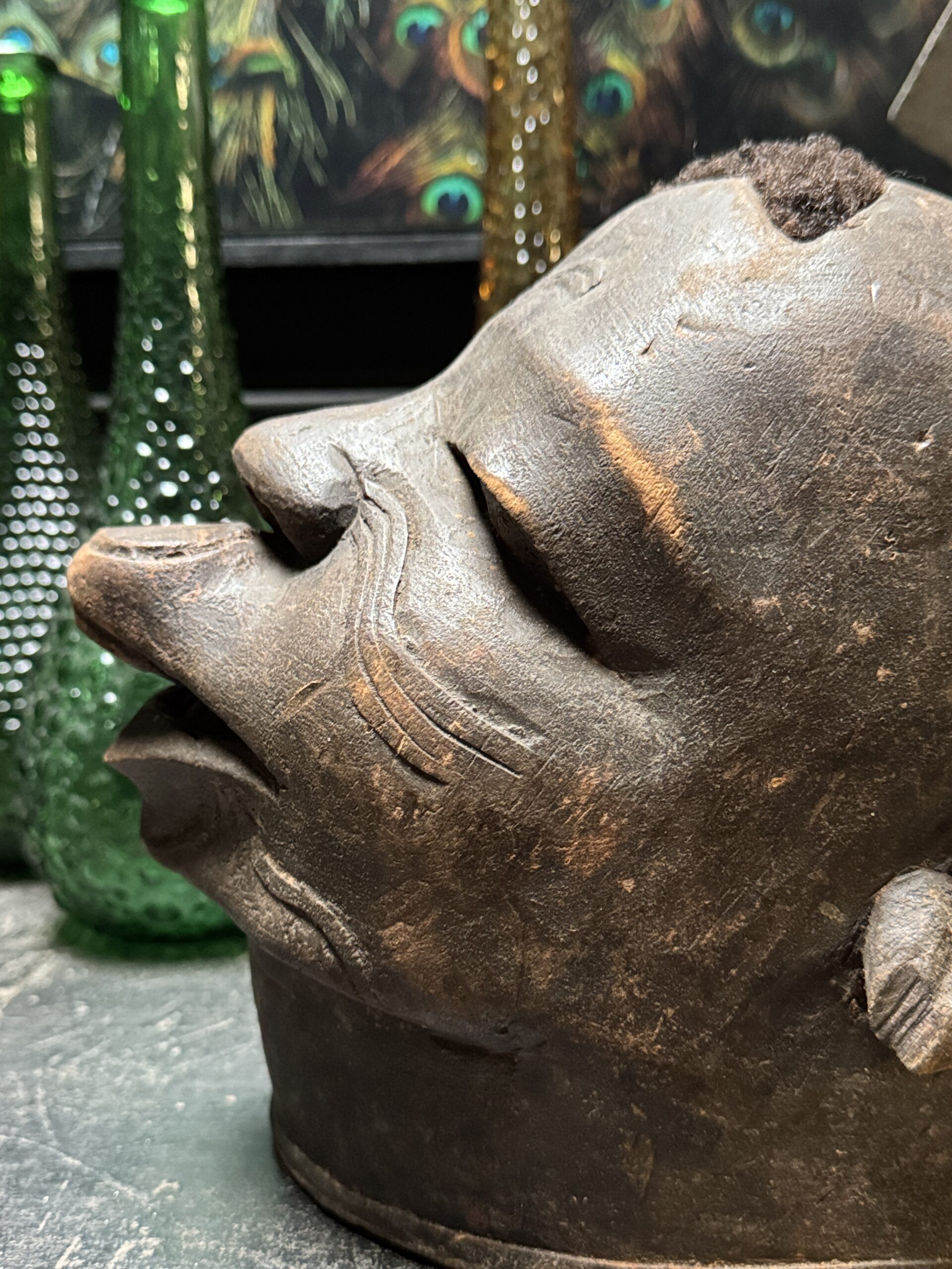 Dekorative afrikanische Maske. Eine Makonde-Lipoko-Maske ist eine traditionelle Ritualmaske, die aus dem Südosten Tansanias und dem Norden Mosambiks stammt. Sie wird von den Makonde hergestellt, einer ethnischen Gruppe mit einer reichen Schnitzertradition. Lipoko-Masken, die in der Regel aus hellem Holz gefertigt und manchmal mit echtem Haar oder Pigmenten verziert sind, wurden bei Initiationsritualen und Beerdigungszeremonien verwendet. Sie symbolisierten die Geister der Ahnen und dienten als Bindeglied zwischen den Lebenden und der geistigen Welt. Der ausdrucksstarke Gesichtsausdruck der Masken, oft mit offenem Mund, hervorstehenden Wangenknochen und eingravierten Mustern, verstärkte die mystische Atmosphäre der Zeremonien. Heute werden die Makonde-Masken nicht nur als kulturelles Erbe, sondern auch als besondere Kunstobjekte geschätzt, die handwerkliches Können und spirituelle Bedeutung miteinander verbinden.