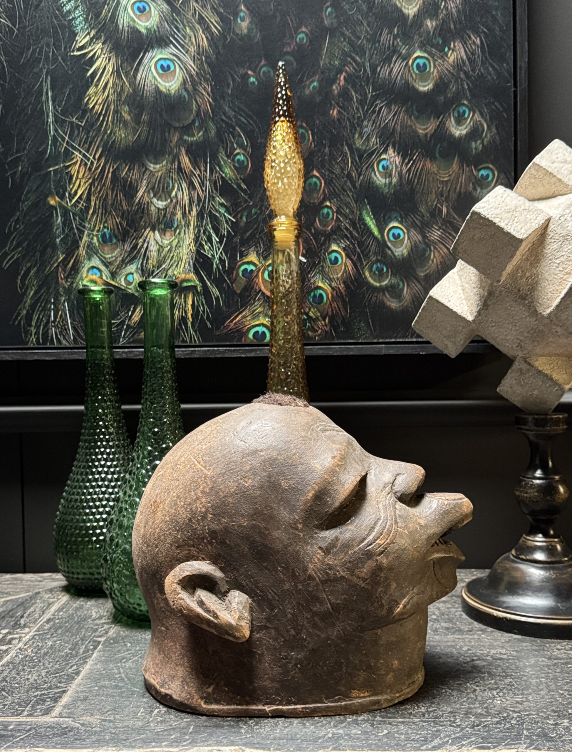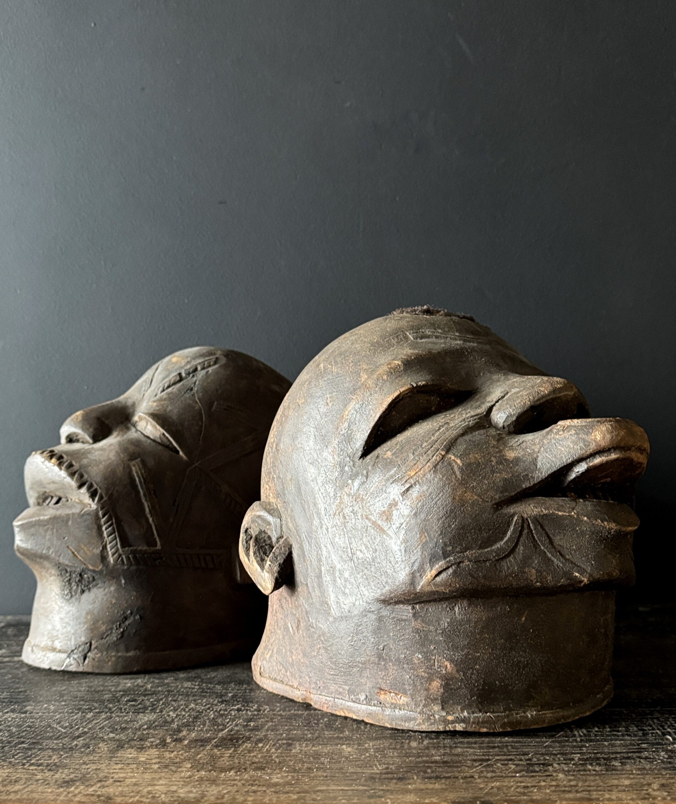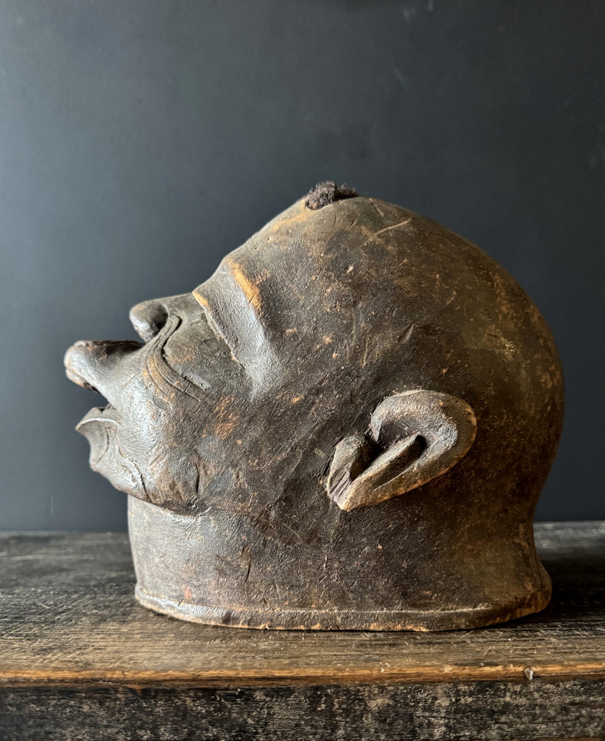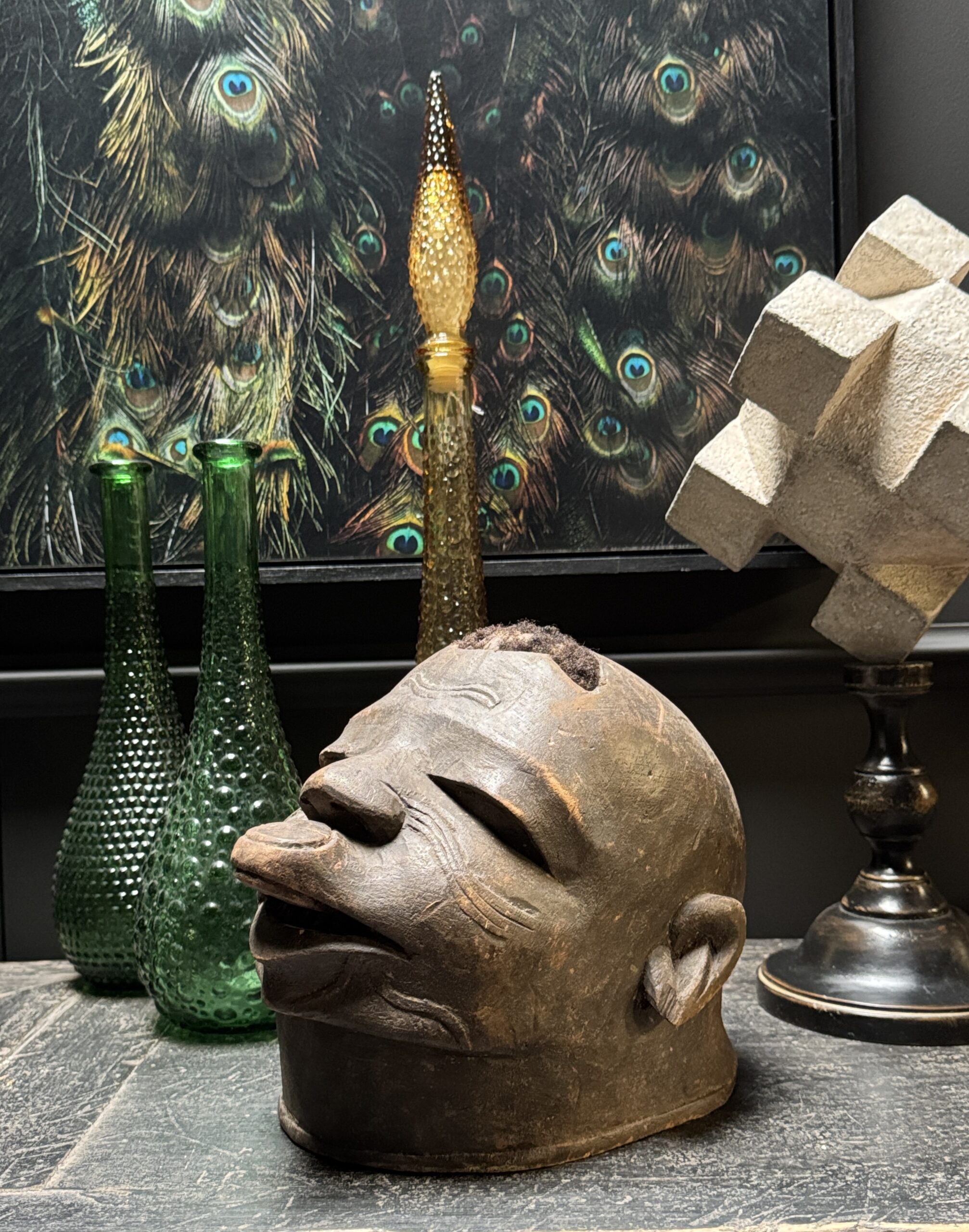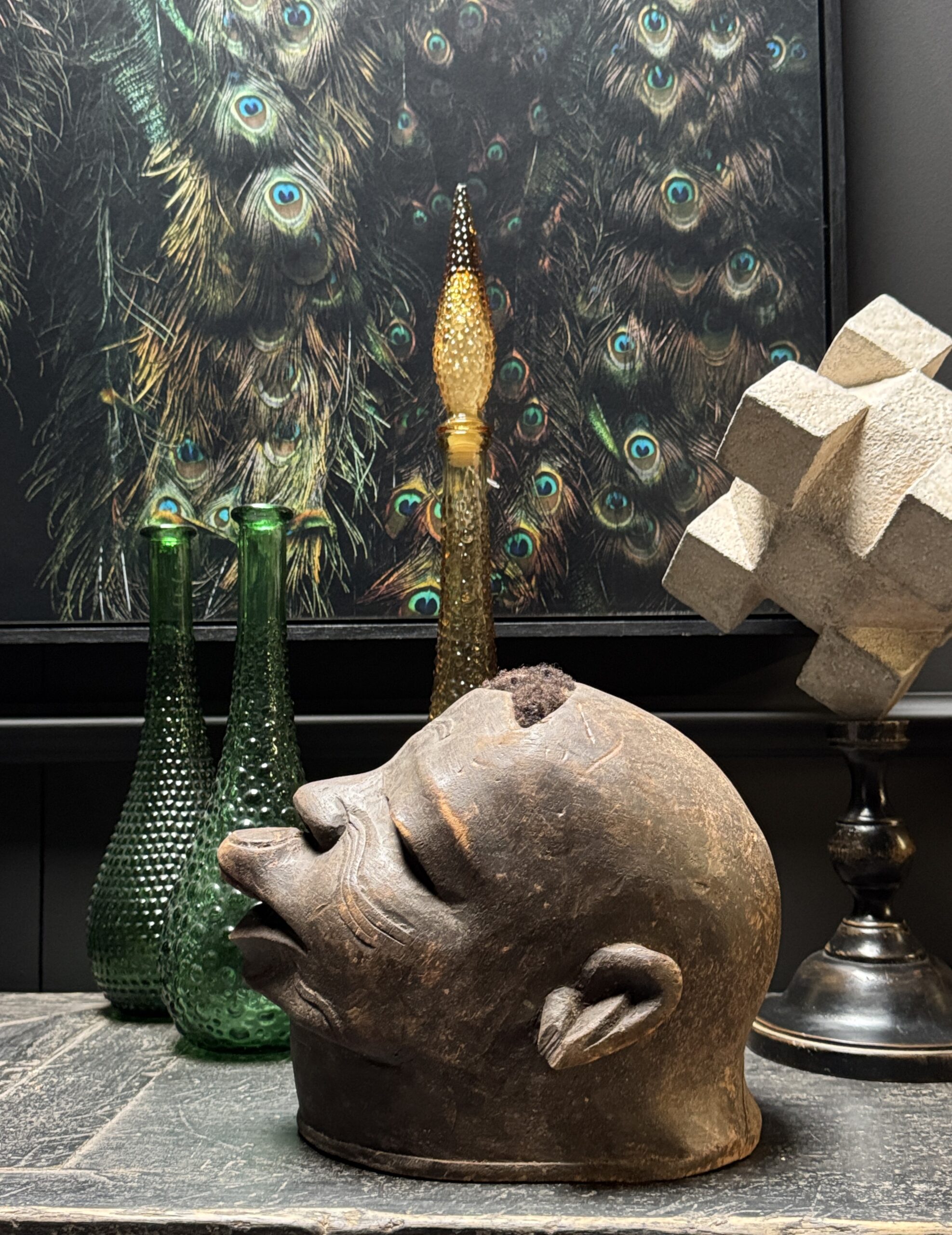 Dekorative afrikanische Maske. Eine Makonde-Lipoko-Maske ist eine traditionelle Ritualmaske, die aus dem Südosten Tansanias und dem Norden Mosambiks stammt. Sie wird von den Makonde hergestellt, einer ethnischen Gruppe mit einer reichen Schnitzertradition. Lipoko-Masken, die in der Regel aus hellem Holz gefertigt und manchmal mit echtem Haar oder Pigmenten verziert sind, wurden bei Initiationsritualen und Beerdigungszeremonien verwendet. Sie symbolisierten die Geister der Ahnen und dienten als Bindeglied zwischen den Lebenden und der geistigen Welt. Der ausdrucksstarke Gesichtsausdruck der Masken, oft mit offenem Mund, hervorstehenden Wangenknochen und eingravierten Mustern, verstärkte die mystische Atmosphäre der Zeremonien. Heute werden die Makonde-Masken nicht nur als kulturelles Erbe, sondern auch als besondere Kunstobjekte geschätzt, die handwerkliches Können und spirituelle Bedeutung miteinander verbinden.