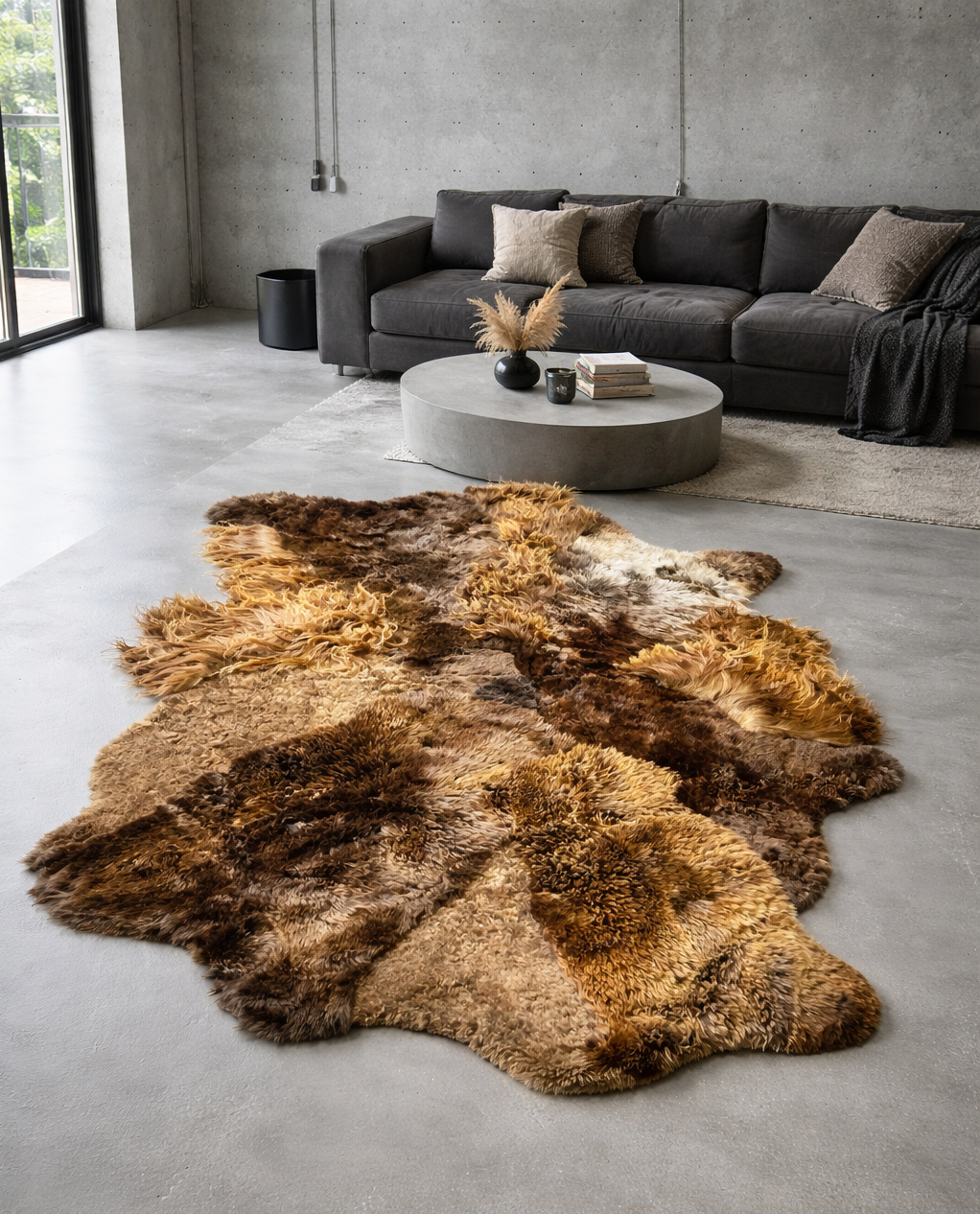 Hochwertiger und attraktiver mehrlagiger brauner Mischteppich aus vielen Schafsfellen der Qualität A.