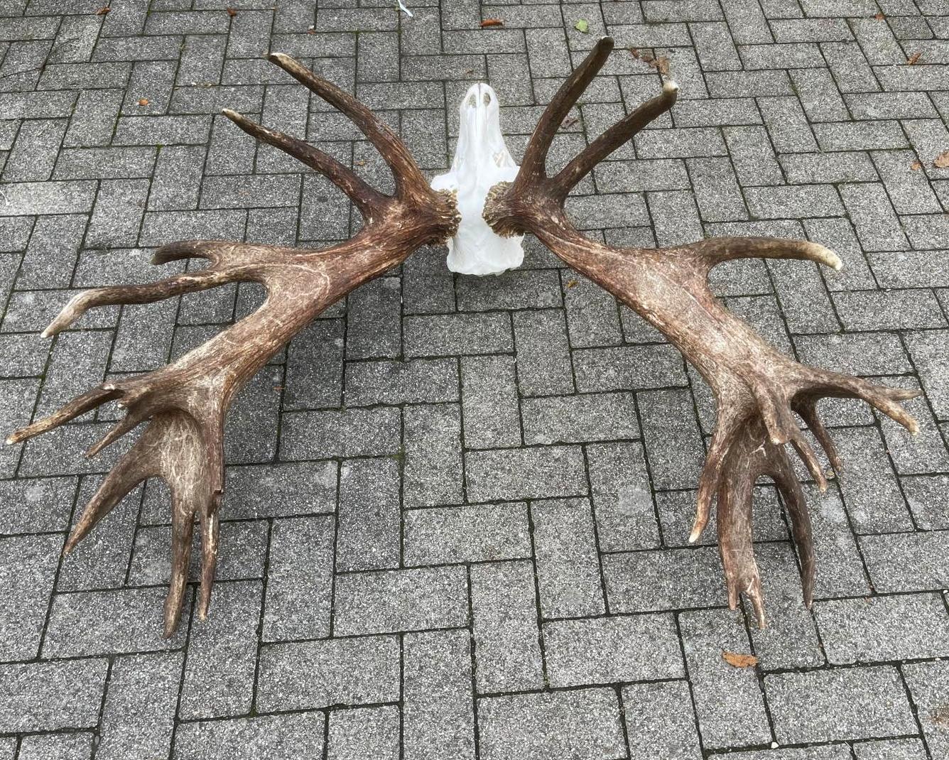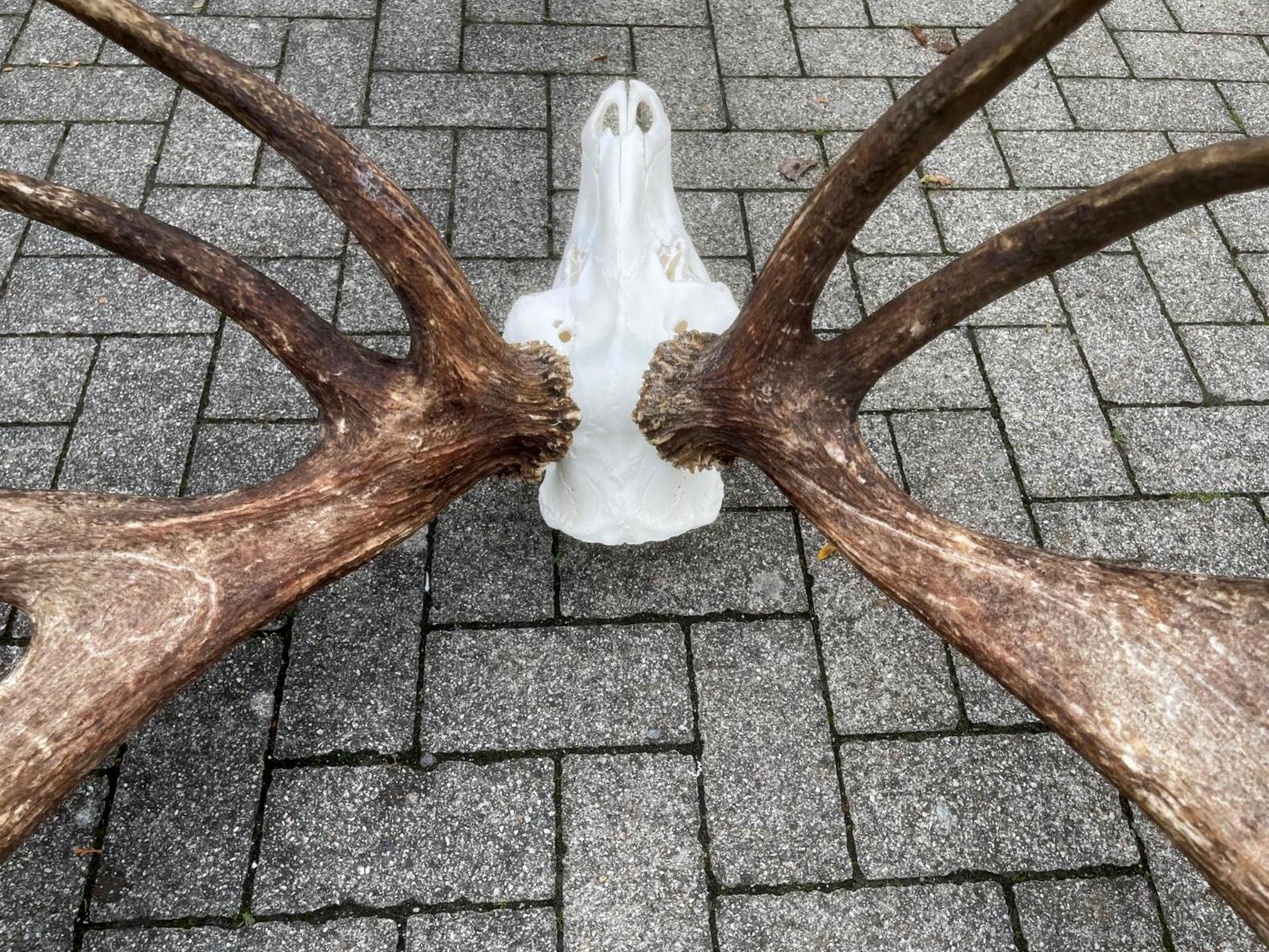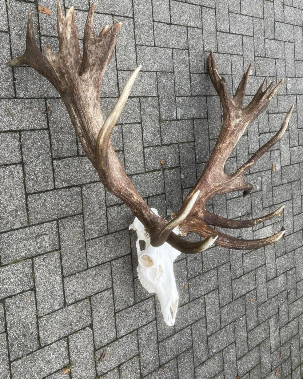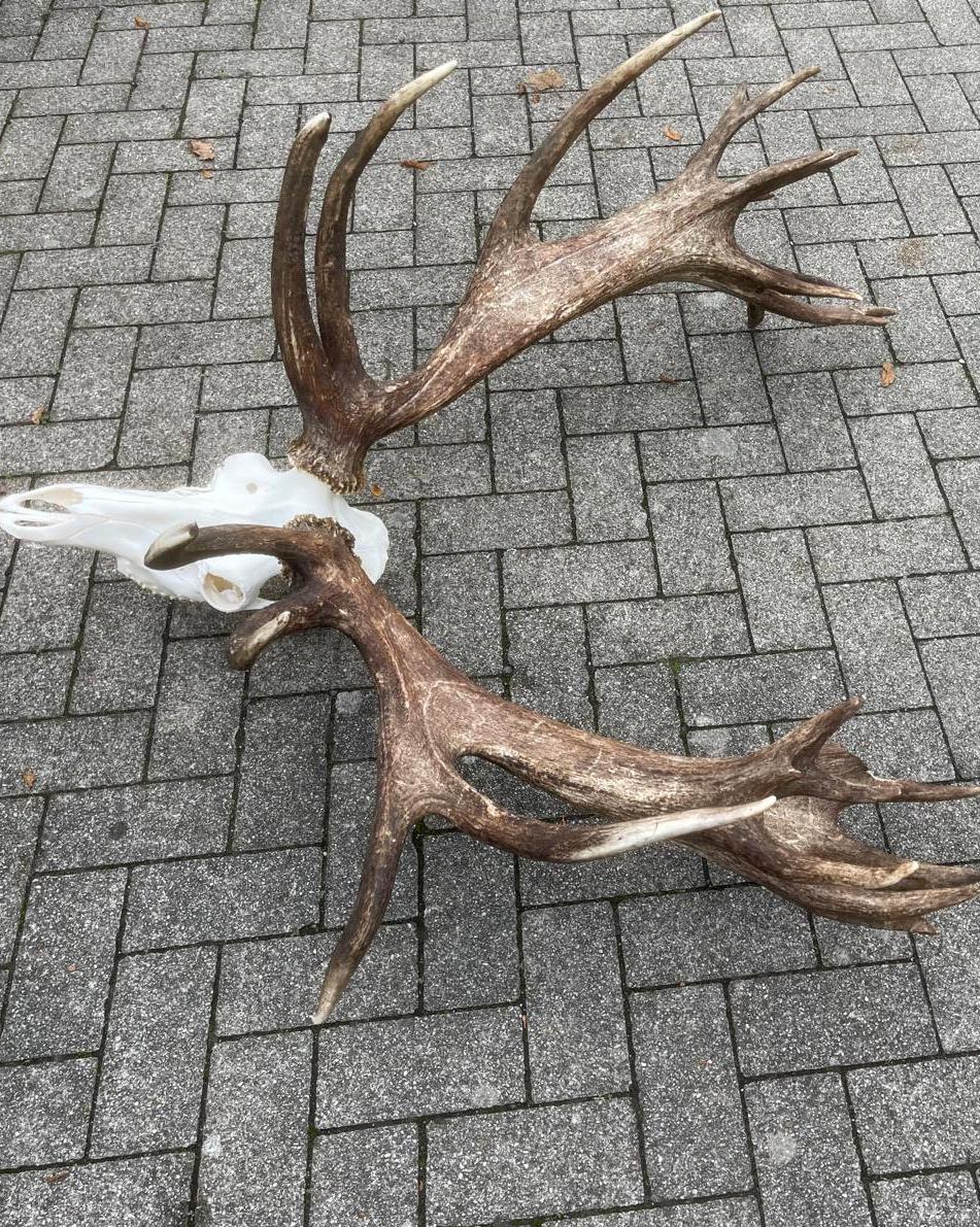 Enorm schweres und großes Rothirschgeweih. Das Geweih dieses Rothirsches zeichnet sich durch sein außergewöhnlich hohes Gewicht und seine beeindruckende Größe aus. Seine robuste Struktur und die breiten Verzweigungen lassen auf eine starke körperliche Entwicklung schließen. Diese Kombination aus Masse und Größe macht das Geweih zu einem besonderen und unverwechselbaren Merkmal innerhalb der Art. Ein wunderschöner Blickfang, wenn Sie auf der Suche nach einem besonderen Geweih sind. Es handelt sich um ein 26-Enden-Geweih mit einem Gewicht von 11,4 kg.
