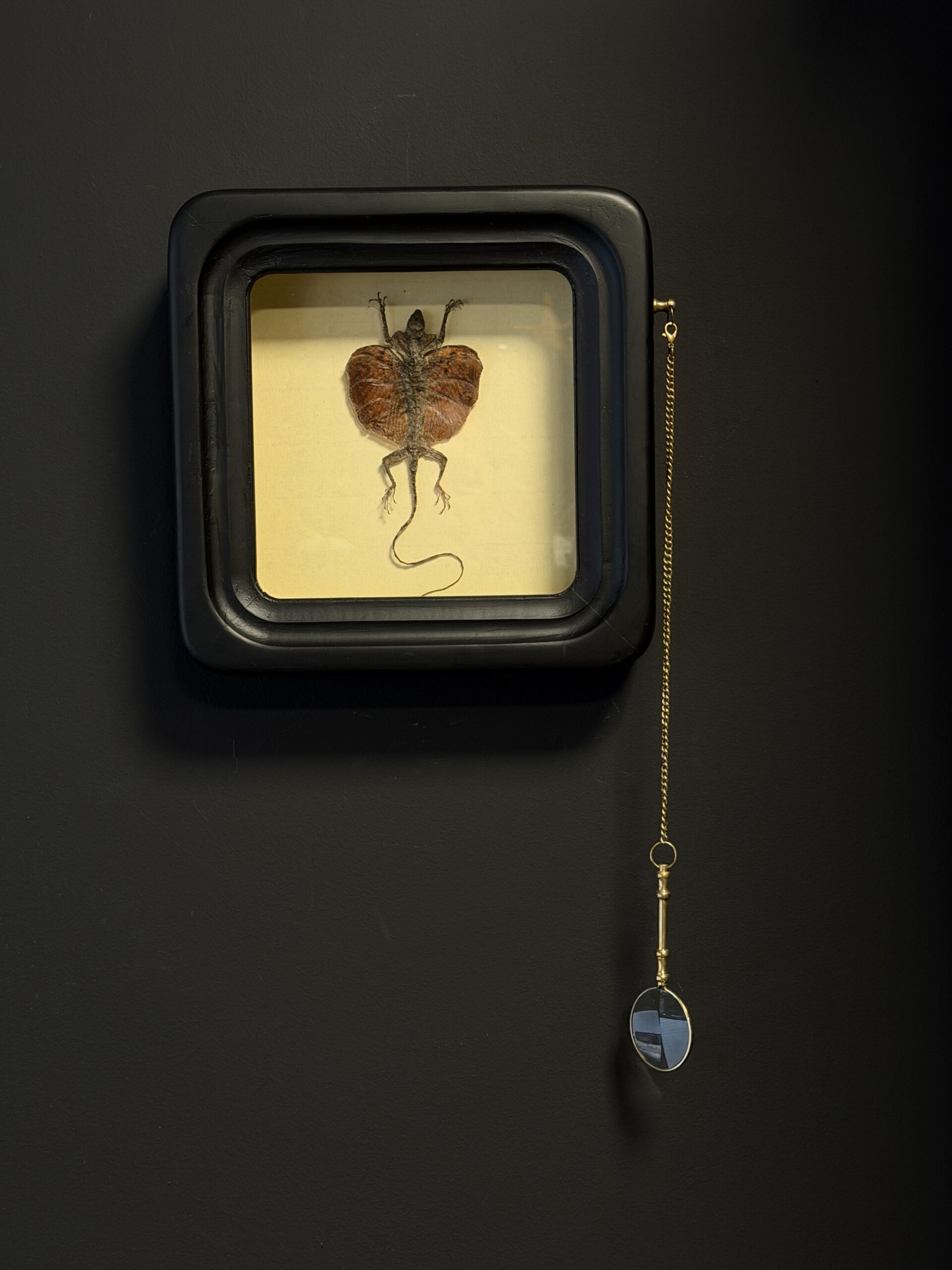 Fliegende Eidechse, bereit, mit der Messinglupe beobachtet zu werden. Die Draco dussumieri macht buchstäblich einen „Wingsuit“! Aber während Menschen ein Kostüm mit Flügeln bauen, kann dieses Reptil 10 bis 12 Meter weit von einem Baum zum anderen gleiten und dabei seine prächtigen Farben zeigen, die nur auf seinen Flügeln zu sehen sind. Diese „Flügel“ werden von 6 Paaren extrem verlängerter Rippen gestützt. Er lässt sich von der Spitze eines Baumes fallen, breitet dann seine Vorderarme aus, streckt diesen „Schleier” aus und steuert schließlich durch Drehen seiner Handgelenke! Nur fliegende Eidechsen können das...