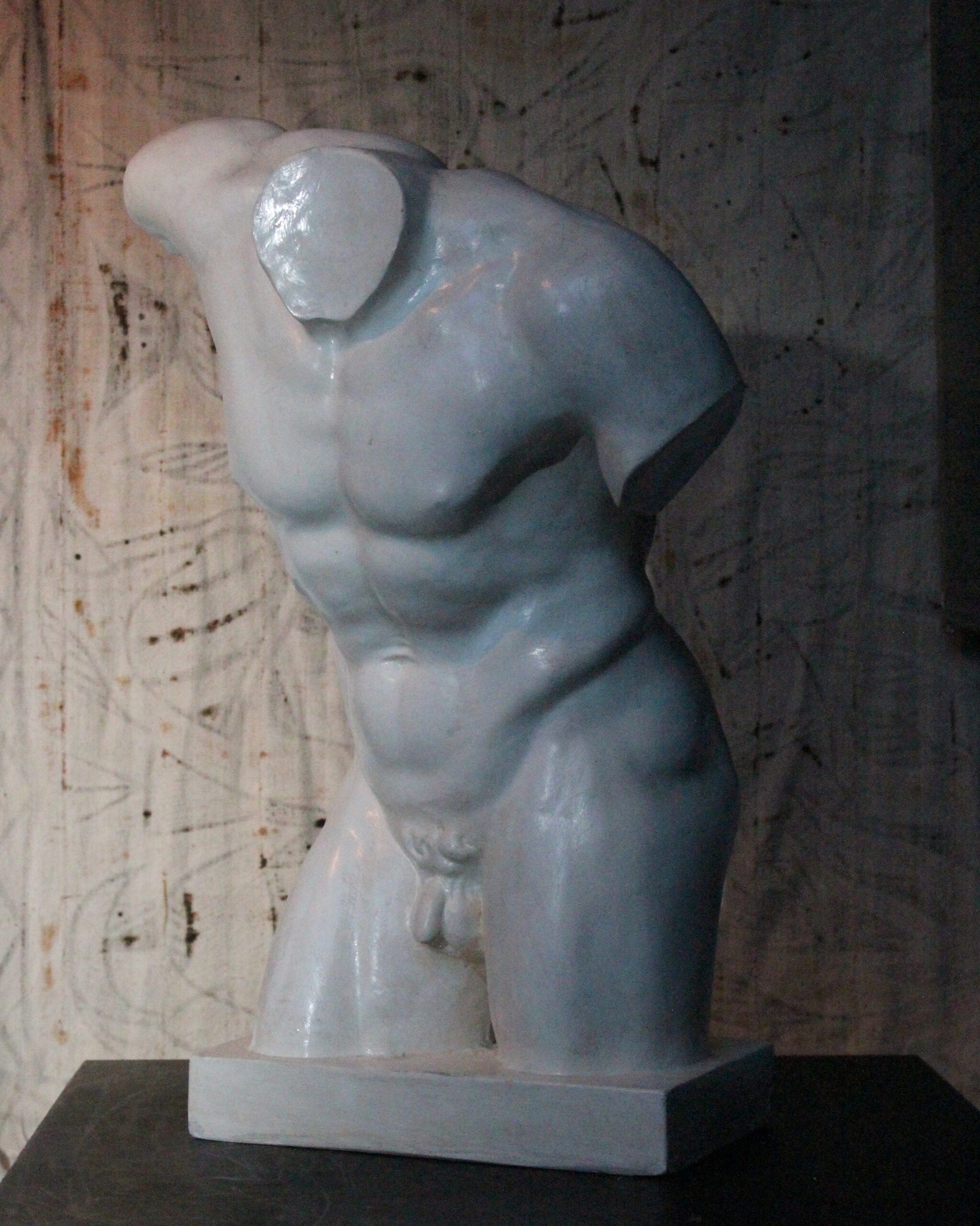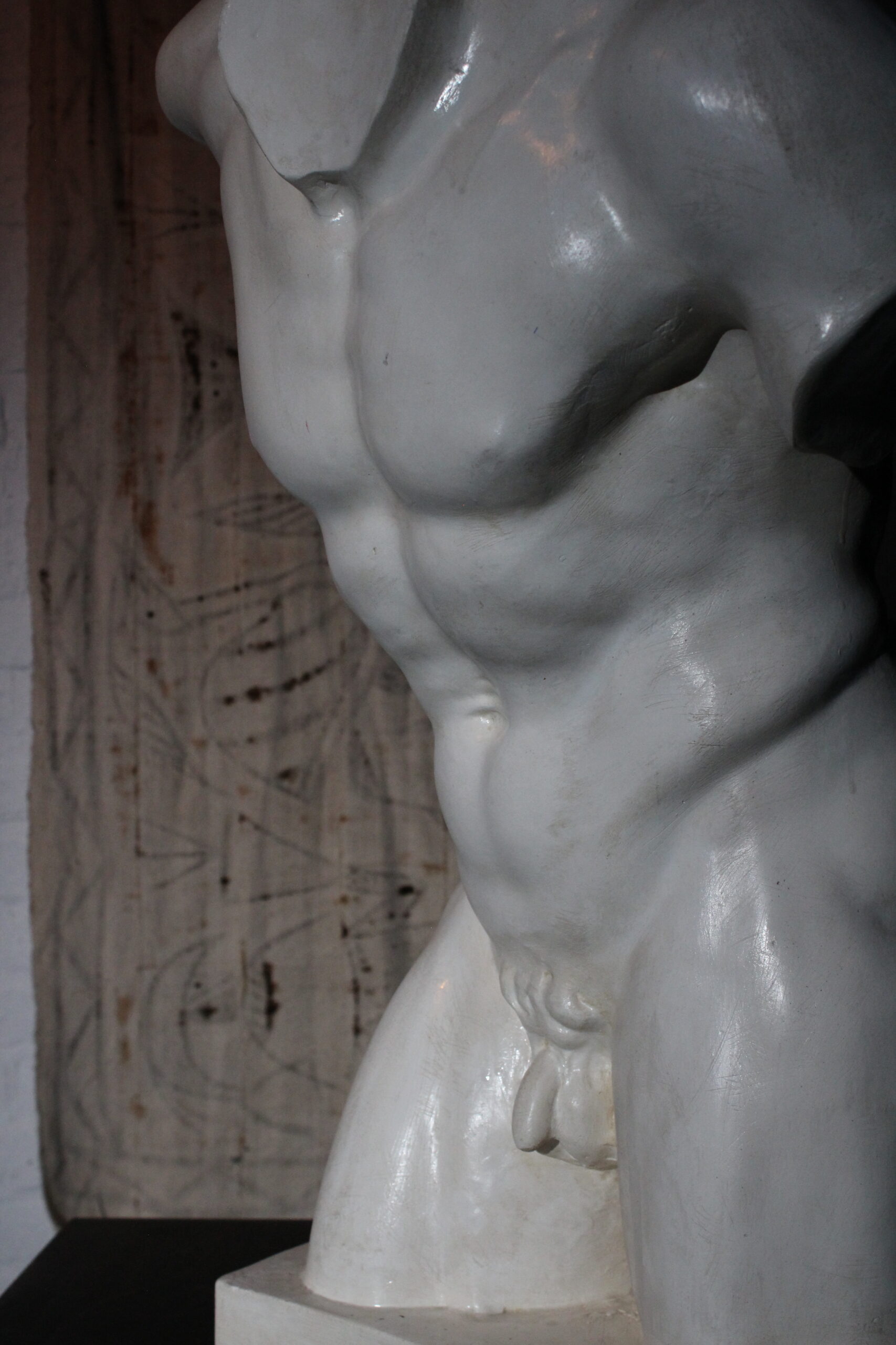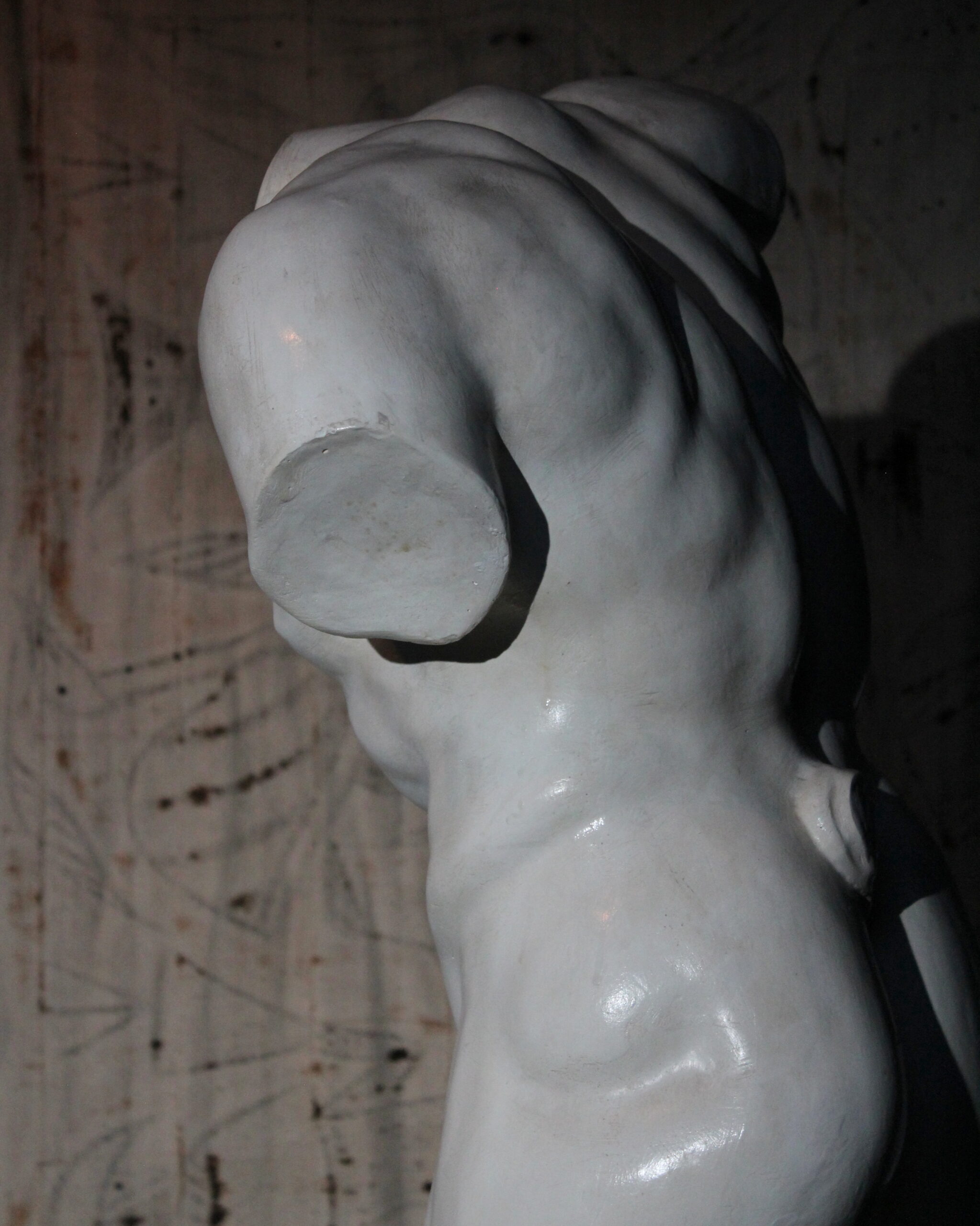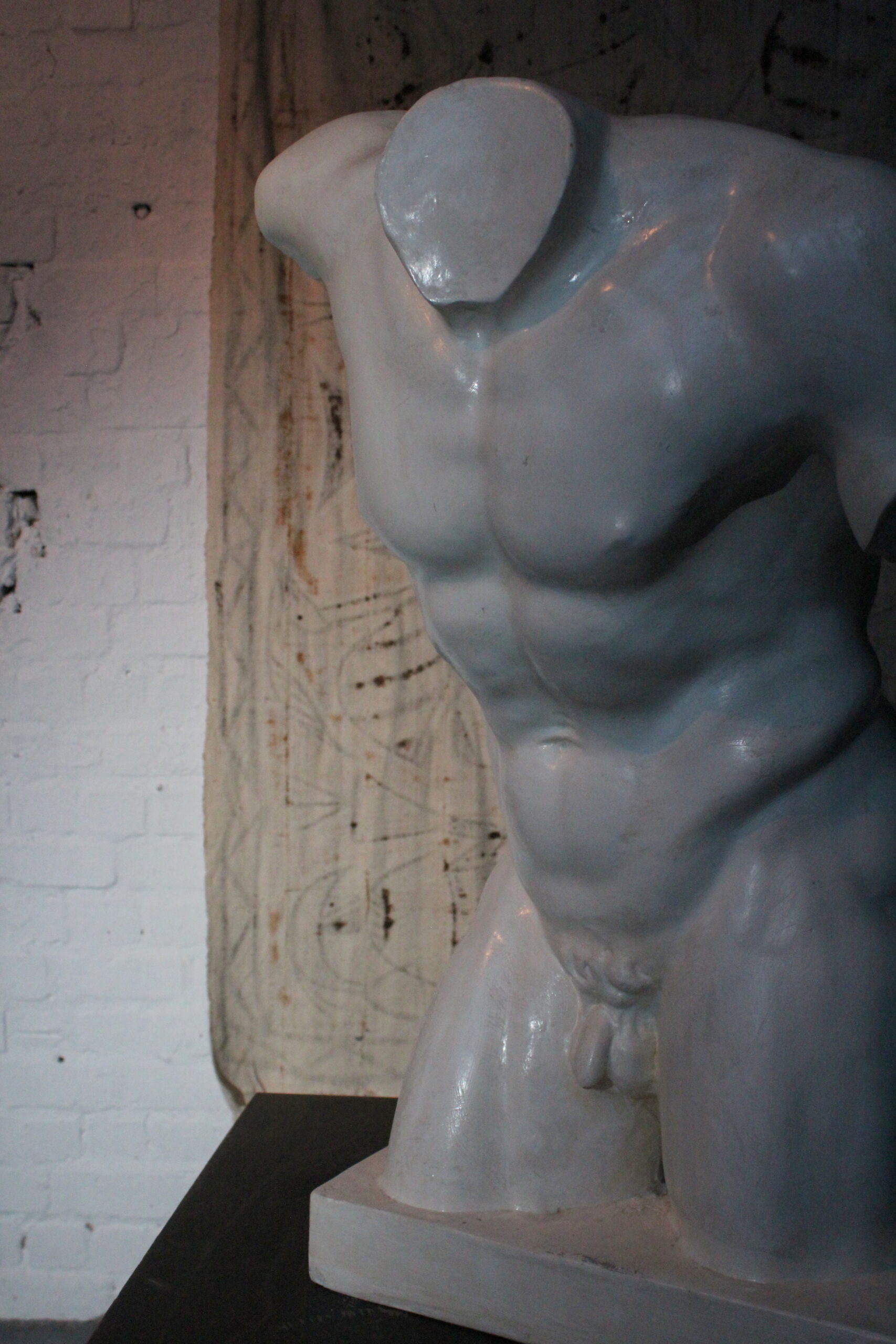 Gipsstudie des Oberkörpers eines mythologischen Satyr. Die Figur zeichnet sich durch den kleinen Schwanz über dem Gesäß aus, ein klassisches Attribut, das auf ihre mythologischen Ursprünge verweist.