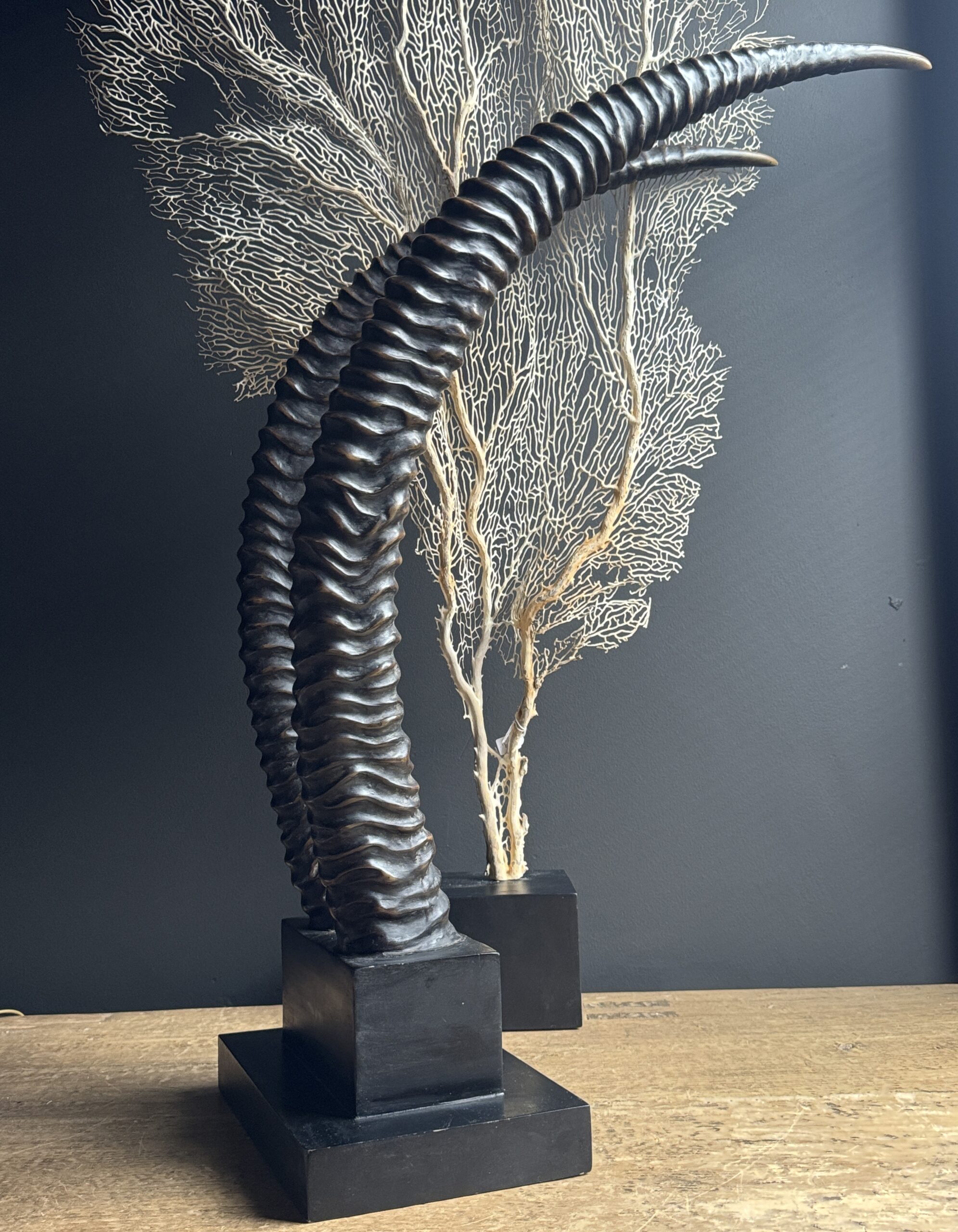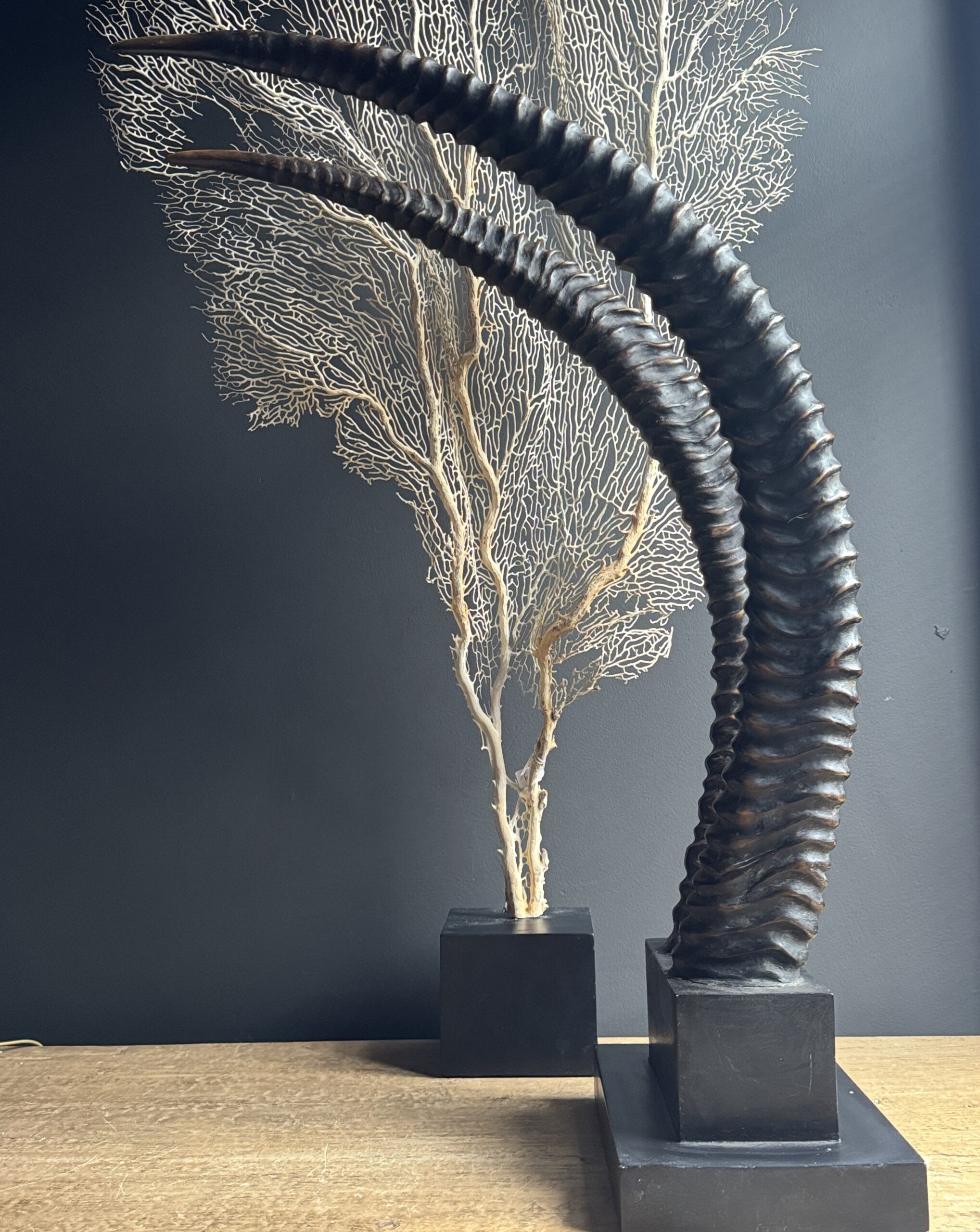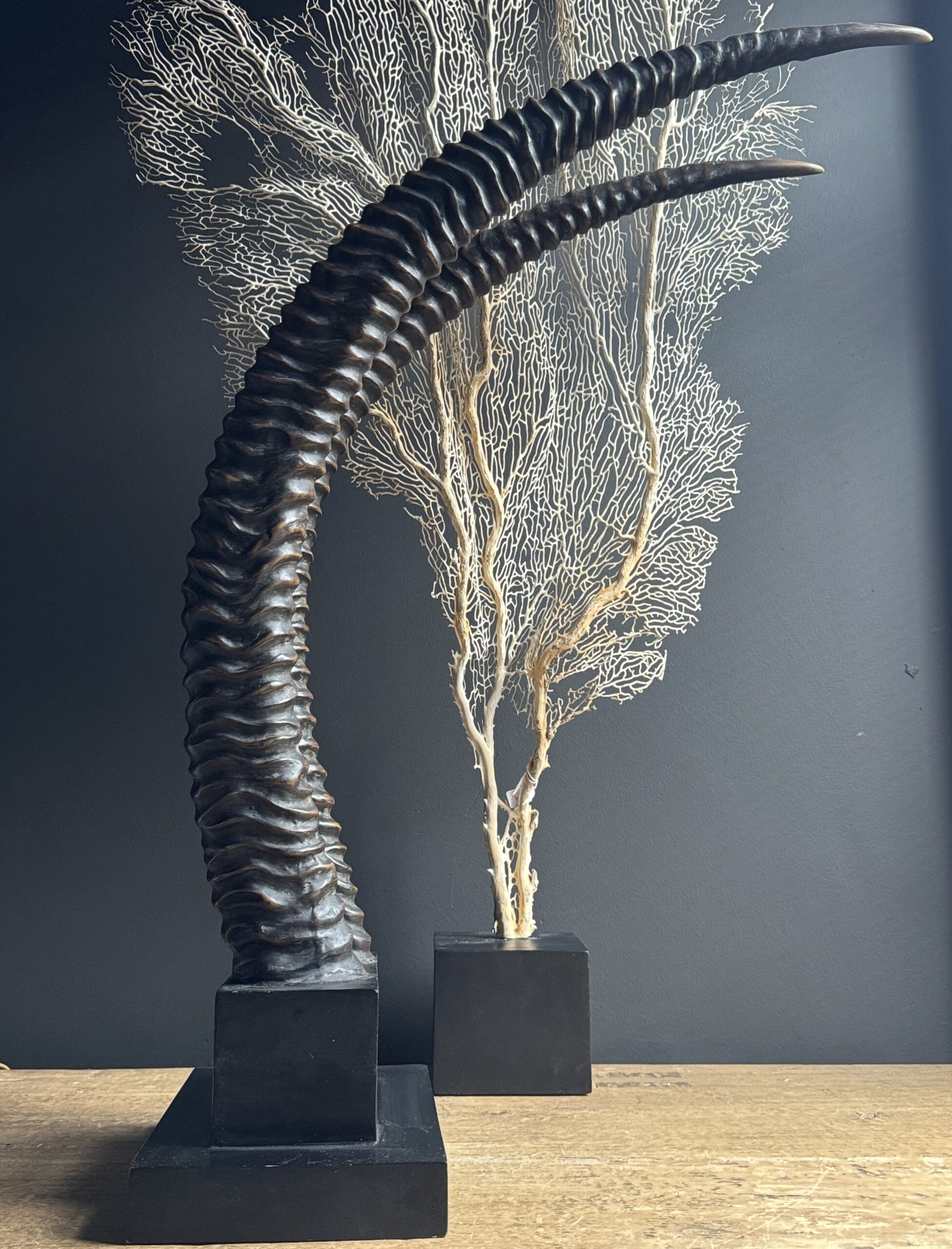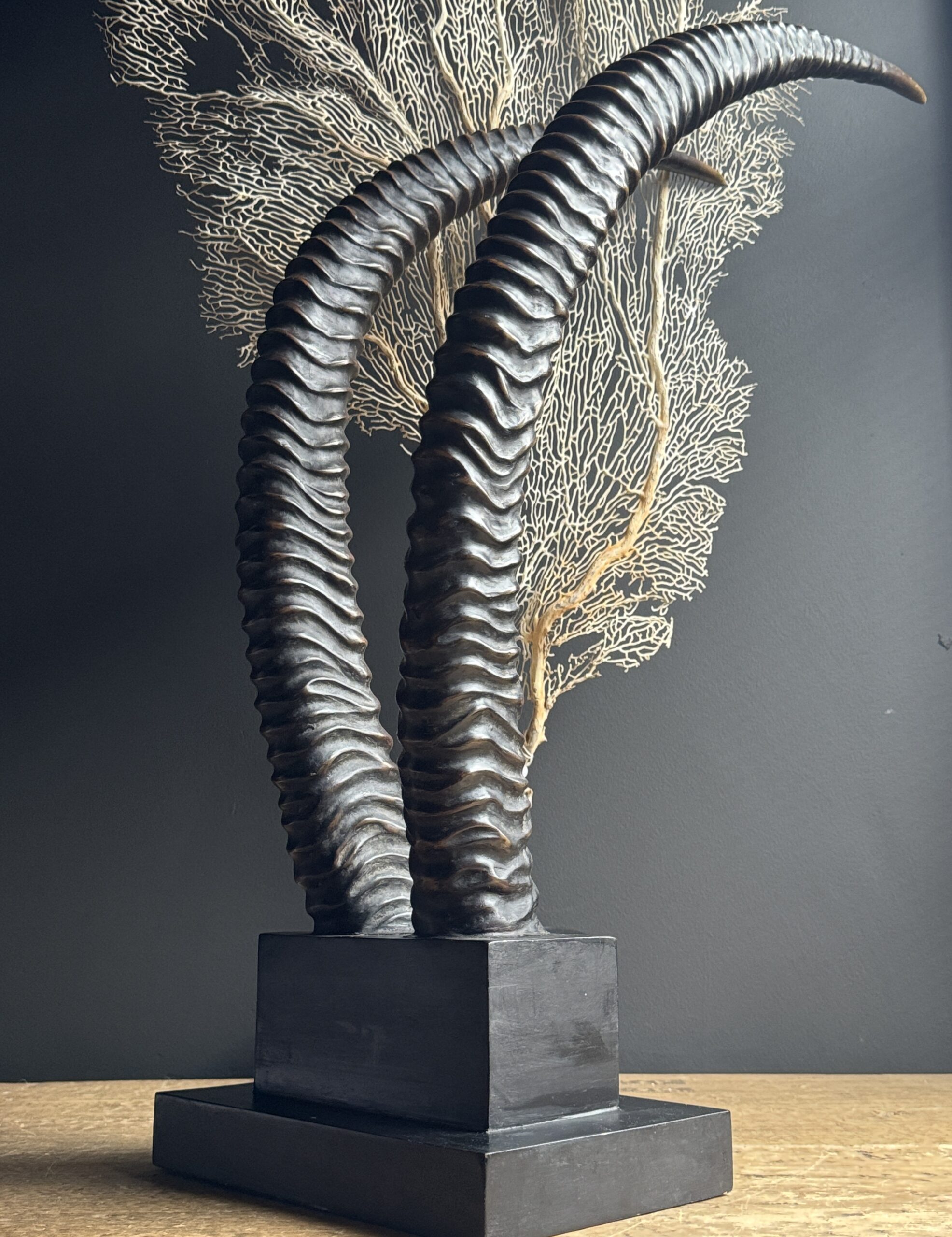 Diese dekorativen Hörner einer Rappenantilope sind ein stilvoller Blickfang für jedes Interieur. Diese realistischen Repliken sind detailgetreu nachgebildet und vom echten Tier kaum zu unterscheiden. Die anmutigen, geschwungenen Hörner stehen fest auf einem eleganten Sockel, der ihnen ein luxuriöses und natürliches Aussehen verleiht. Perfekt als subtiles Statement in einem modernen oder klassischen Interieur.