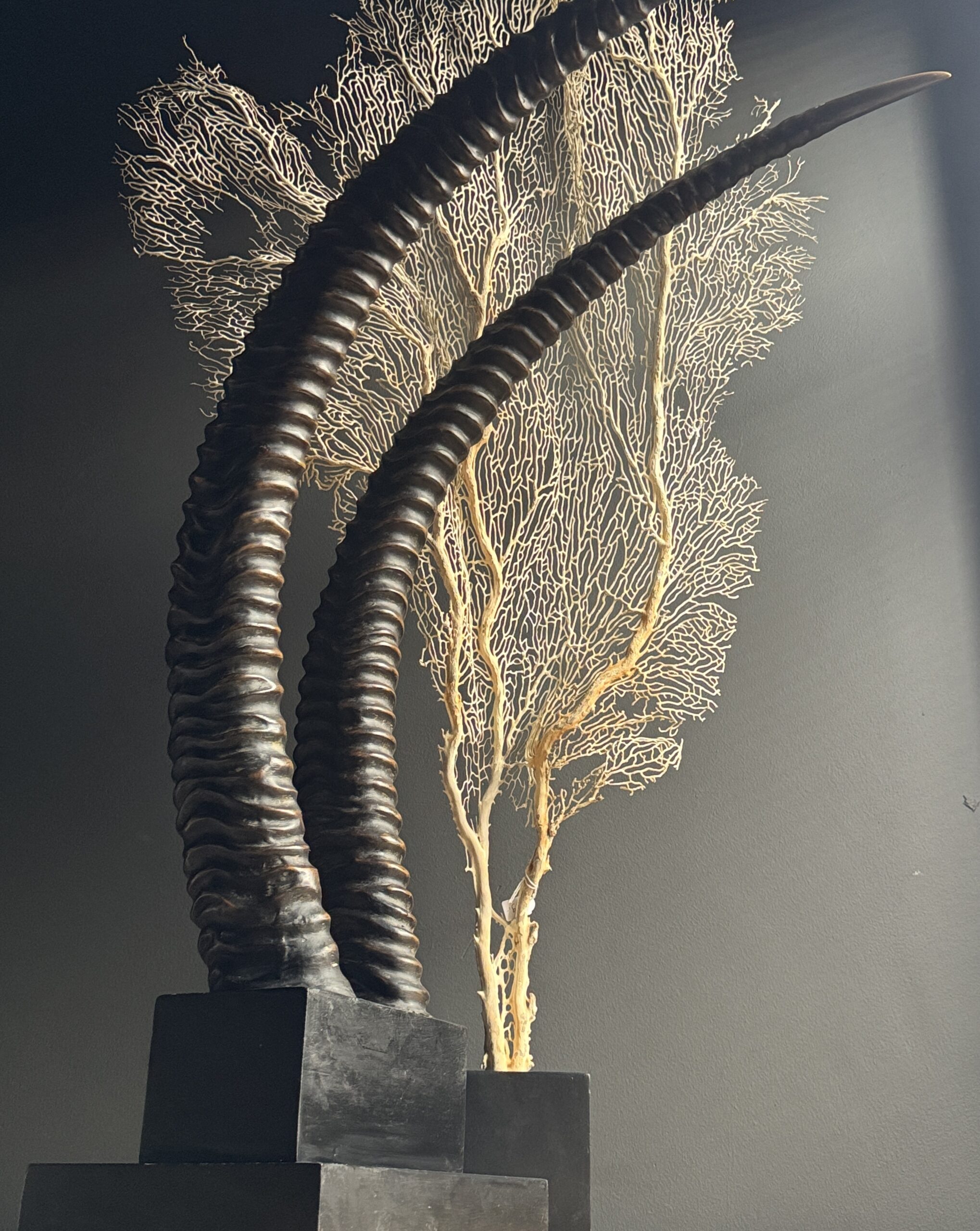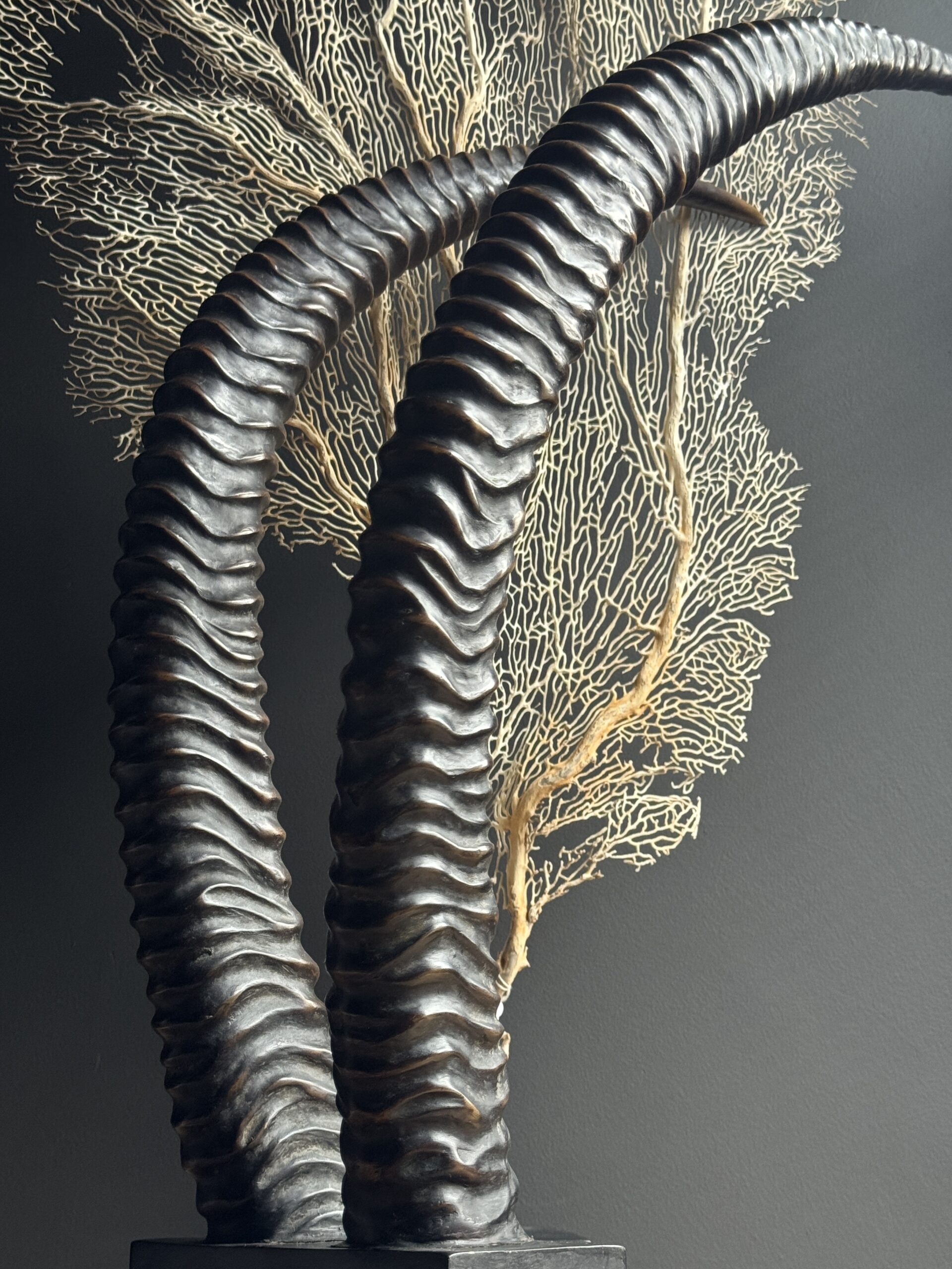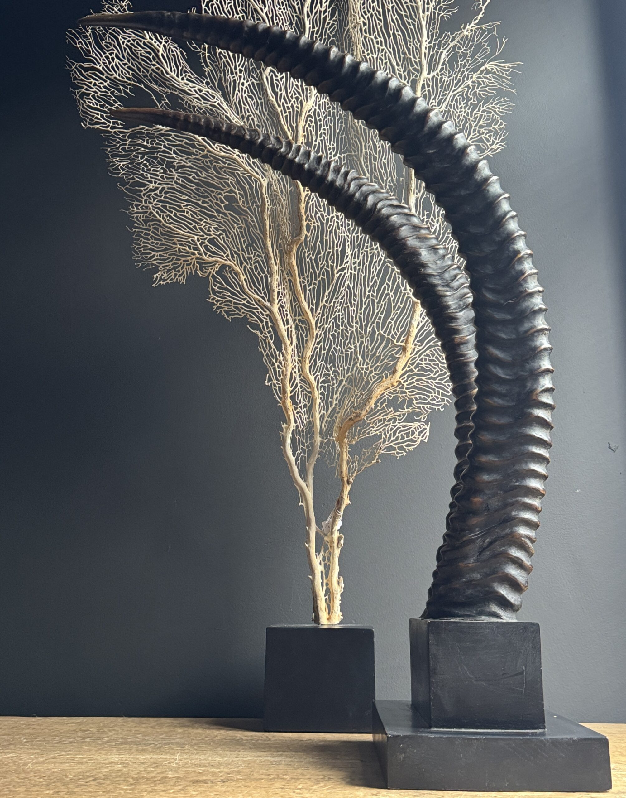 Diese dekorativen Hörner einer Rappenantilope sind ein stilvoller Blickfang für jedes Interieur. Diese realistischen Repliken sind detailgetreu nachgebildet und vom echten Tier kaum zu unterscheiden. Die anmutigen, geschwungenen Hörner stehen fest auf einem eleganten Sockel, der ihnen ein luxuriöses und natürliches Aussehen verleiht. Perfekt als subtiles Statement in einem modernen oder klassischen Interieur.
