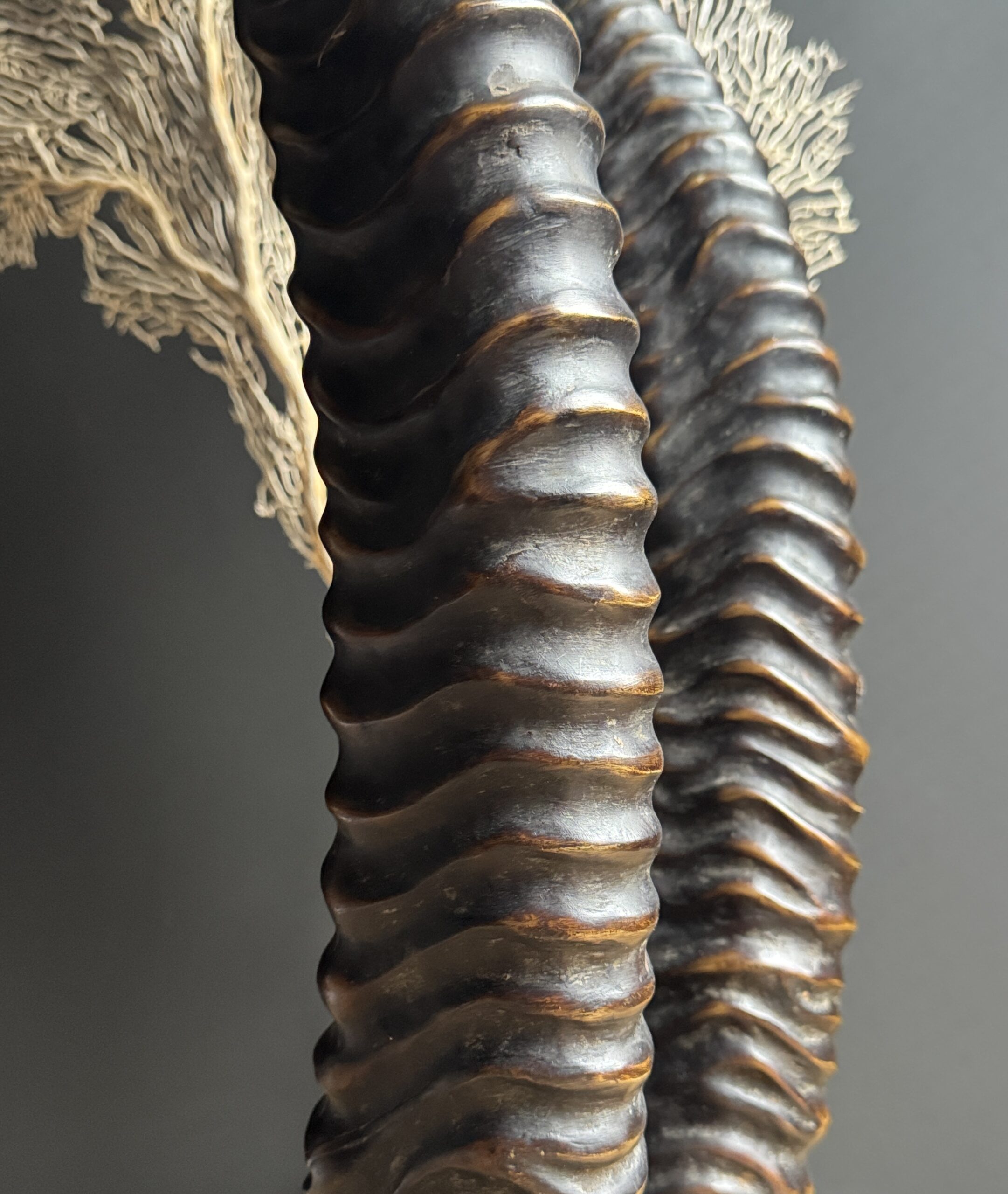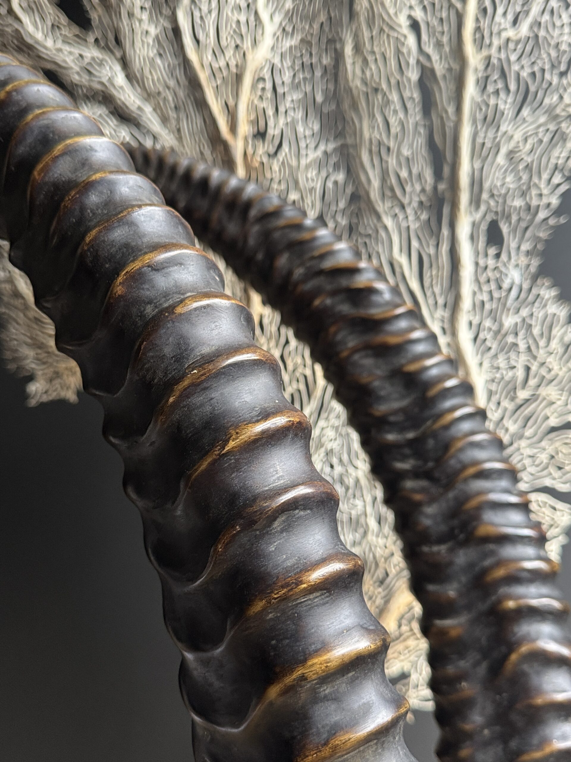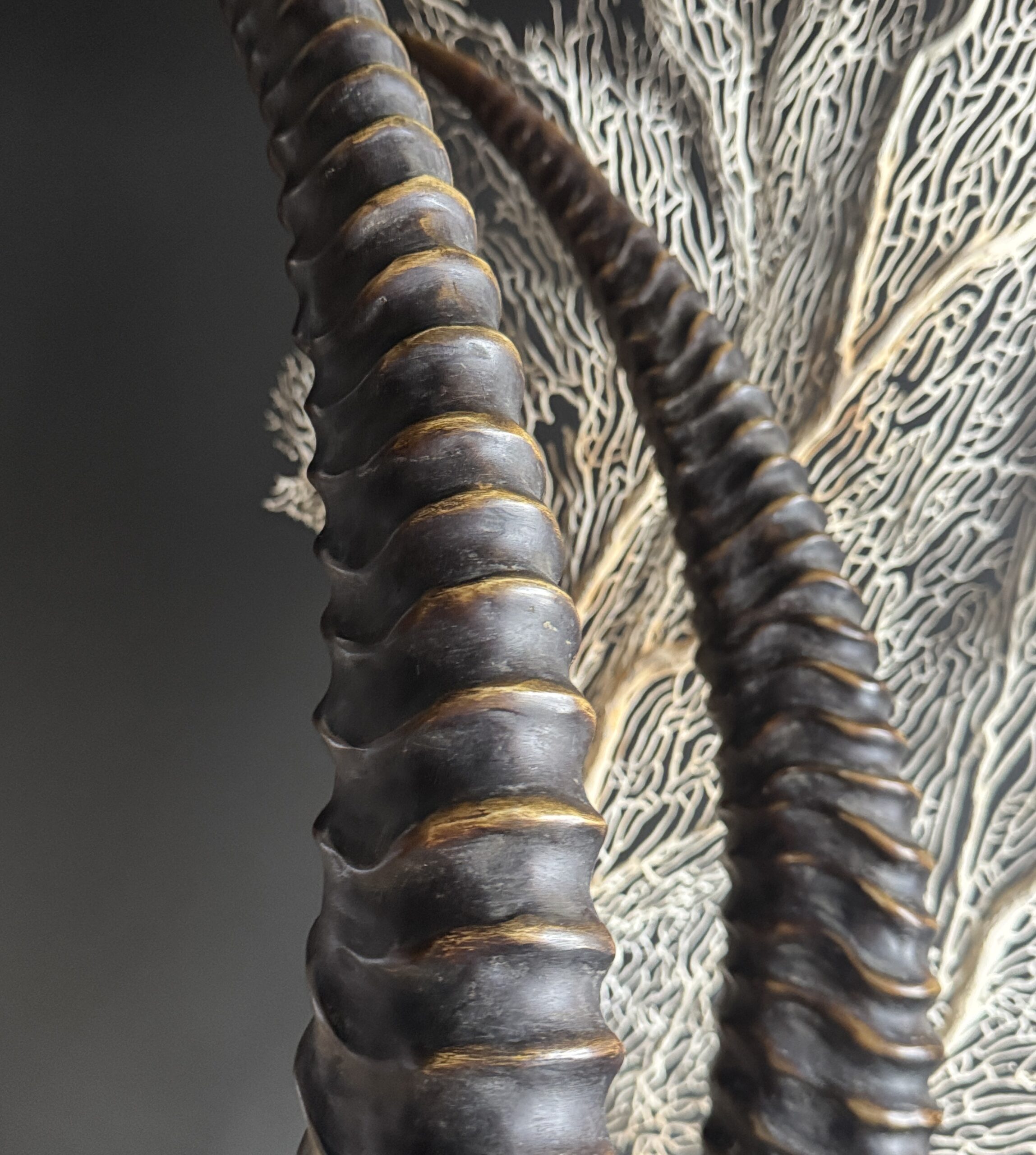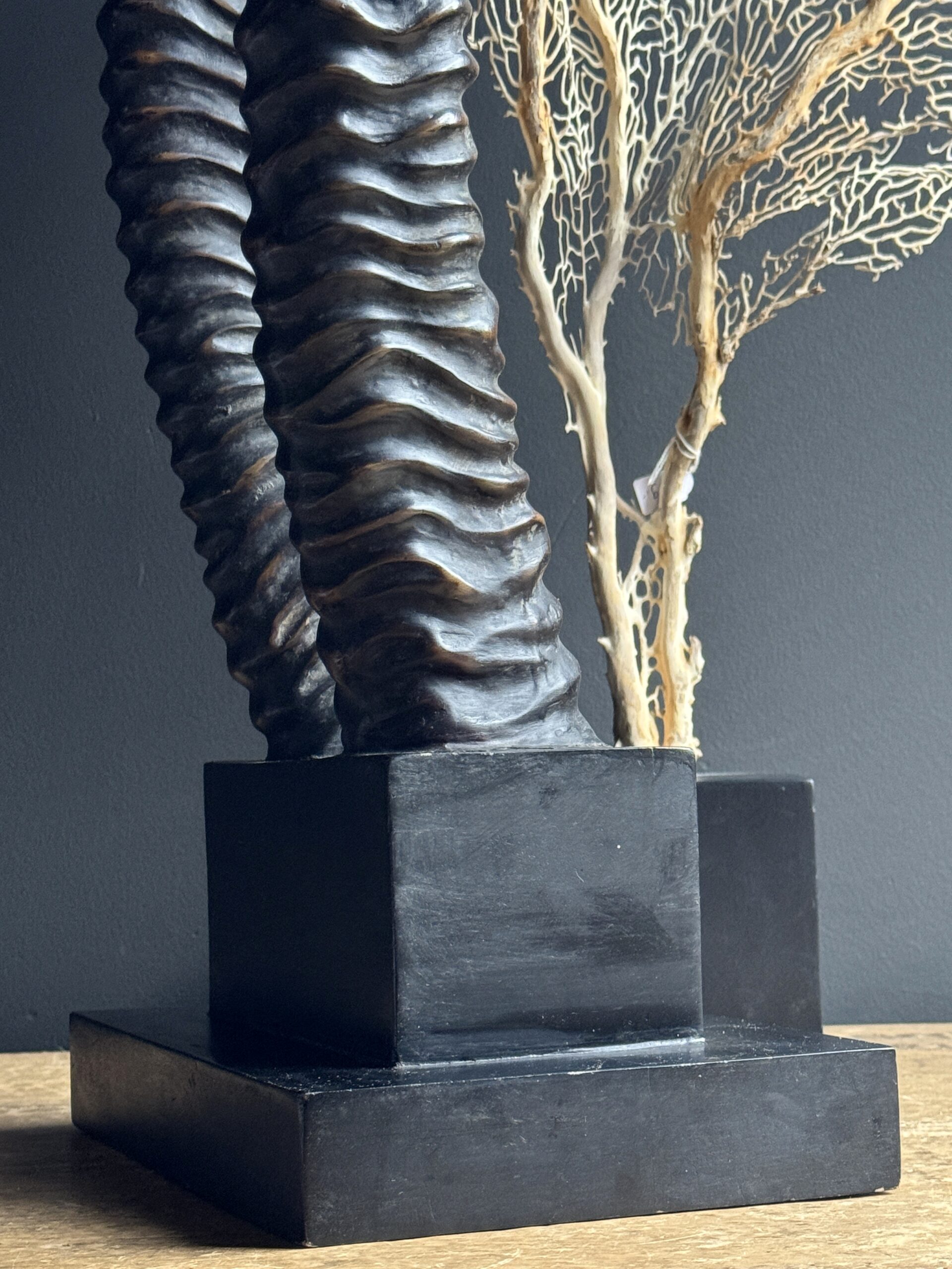 Diese dekorativen Hörner einer Rappenantilope sind ein stilvoller Blickfang für jedes Interieur. Diese realistischen Repliken sind detailgetreu nachgebildet und vom echten Tier kaum zu unterscheiden. Die anmutigen, geschwungenen Hörner stehen fest auf einem eleganten Sockel, der ihnen ein luxuriöses und natürliches Aussehen verleiht. Perfekt als subtiles Statement in einem modernen oder klassischen Interieur.