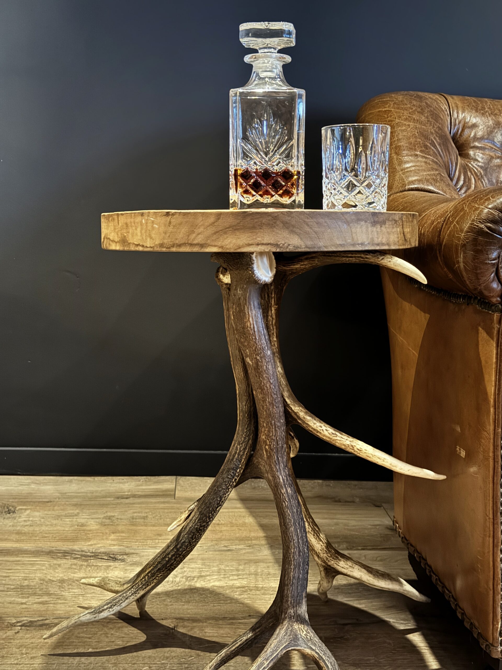 Die Geweihe, einst die Kronjuwelen stolzer Hirsche, bilden den Rahmen des kleinen Tisches. Die raue Textur und die einzigartigen Formen verleihen ihm ein rustikales Aussehen.