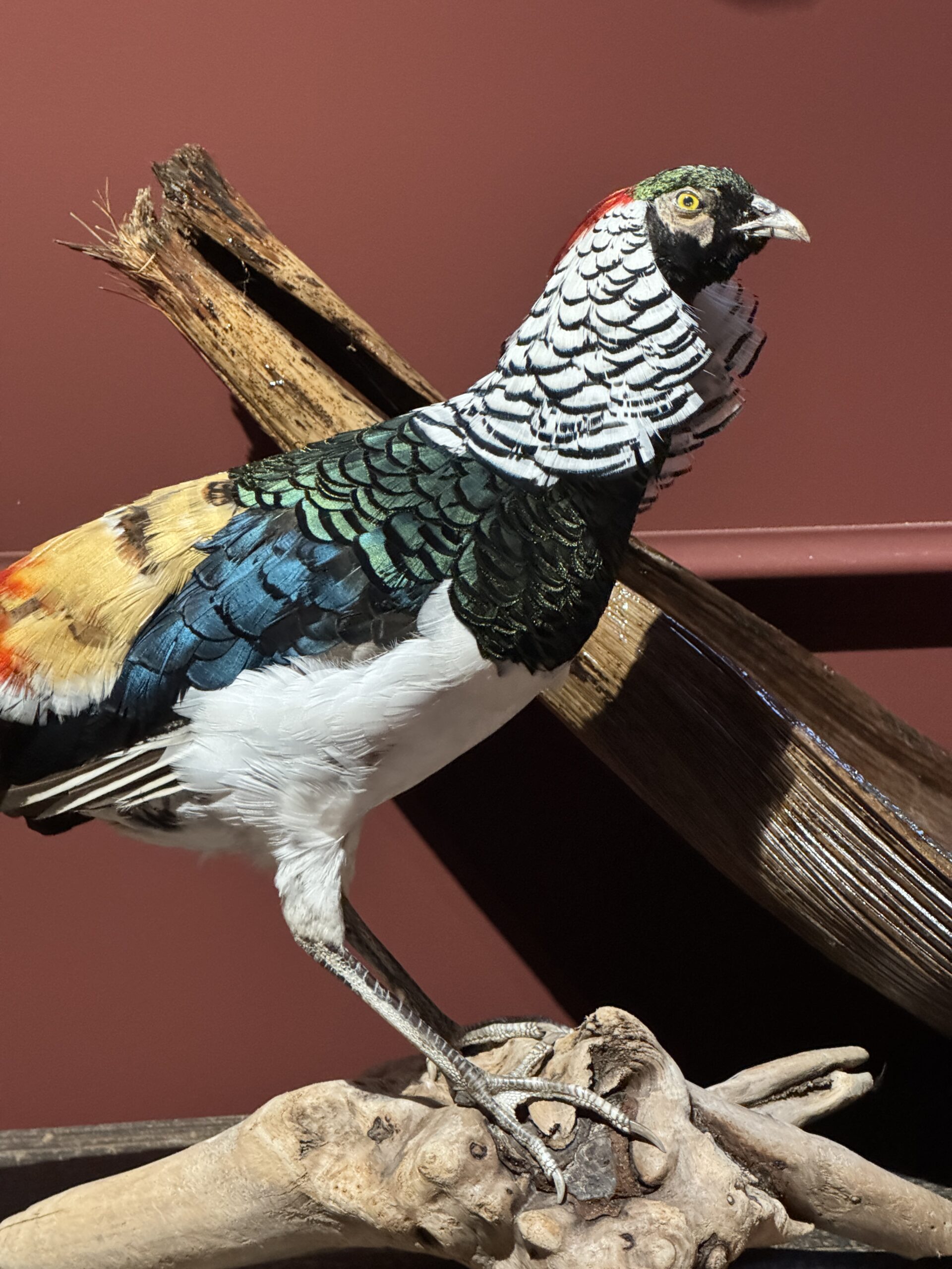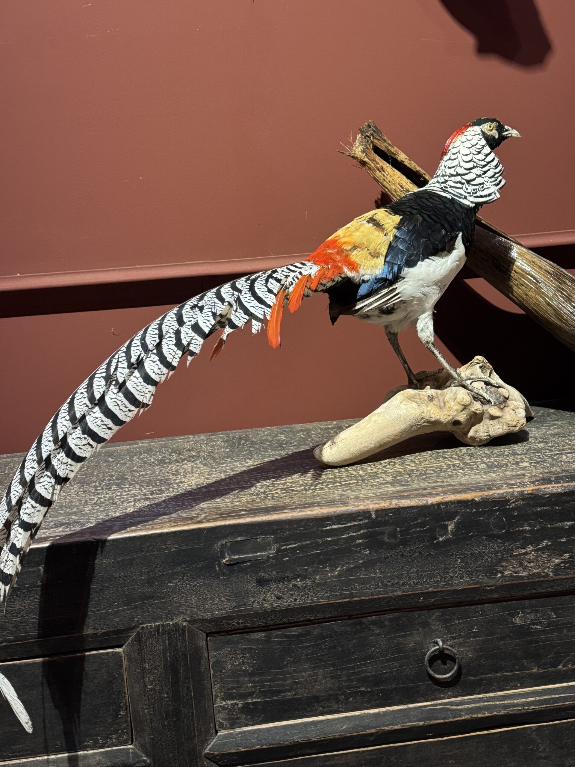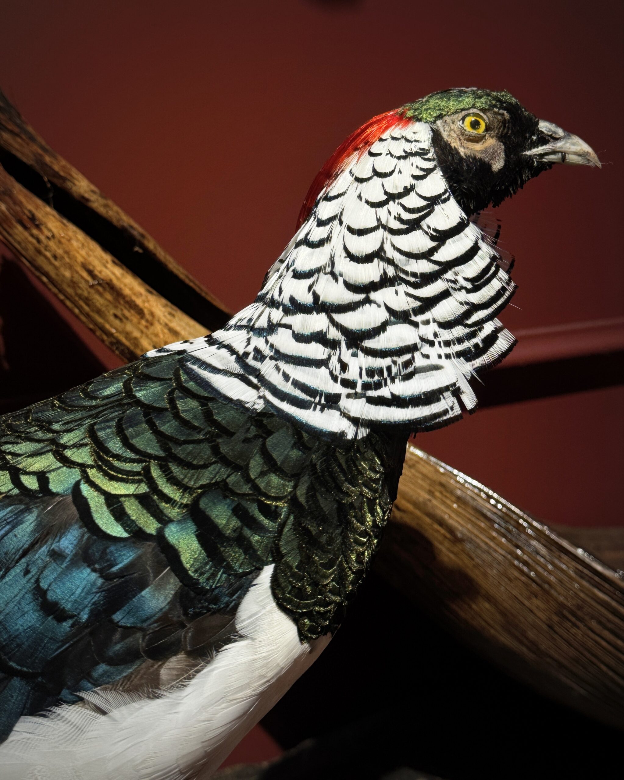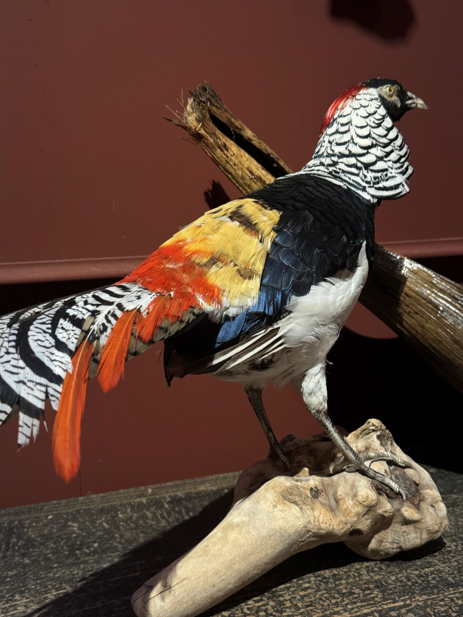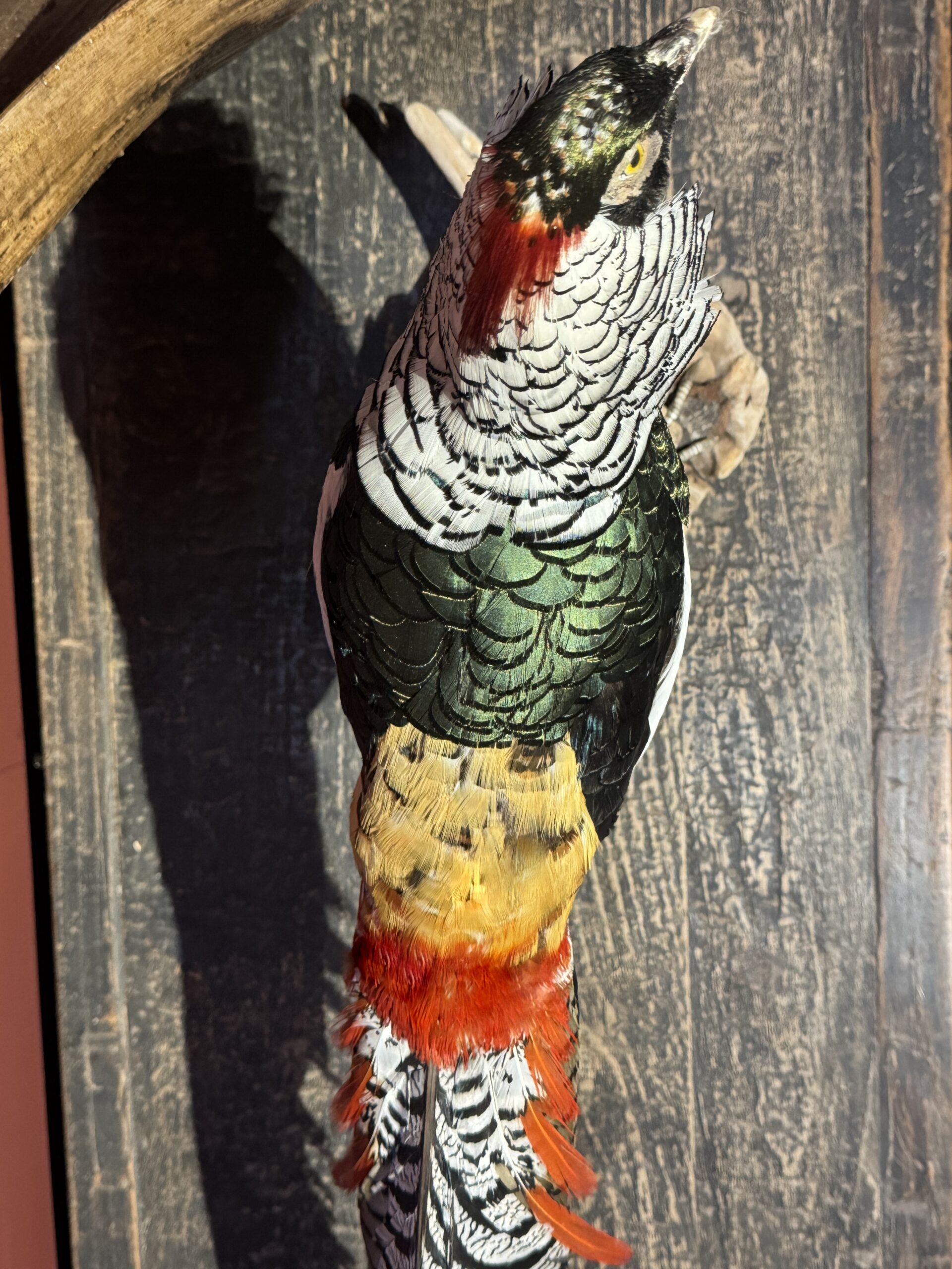 Ausgestopfter Lady-Amherst-Fasan. Dieser fachmännisch ausgestopfte Lady-Amherst-Fasan wurde mit Sorgfalt und Präzision präpariert. Das charakteristische Gefieder, die Farbkontraste und die Körperform sind originalgetreu nachgebildet. Dank der professionellen Verarbeitung behält das Exemplar ein repräsentatives Aussehen und eignet sich für pädagogische Zwecke, Sammlungen oder geschäftliche und dekorative Präsentationen.