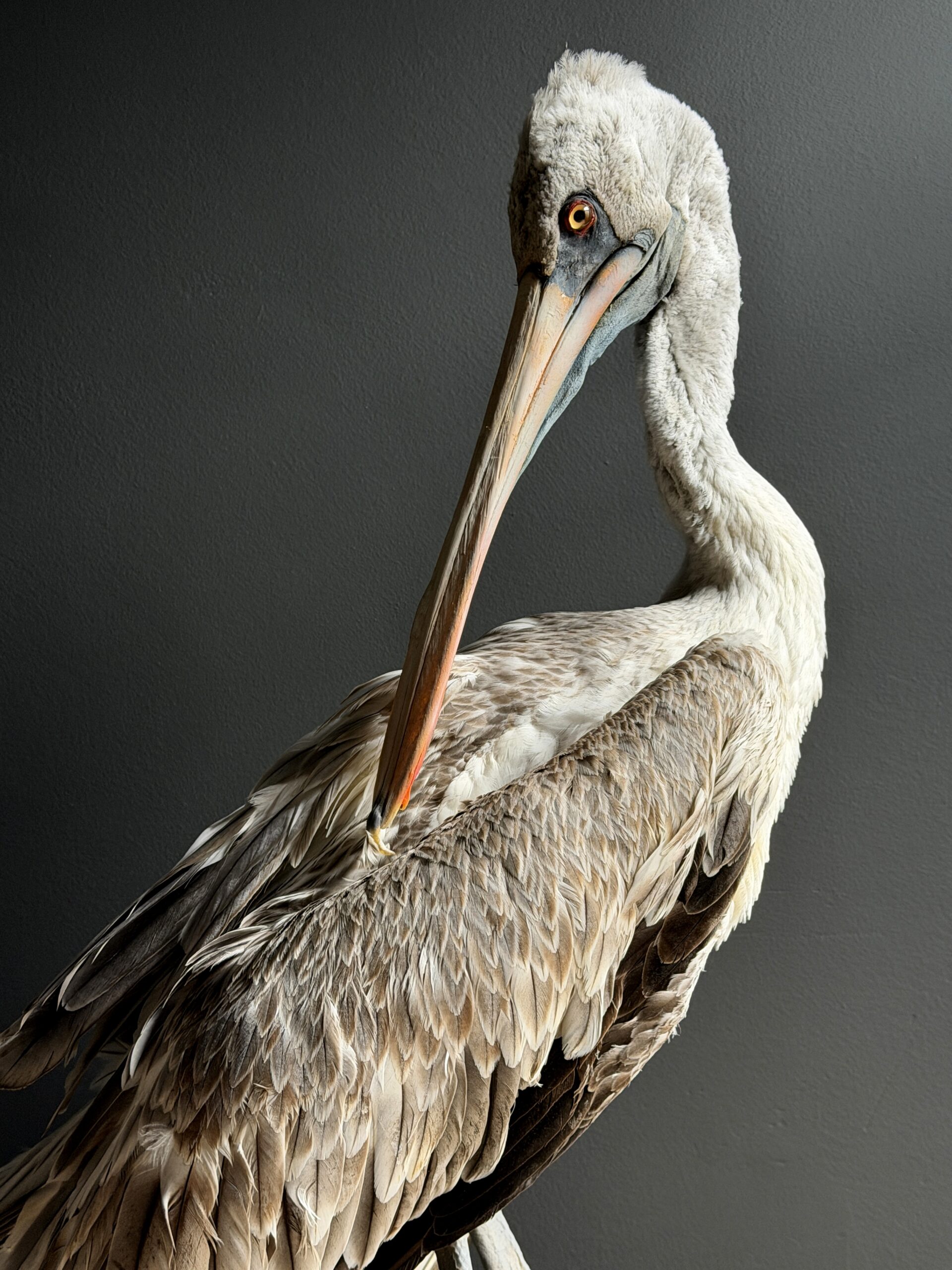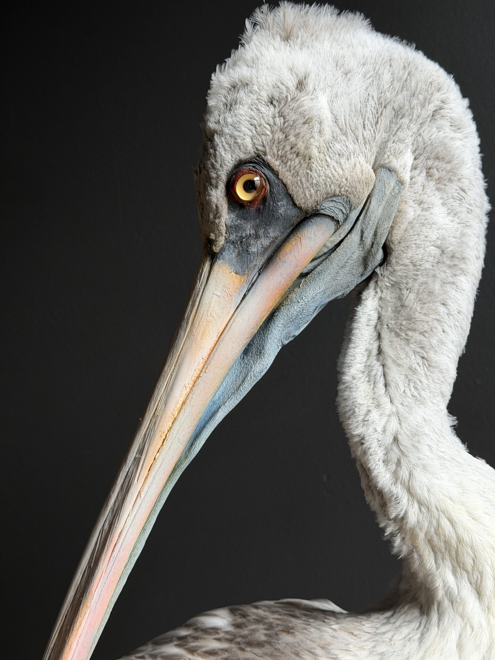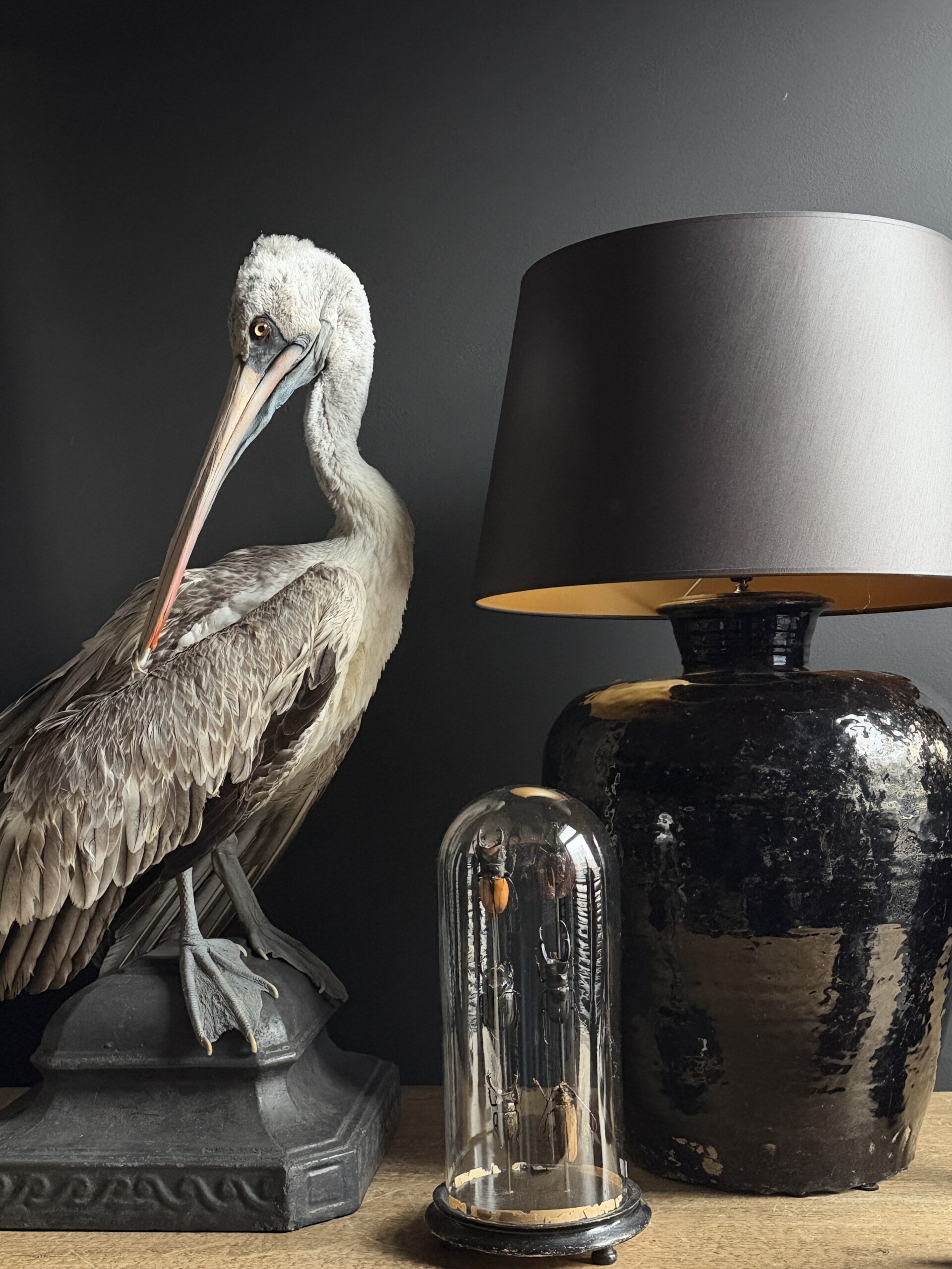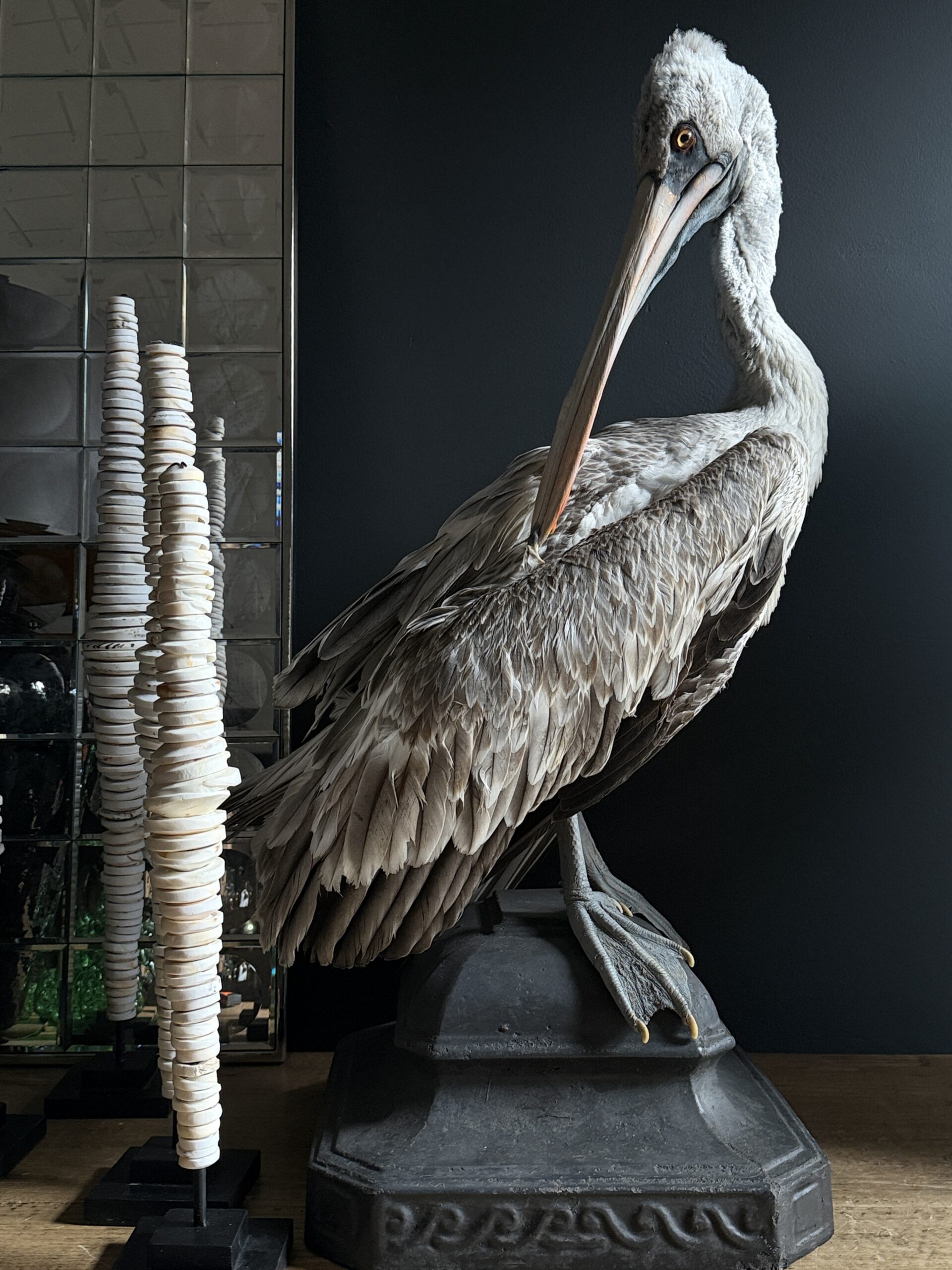 Dieser ausgestopfte Pelikan steht auf einem klassischen Sockel und präsentiert sich in einer natürlichen, ausgewogenen Pose. Das Gefieder, der Schnabel und die subtilen anatomischen Details wurden mit großer Präzision gefertigt, wodurch ein besonders realistisches Erscheinungsbild entsteht. Die hochwertige Verarbeitung und die sorgfältige Präsentation machen dieses Stück zu einem Präparat in Museumsqualität mit zeitlosem Charakter.