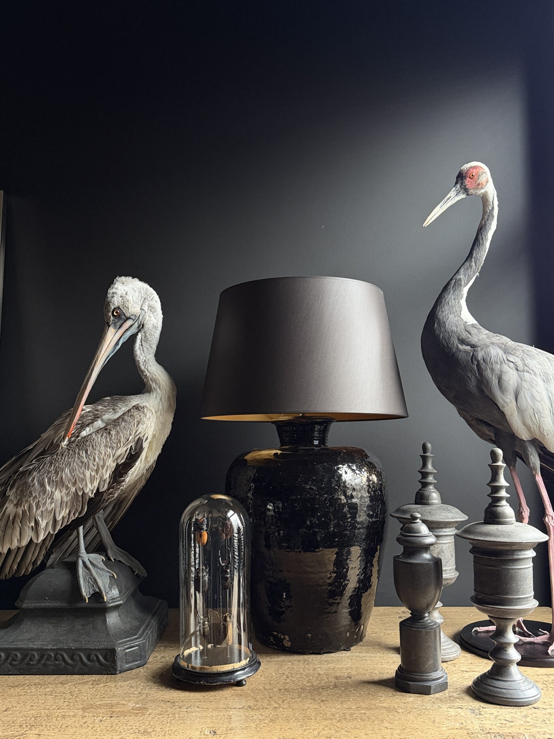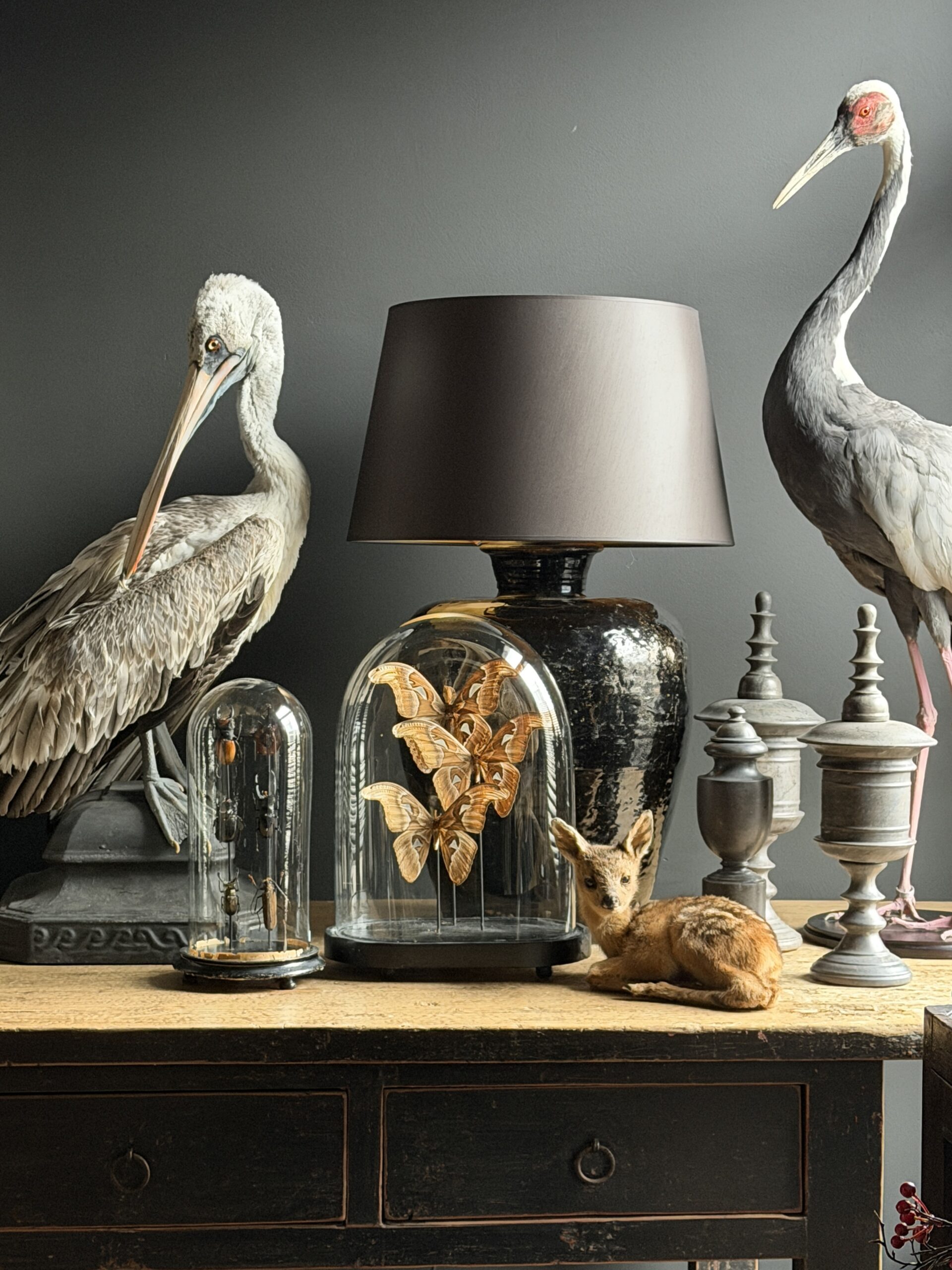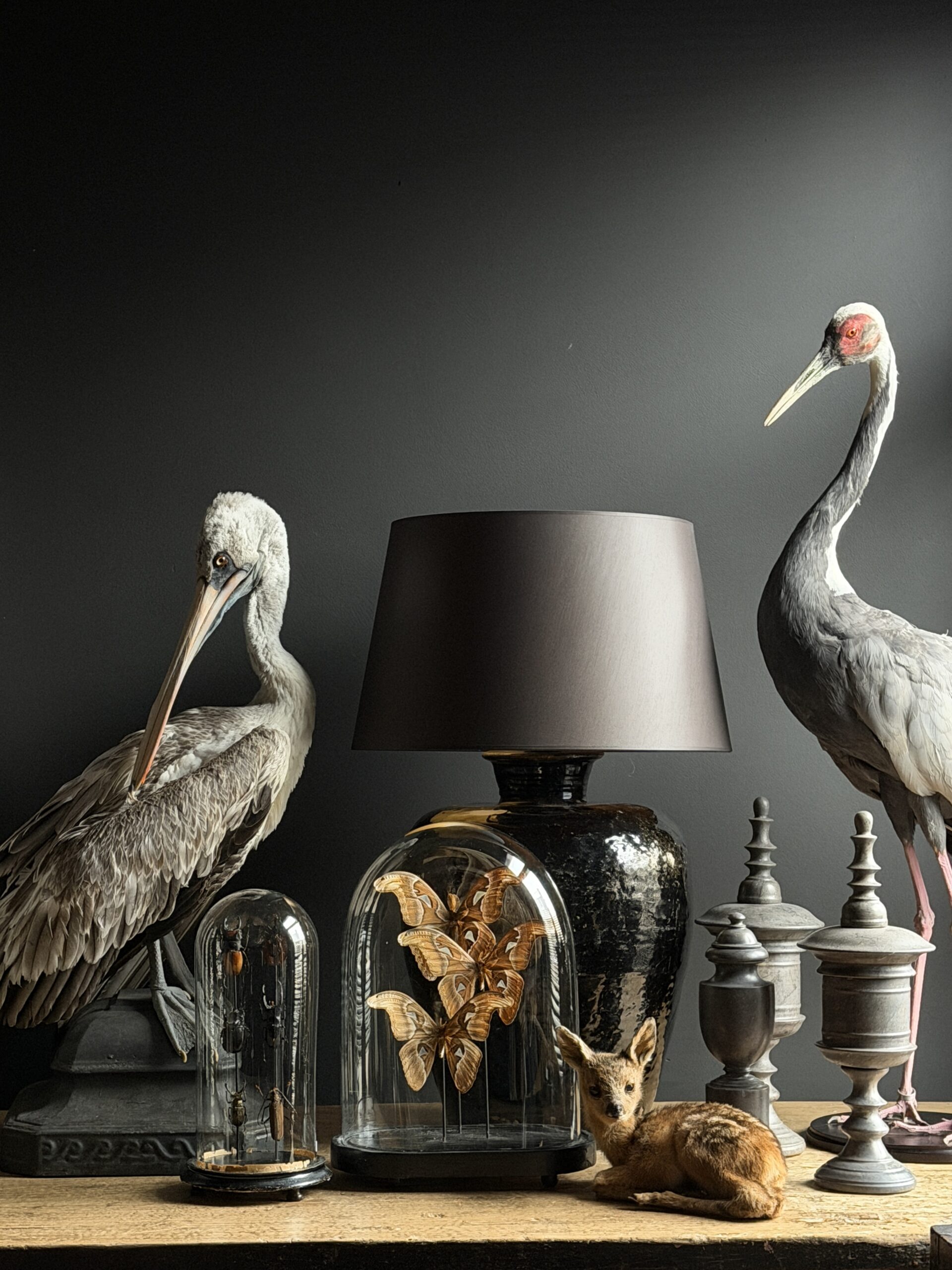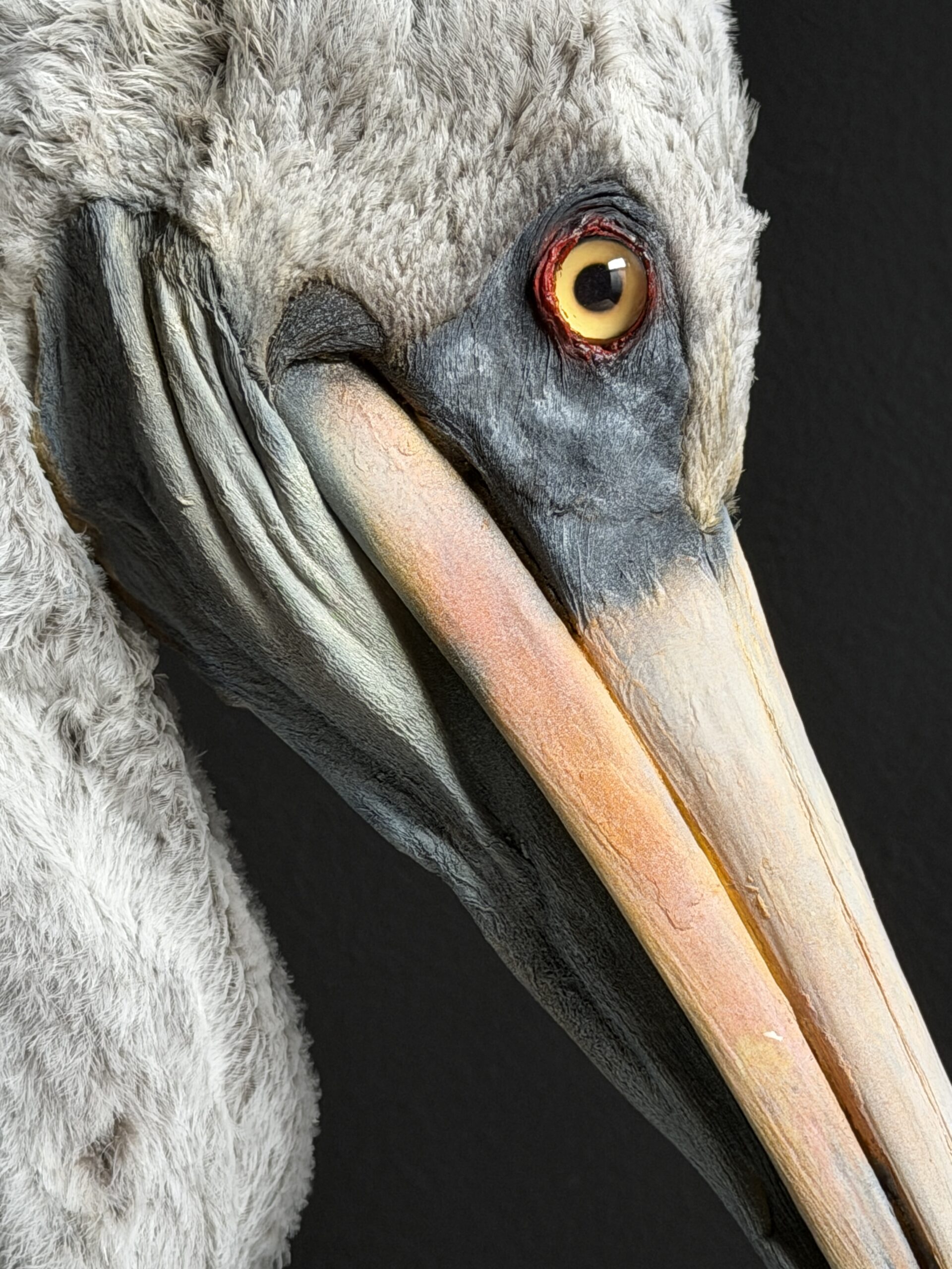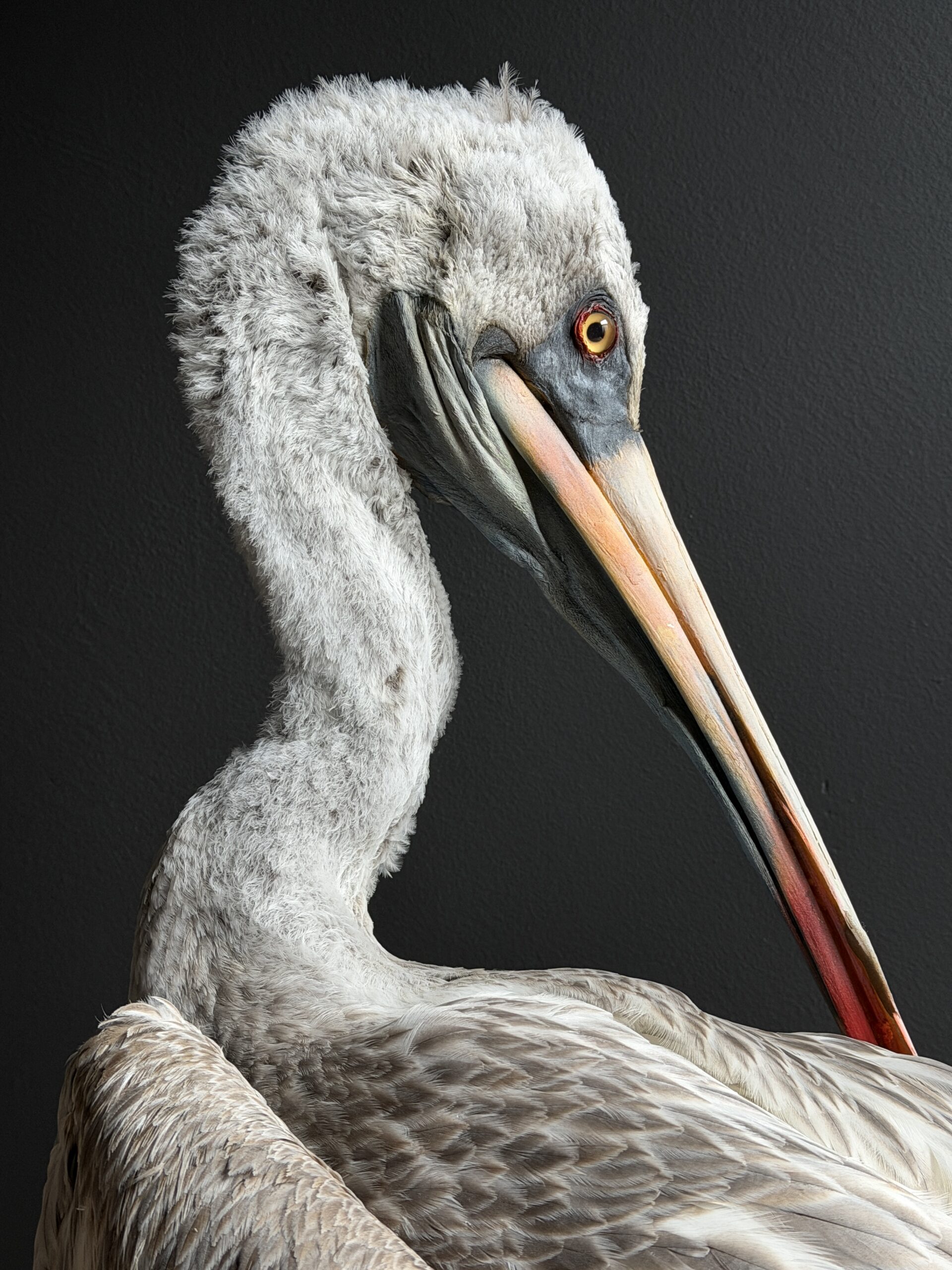 Dieser ausgestopfte Pelikan steht auf einem klassischen Sockel und präsentiert sich in einer natürlichen, ausgewogenen Pose. Das Gefieder, der Schnabel und die subtilen anatomischen Details wurden mit großer Präzision gefertigt, wodurch ein besonders realistisches Erscheinungsbild entsteht. Die hochwertige Verarbeitung und die sorgfältige Präsentation machen dieses Stück zu einem Präparat in Museumsqualität mit zeitlosem Charakter.