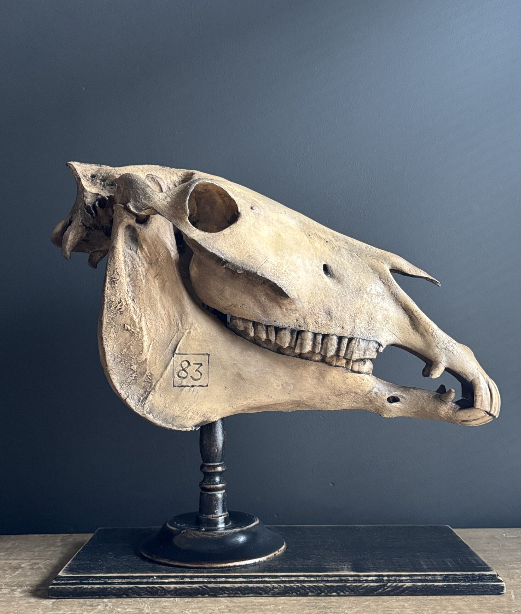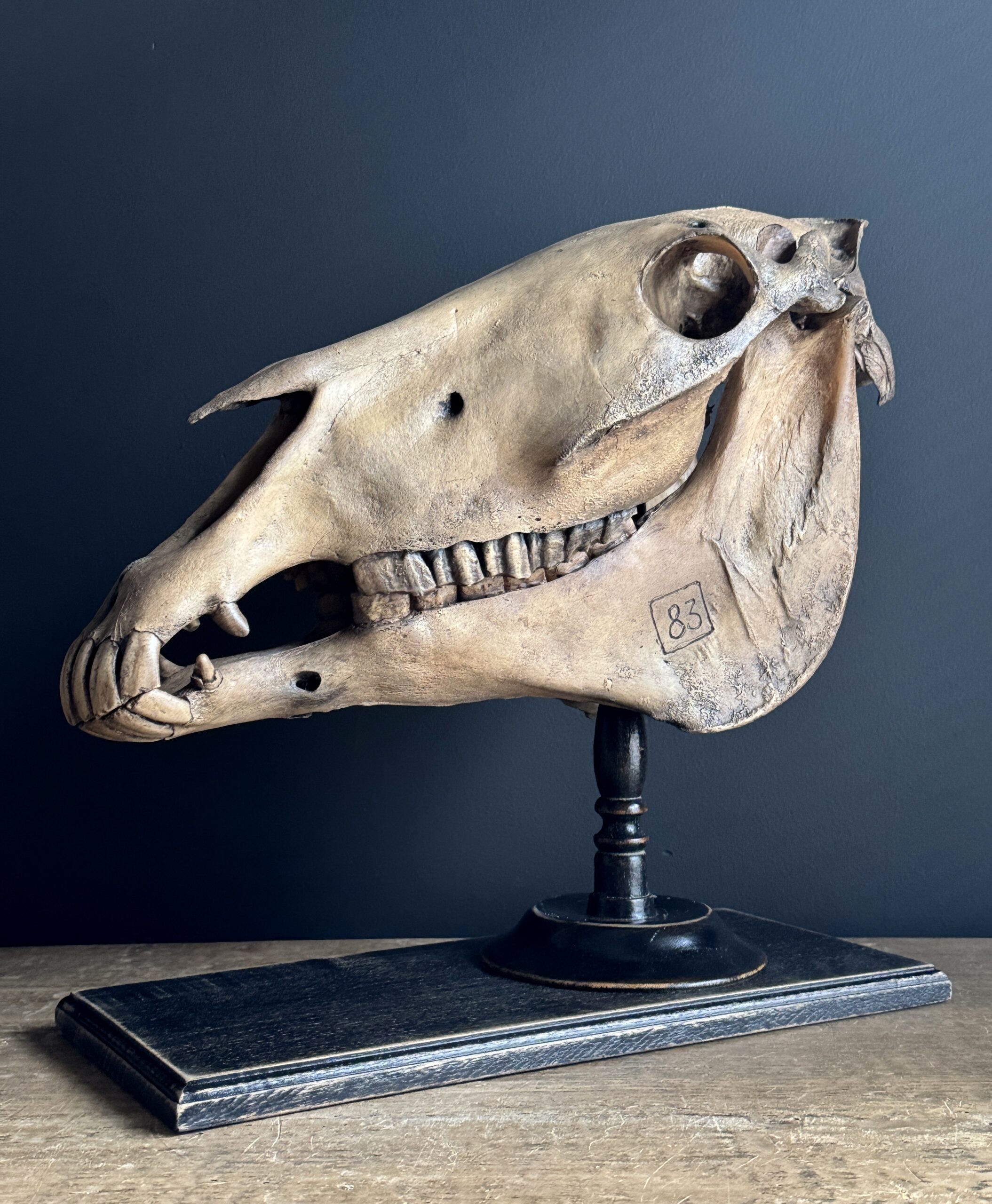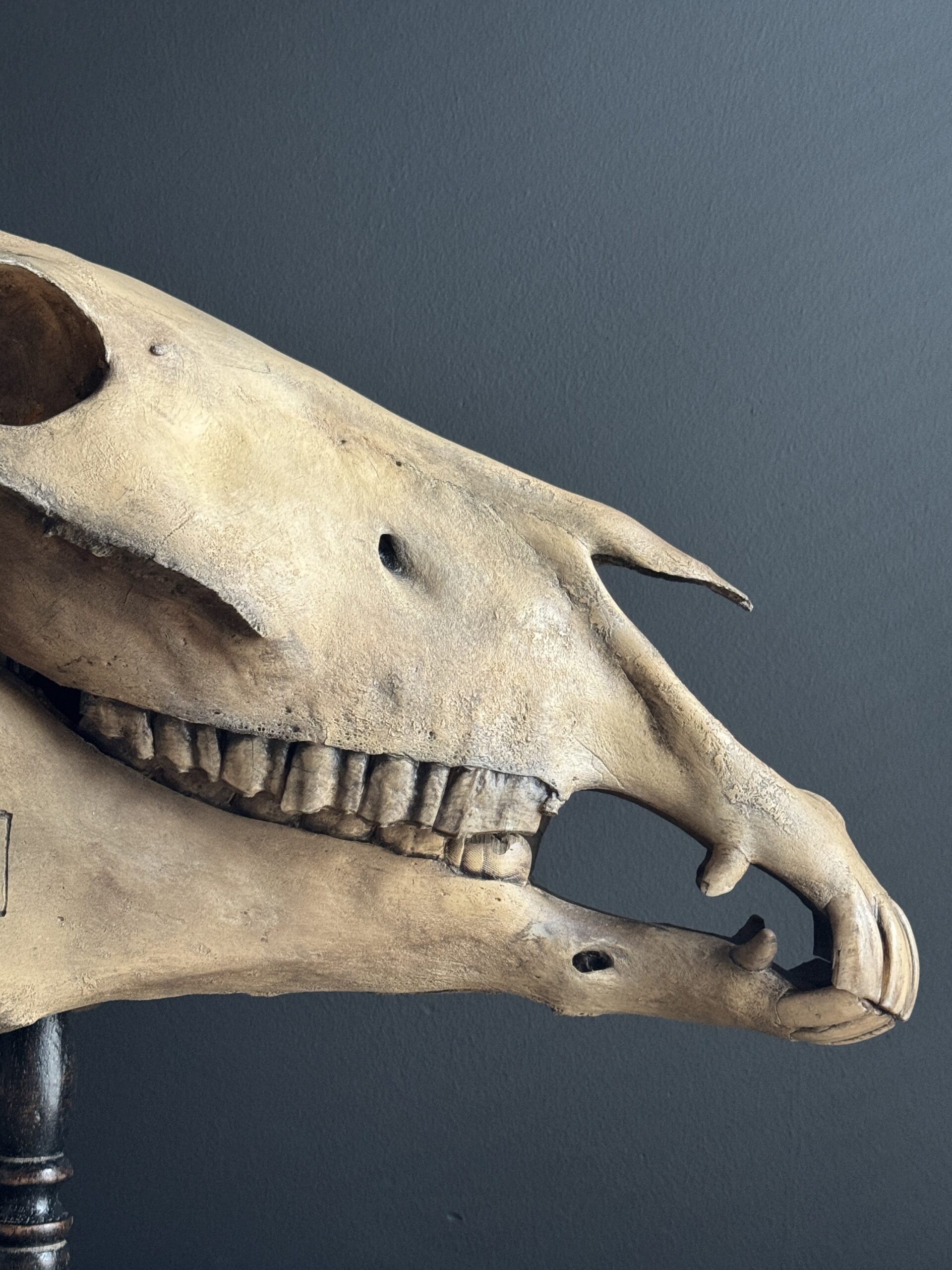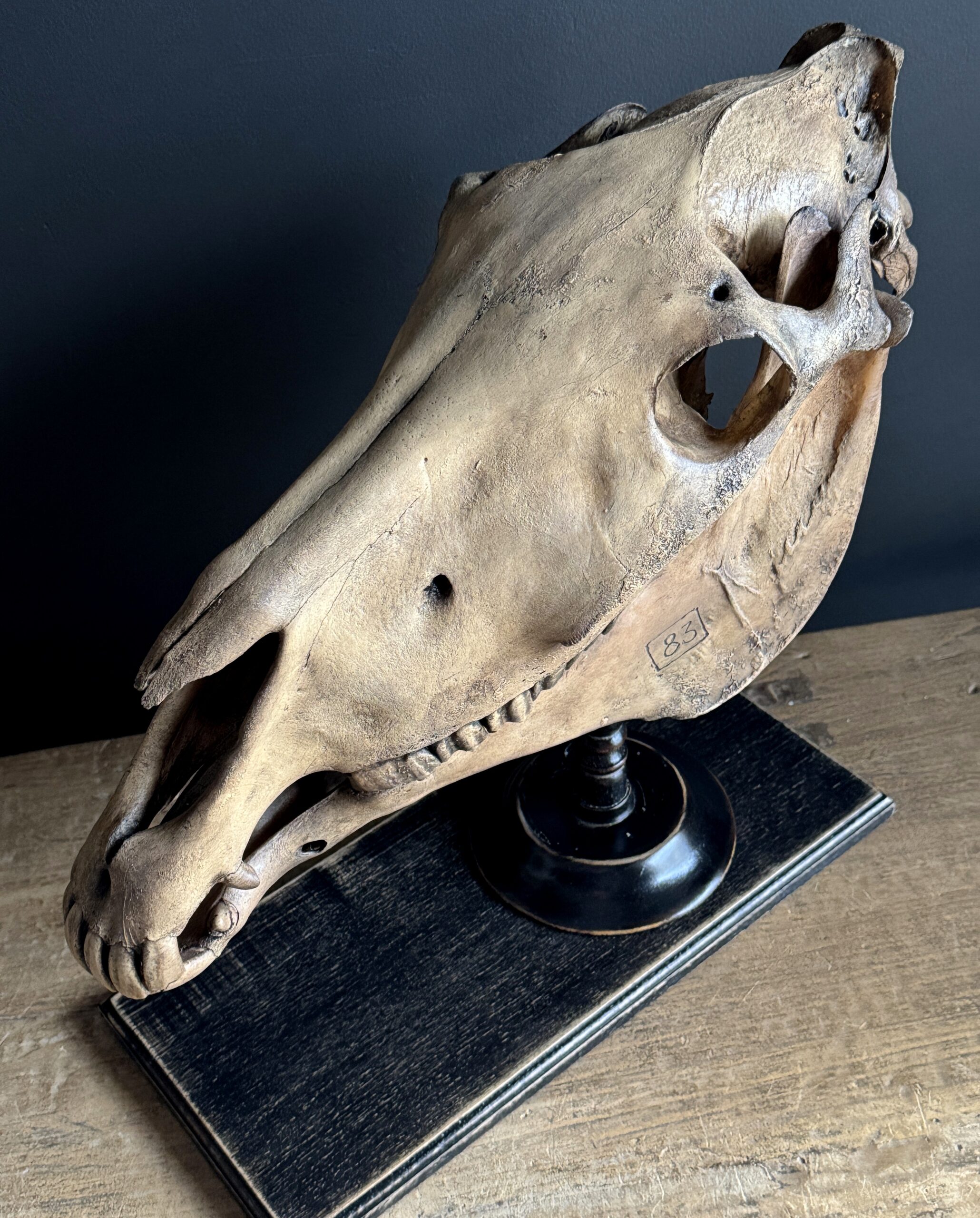 Dieser antike Pferdeschädel wird als faszinierendes antikes medizinisches Objekt präsentiert. Der natürliche Charakter des Knochens und die Spuren der Zeit verleihen dem Stück eine authentische Ausstrahlung. Der verwitterte Sockel, auf dem der Schädel ruht, verstärkt diesen historischen Eindruck und macht ihn zu einem außergewöhnlichen Dekorationsobjekt, einem greifbaren Fragment der Vergangenheit, das Neugier und Bewunderung hervorruft.