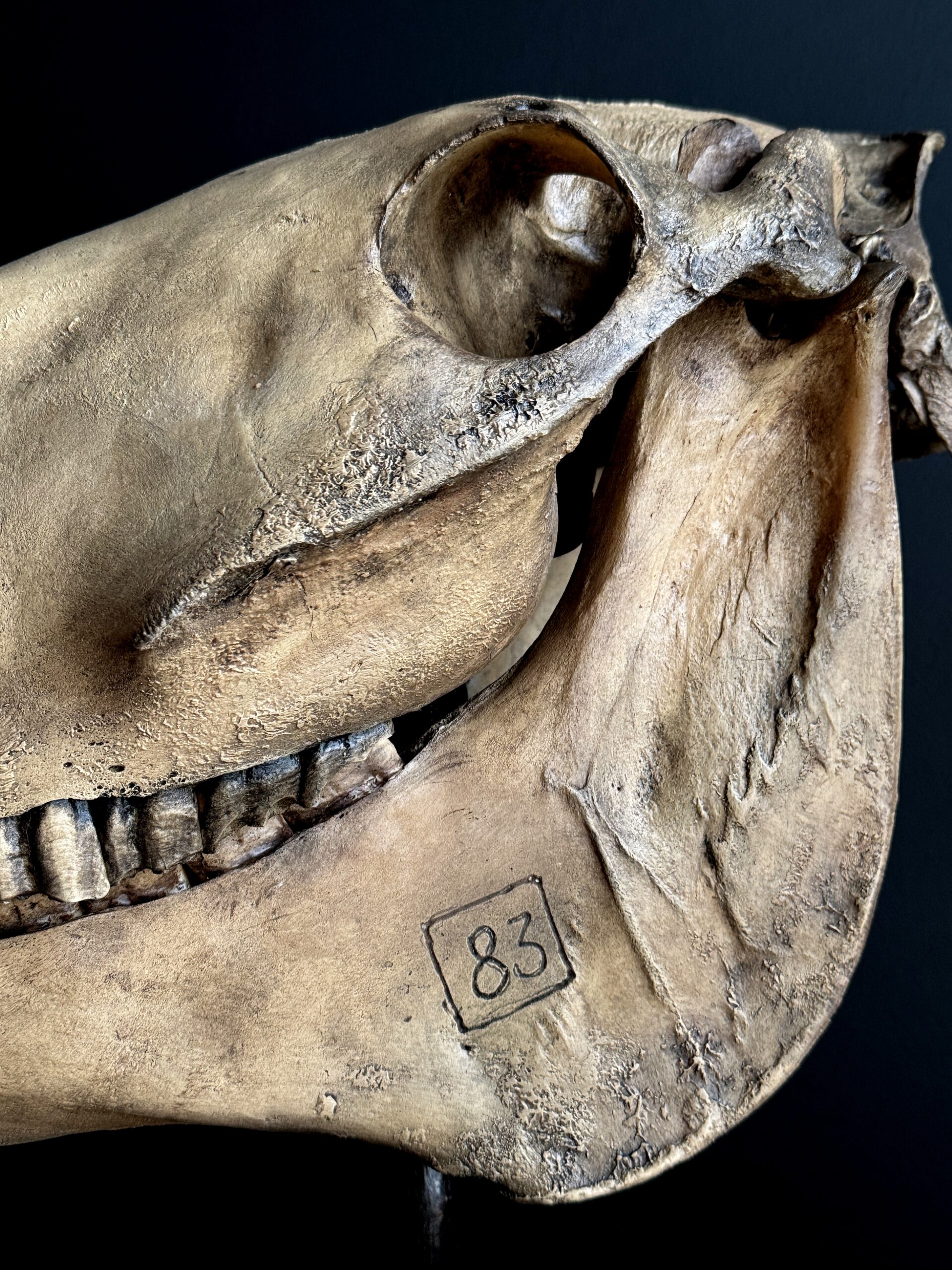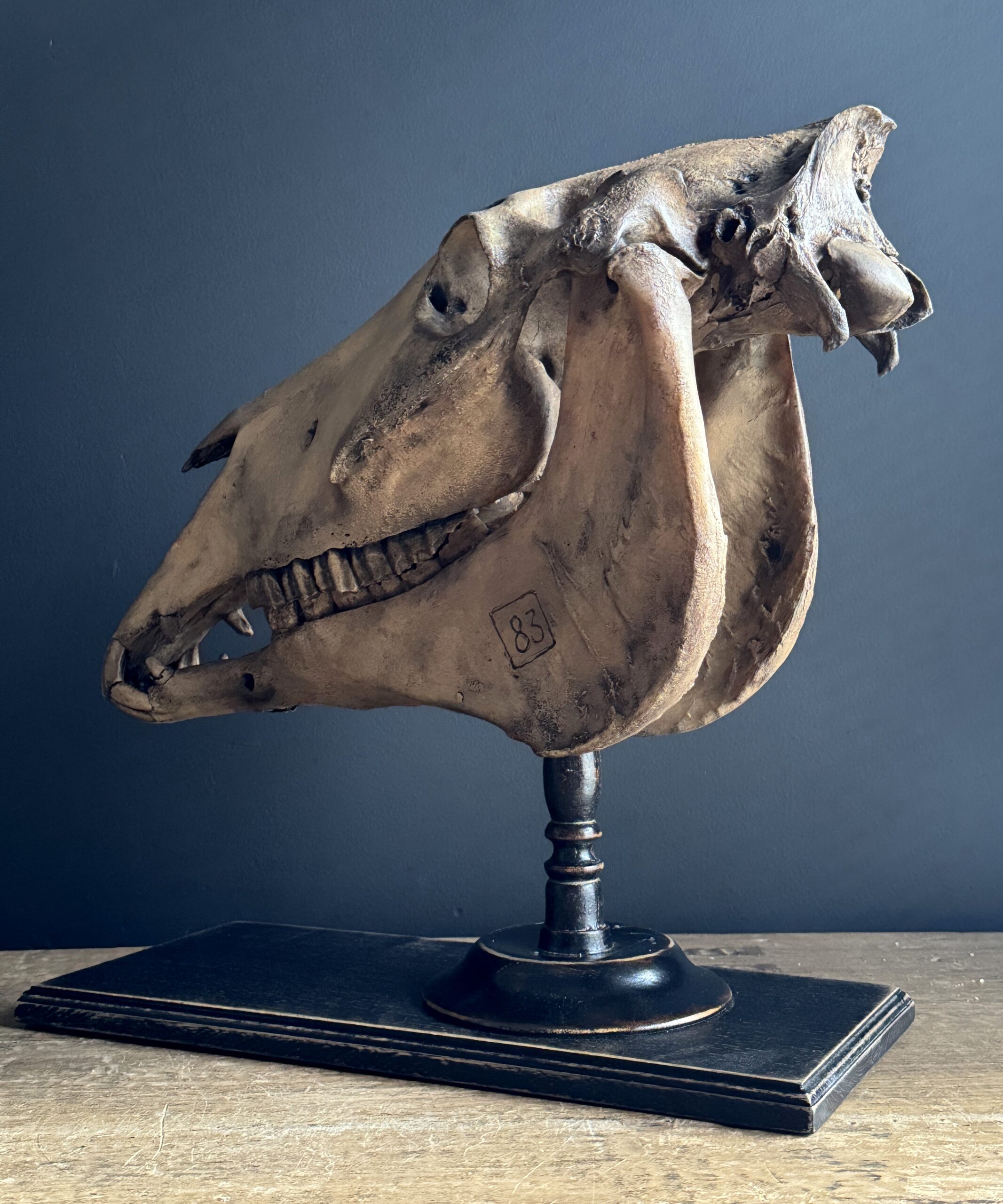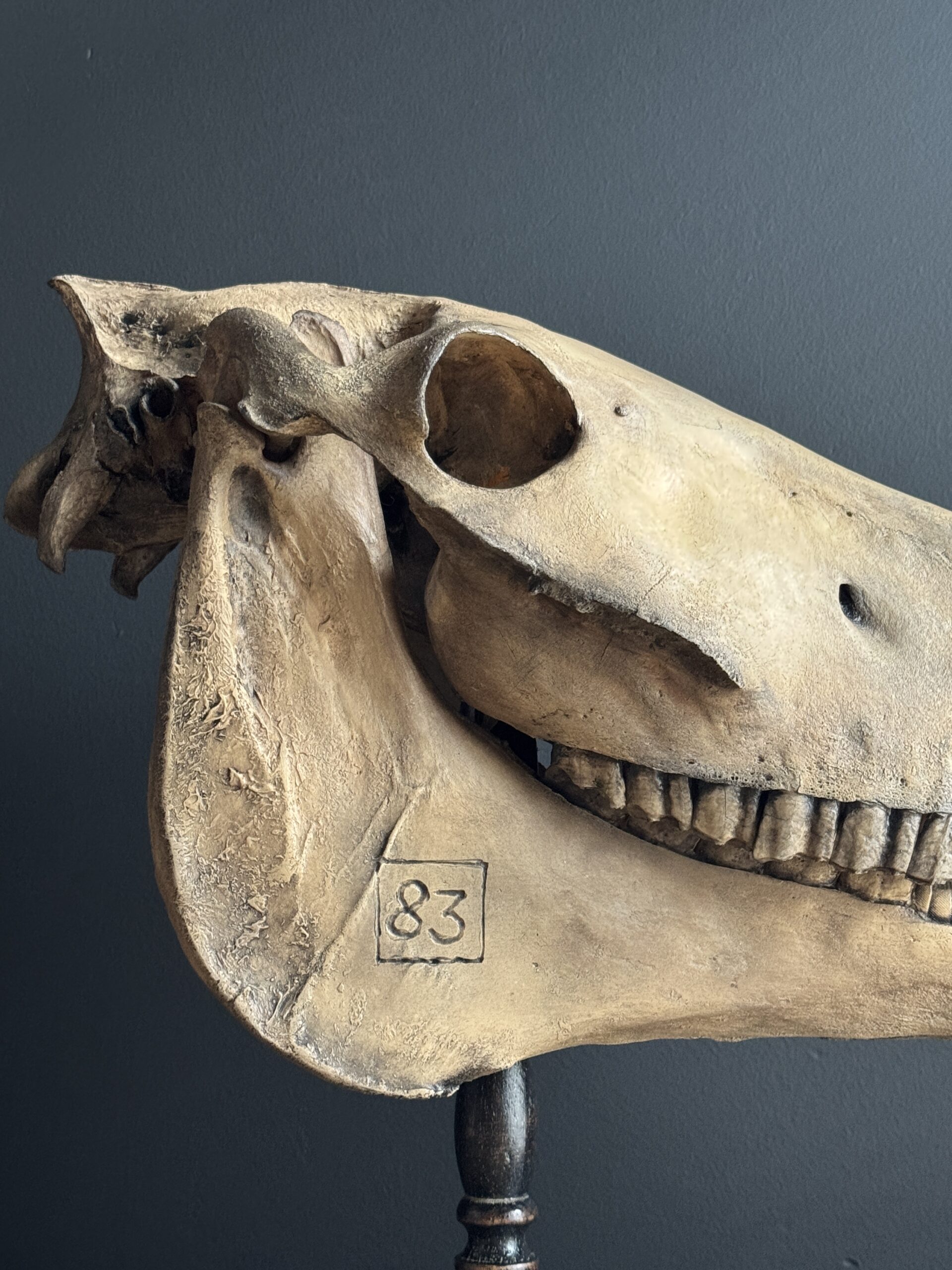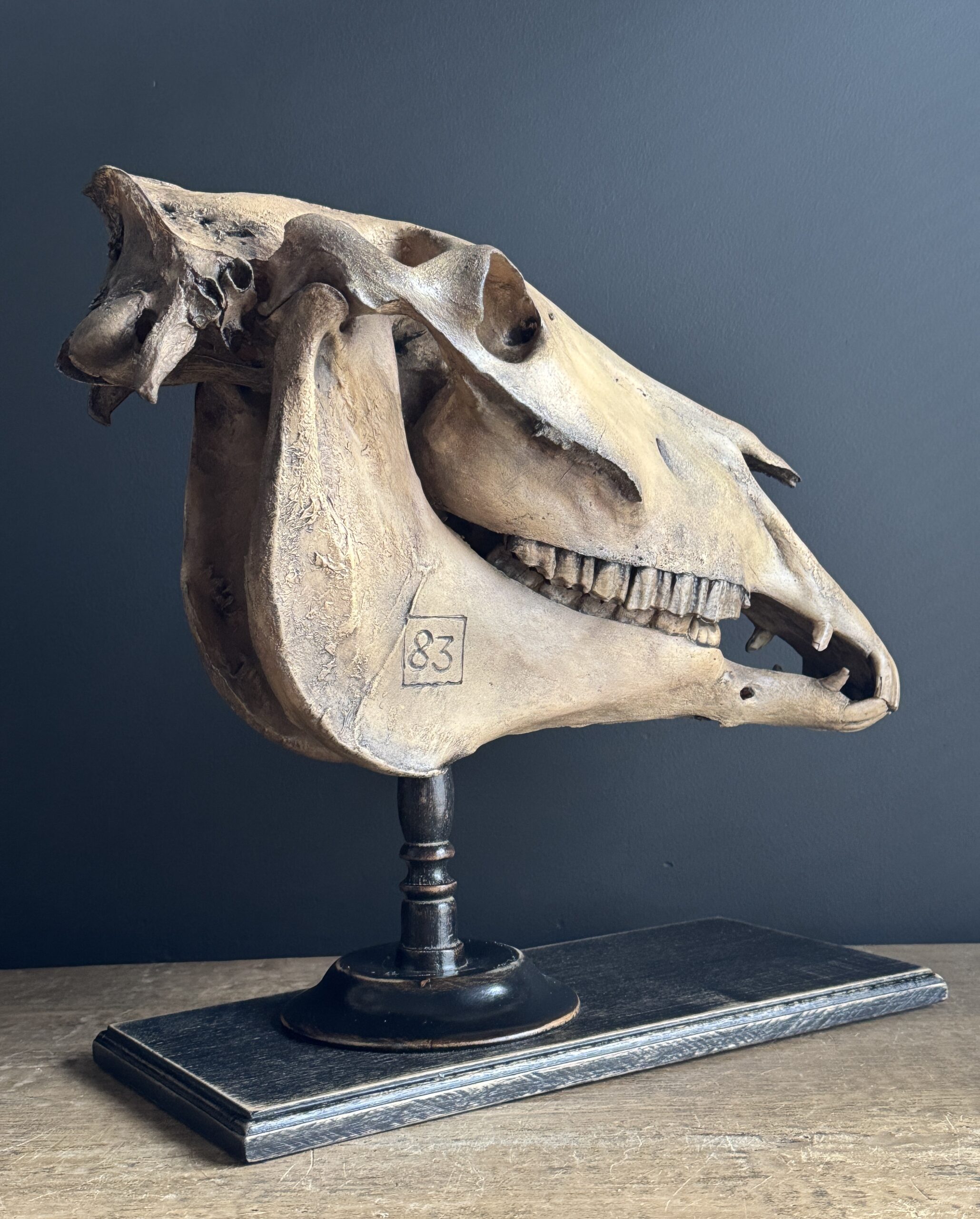 Dieser antike Pferdeschädel wird als faszinierendes antikes medizinisches Objekt präsentiert. Der natürliche Charakter des Knochens und die Spuren der Zeit verleihen dem Stück eine authentische Ausstrahlung. Der verwitterte Sockel, auf dem der Schädel ruht, verstärkt diesen historischen Eindruck und macht ihn zu einem außergewöhnlichen Dekorationsobjekt, einem greifbaren Fragment der Vergangenheit, das Neugier und Bewunderung hervorruft.