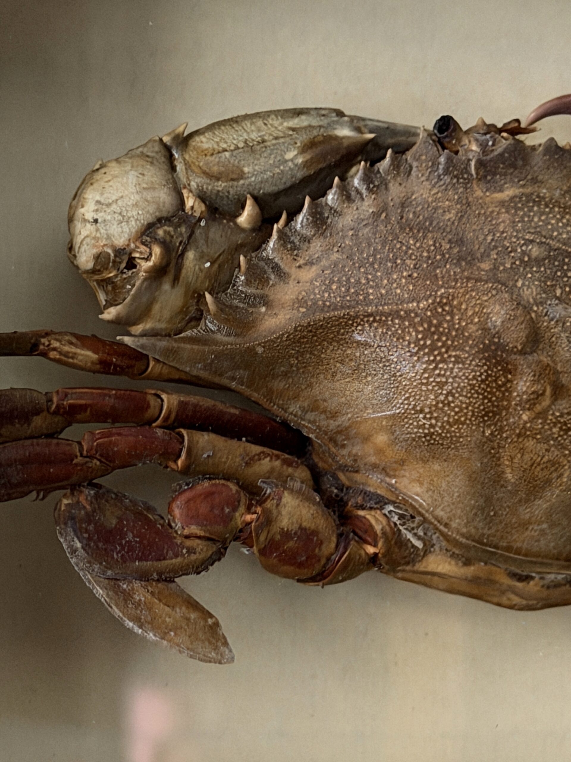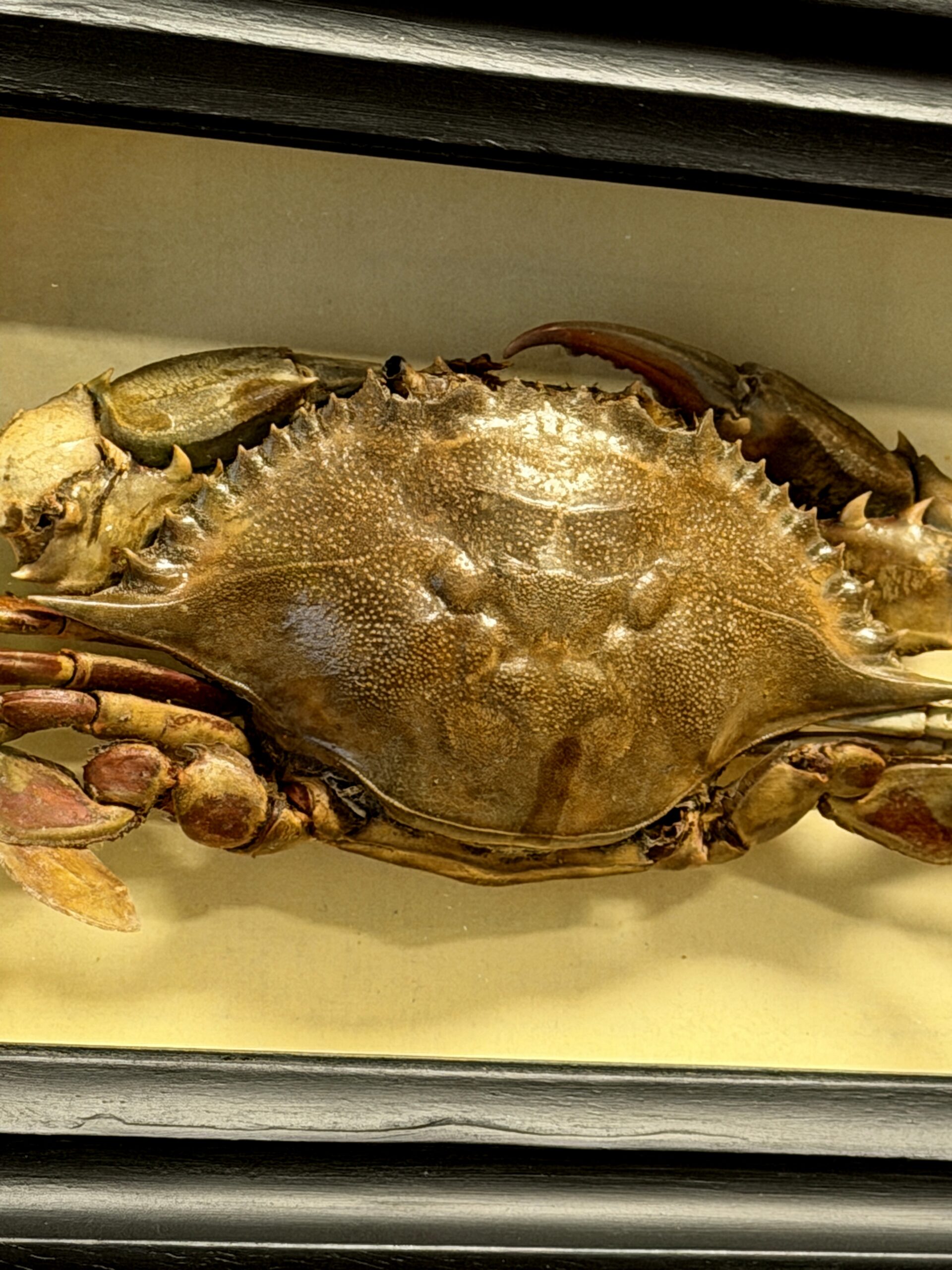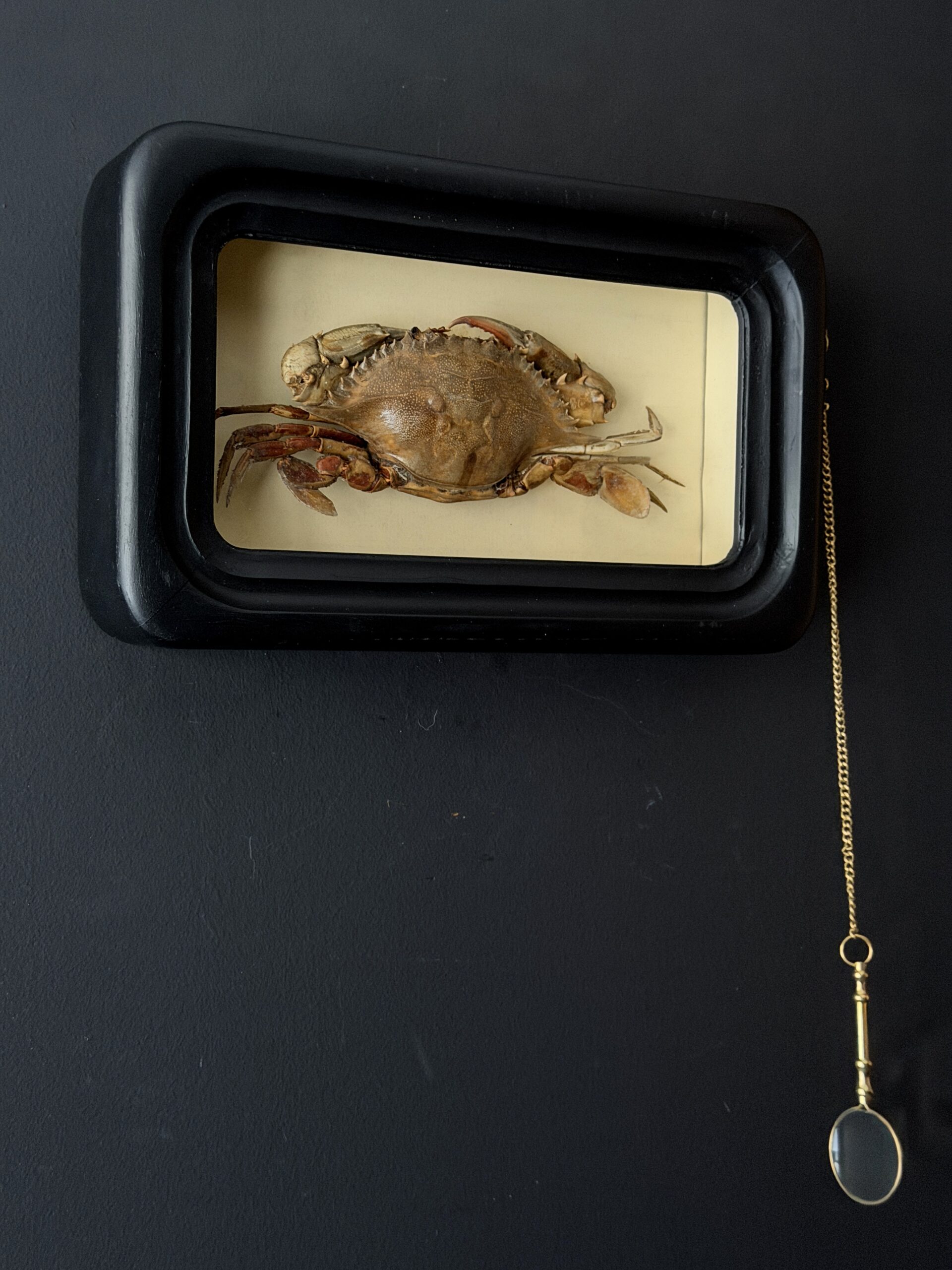 Es wird in einem Beobachtungsrahmen mit integrierter Lupe präsentiert, wodurch die fein detaillierte Schale, die Struktur der Beine und die komplizierten Muster des Panzers aus nächster Nähe betrachtet werden können. Eine einzigartige Möglichkeit, die Anatomie eines Krustentiers zu erkunden, das auf Geschwindigkeit und Präzision ausgelegt ist.