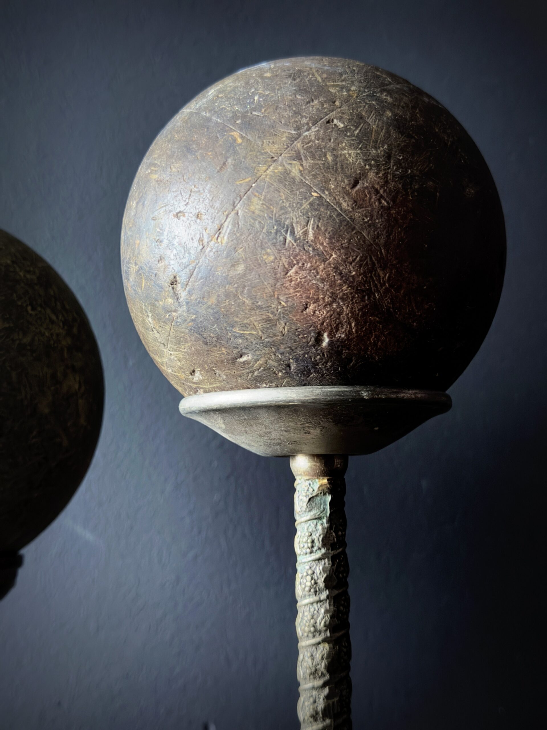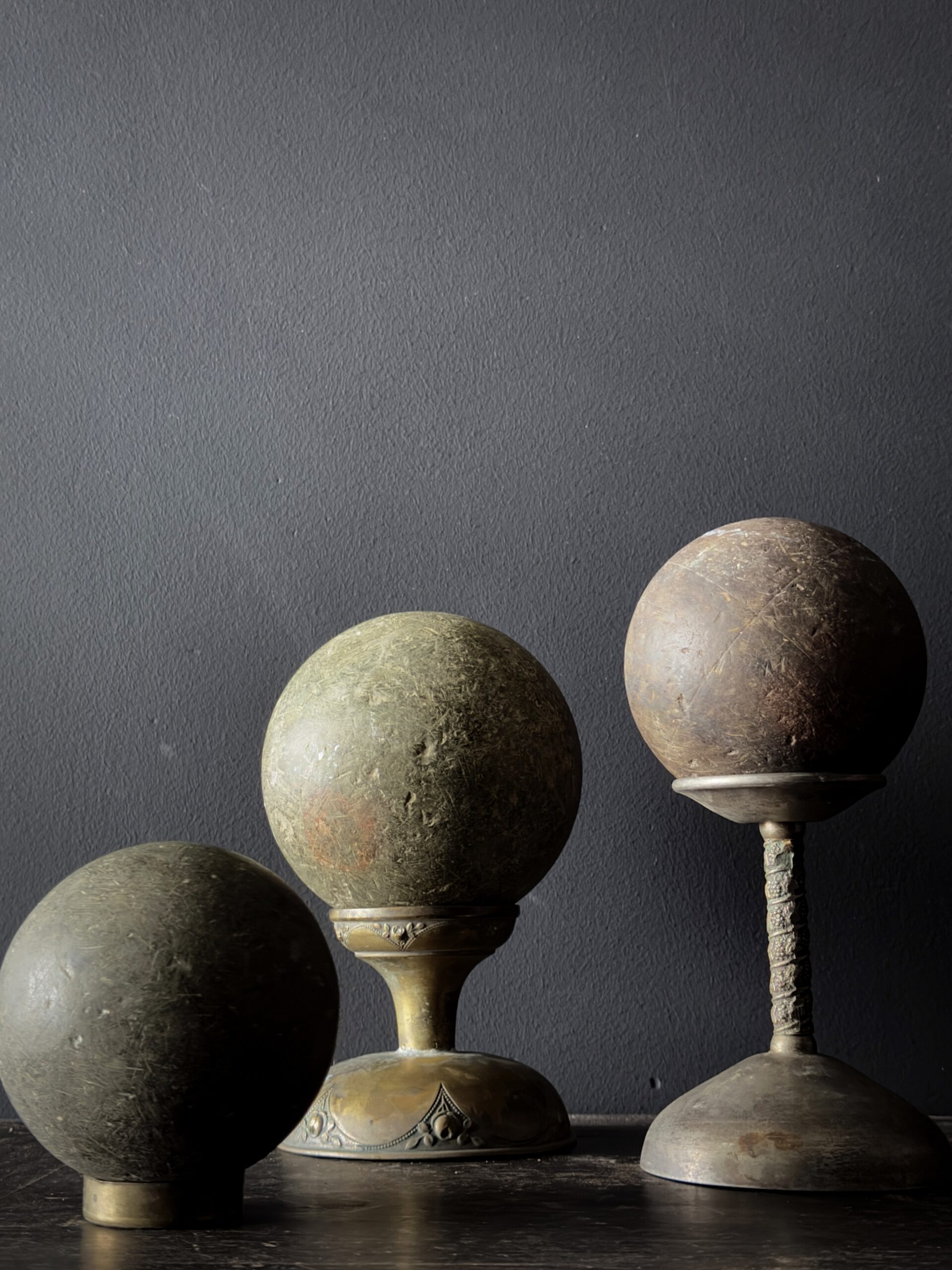 Antike und alte Spielbälle, auf ungewöhnlichen Sockeln platziert, bilden ein einzigartiges und künstlerisches Arrangement, das den zeitlosen Charme der Vergangenheit einfängt. Die gealterten Bälle mit ihren verwitterten Oberflächen und ihrer unbestreitbaren Geschichte erwachen zu neuem Leben, wenn sie als Kunstobjekte präsentiert werden. Jede Kugel erzählt ihre eigene Geschichte und weckt Erinnerungen an vergangene Zeiten, während die Sockel, die oft handgefertigt und aus verschiedenen Materialien hergestellt sind, die Kugeln zu visuellen Blickpunkten machen. Diese Kombination schafft eine kraftvolle Ästhetik, die sowohl Nostalgie als auch moderne Kreativität ausstrahlt.