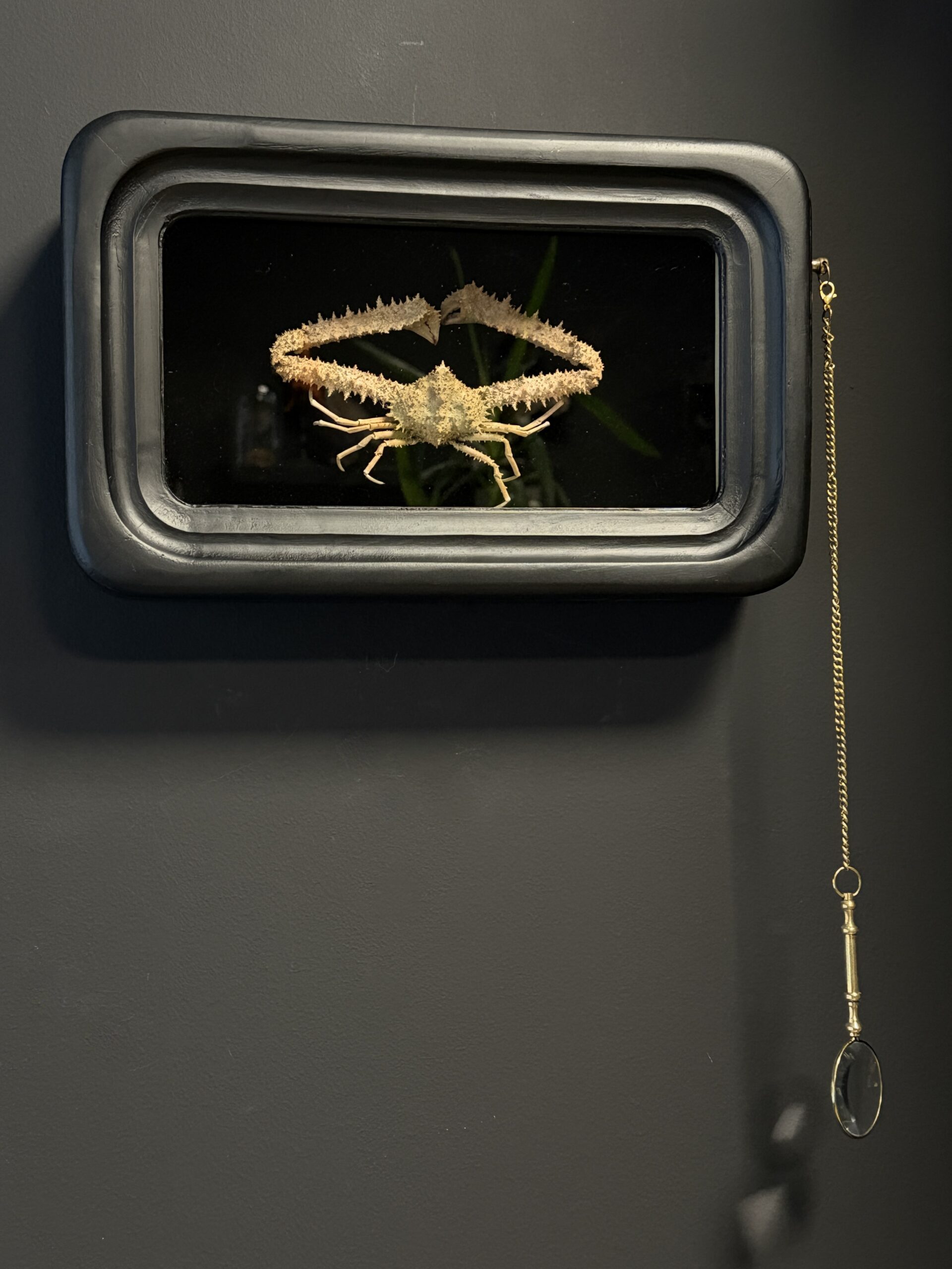 Dank des Beobachtungsrahmens und der integrierten Lupe können Sie die Details seines Exoskeletts, die Feinheit seiner Beine und die Anordnung seiner Schutzstacheln genau untersuchen – eine Einladung, die Genialität der Natur näher zu betrachten.