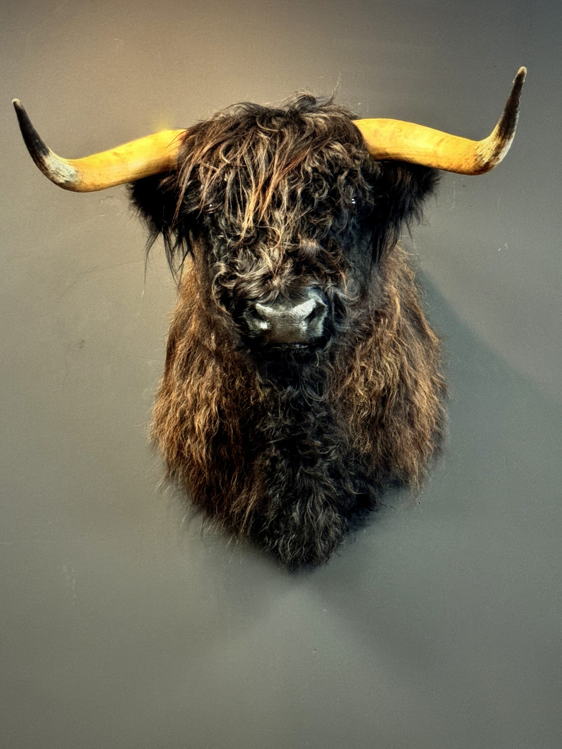 Der schottische Highlander wurde vor kurzem präpariert und hat schönes langes schwarzes Winterhaar. Es wurde viel Zeit auf die Anatomie und die Ausarbeitung der kleinsten Details verwendet. Ein wunderbares Beispiel für hervorragende Taxidermie....