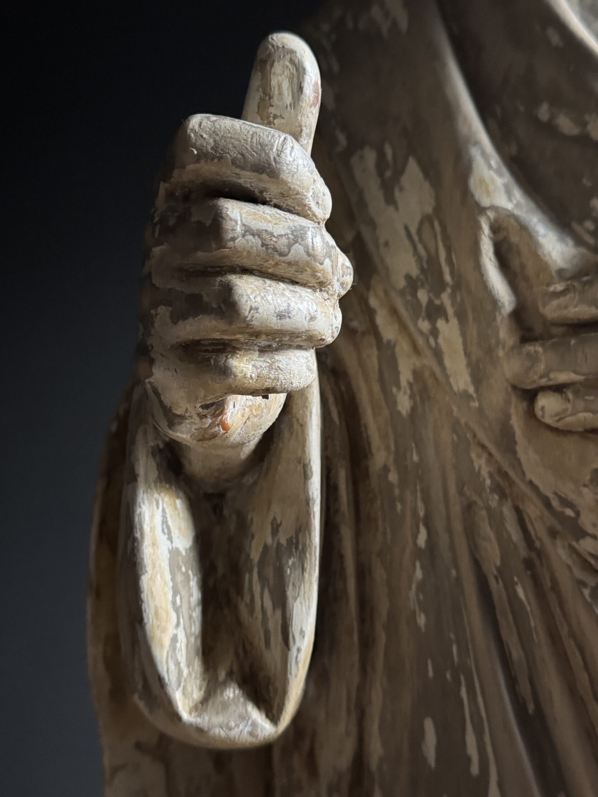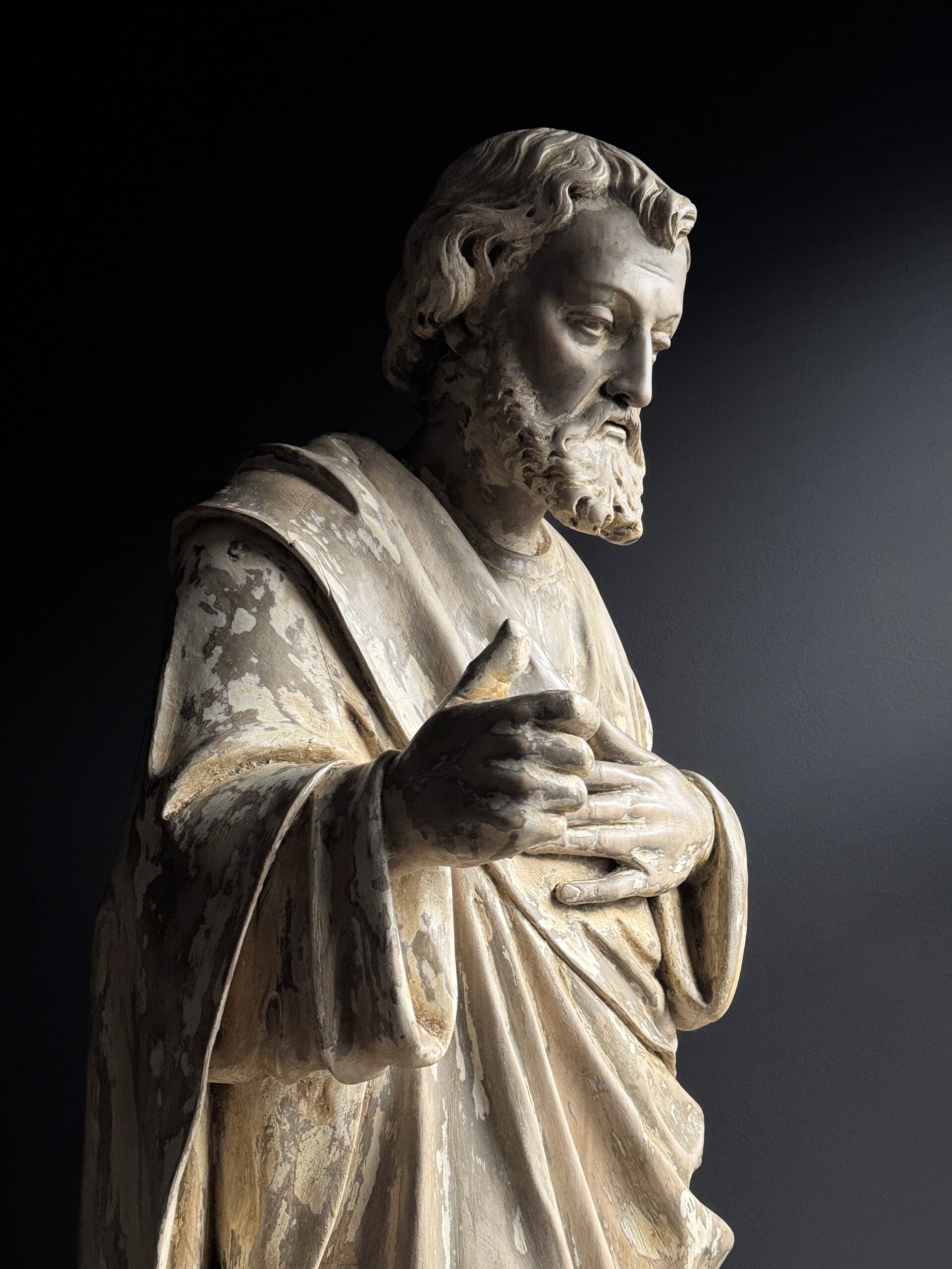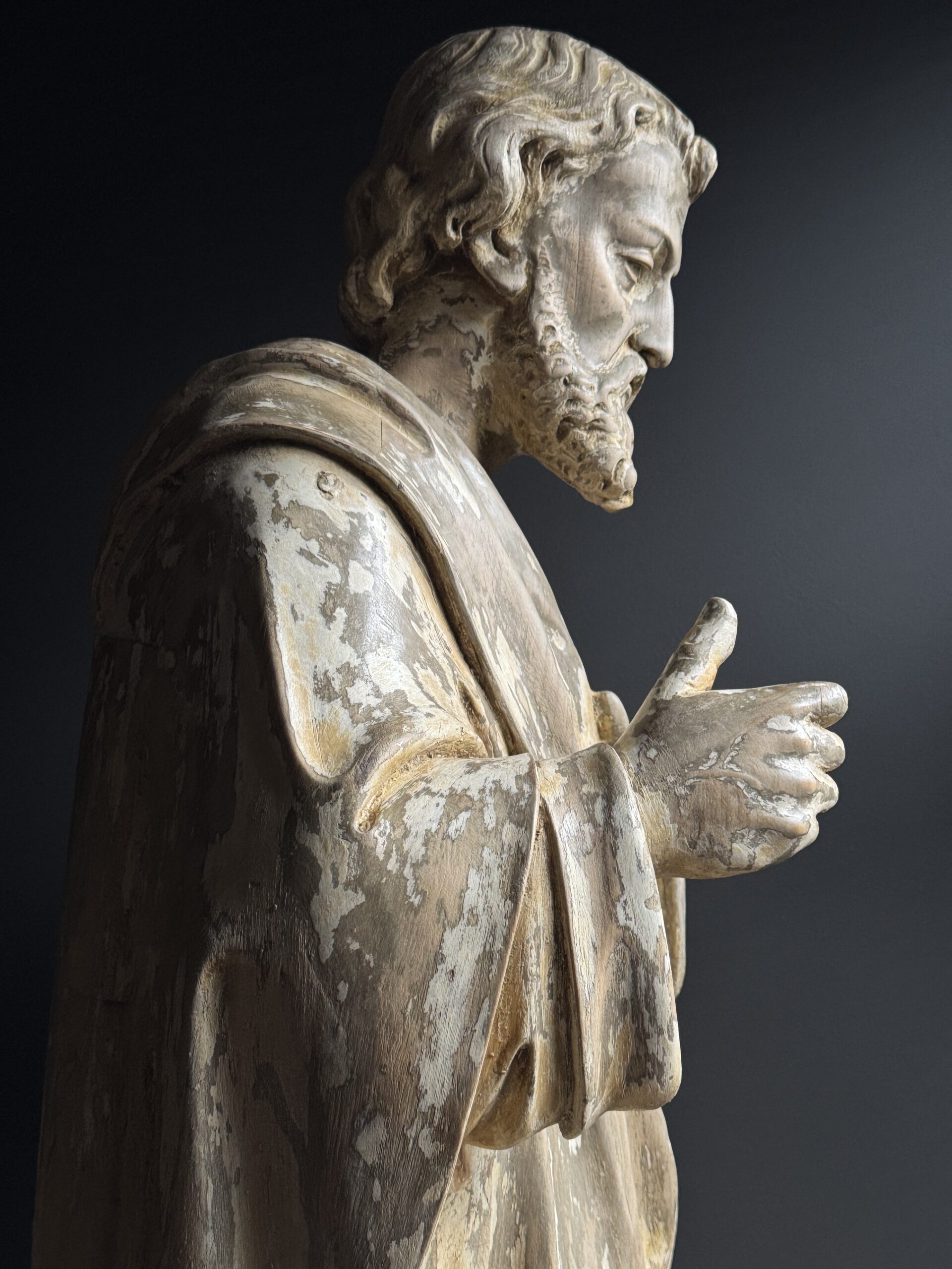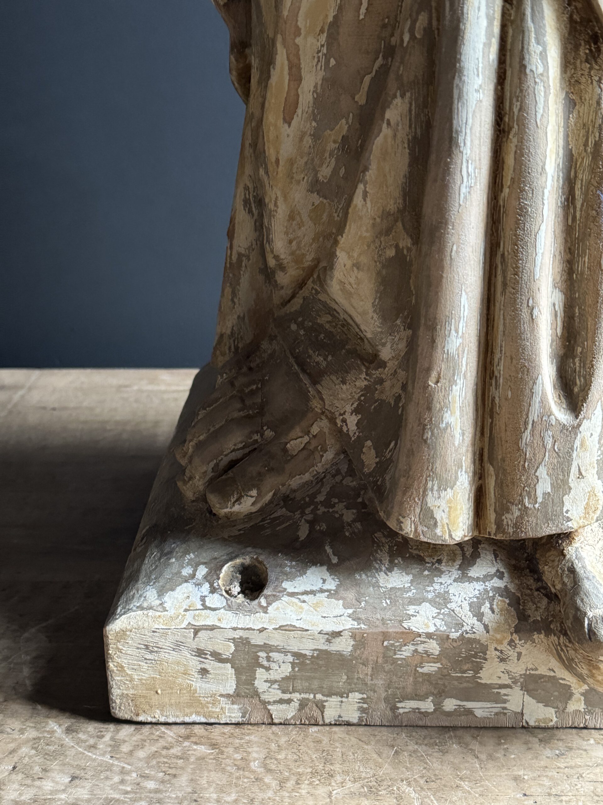 An impressive, hand-carved statue of a saint made from solid wood, rich in detail and character. The soft, natural lines reveal the sculptor's craftsmanship, while the beautiful patina, formed over time, gives the statue a warm and lived-in appearance. Its large size and refined decorative finish make this statue of a saint not only a religious symbol, but also a special work of art that enriches any space with its serene and historical charm.