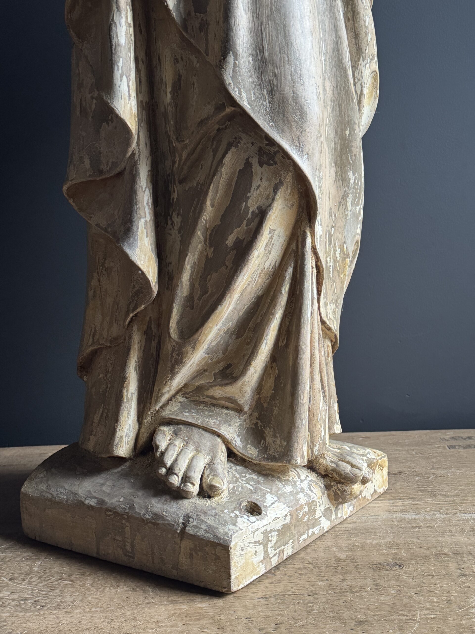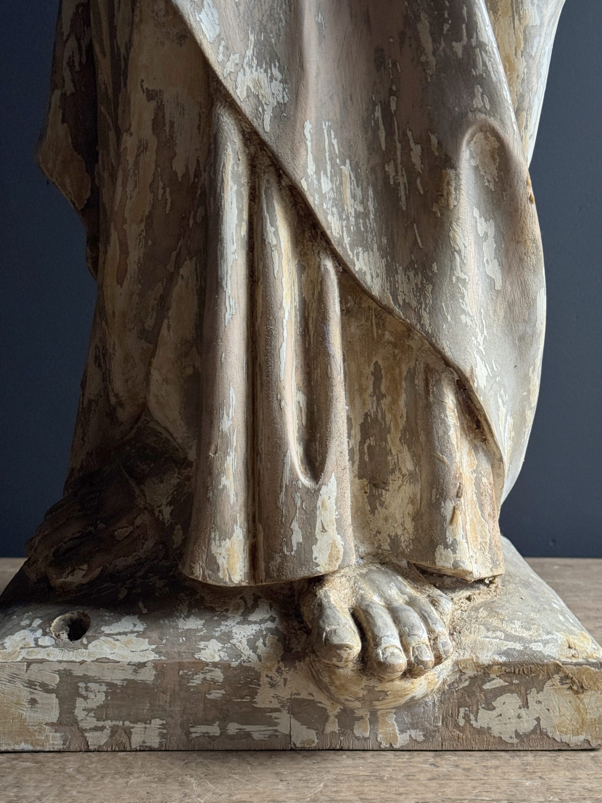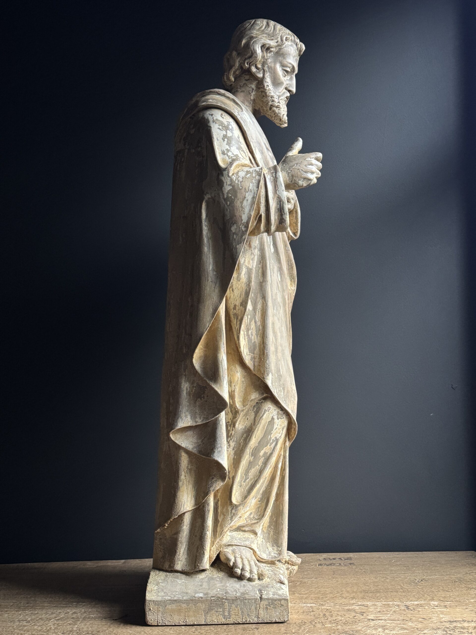 An impressive, hand-carved statue of a saint made from solid wood, rich in detail and character. The soft, natural lines reveal the sculptor's craftsmanship, while the beautiful patina, formed over time, gives the statue a warm and lived-in appearance. Its large size and refined decorative finish make this statue of a saint not only a religious symbol, but also a special work of art that enriches any space with its serene and historical charm.