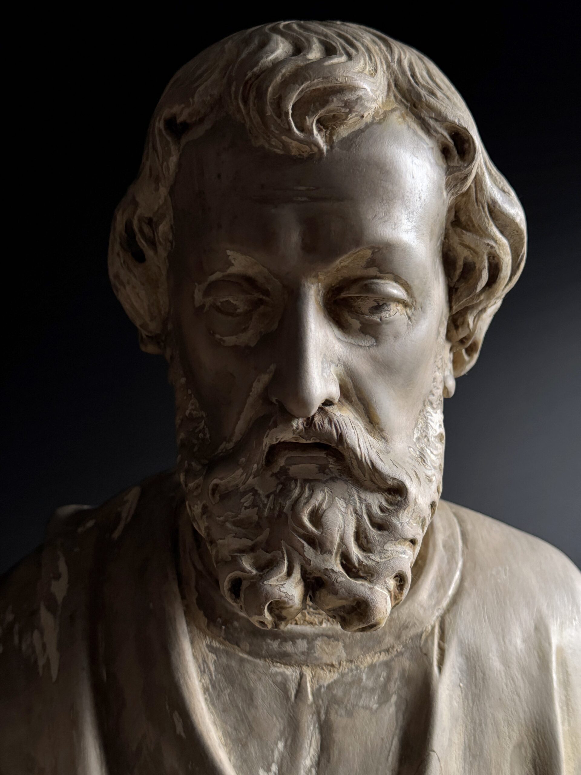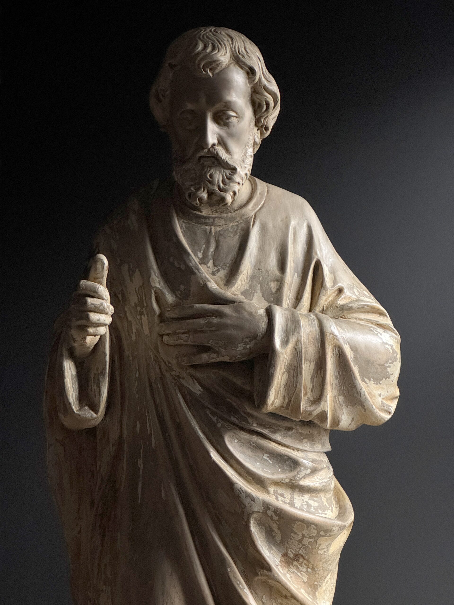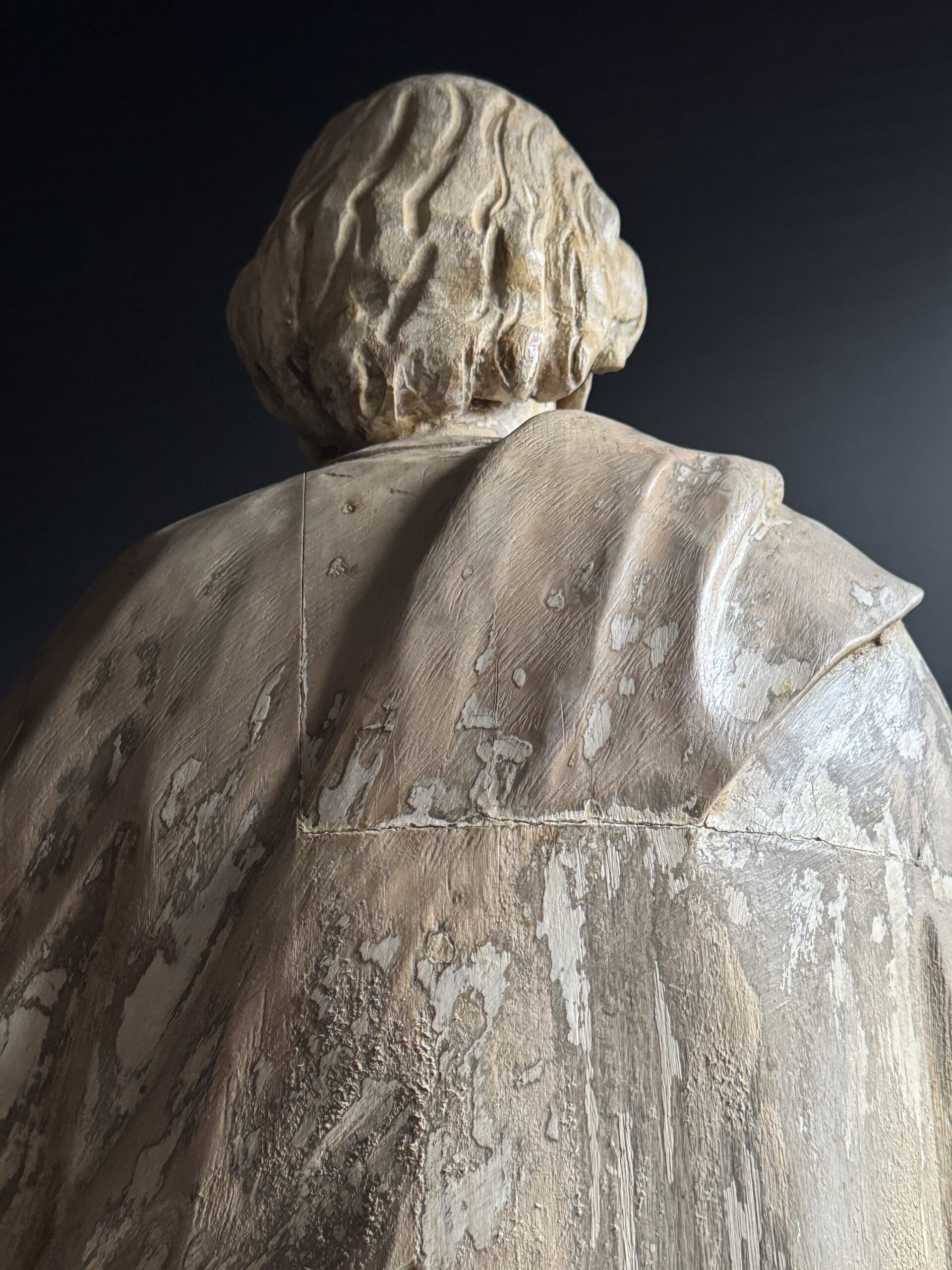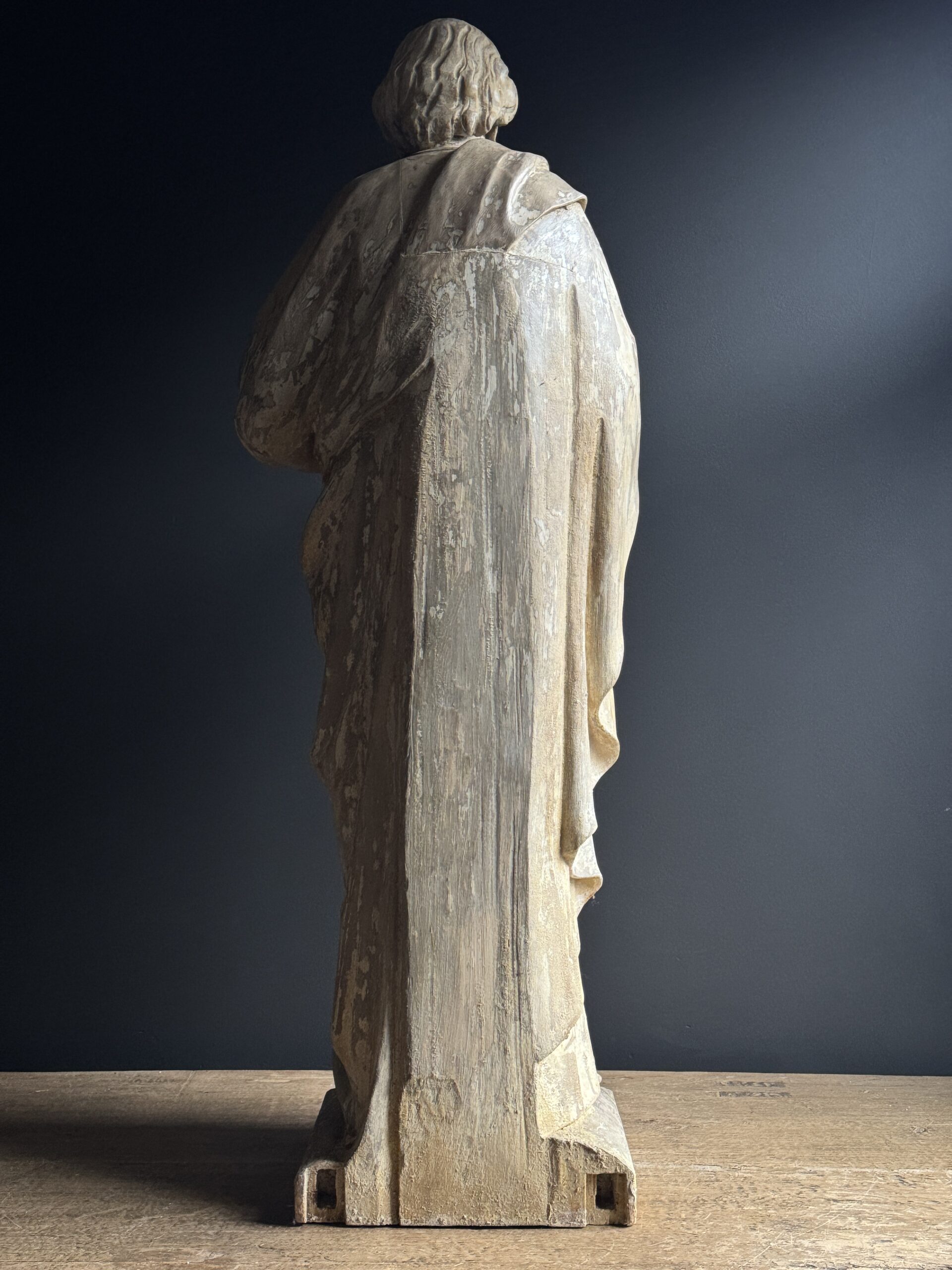 An impressive, hand-carved statue of a saint made from solid wood, rich in detail and character. The soft, natural lines reveal the sculptor's craftsmanship, while the beautiful patina, formed over time, gives the statue a warm and lived-in appearance. Its large size and refined decorative finish make this statue of a saint not only a religious symbol, but also a special work of art that enriches any space with its serene and historical charm.
