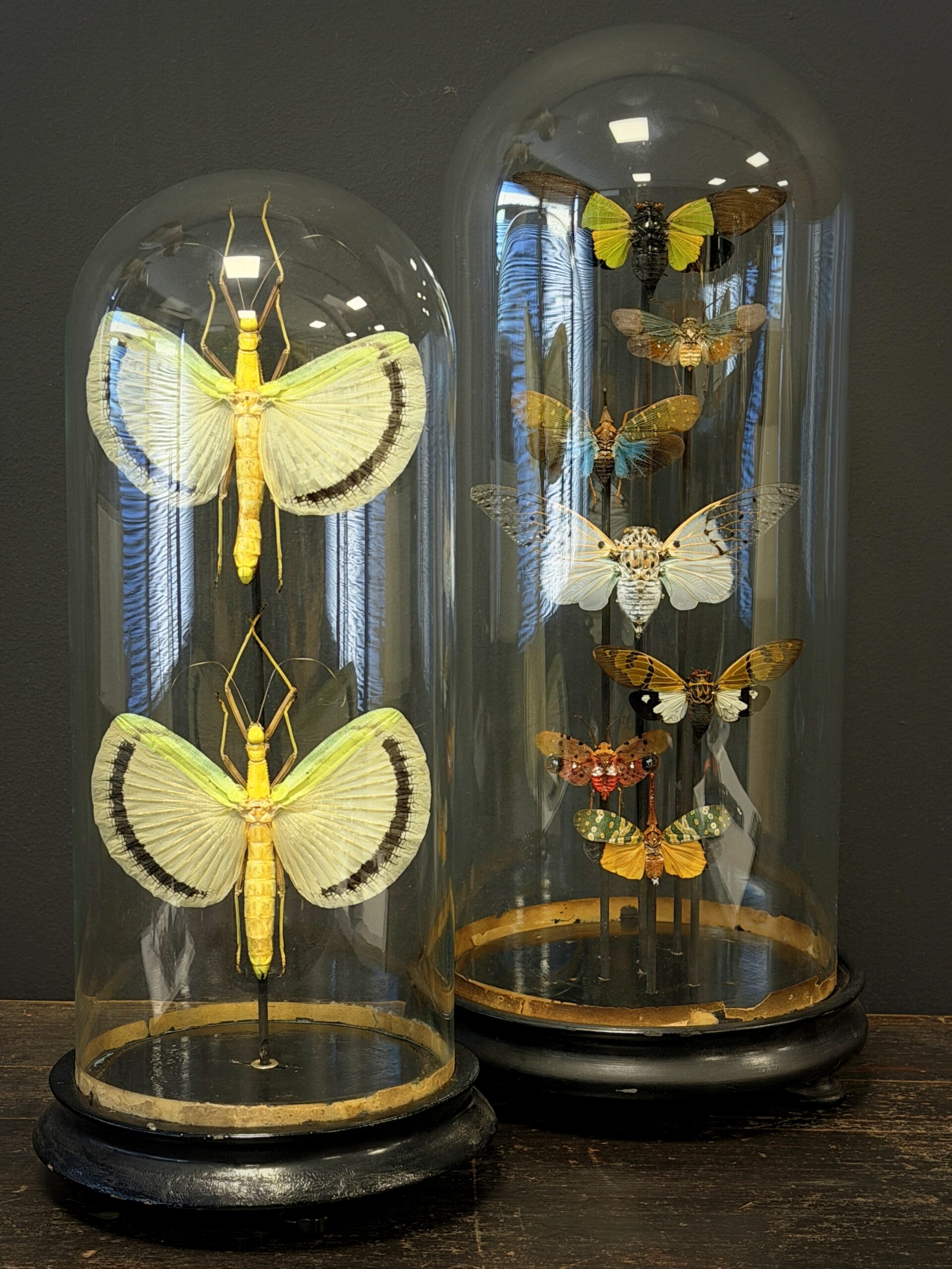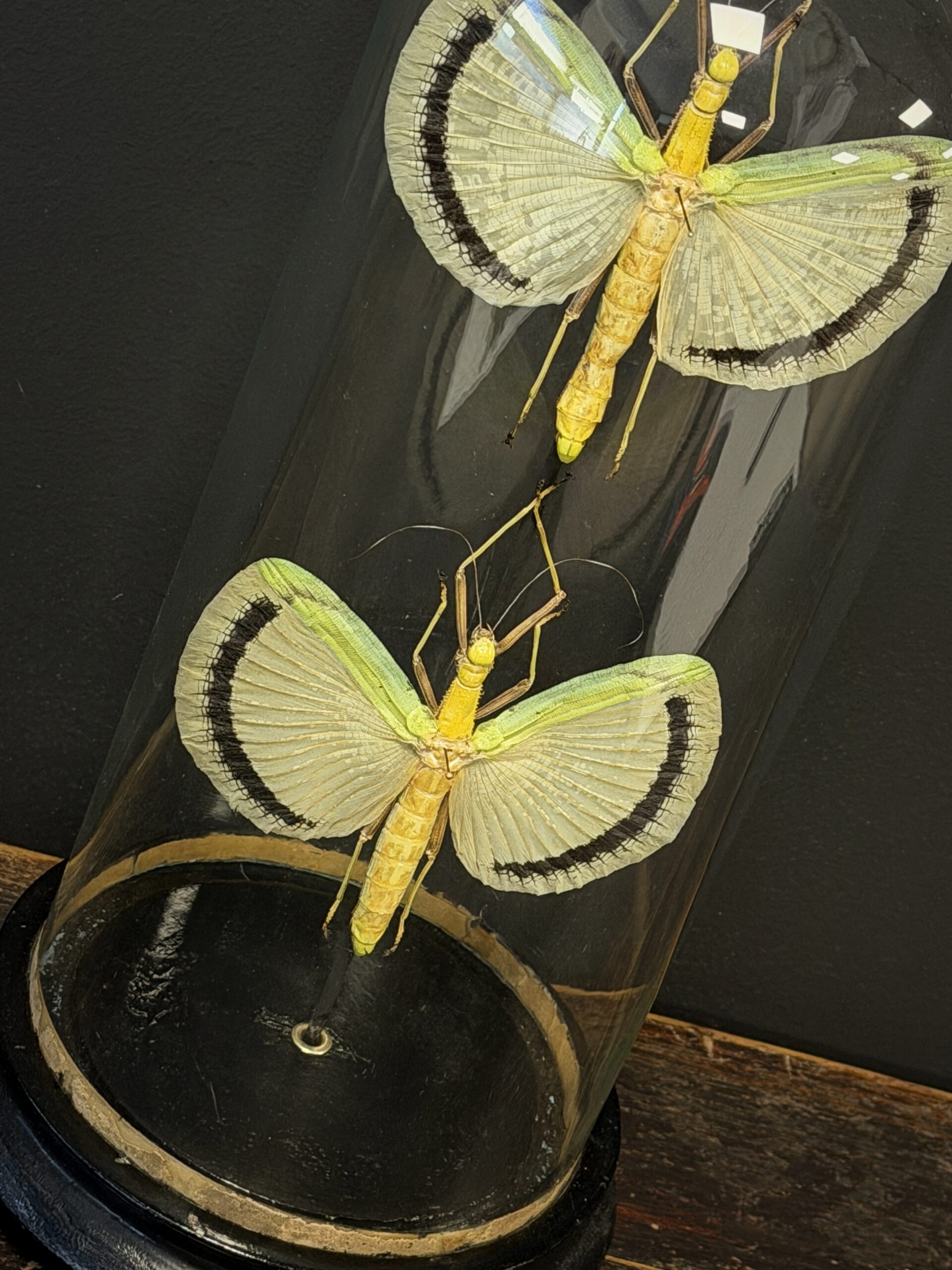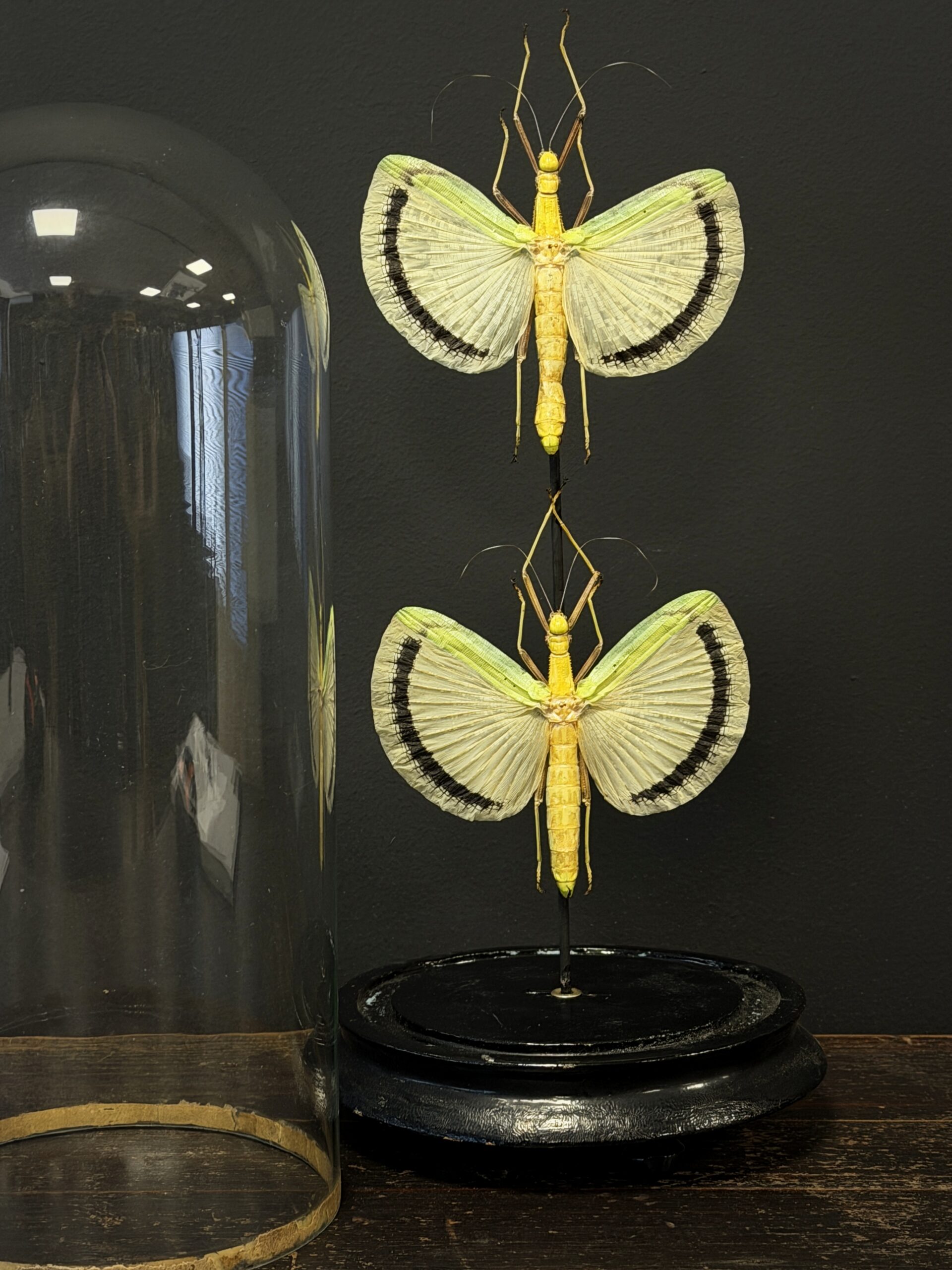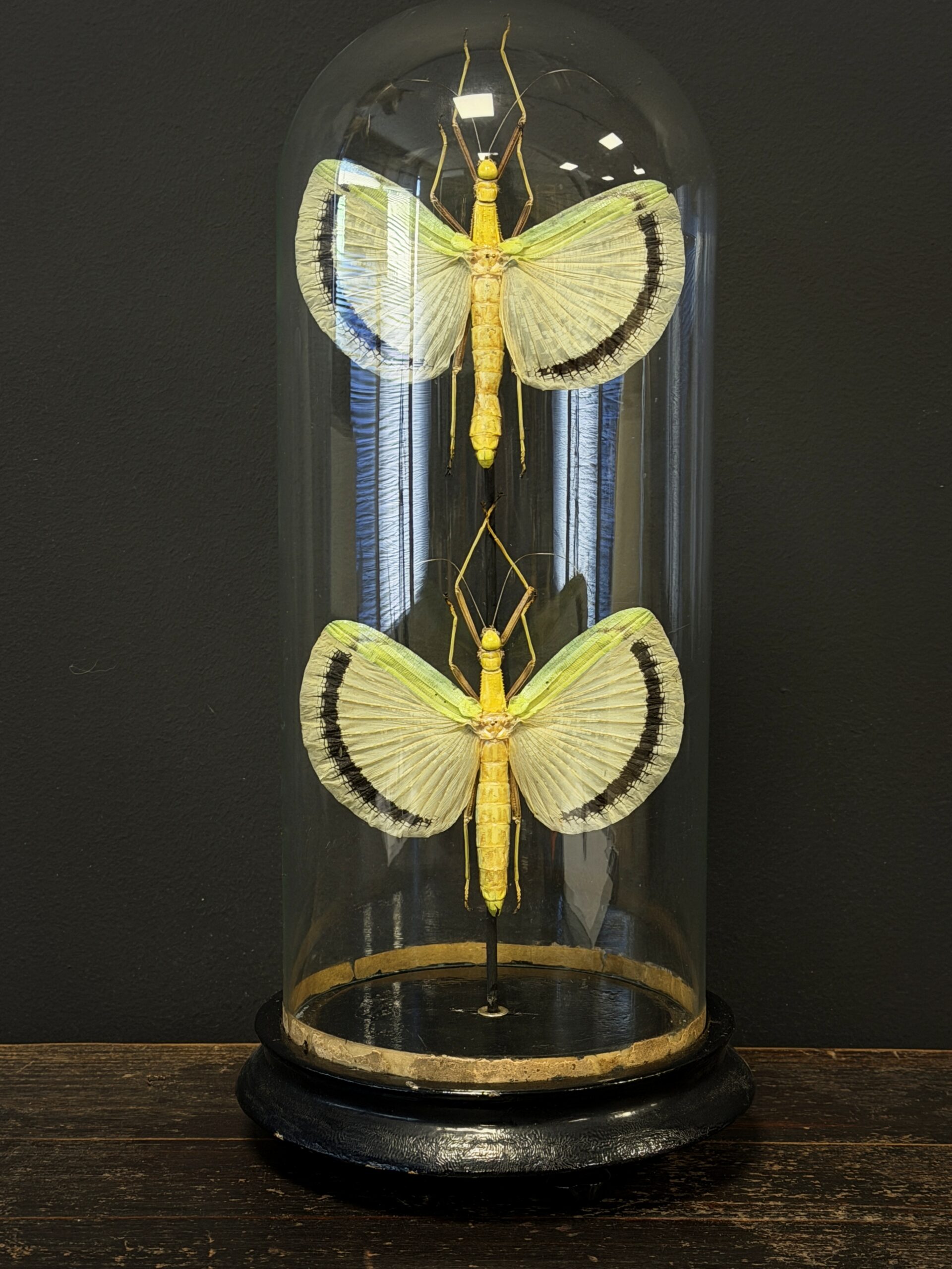 An antique bell jar provides an elegant and protective display for two Tagesoidea, also known as stick insects. Under the glass cover, these remarkable insects remain dust-free and clearly visible, while their delicate legs and branch-like body shape are beautifully showcased. The combination of the classic character of the bell jar and the natural camouflage of the insects makes it both a decorative and educational object, in which craftsmanship and natural history come together.