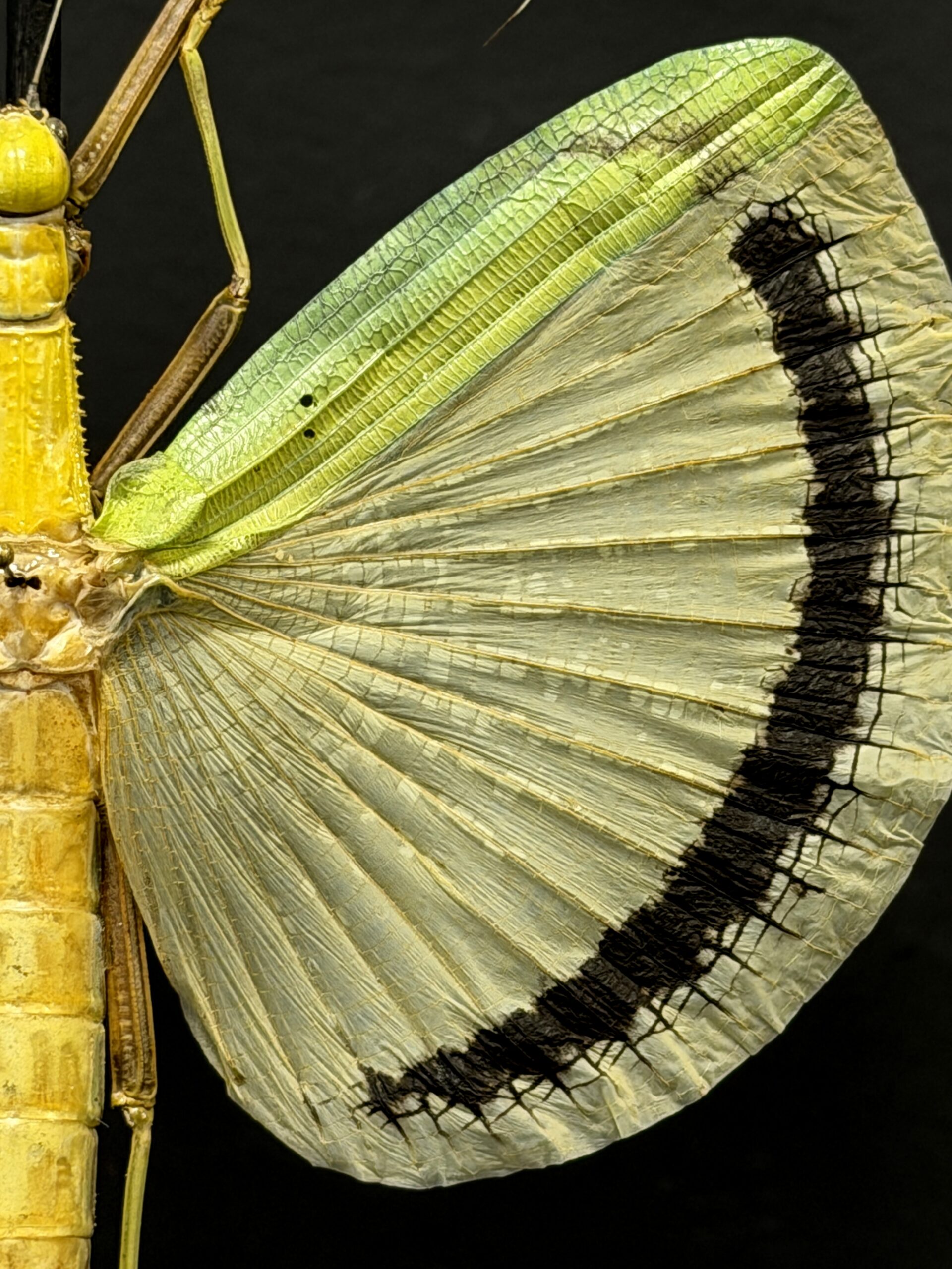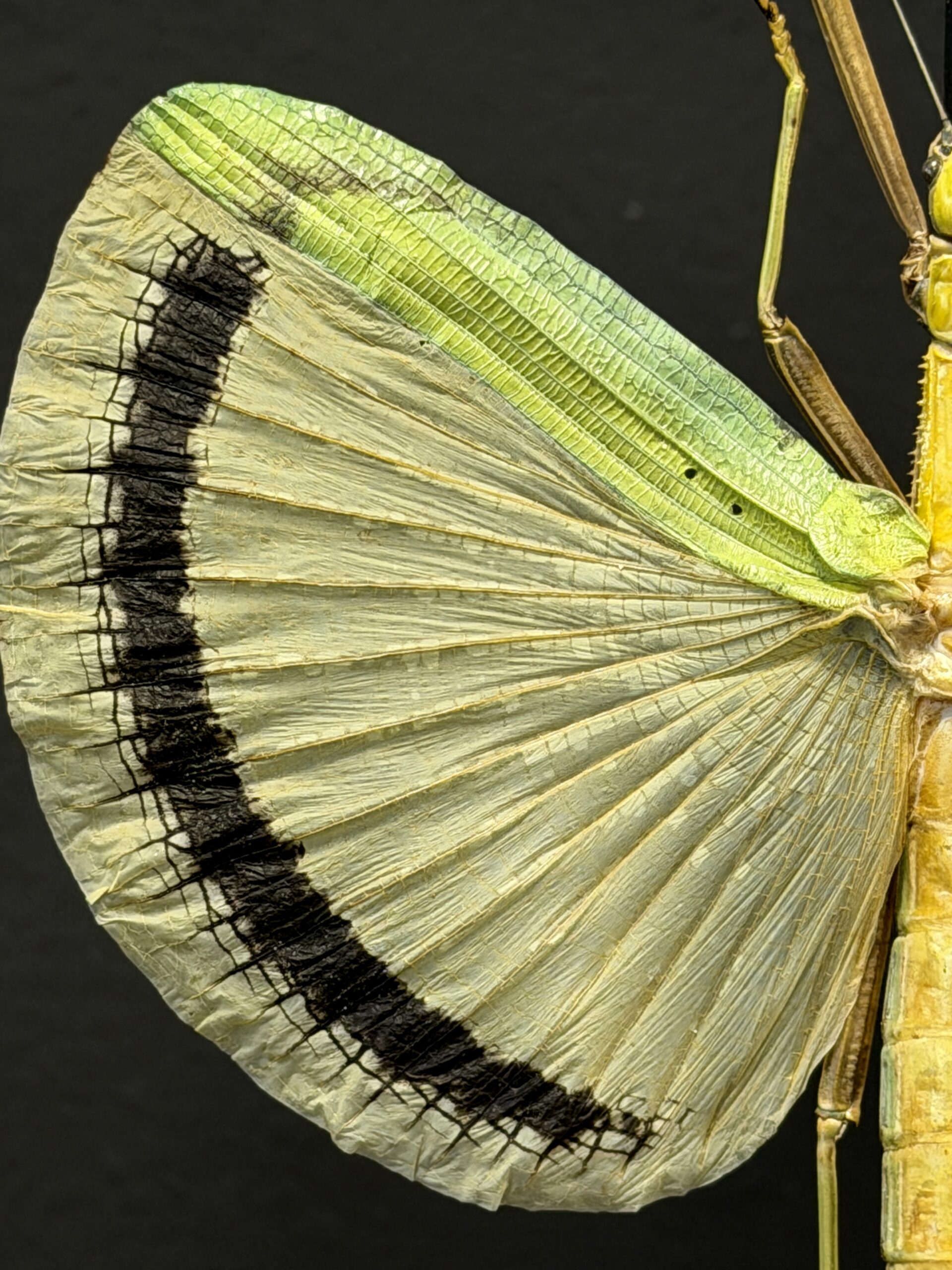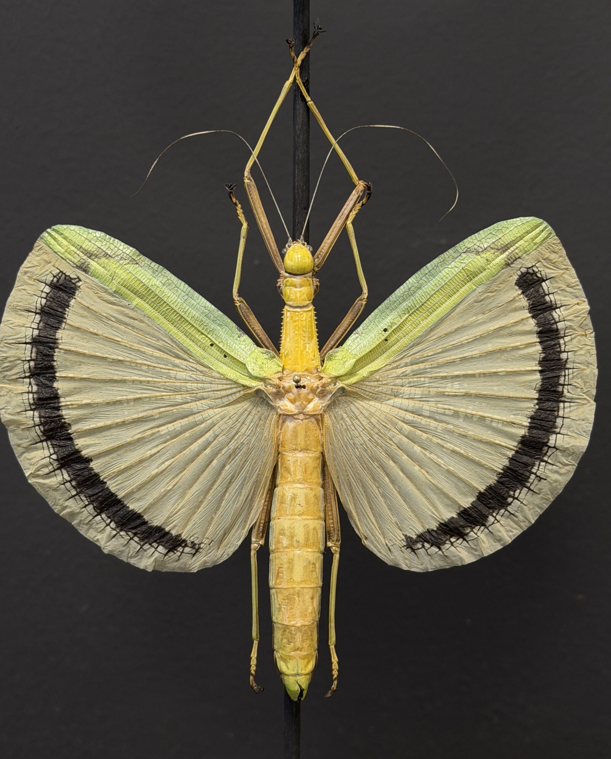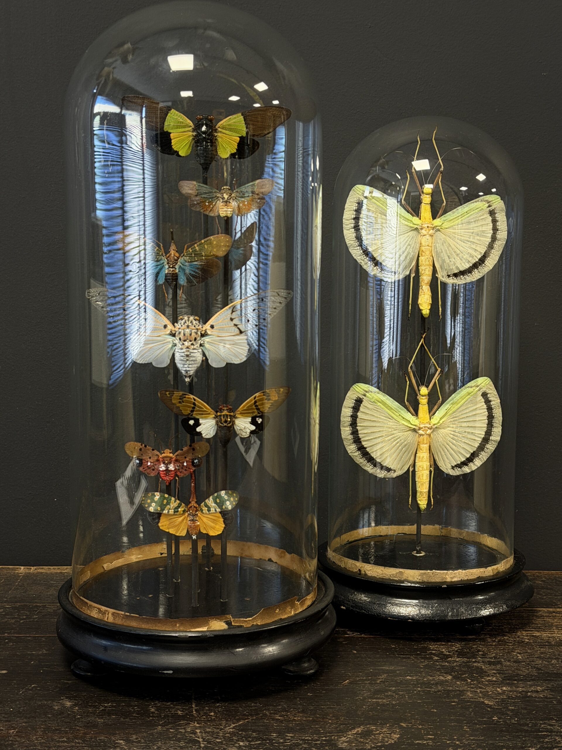 An antique bell jar provides an elegant and protective display for two Tagesoidea, also known as stick insects. Under the glass cover, these remarkable insects remain dust-free and clearly visible, while their delicate legs and branch-like body shape are beautifully showcased. The combination of the classic character of the bell jar and the natural camouflage of the insects makes it both a decorative and educational object, in which craftsmanship and natural history come together.
