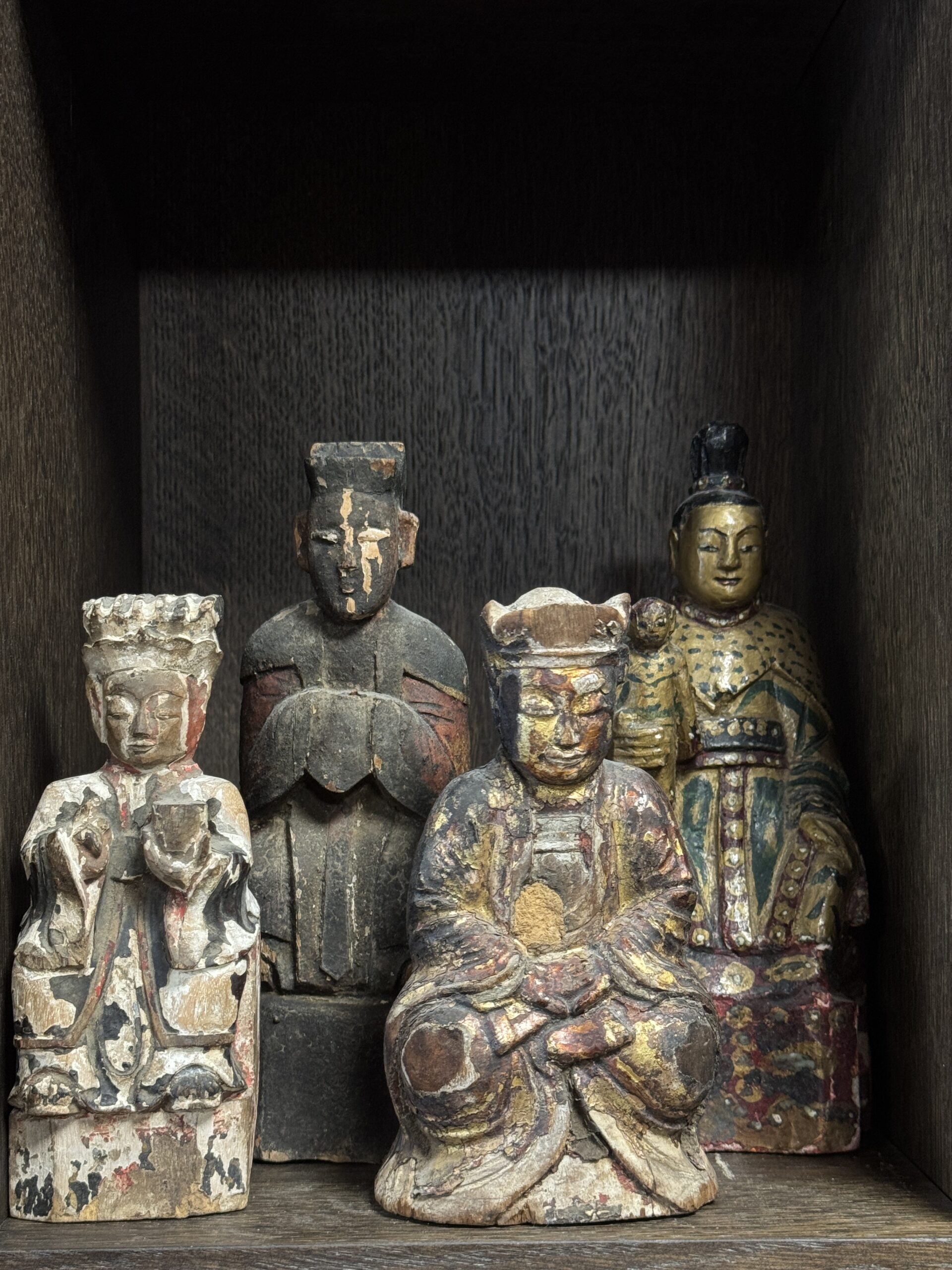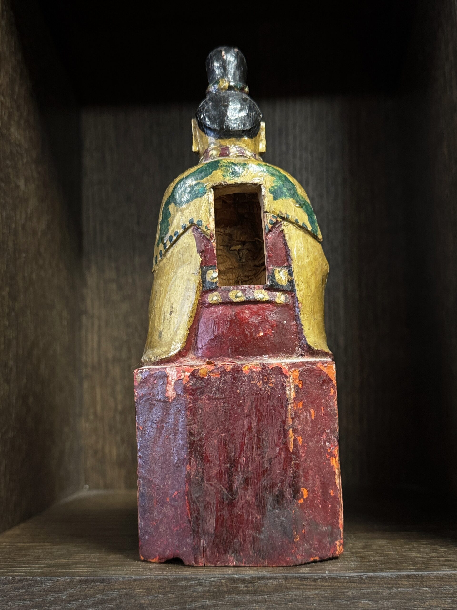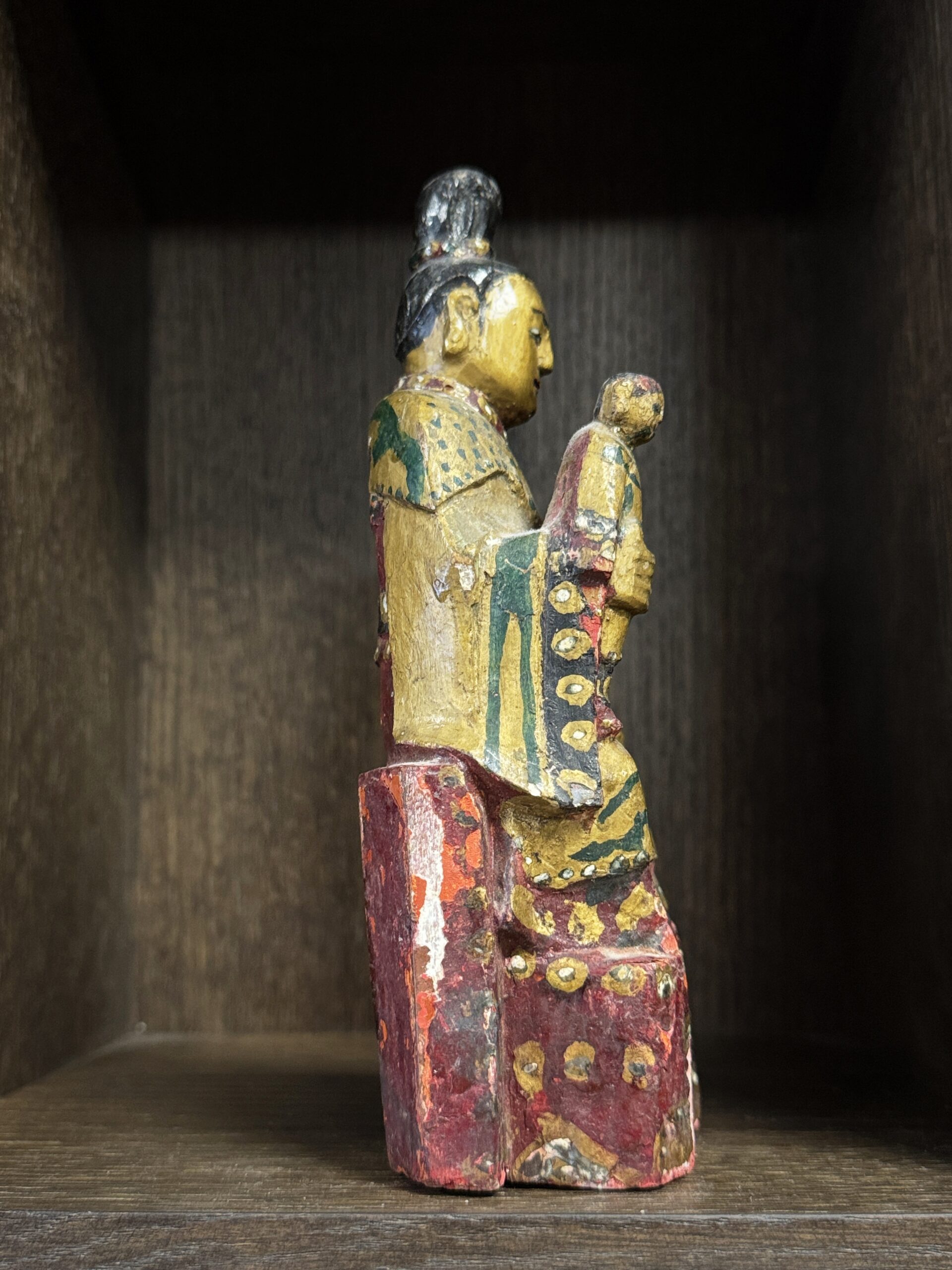 This antique Chinese figurine from the Qing Dynasty (18th century or earlier) is a beautiful example of traditional wood craftsmanship. The figurine is made of wood and beautifully painted in polychrome tones, giving it a warm and authentic look.