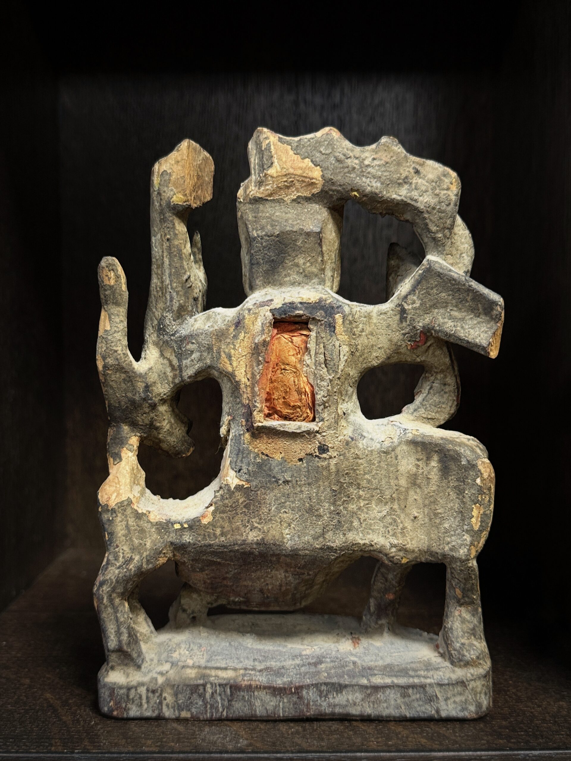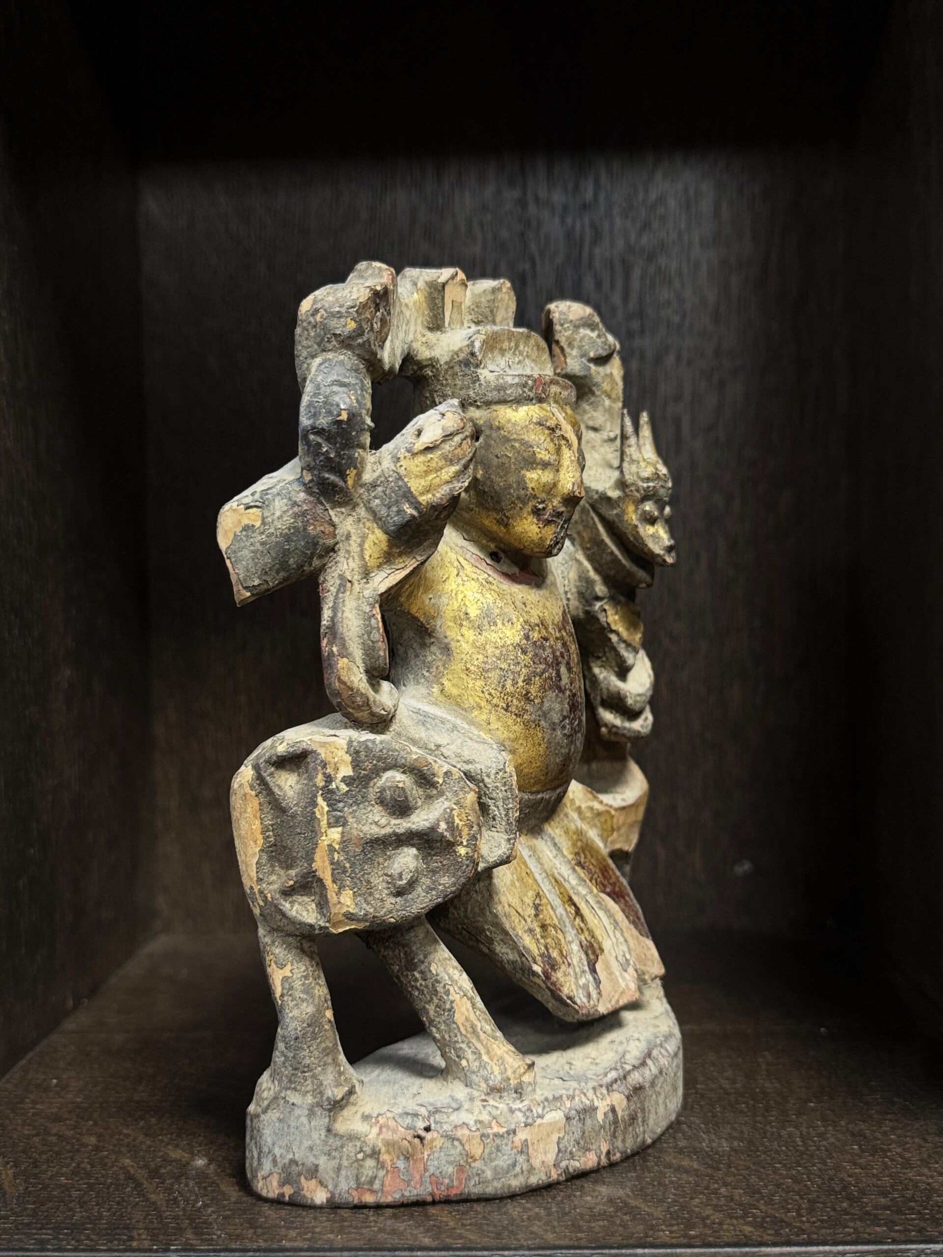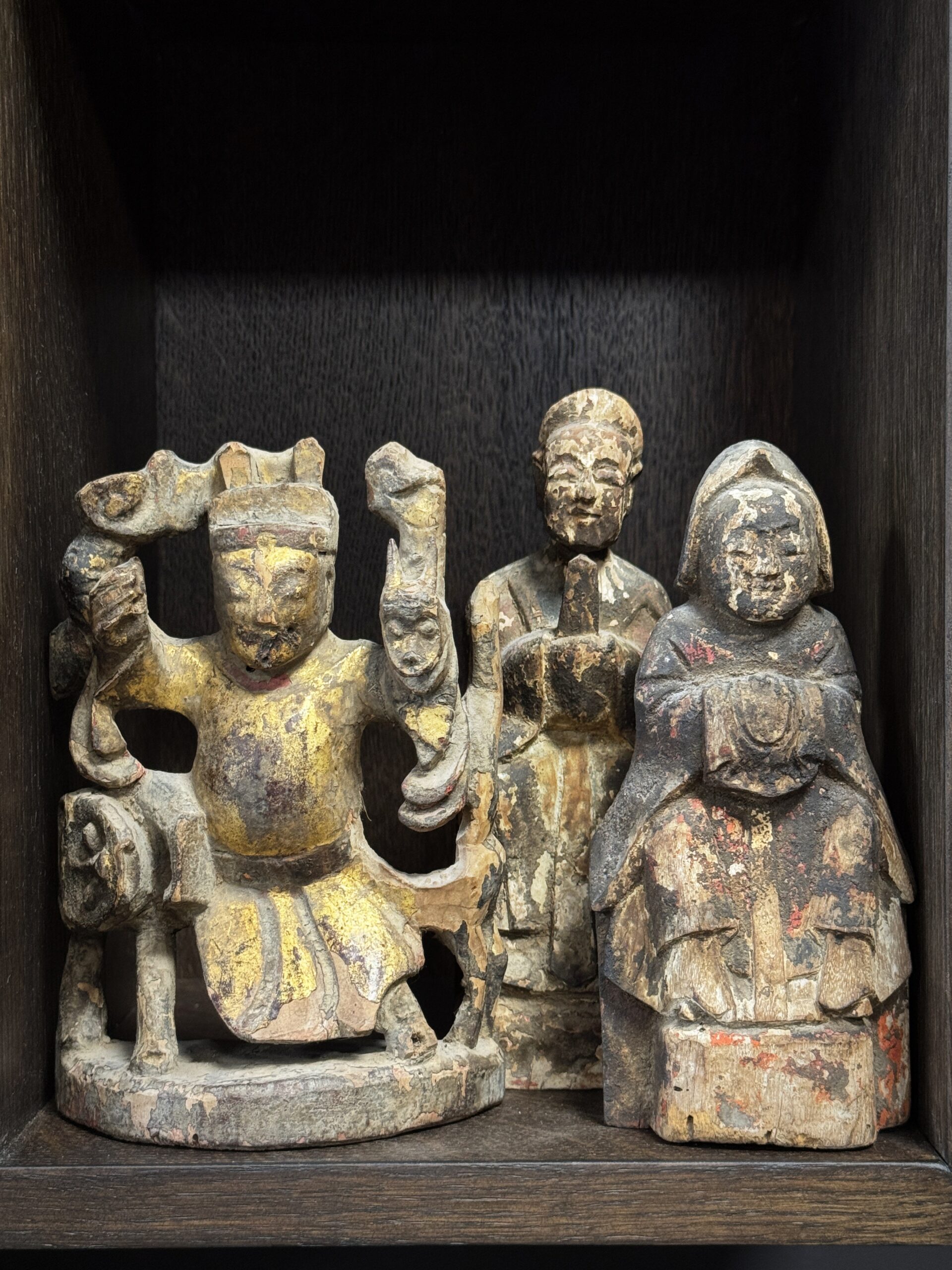This antique Chinese figurine from the Qing Dynasty (18th century or earlier) is a beautiful example of traditional wood craftsmanship. The figurine is made of wood and beautifully painted in polychrome tones, giving it a warm and authentic look.