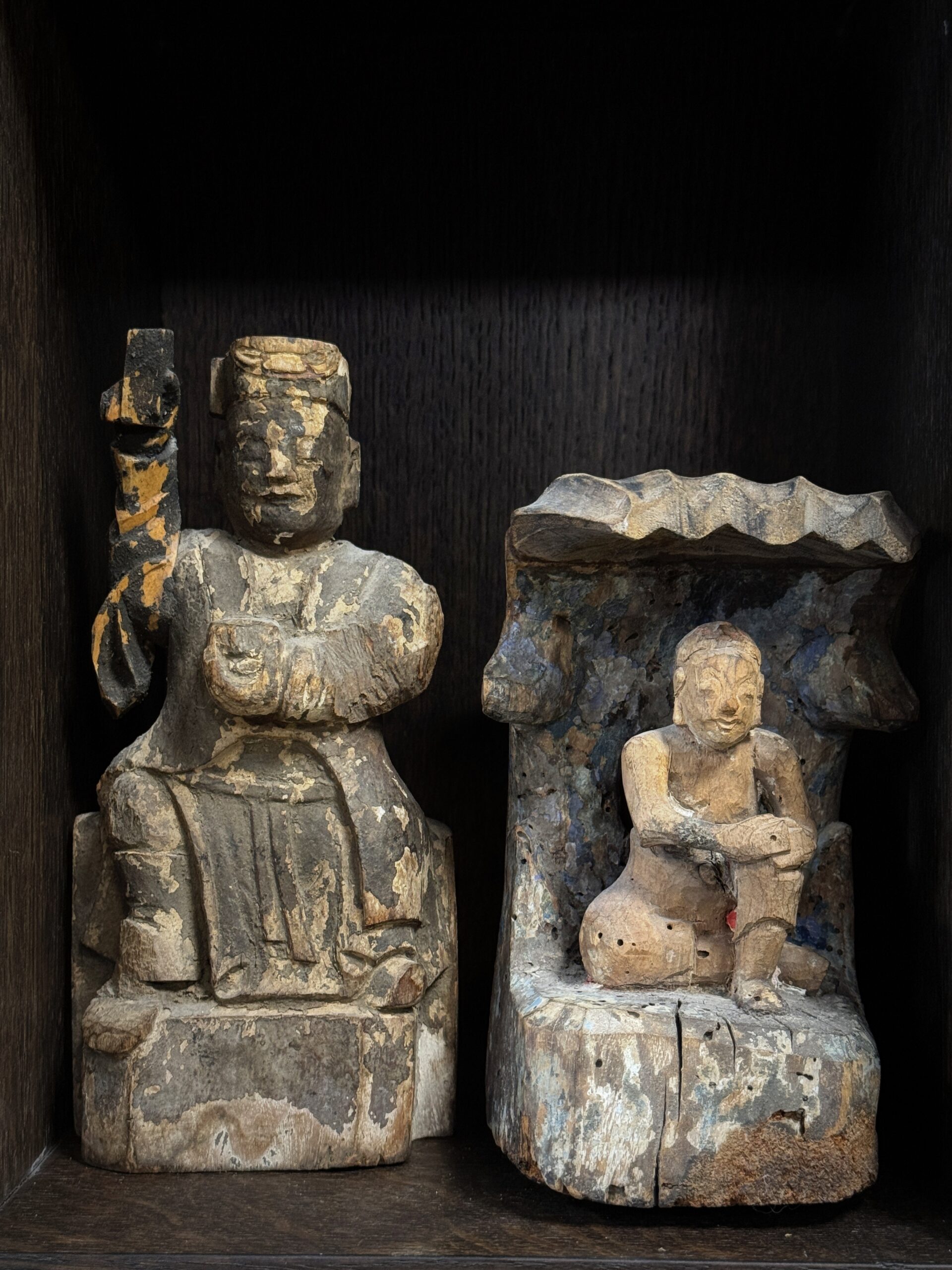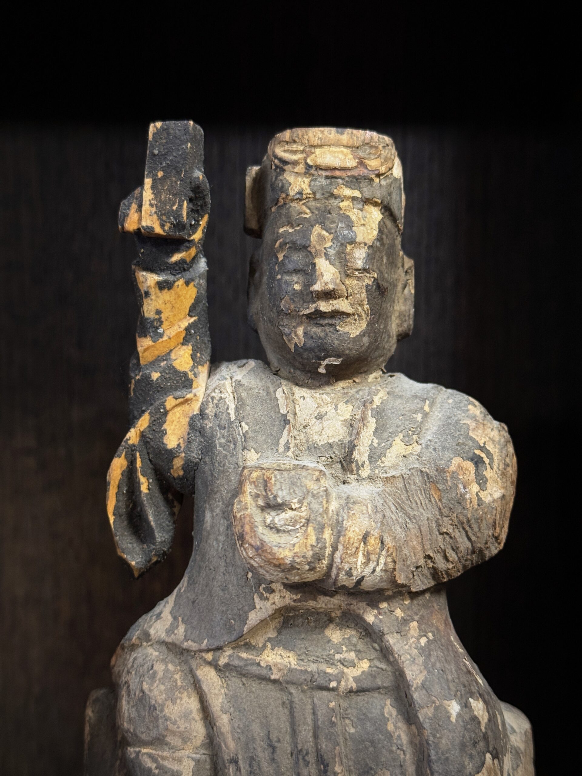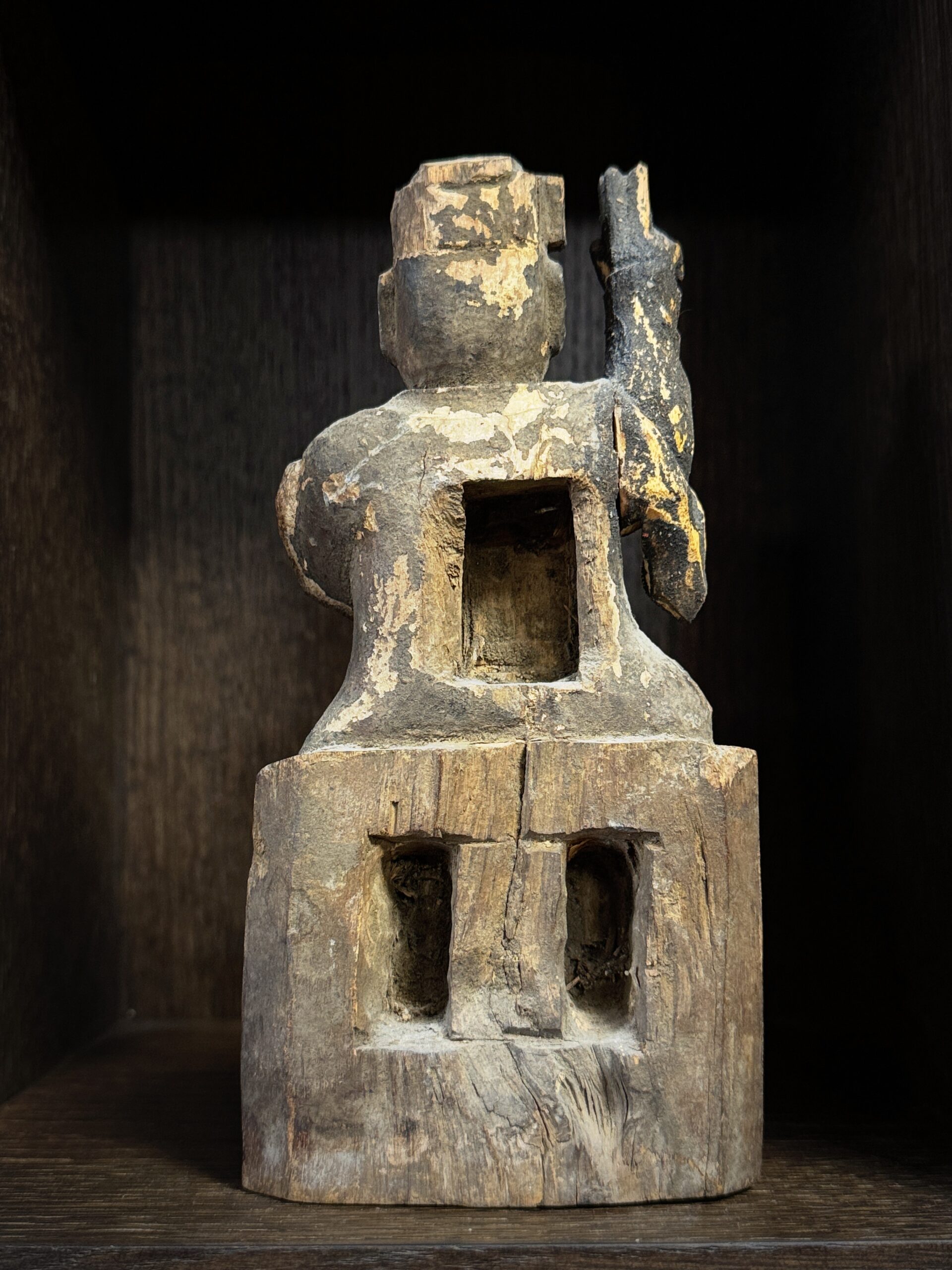 This antique Chinese figurine from the Qing Dynasty (18th century or earlier) is a beautiful example of traditional wood craftsmanship. The figurine is made of wood and beautifully painted in polychrome tones, giving it a warm and authentic look.