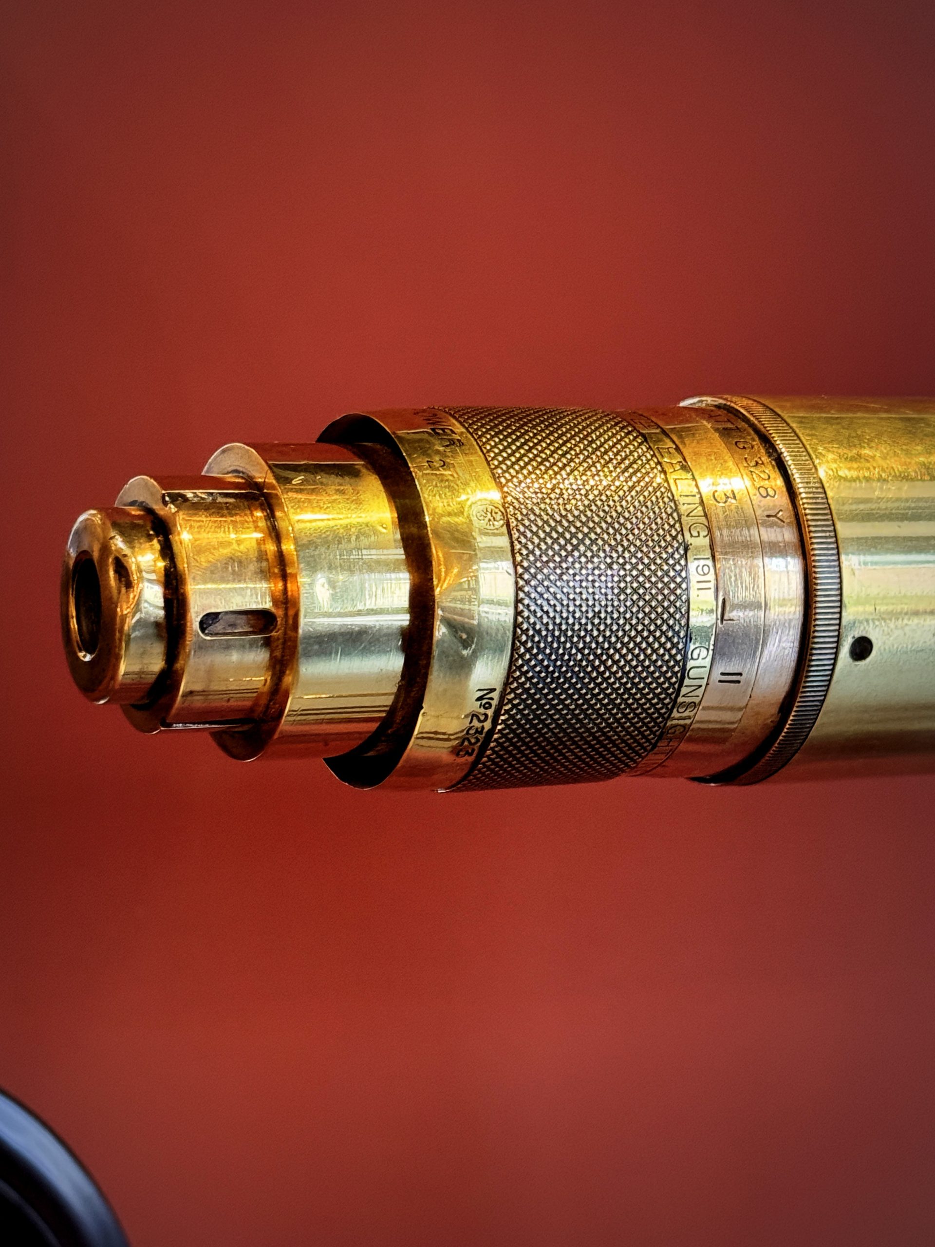 Very decorative antique brass binoculars by the Ottway company of Ealing/ London, England on a 3-legged stand. Viewer dates from late 1911.