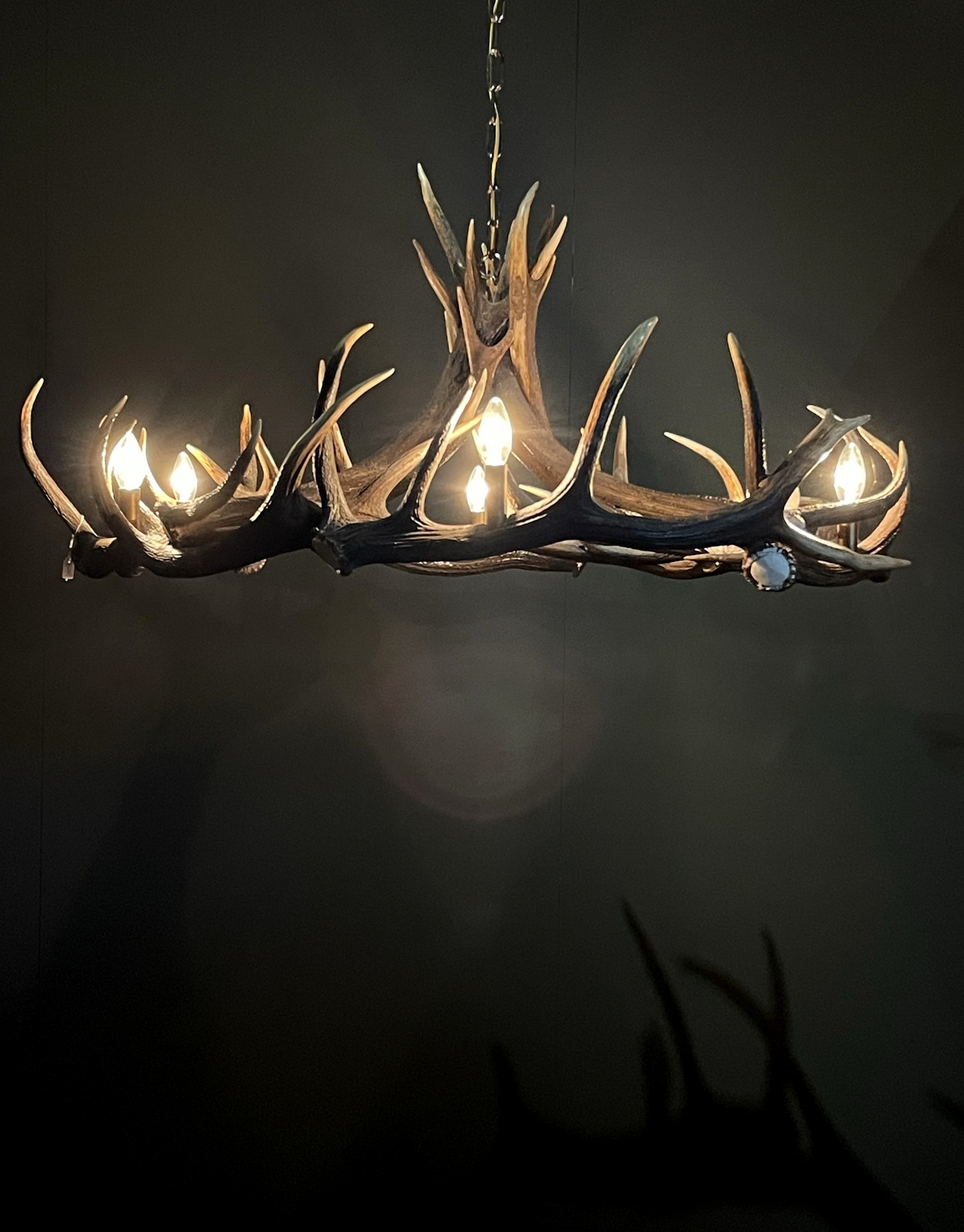 Red stag antler pendant lamp. This 6-light antler lamp is made from beautiful heavy antlers. This one has copper colored sleeves but we can also supply them with classic or black sleeves.