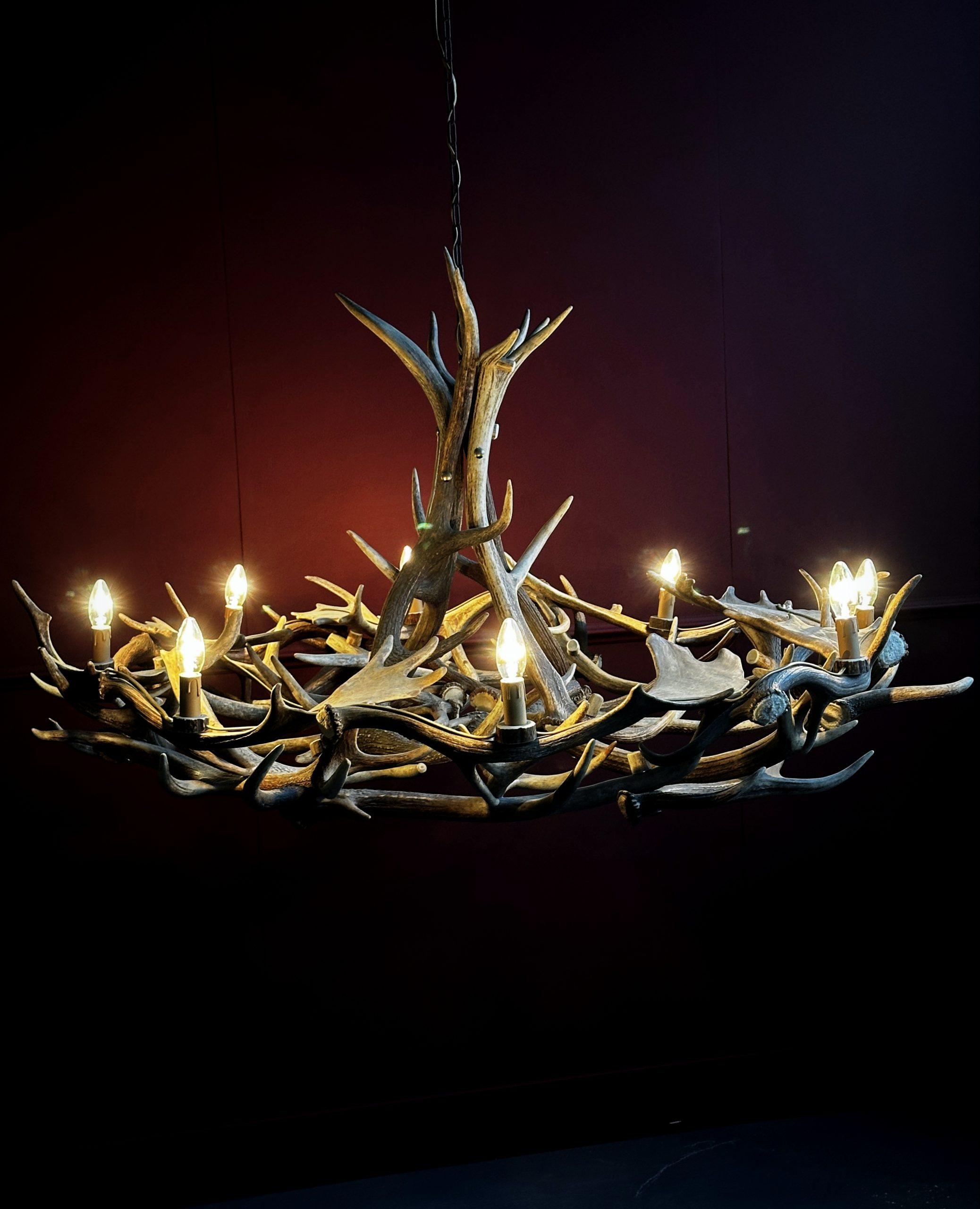 Large red deer and fallow deer antler pendant lamp. This 8-light antler lamp is made from natural antlers. This one features classic sleeves.