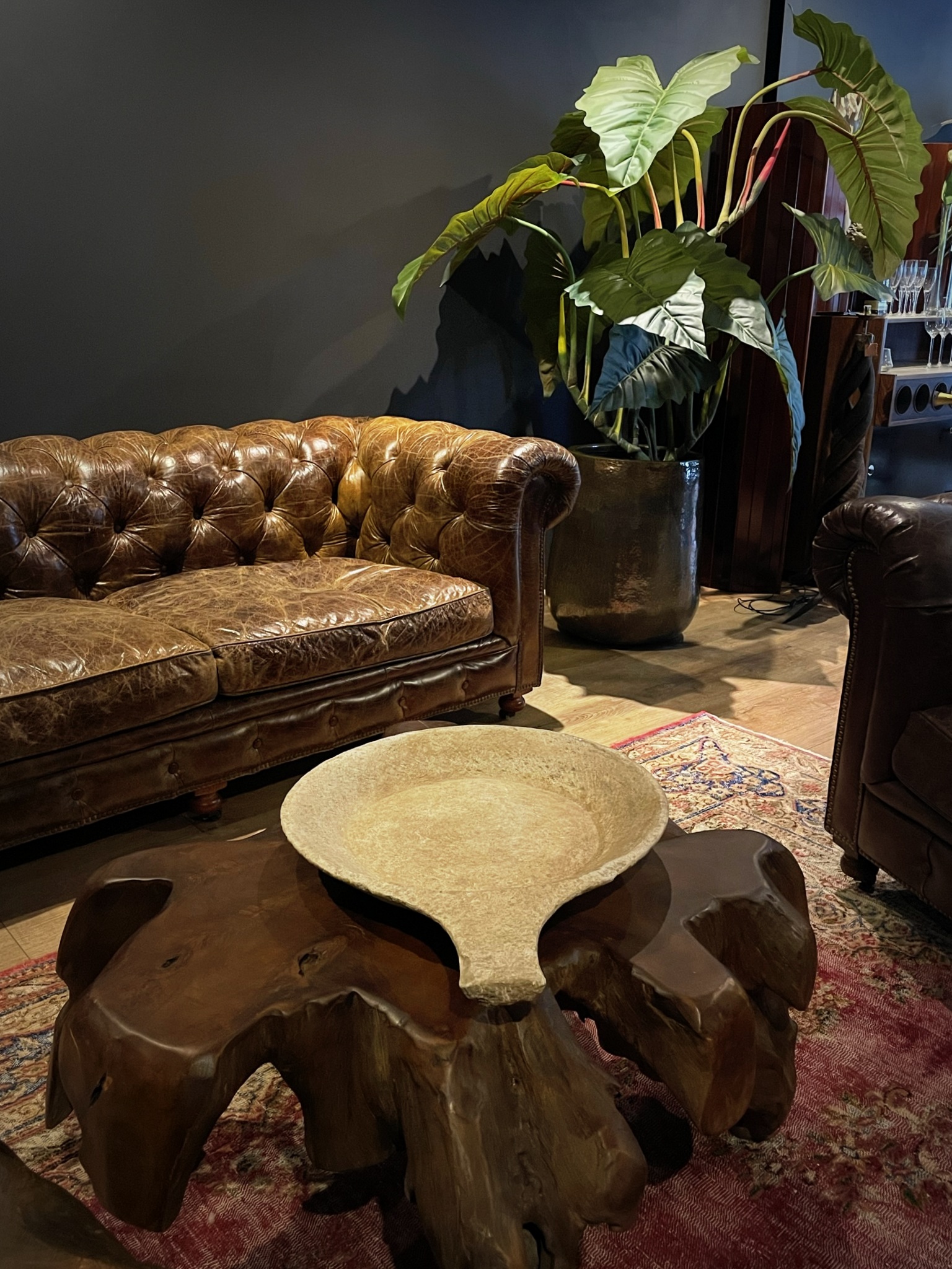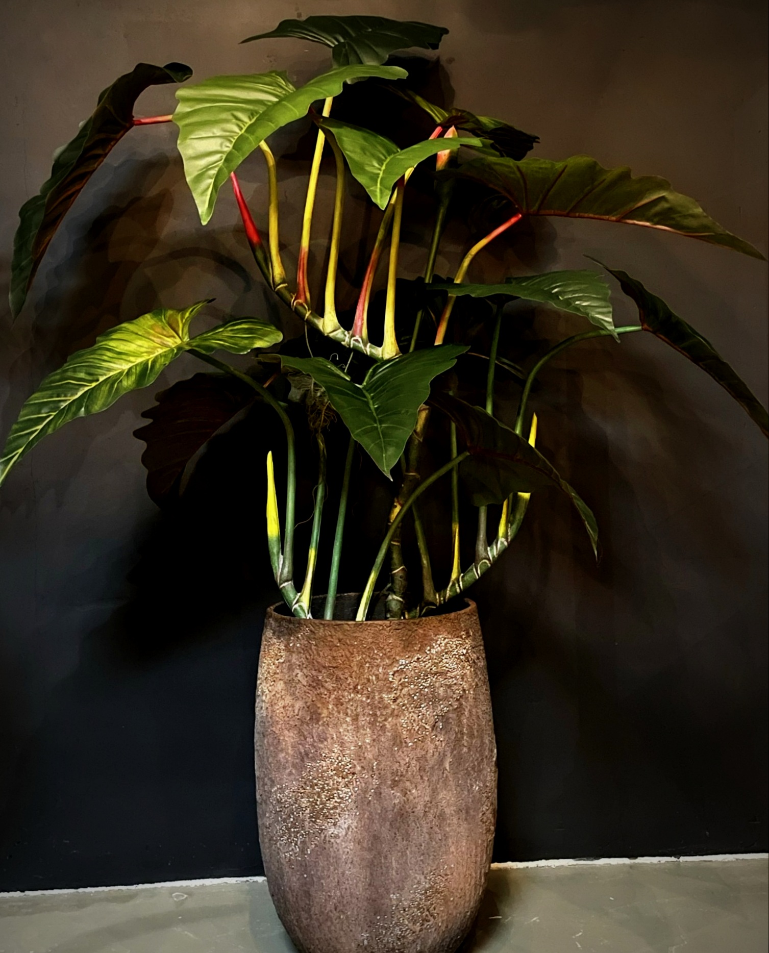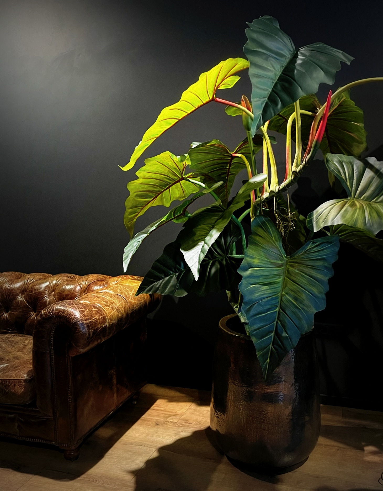 Beautiful large Calocasia XL and sturdy aged brown pot. This artificial plant in combination with the stylish pot provides a rich addition to your interior, hotel or restaurant.