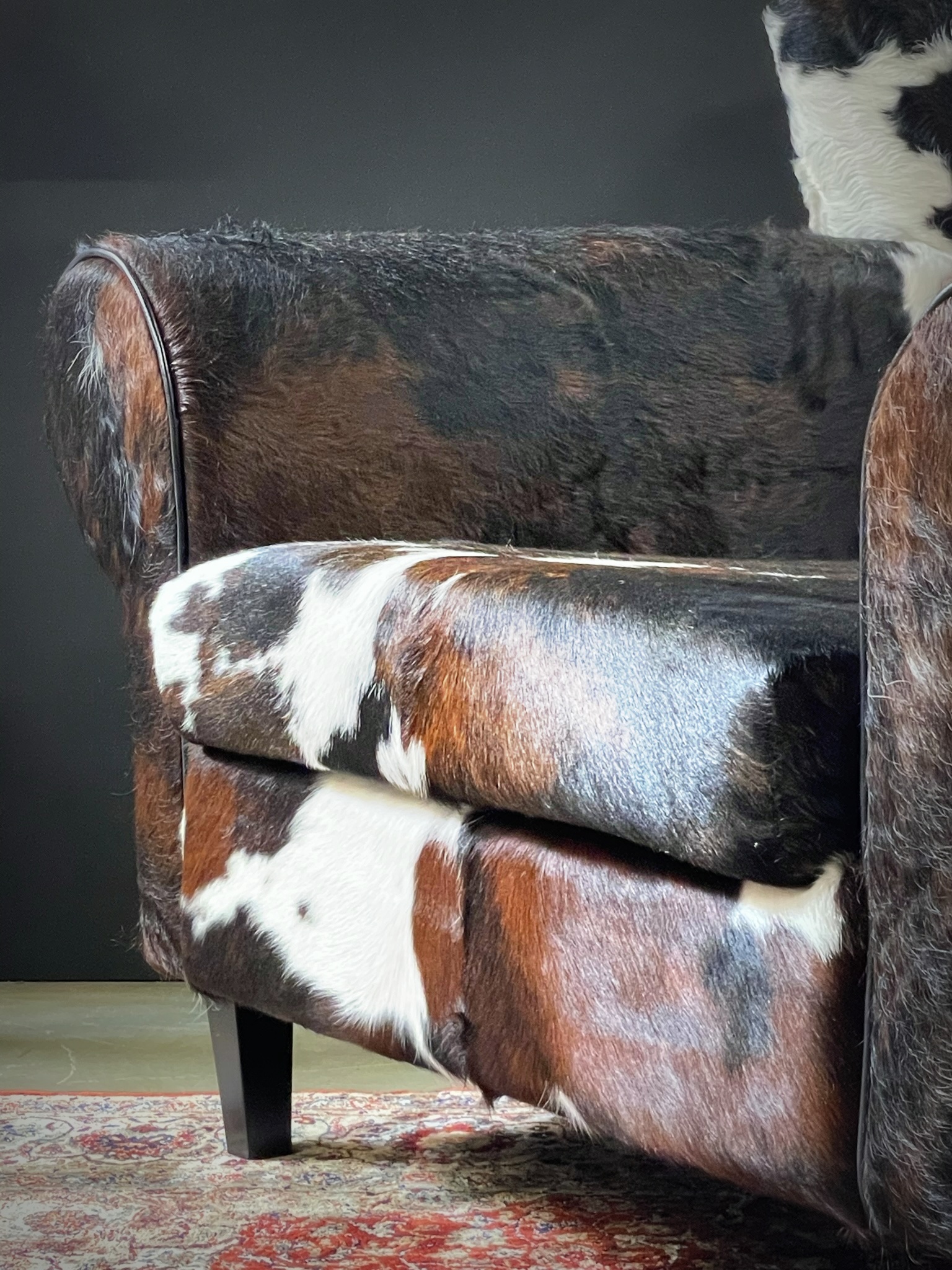 This robust loveseat is upholstered with the best tricolor cowhides. Our loveseats have a very strong framework and are made with the best tanned hides available. This guarantees that you are purchasing a high-quality armchair. It is possible to cover with other cowhide colours. Inquire about the possibilities.