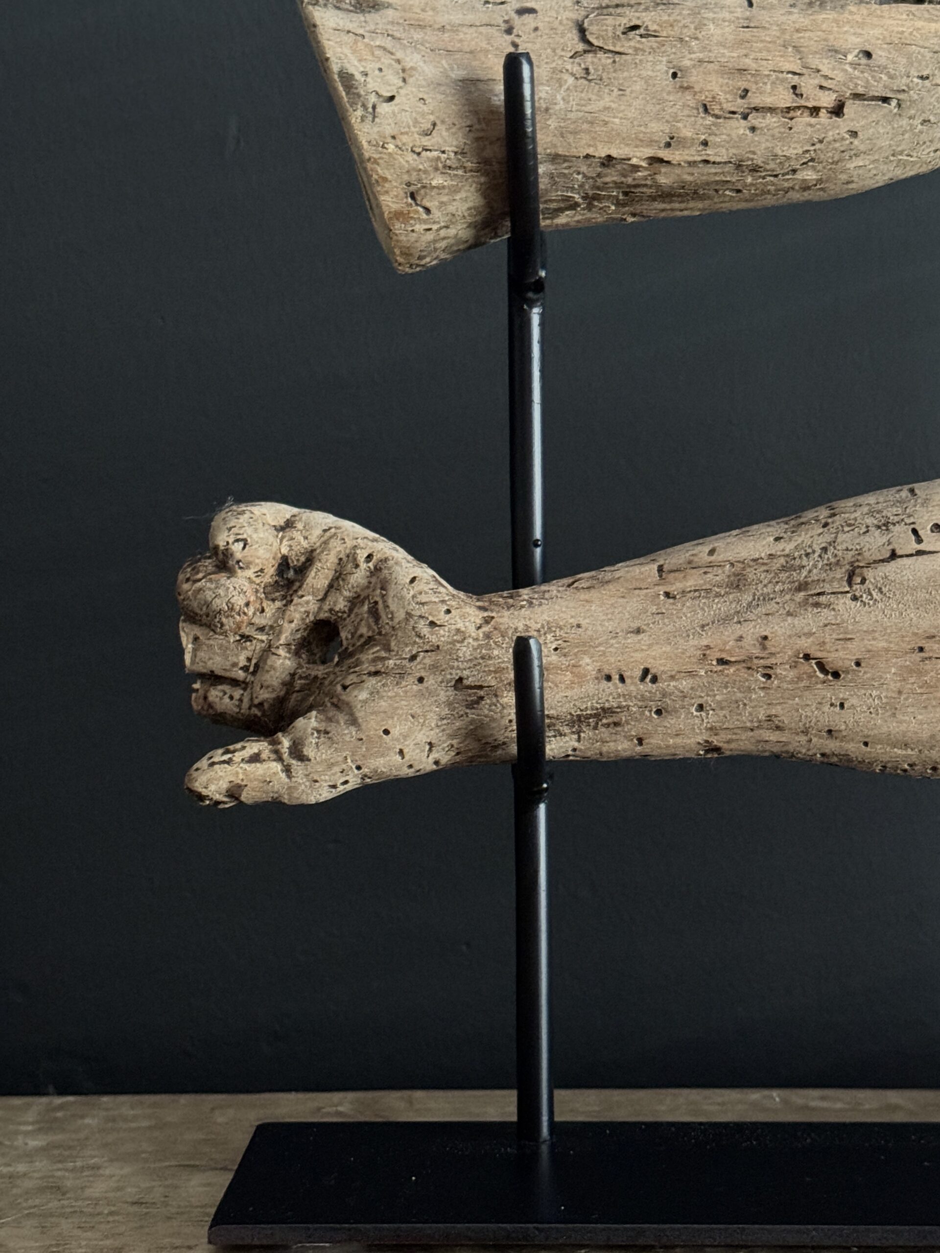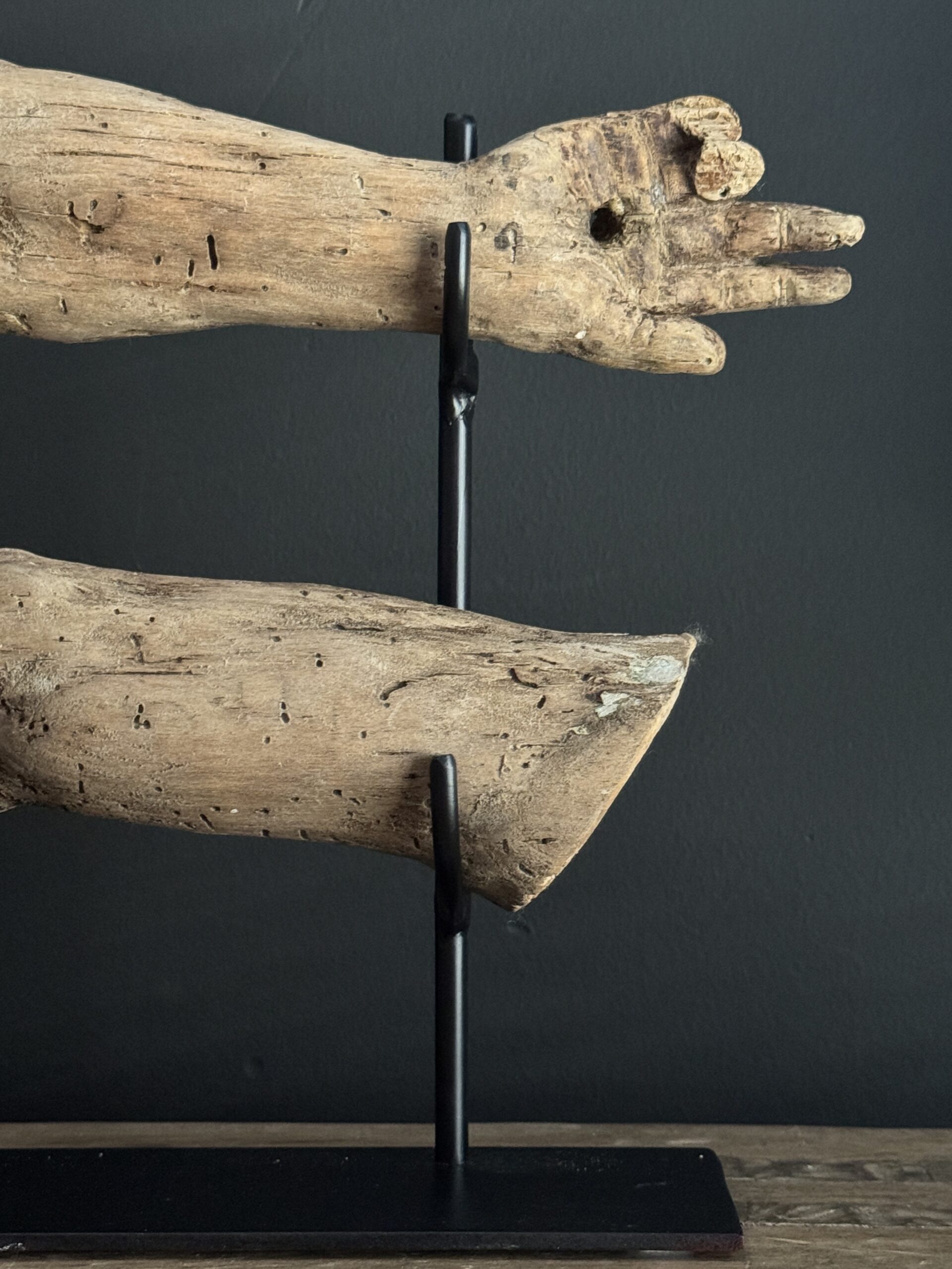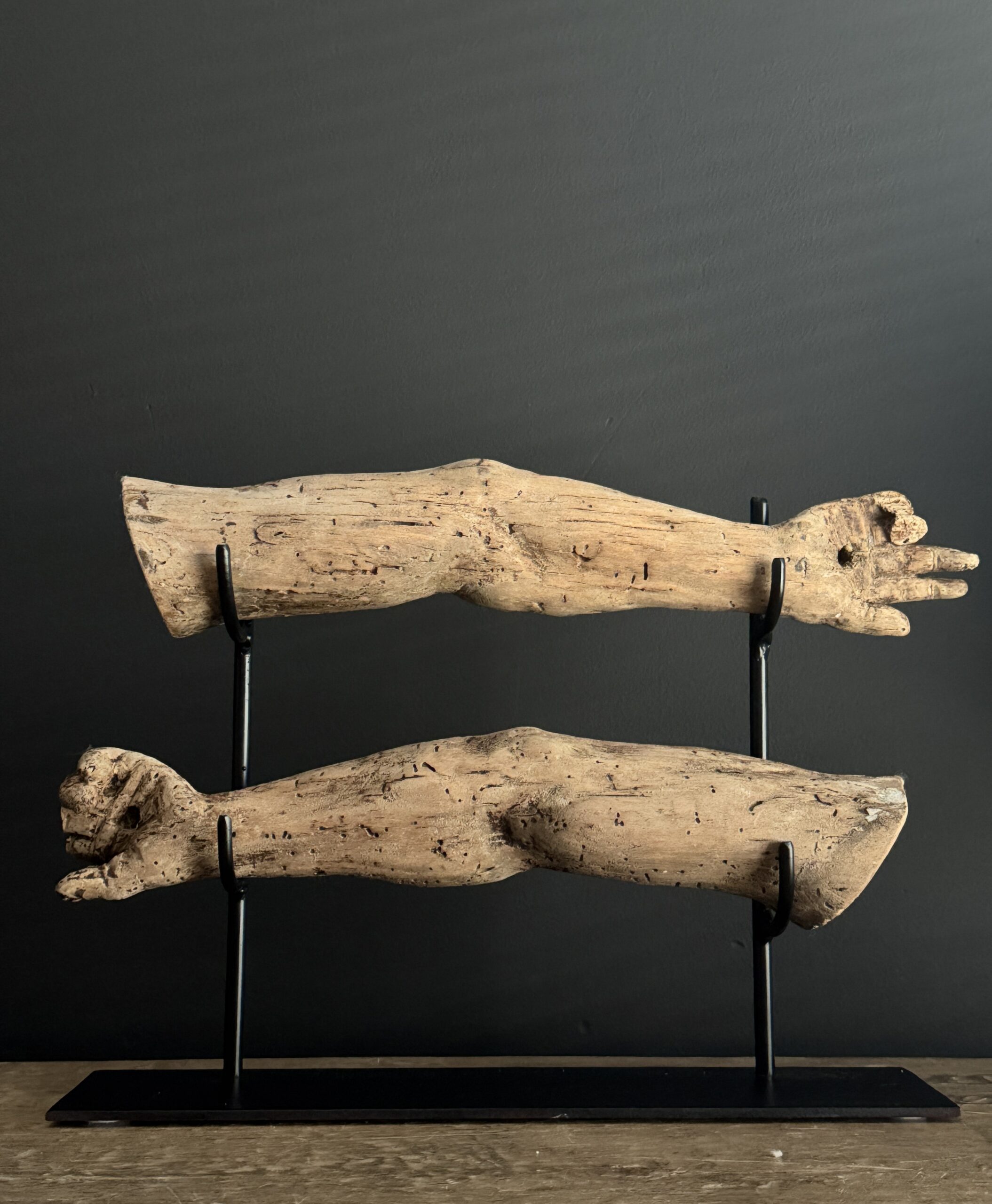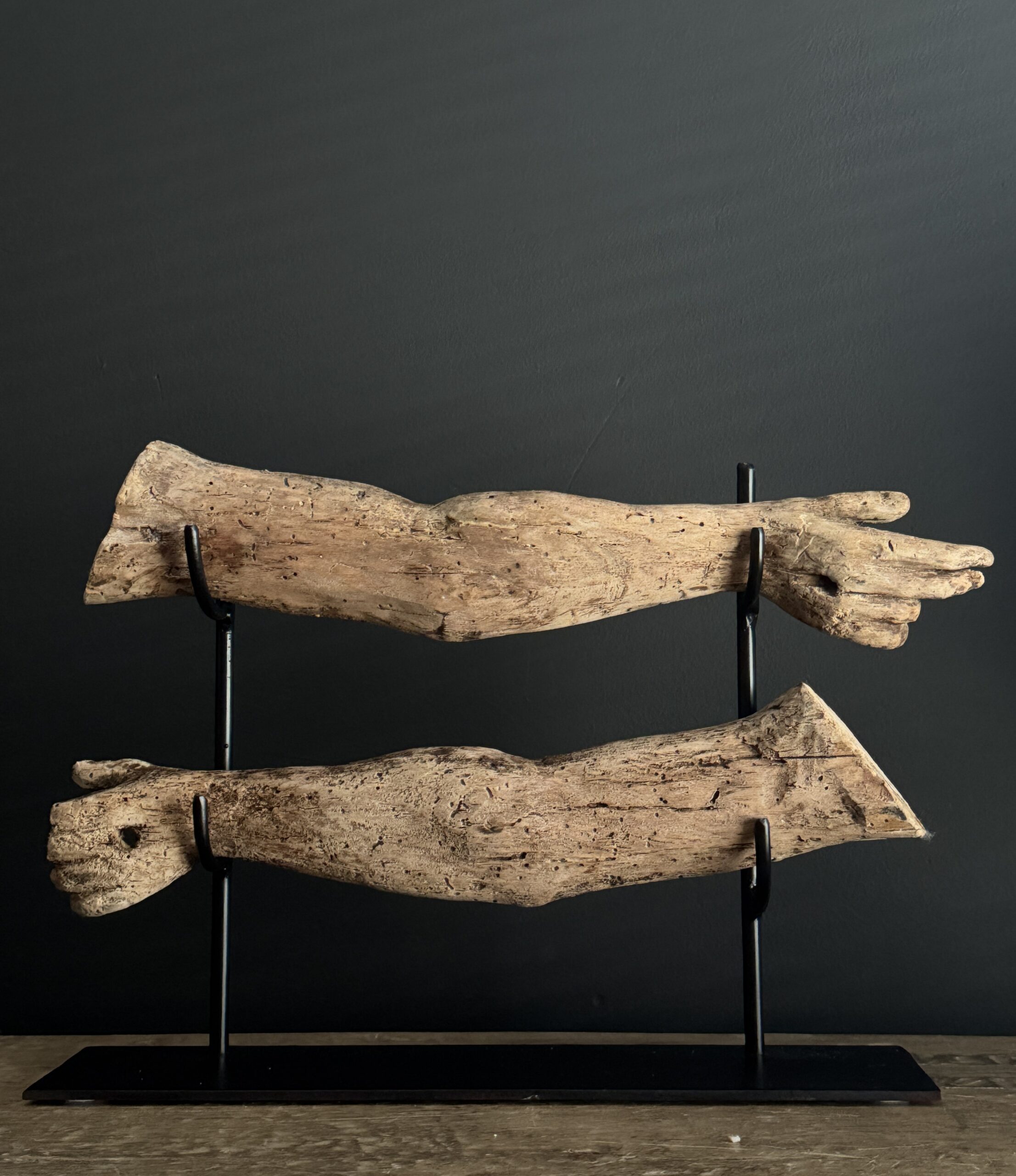 These two decorative wooden arms from the 17th century are true eye-catchers full of character and history. With their beautiful patina and refined design, they tell a story from a bygone era. Presented on a custom-made support, the unique details stand out even more, making them a stylish and authentic accent in any interior.