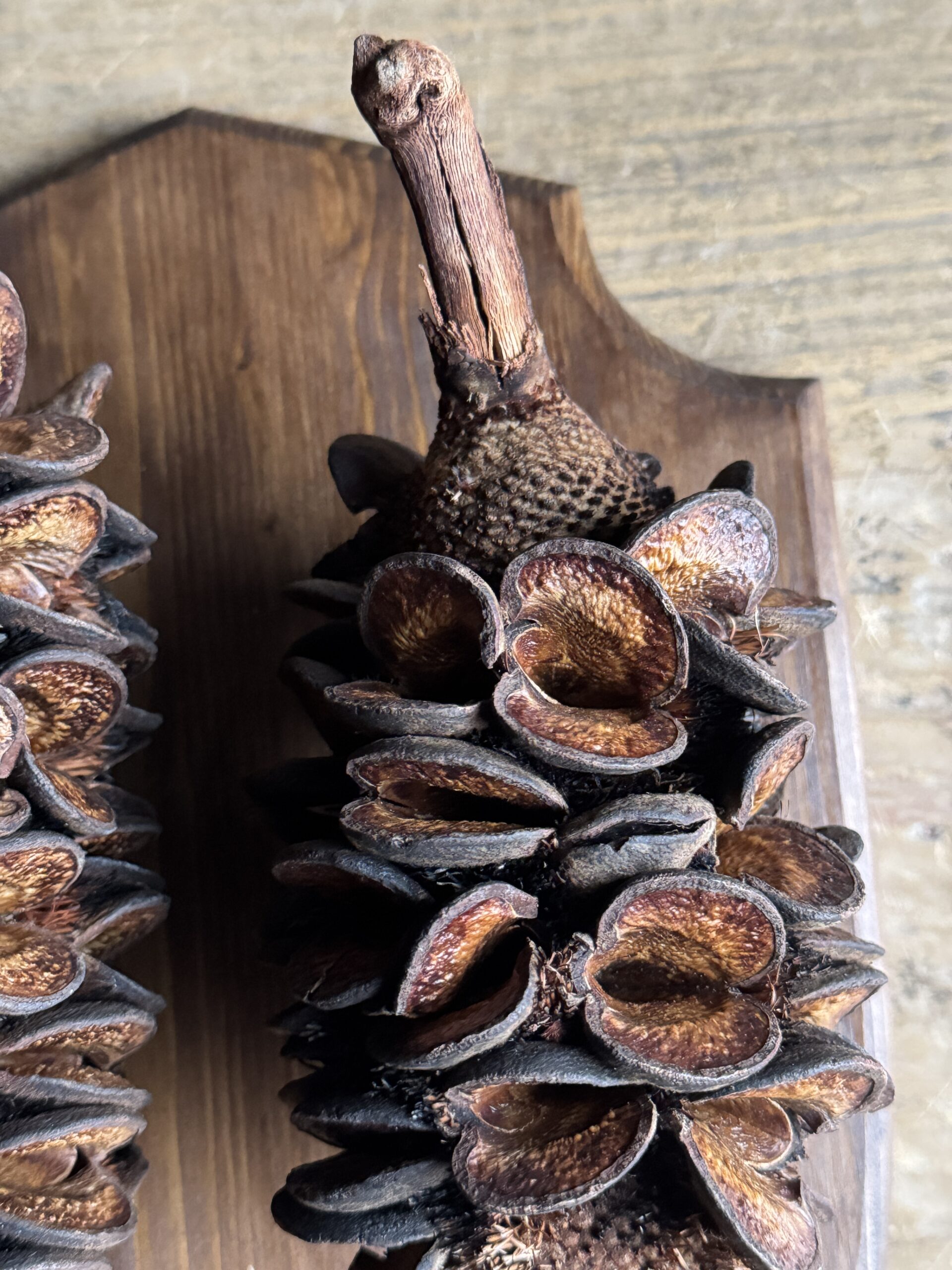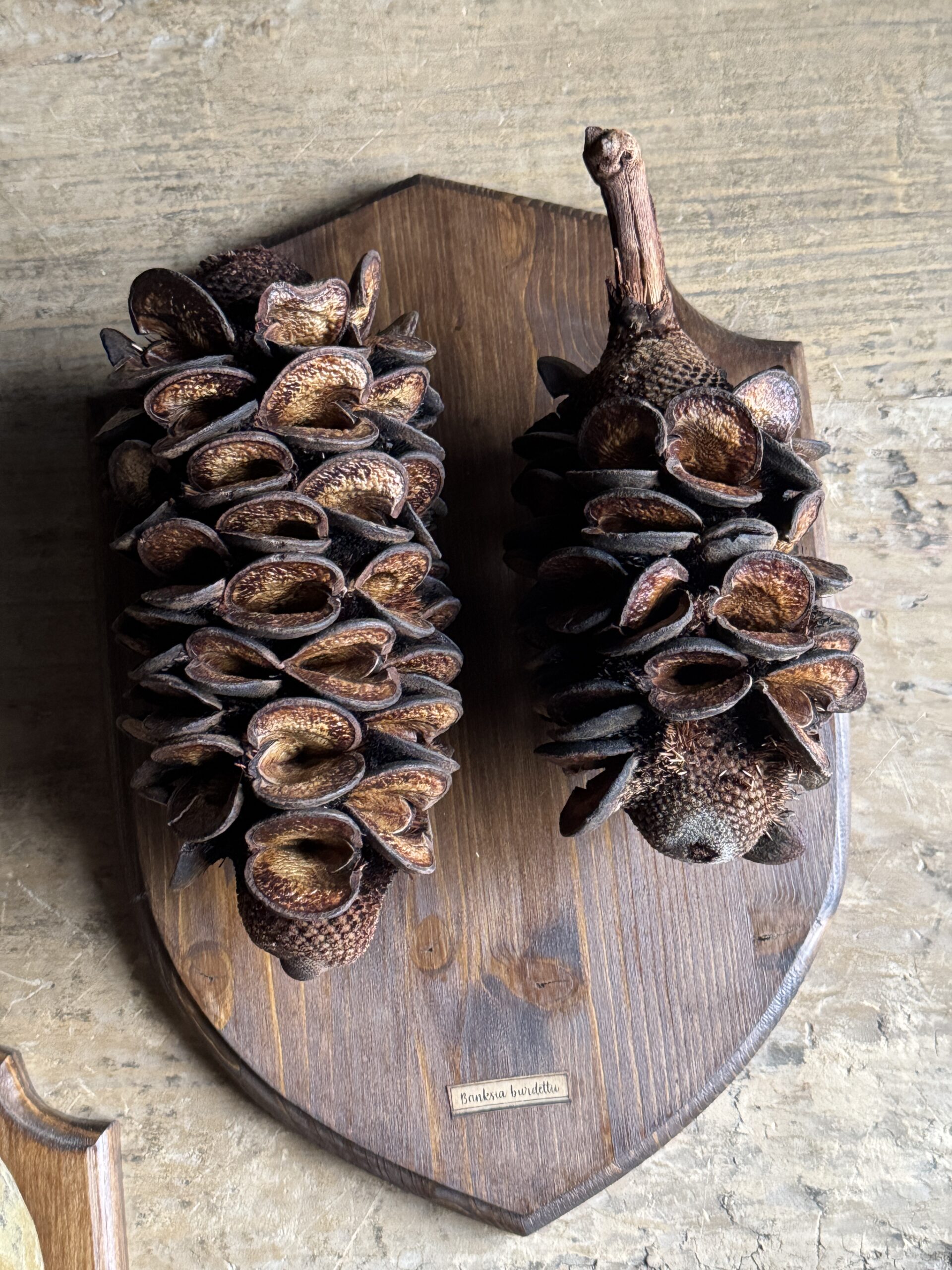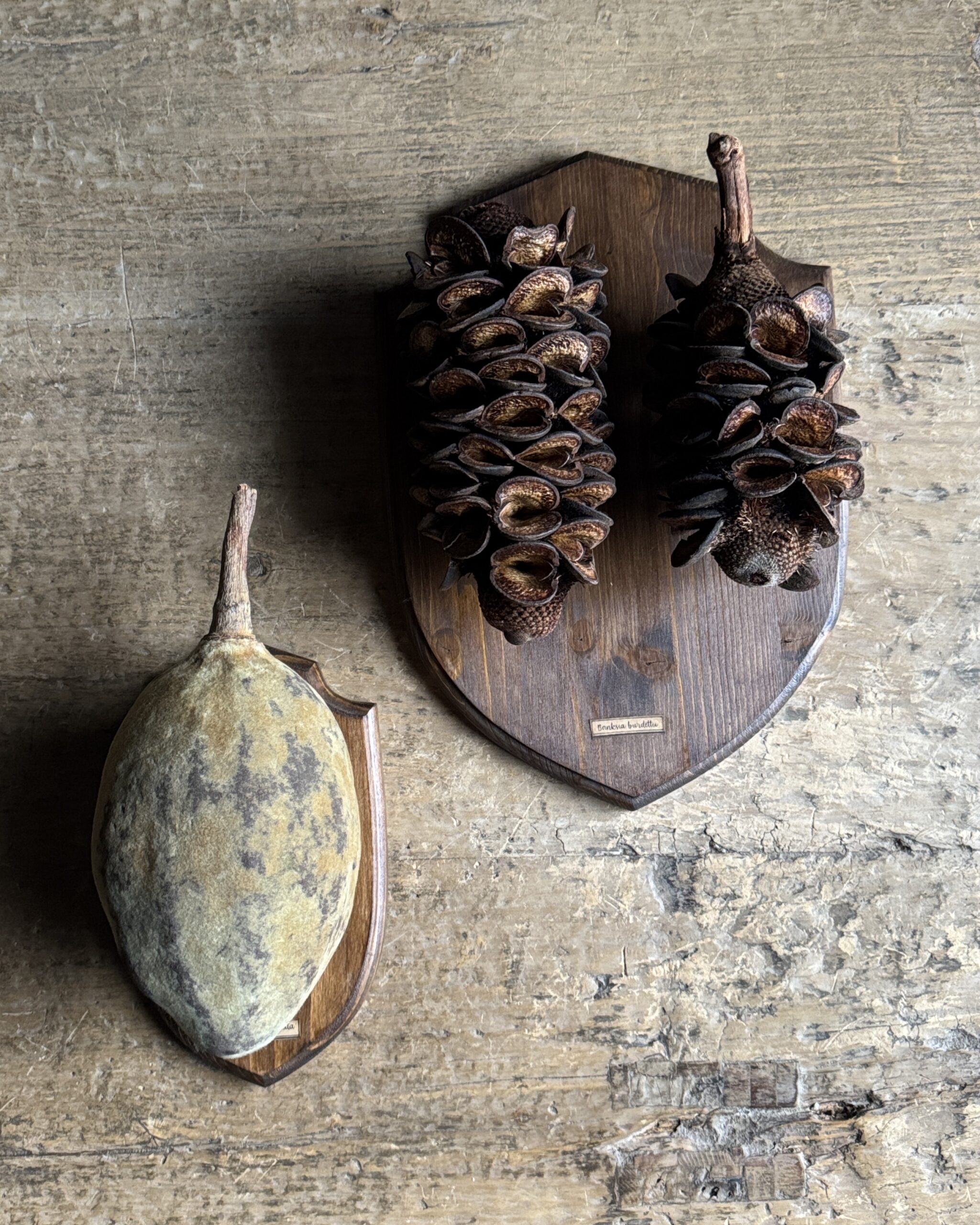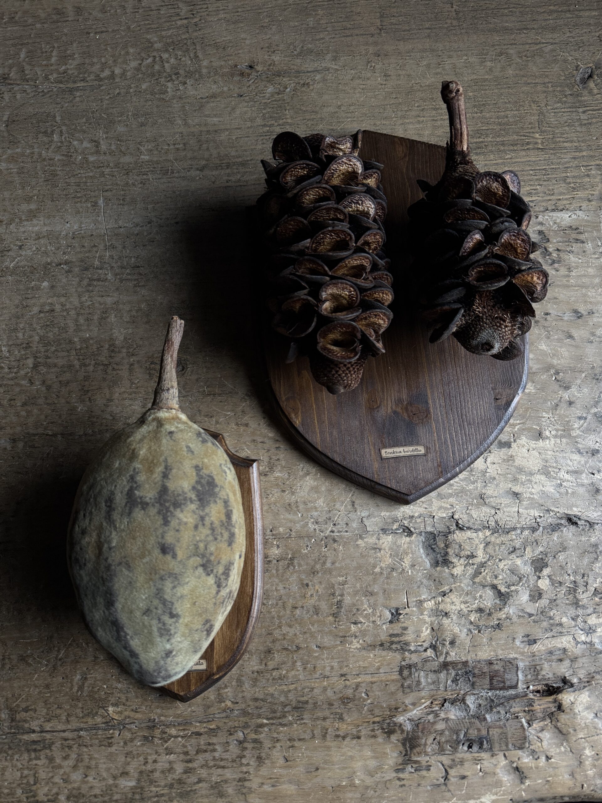 Decorative set of 2 seeds presented on a wooden panel. Sizes: 23 x 13 x 34 cm. 14 x 14 x 29 cm.
