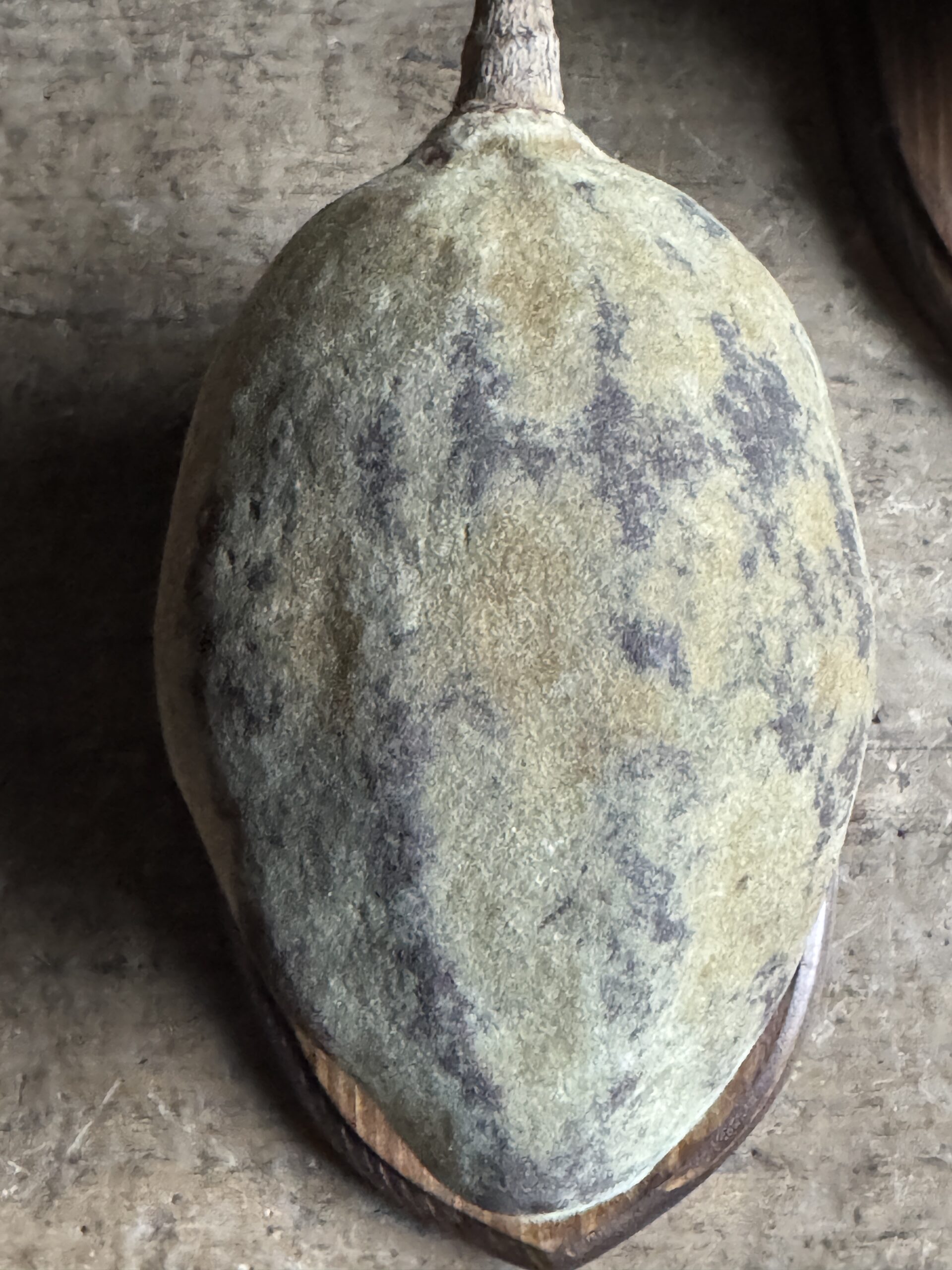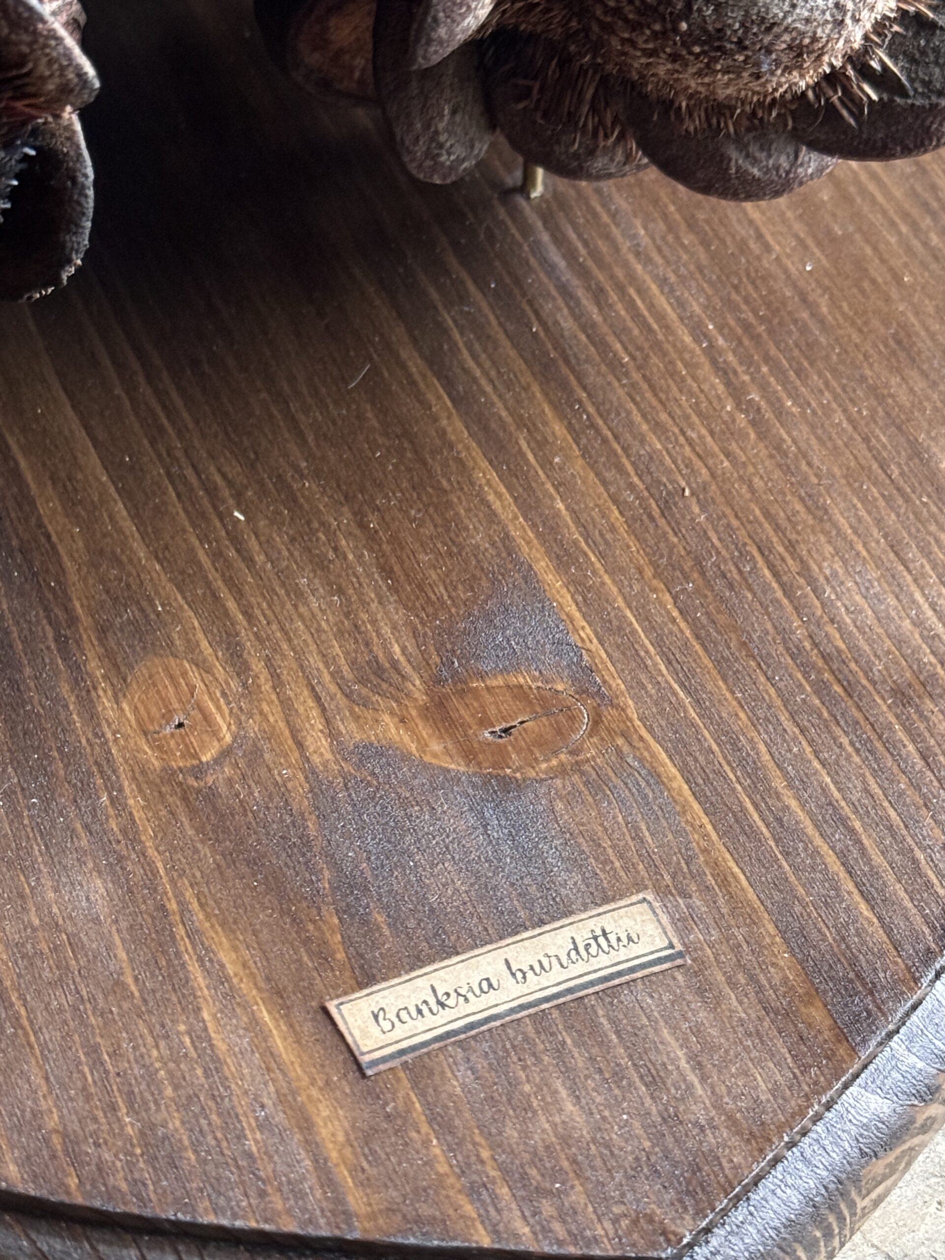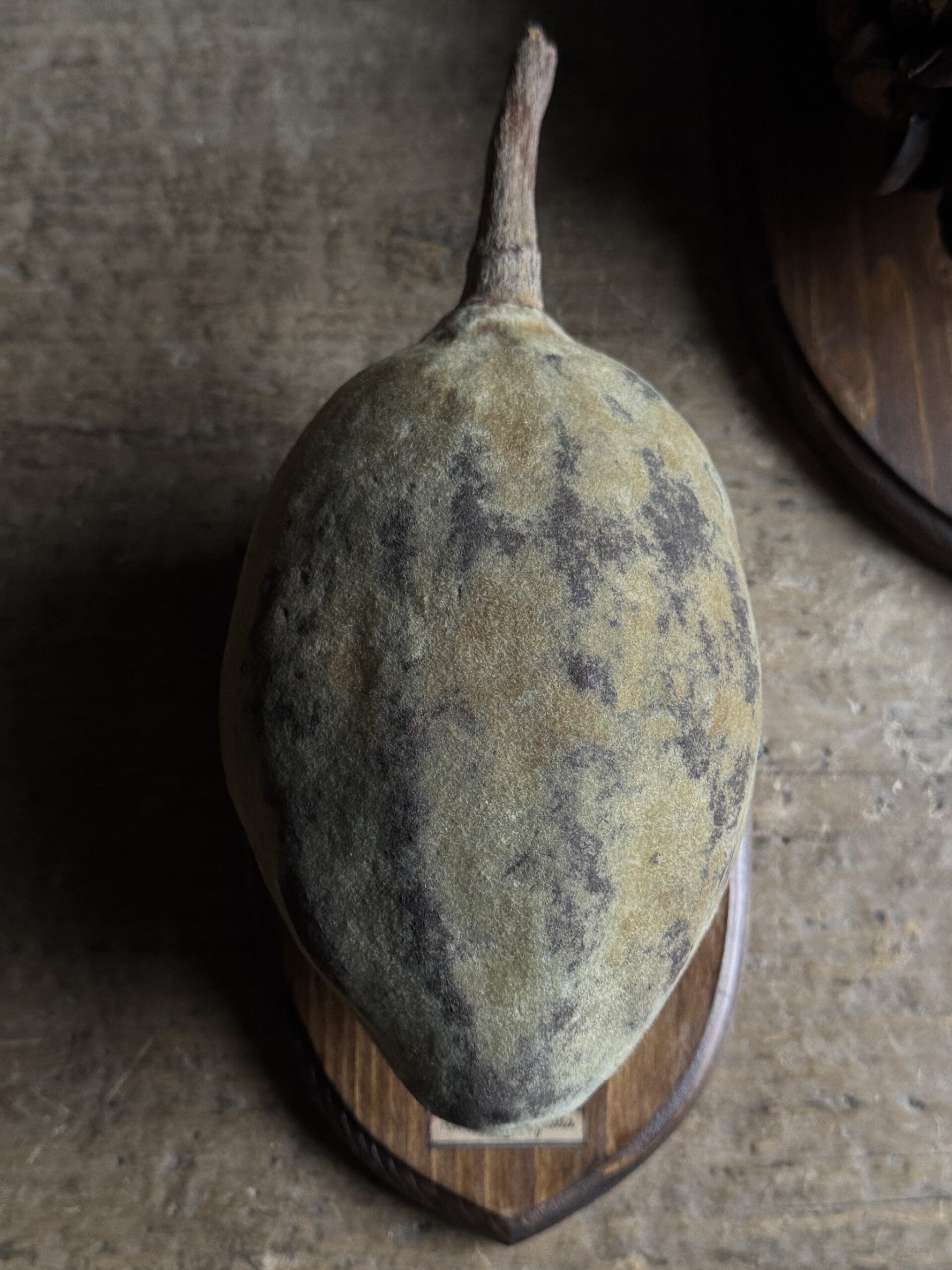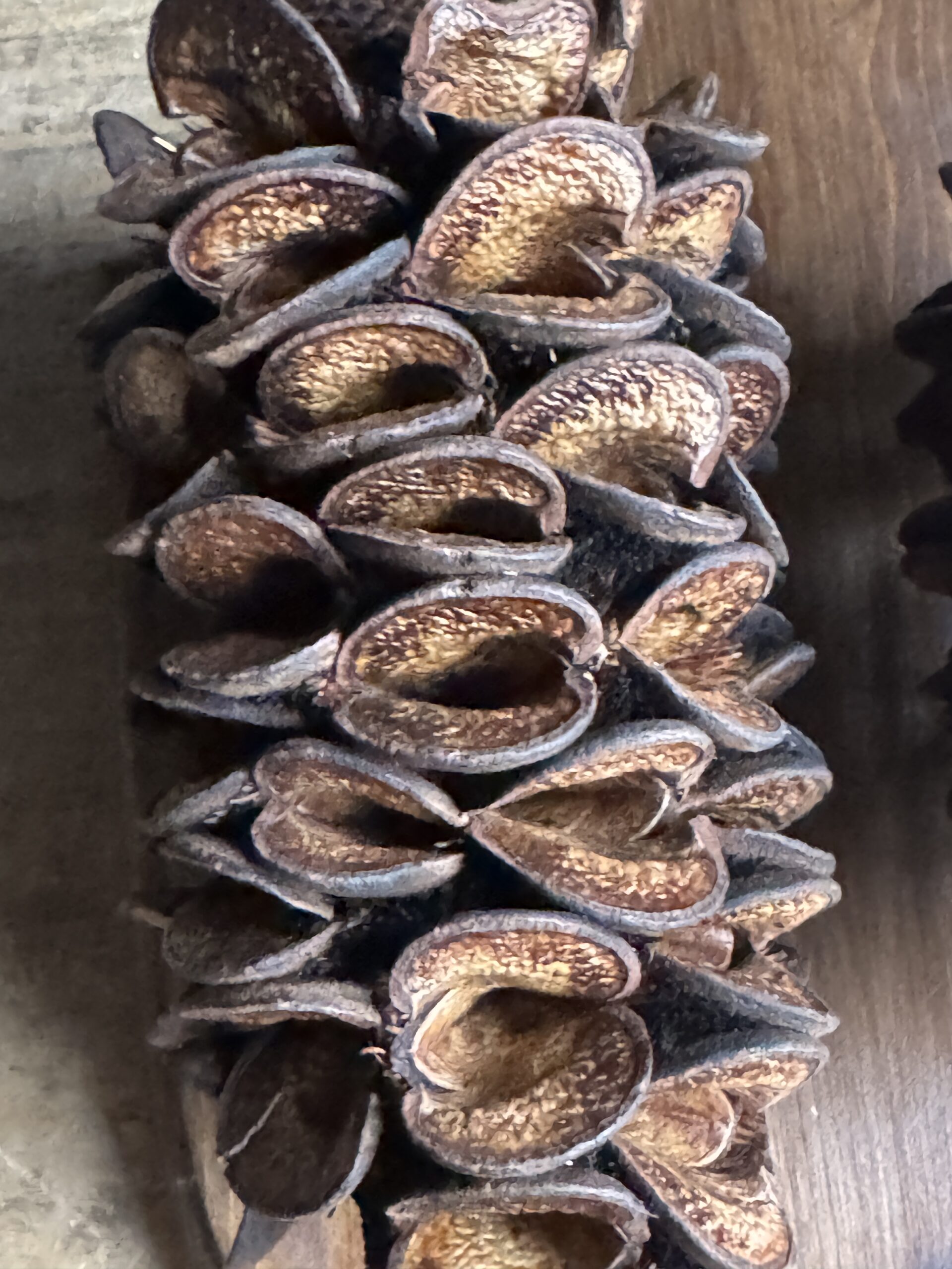 Decorative set of 2 seeds presented on a wooden panel. Sizes: 23 x 13 x 34 cm. 14 x 14 x 29 cm.