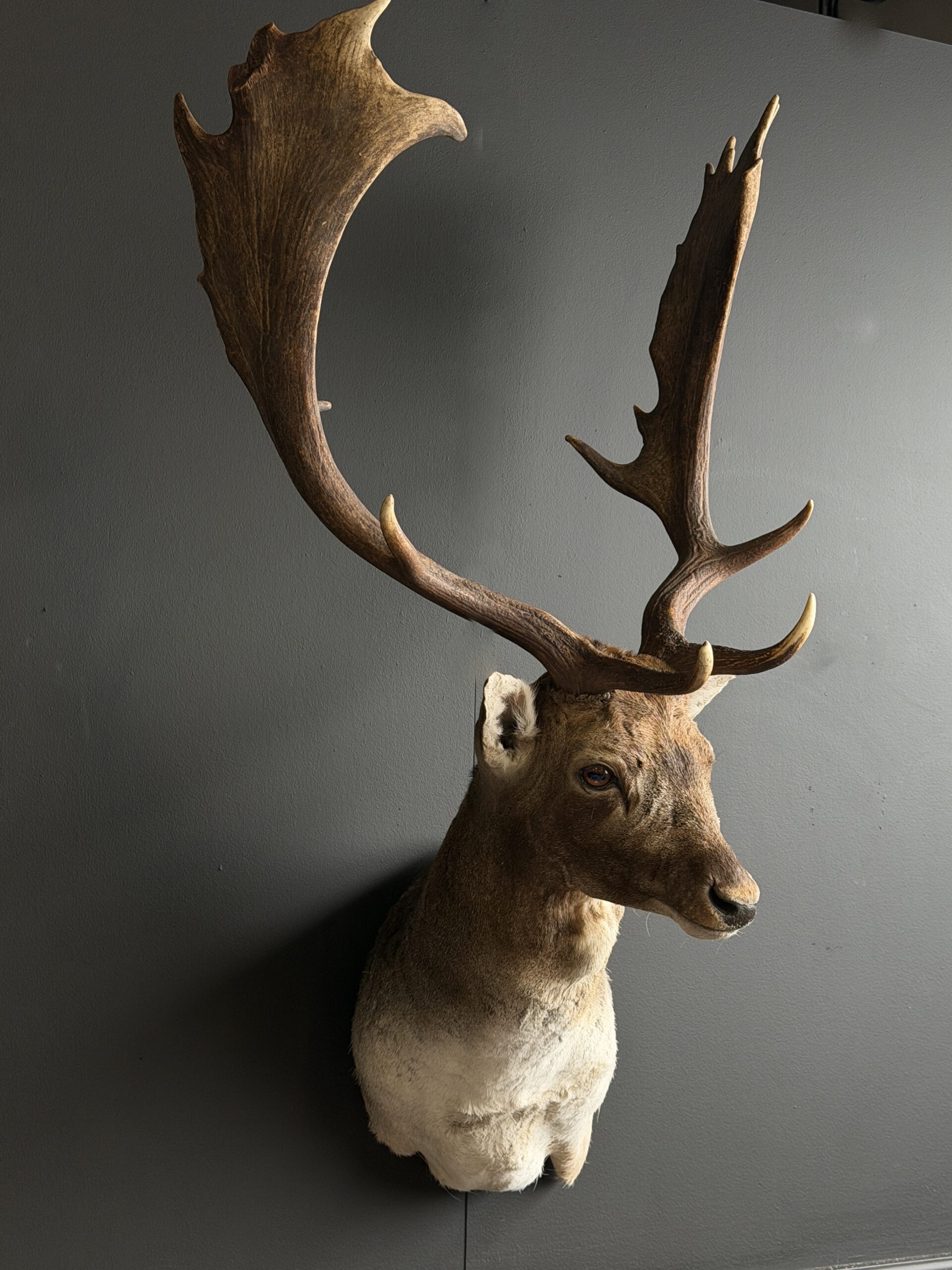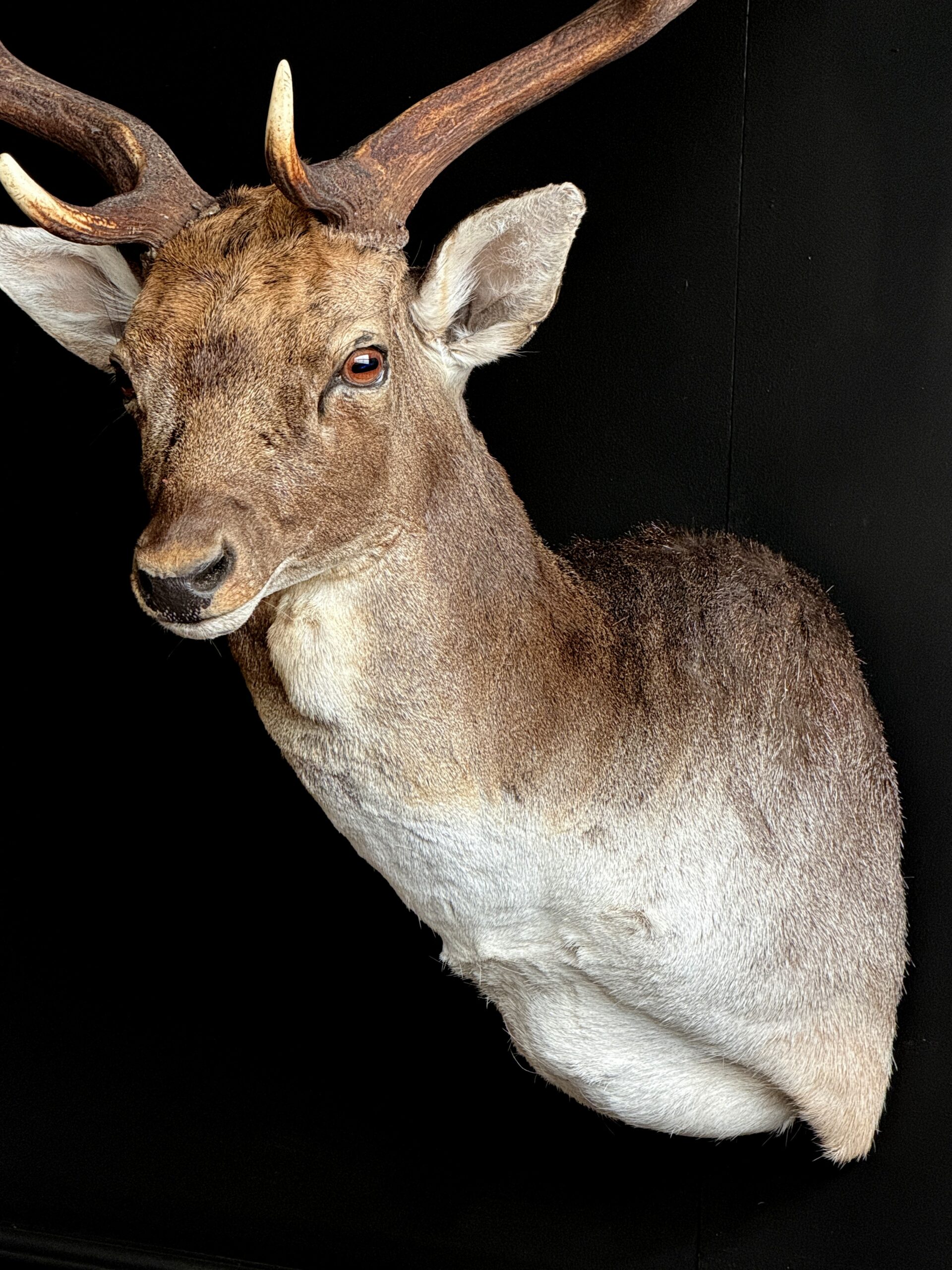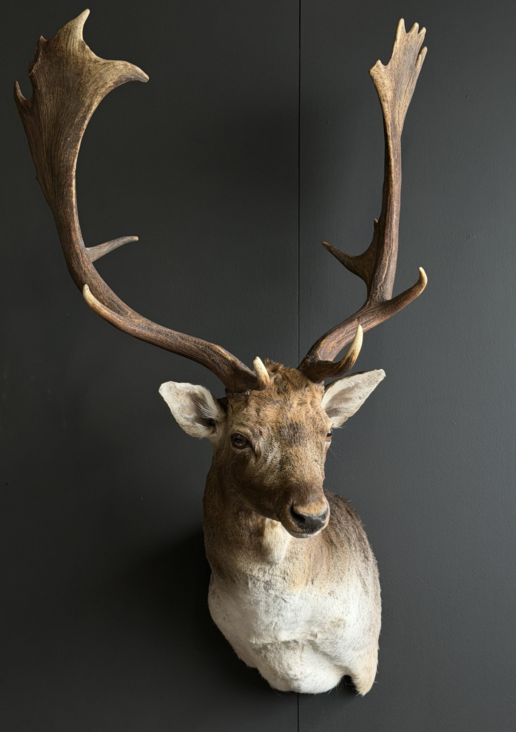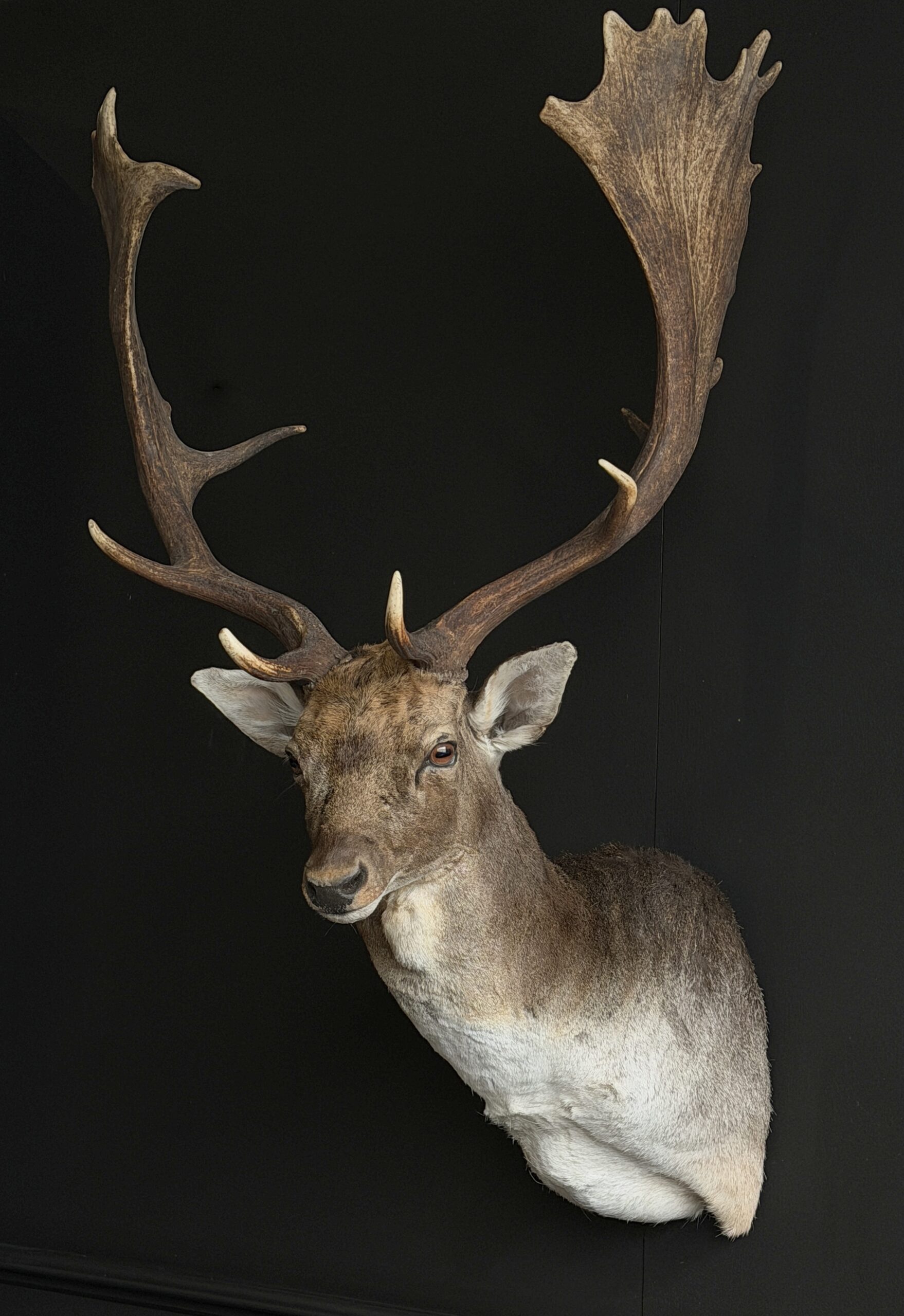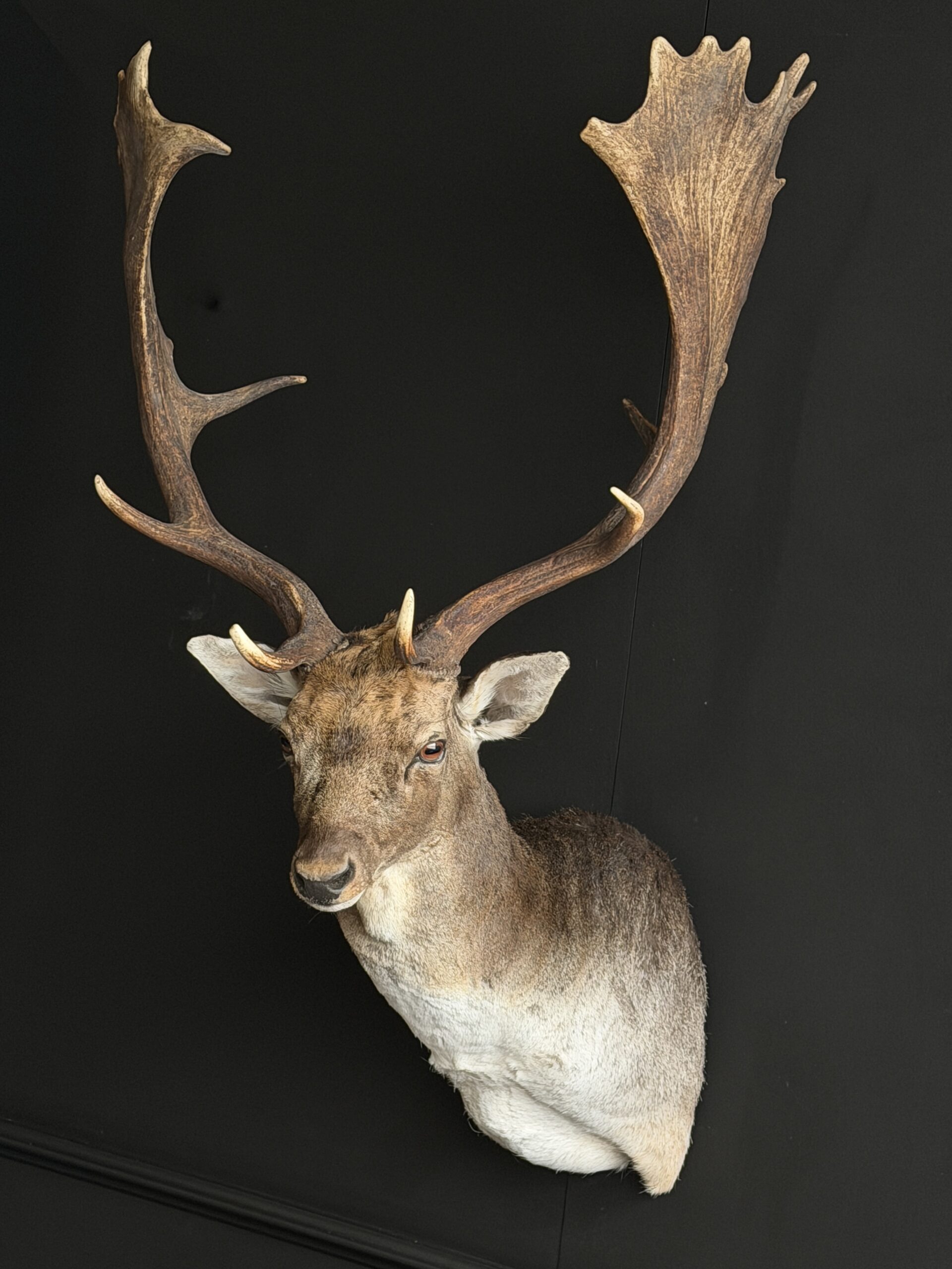 New mounted head of a fallow deer. This beautiful fallow deer is mounted in twisted pose with the antlers nicely visible. The deer has been set up with great attention to detail which makes it a beautiful piece.