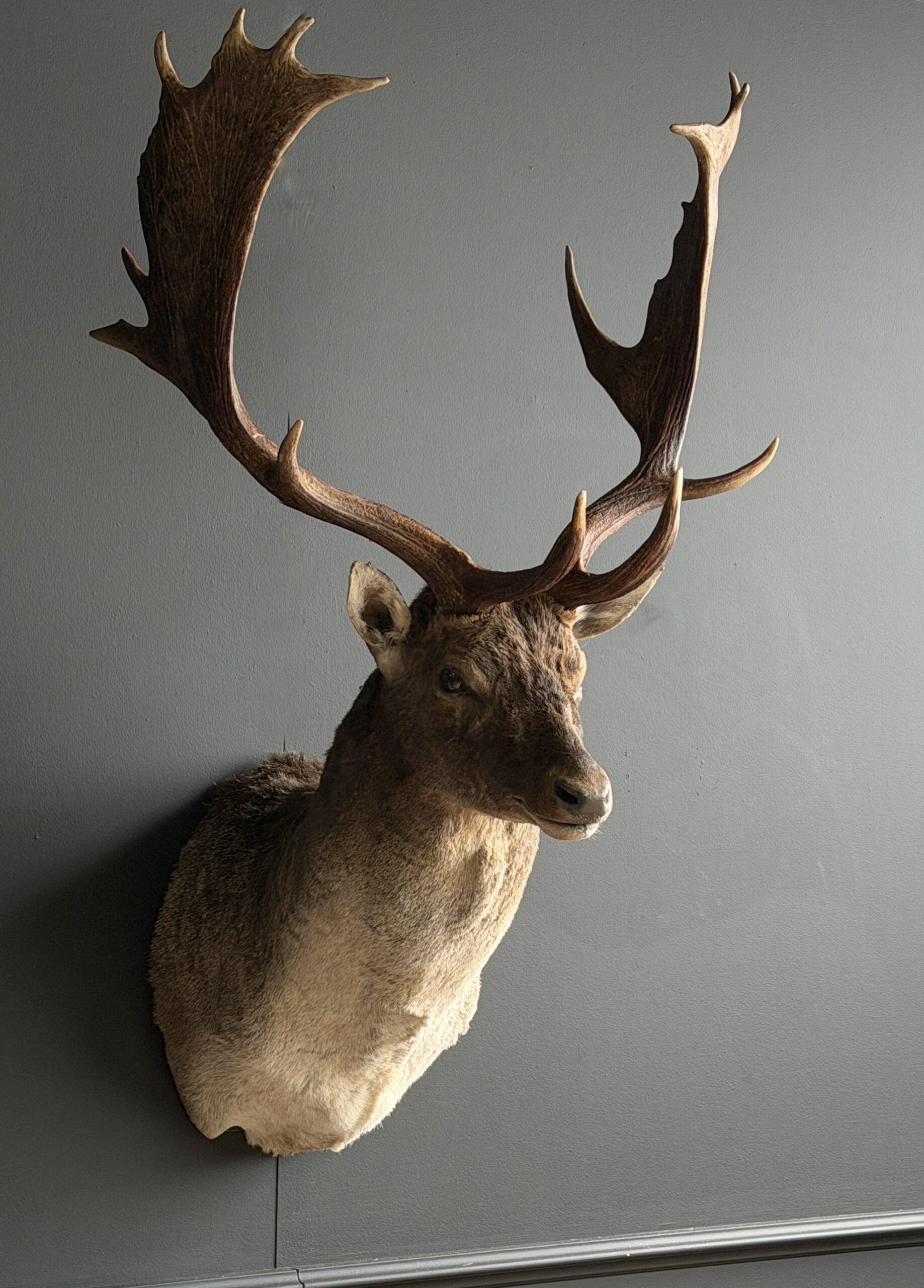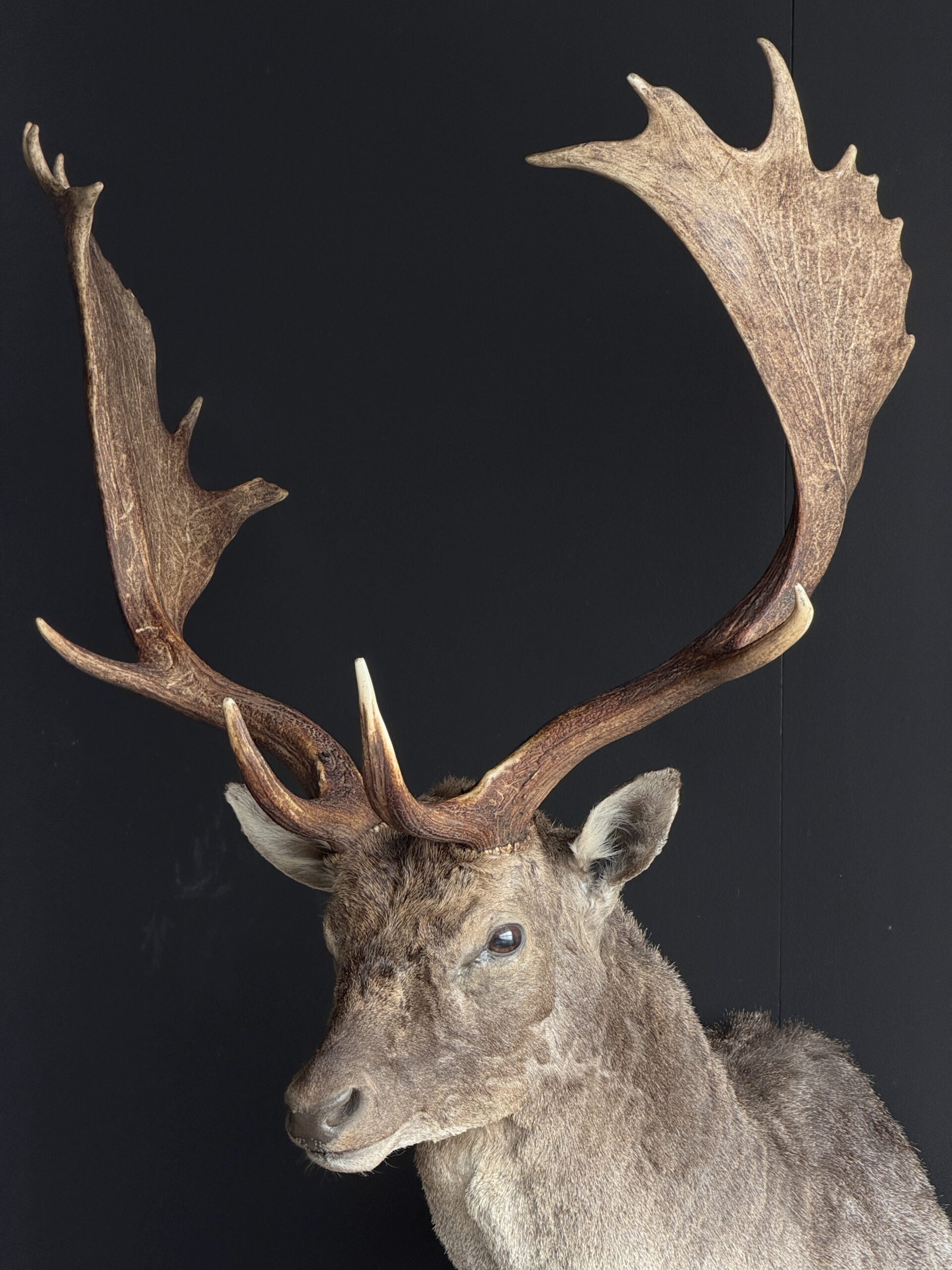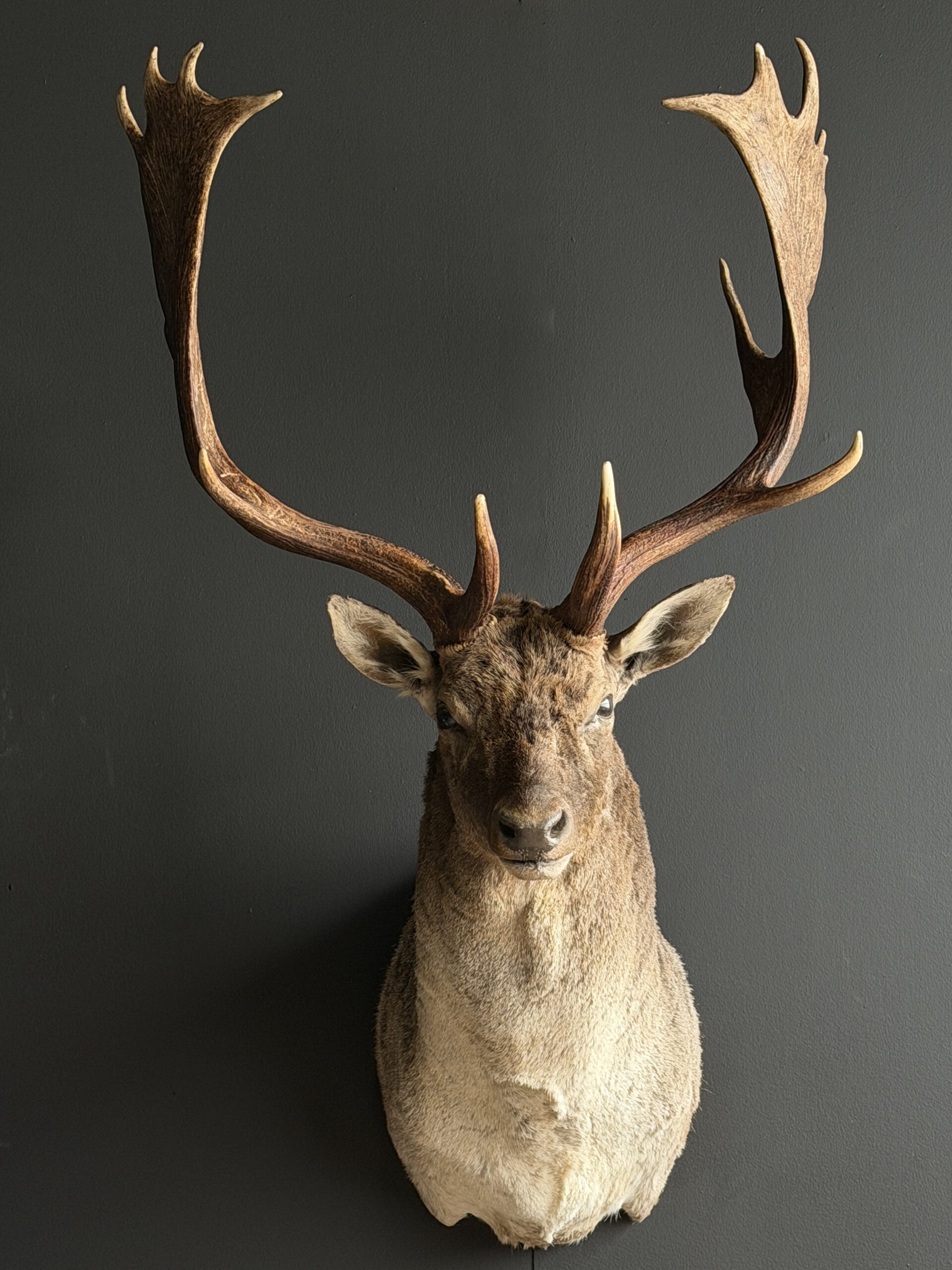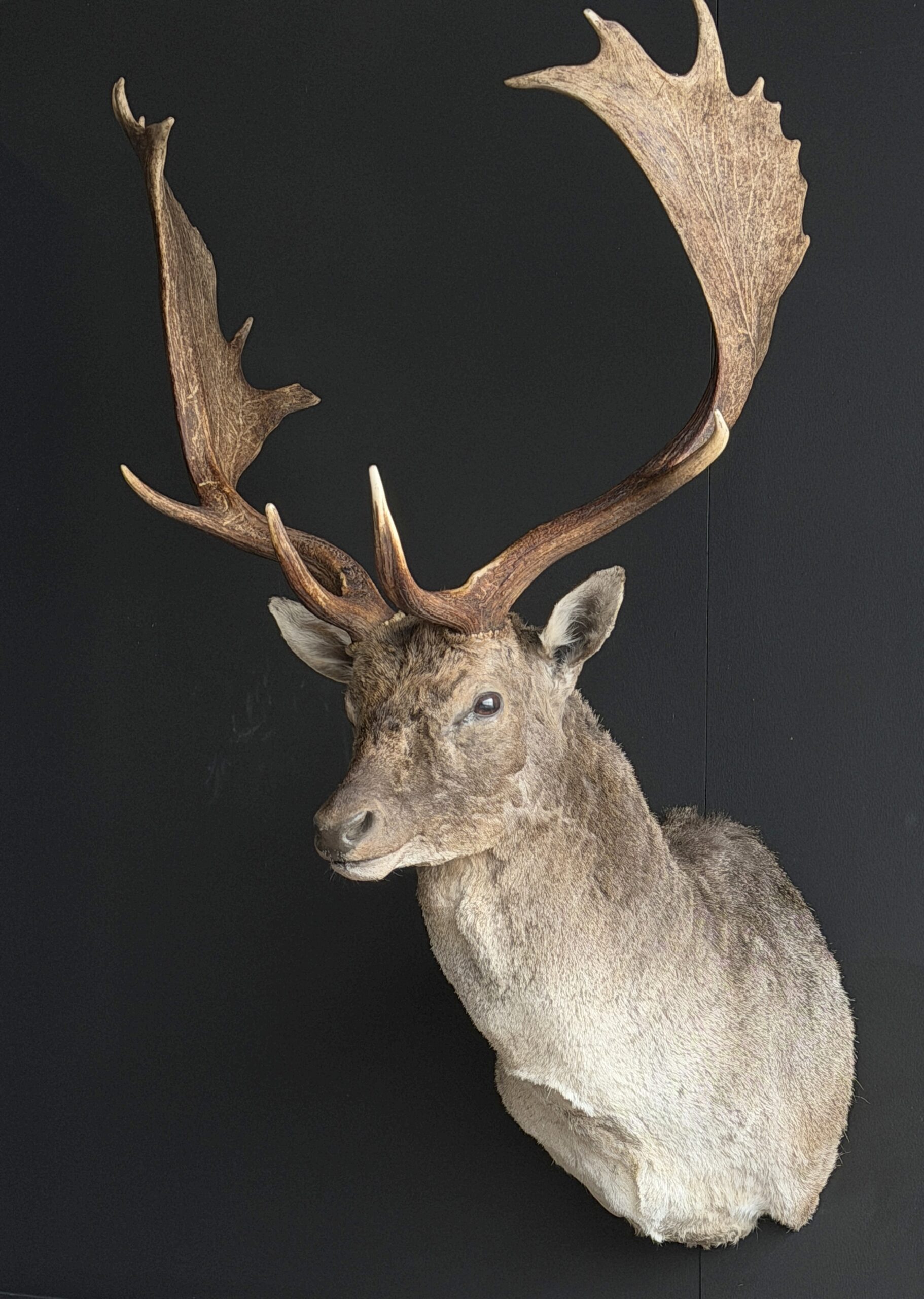 New mounted head of a fallow deer. This beautiful fallow deer is mounted in twisted pose with the antlers nicely visible. The deer has been set up with great attention to detail which makes it a beautiful piece.