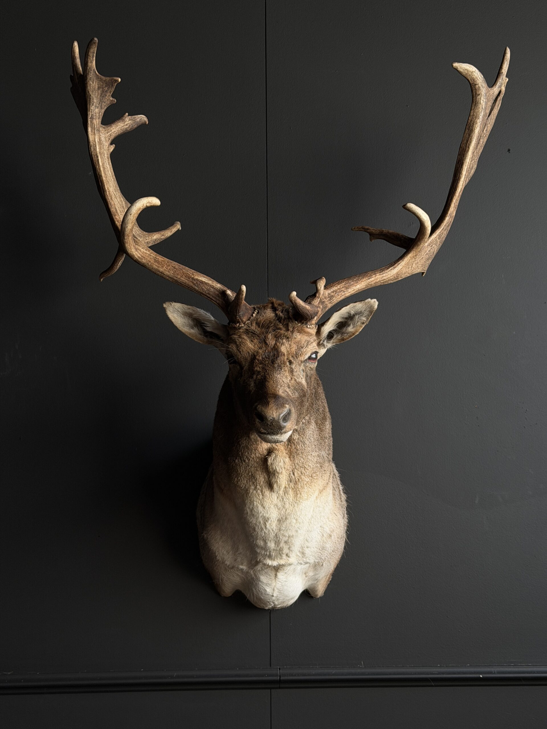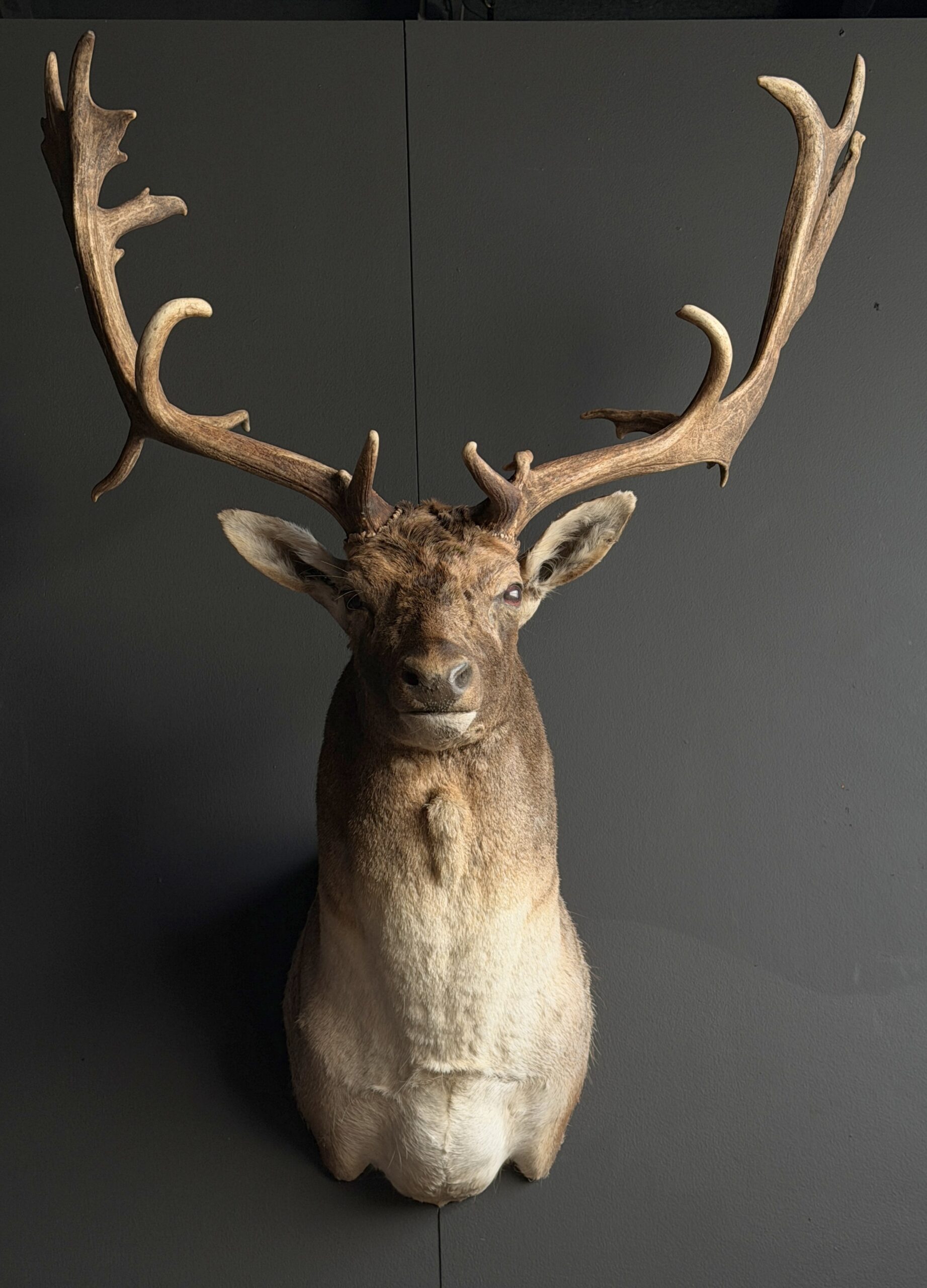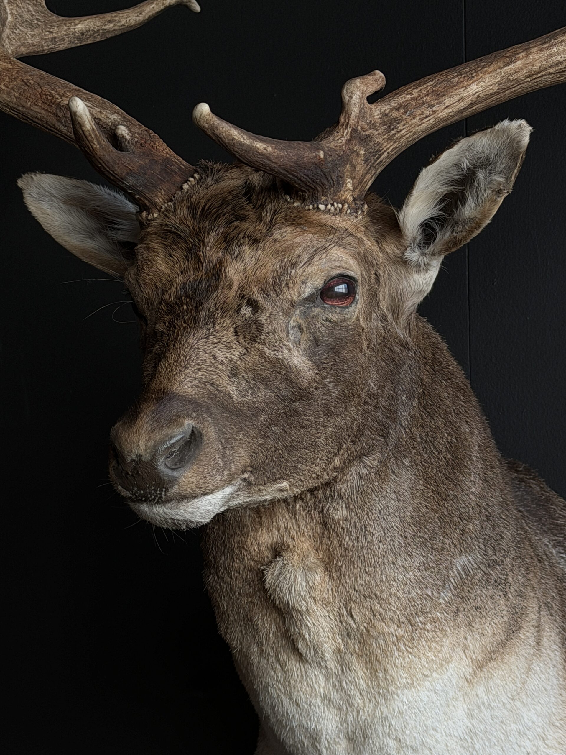 New mounted head of a big fallow deer. This beautiful fallow deer is mounted in twisted pose with the antlers nicely visible. The deer has been set up with great attention to detail which makes it a beautiful piece.