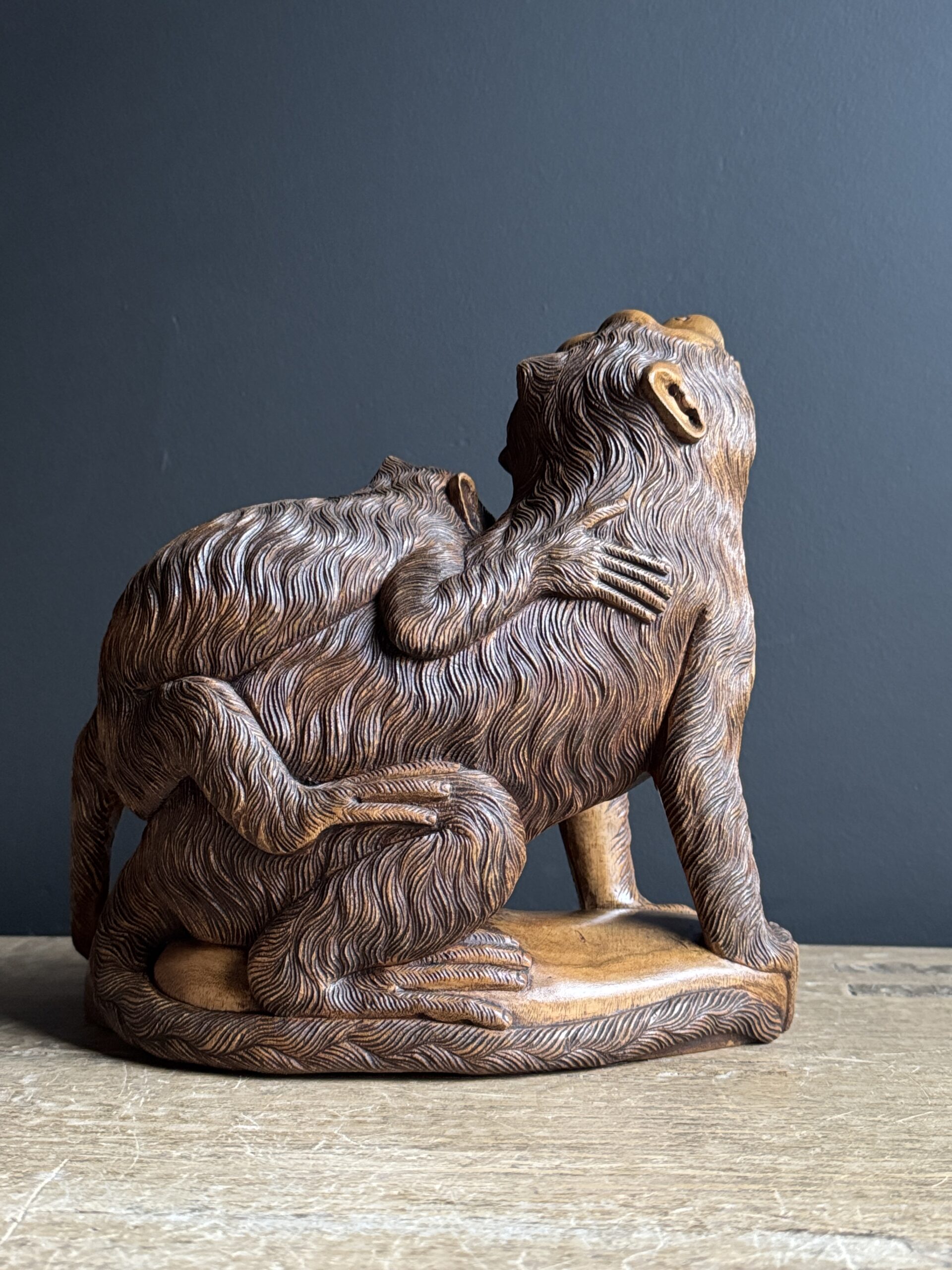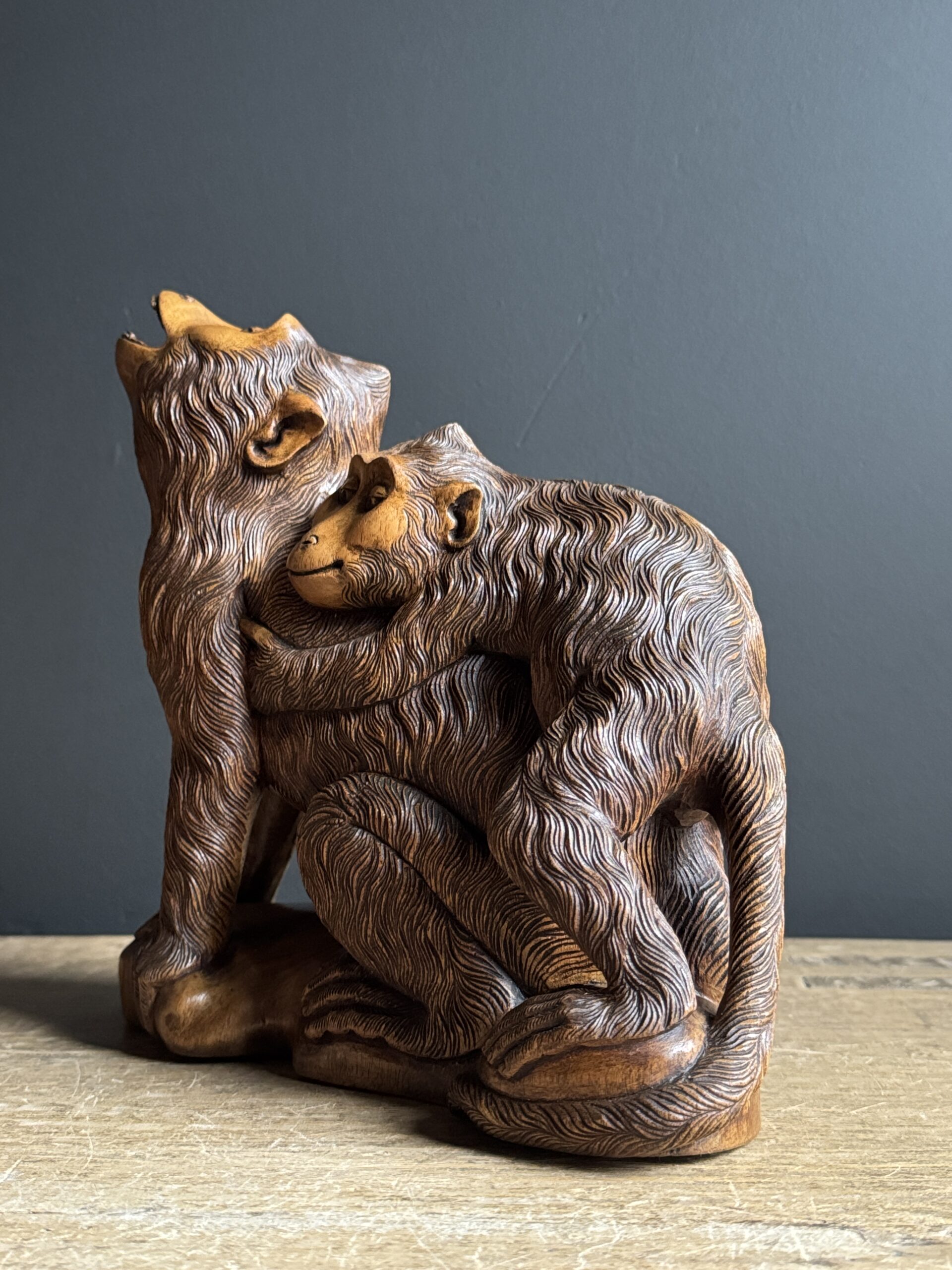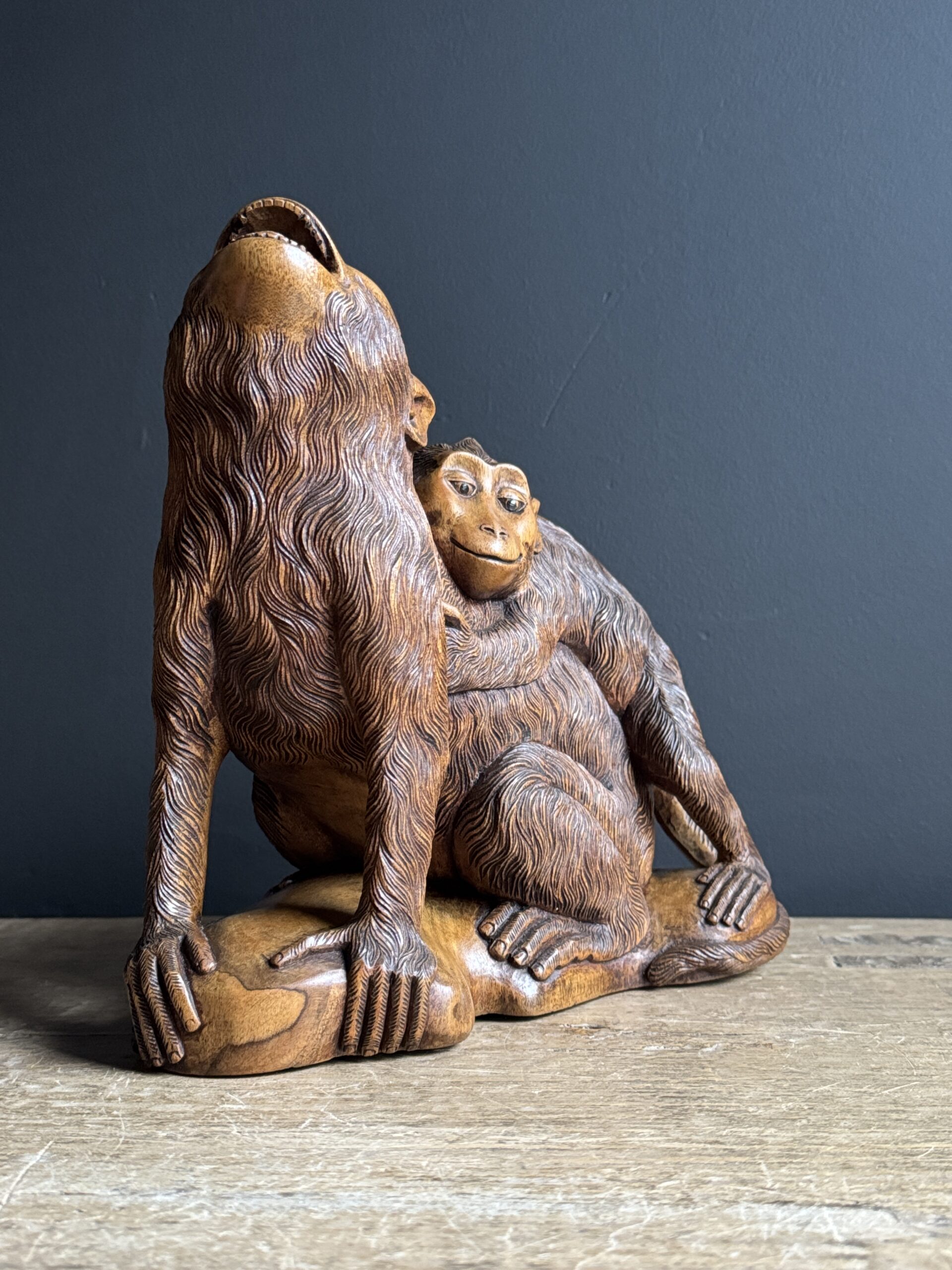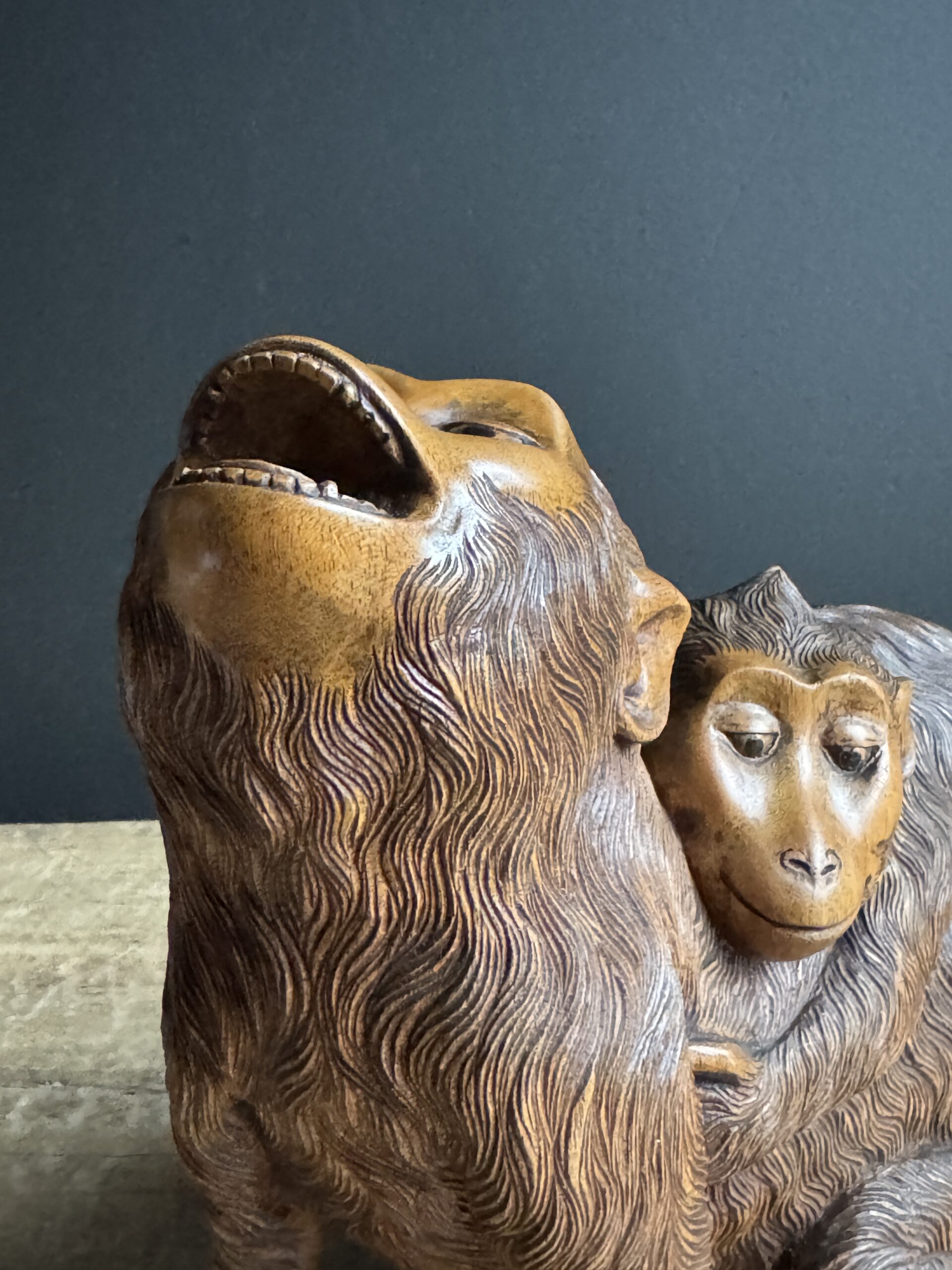 This remarkable wood carving depicts a monkey with her young, with remarkable attention to detail and expression. It is entirely hand-carved by a skilled craftsman, bringing every tuft of fur, posture, and facial expression to life. The warm wood tones and fine finish give the figurine a natural, rustic charm. A unique work of art that beautifully combines craftsmanship and animal tenderness.